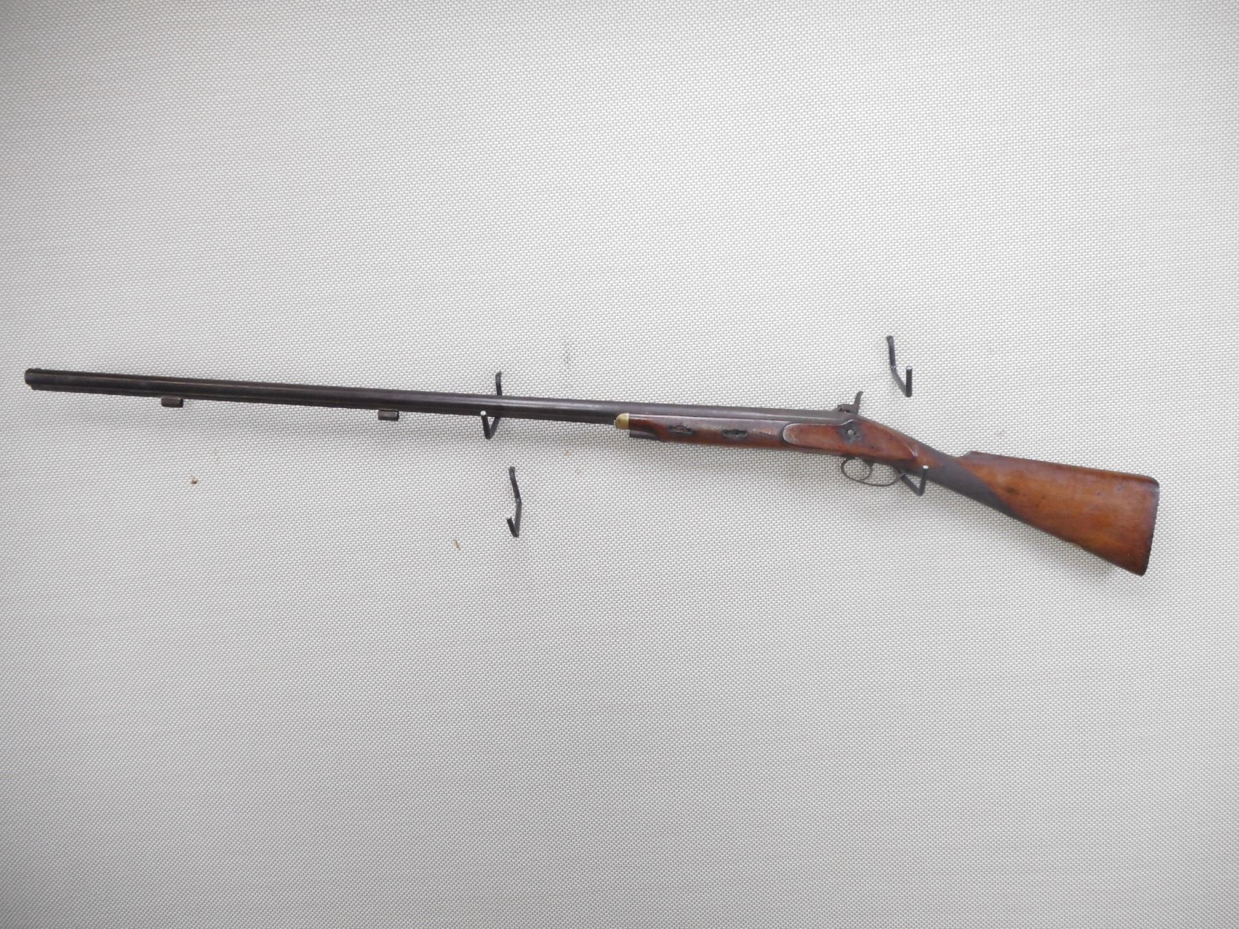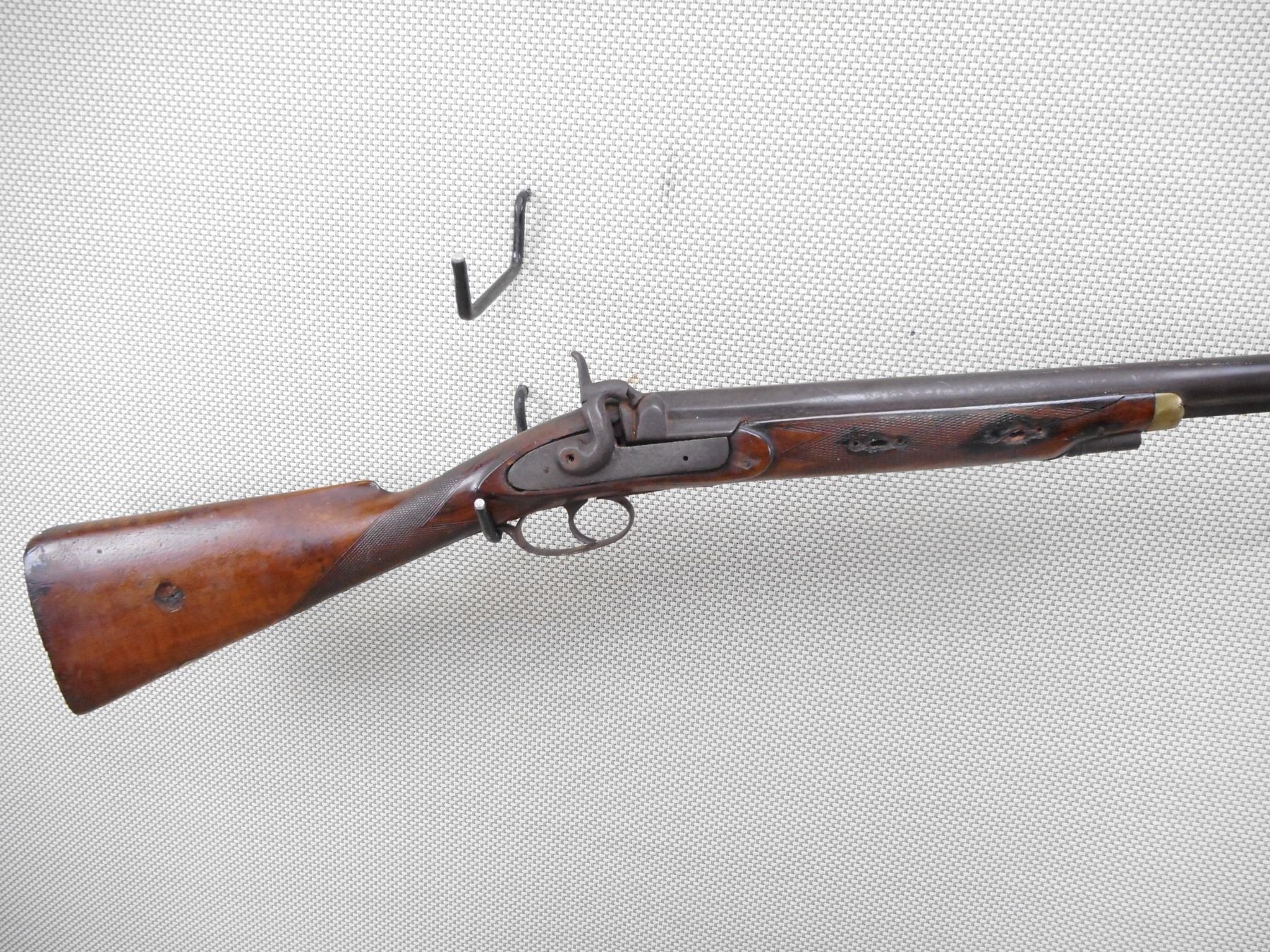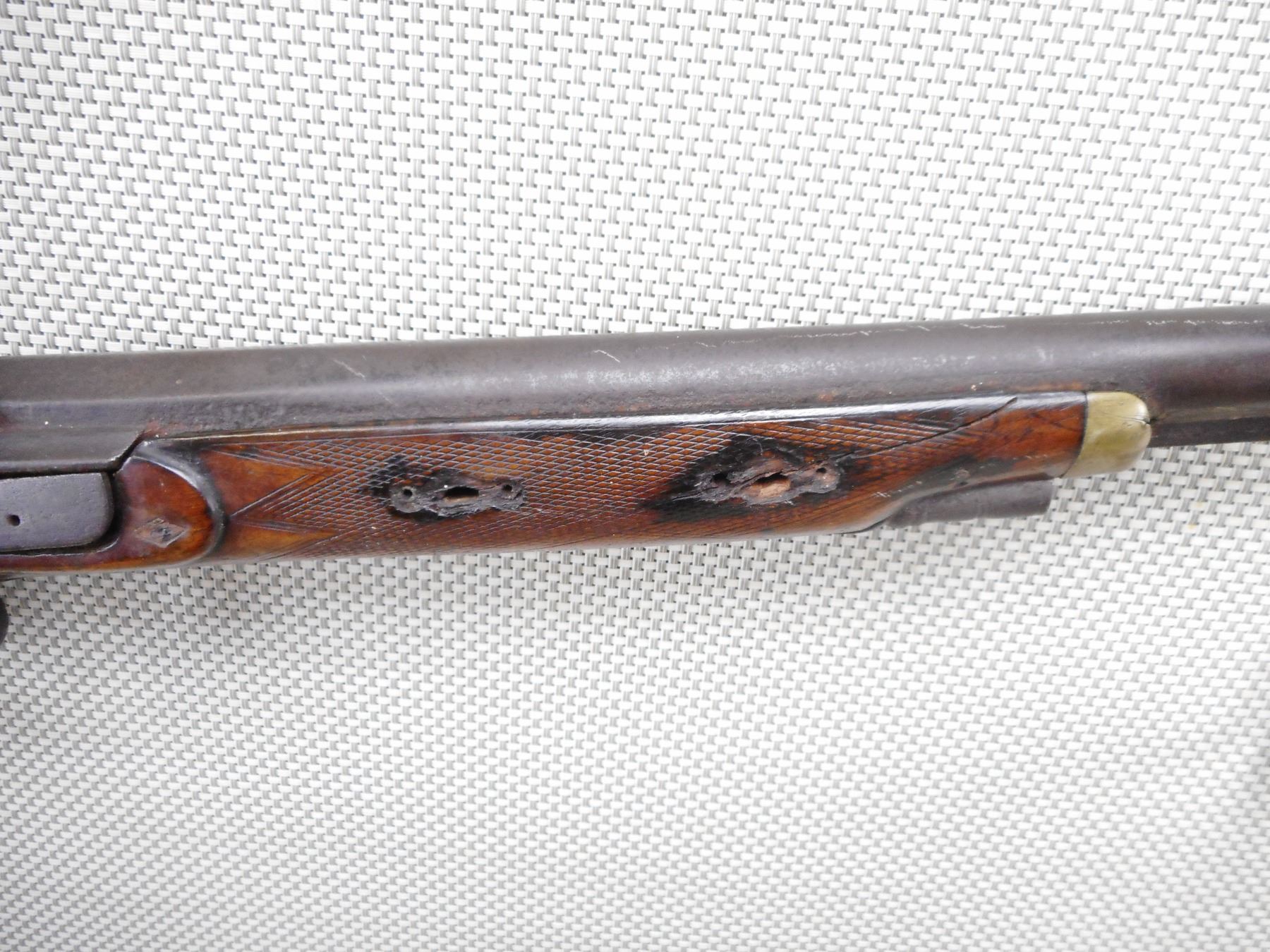 UNKNOWN , MODEL: SINGLE SHOT , CALIBER: 10 GA PERC , BORE IS DARK. ONE PIECE HARDWOOD STOCK WTH BRASS FOREND CAP. MISSING THE BUTT PLATE. MISSING THE RAM ROD. MISSING ONE OF THE BARREL WEDGES. SHOWS EXTENSIVE HANDLING MARKS. ACTION: SINGLE SHOT MUZZLE LOADER , BARREL LENGTH: 41" , SERIAL # N/A , CONDITION: 3/10 ANTIQUE , CLASS: CANADIAN ANTIQUE CLASS