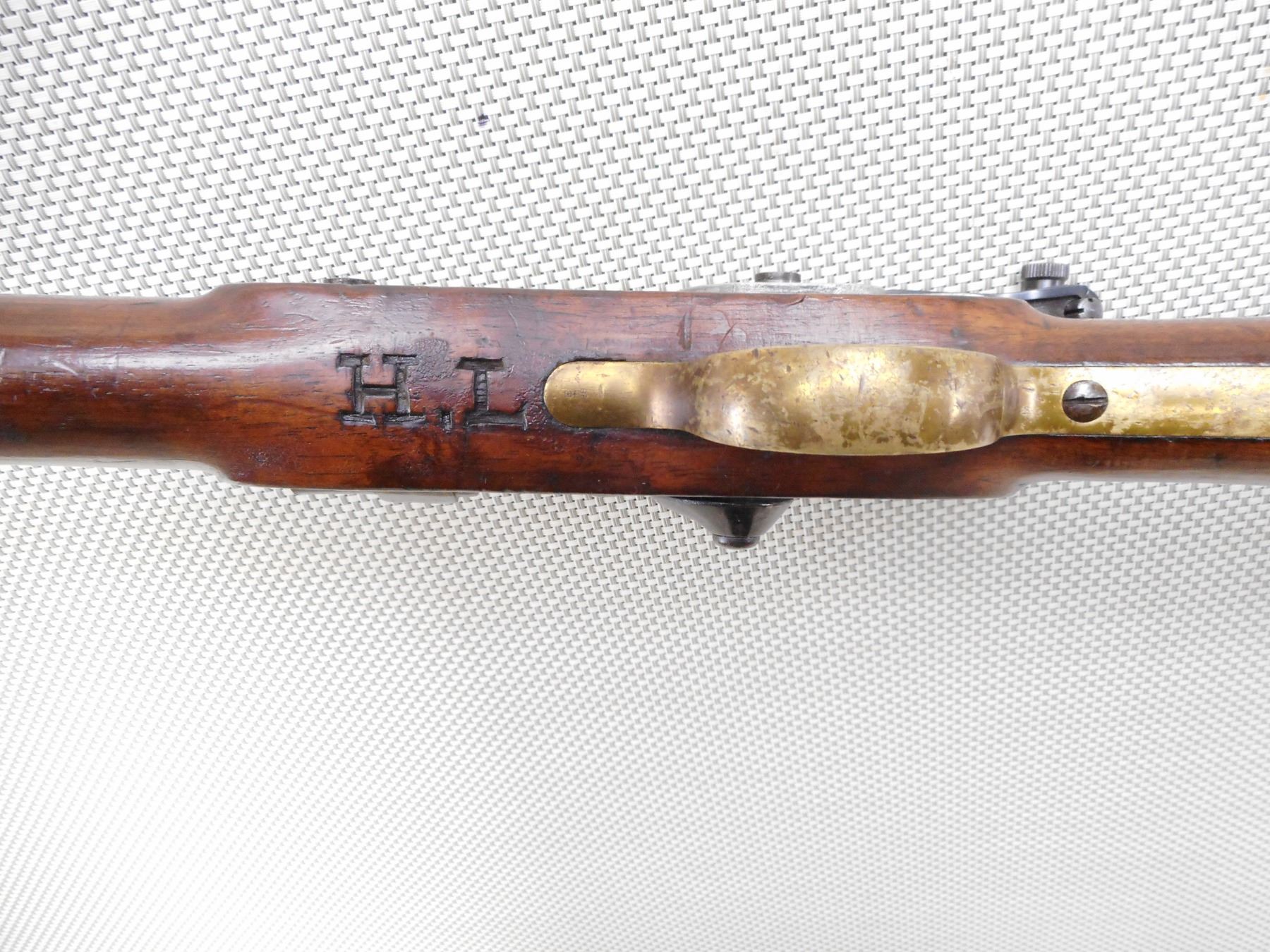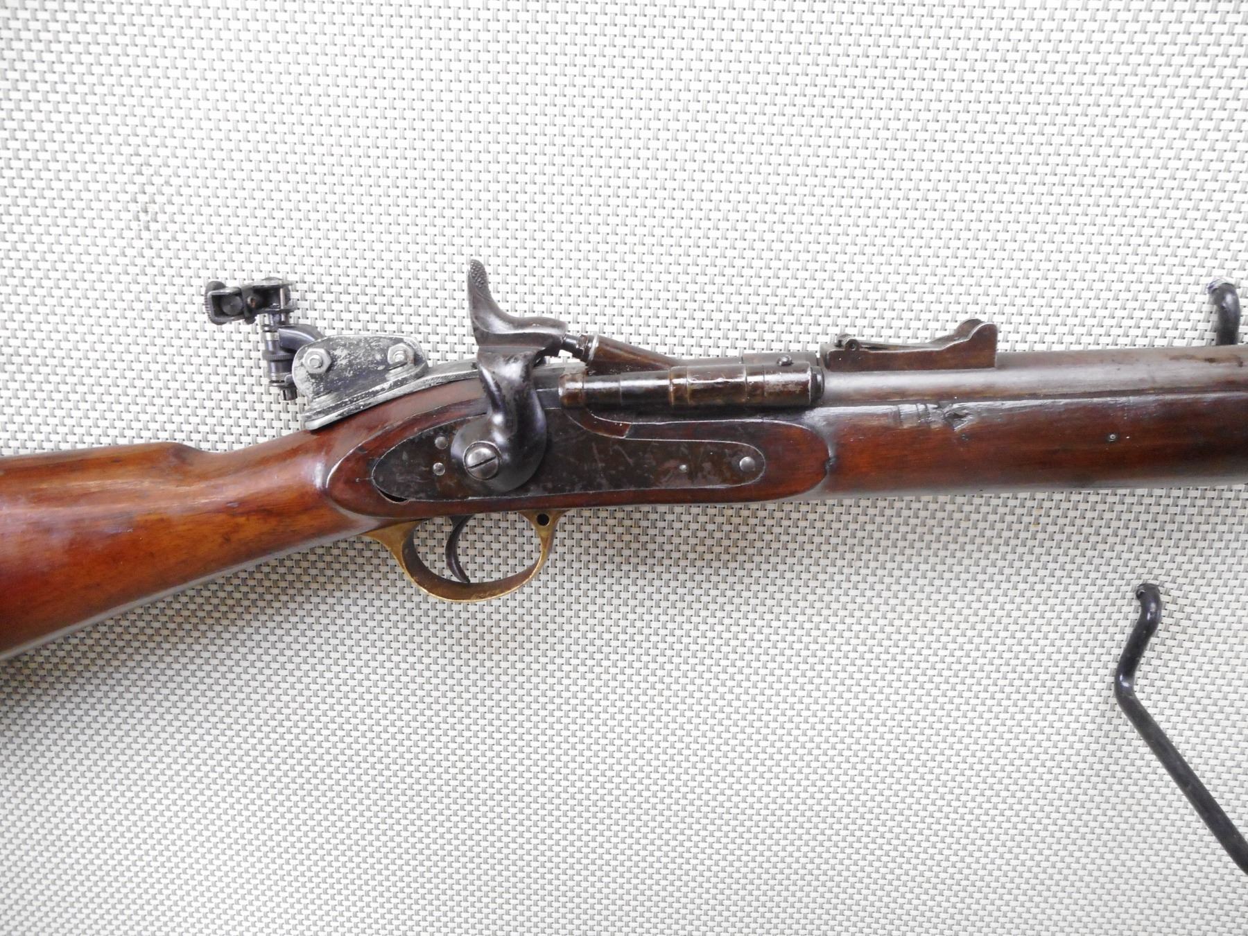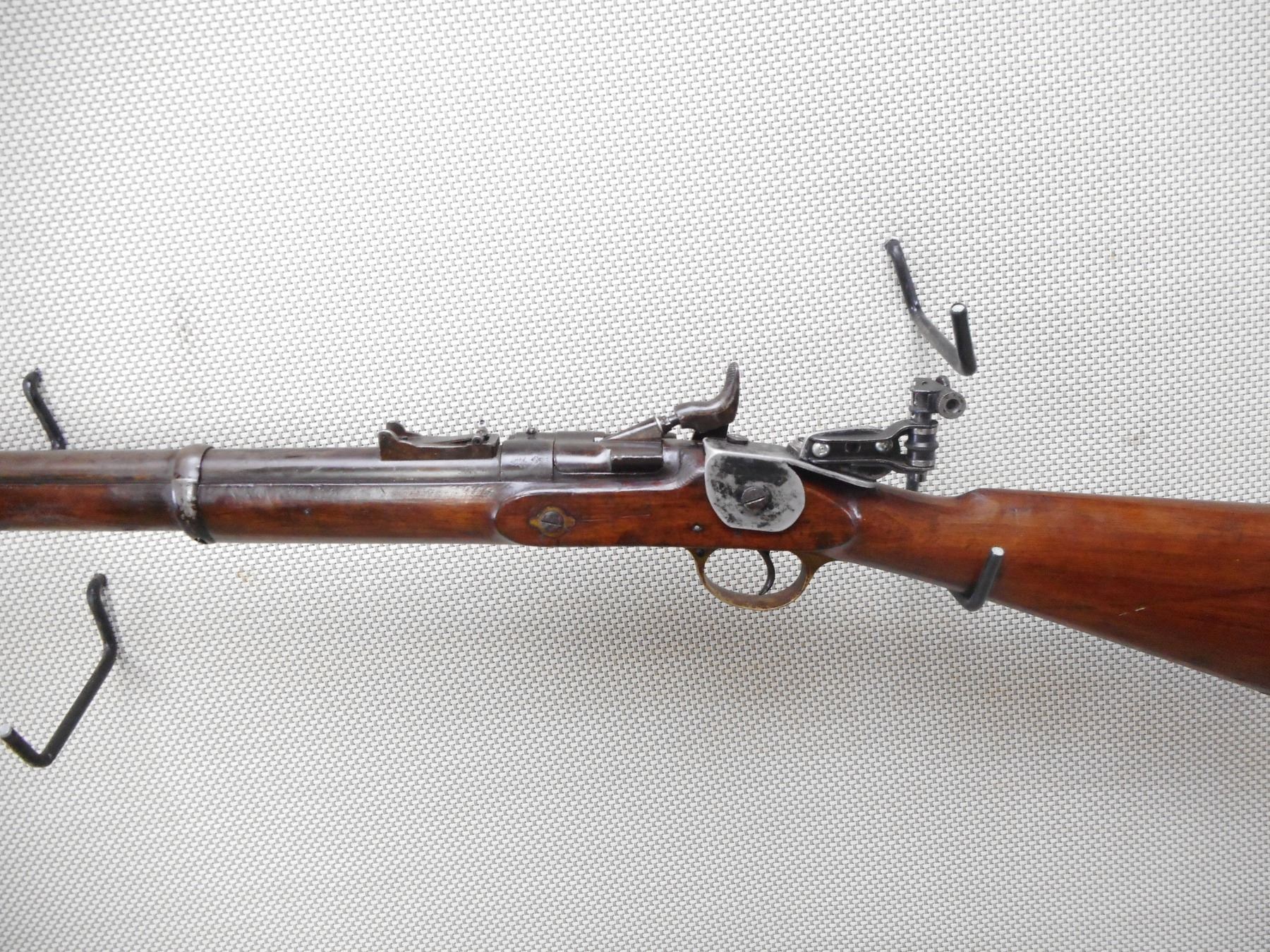 SNIDER ENFIELD , MODEL: CUSTOM SPORTER , CALIBER: 577 SNIDER , BORE IS GOOD WITH LIGHT PITTING. MARKED 1852 ENFIELD ON LOCK. VARIOUS BRITISH PROOFS AND MILITARY MARKS. BLADE FRONT SIGHT WITH EARS. MOSSBERG PEEP REAR SIGHT MOUNTED ON A CUSTOM BASE ATTACHED TO STOCK. LOCK FUNCTIONS. REPAIRED STOCK AT THE TOE. BRASS BUTT PLATE. TWO BANDS REMAIN. INITIALS HL CARVED ON THE UNDERSIDE OF STOCK. NUMEROUS HANDLING MARKS AND WEAR. ACTION: HINGE TIPPING BLOCK , BARREL LENGTH: 36 1/2" , SERIAL # N/A , CONDITION: 4/10 ANTIQUE , CLASS: CANADIAN ANTIQUE CLASS