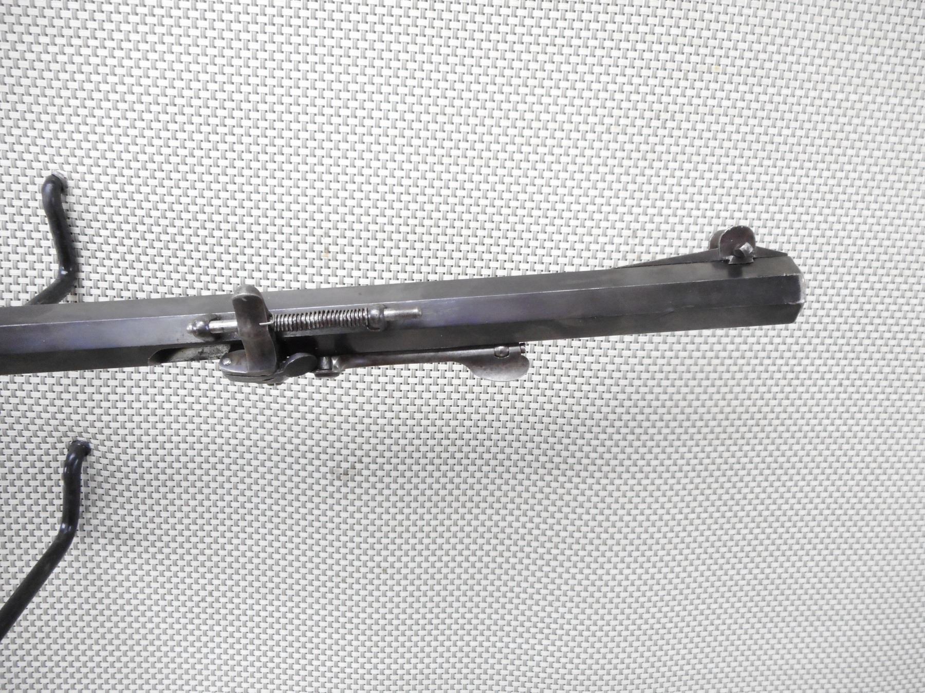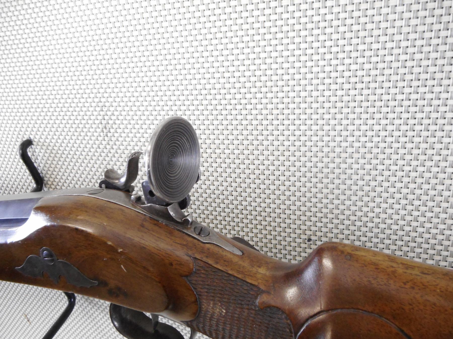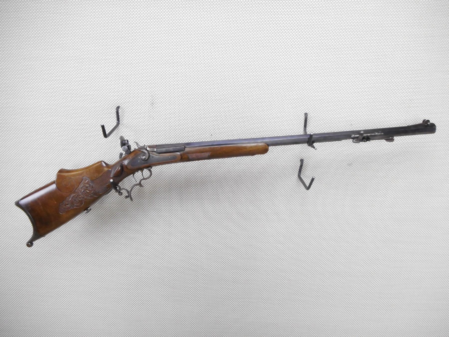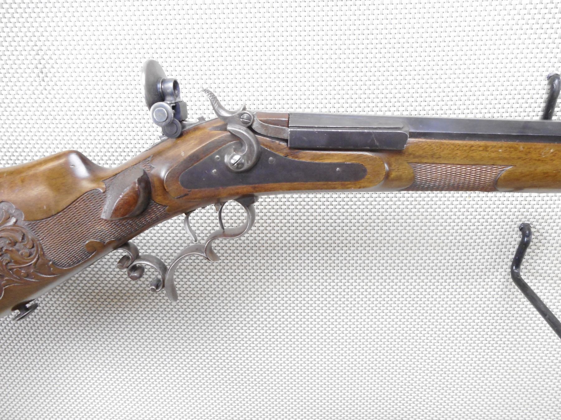 F NEUMEYER FREISING , MODEL: ZIMMER STUTZEN , CALIBER: 4MM , BORE IS EXCELLENT. BLADE FRONT SIGHT WITH PROTECTIVE EARS. HEAVY OCTAGONAL BARREL. SCHUTZEN STYLE STOCK. SET TRIGGERS. ADJUSTABLE REAR TARGET PEEP SIGHT. CHEEK REST. HOOKED BUTT PLATE. FINGER GROOVES ON THE TRIGGER GUARD. CHECKERED FOREND ENGRAVED BUTT STOCK. SWIVELS. SOME HANDLING MARKS AND WEAR. ACTION: UNIQUE TOGGLE ACTION , BARREL LENGTH: 8" , SERIAL # N/A , CONDITION: 7/10 ANTIQUE , CLASS: CANADIAN ANTIQUE CLASS