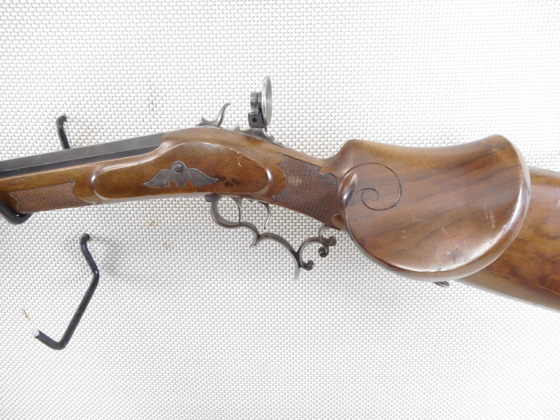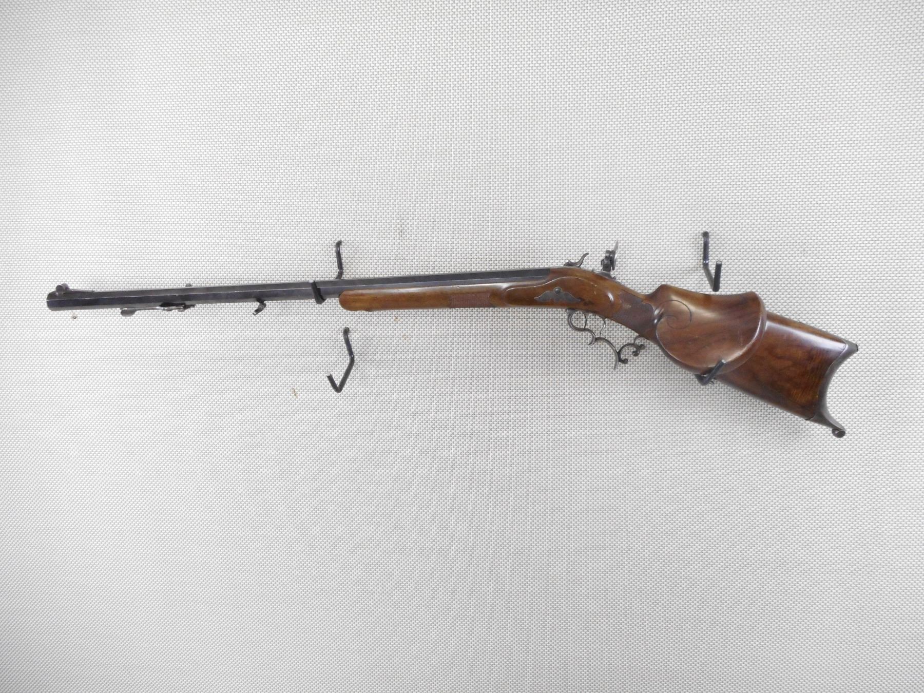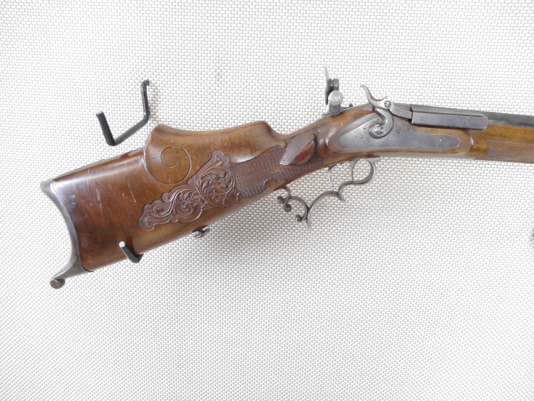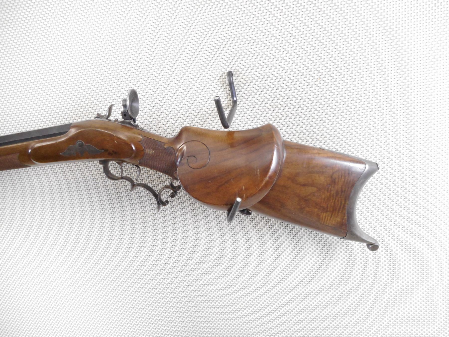 F NEUMEYER FREISING , MODEL: ZIMMER STUTZEN , CALIBER: 4MM , BORE IS EXCELLENT. BLADE FRONT SIGHT WITH PROTECTIVE EARS. HEAVY OCTAGONAL BARREL. SCHUTZEN STYLE STOCK. SET TRIGGERS. ADJUSTABLE REAR TARGET PEEP SIGHT. CHEEK REST. HOOKED BUTT PLATE. FINGER GROOVES ON THE TRIGGER GUARD. CHECKERED FOREND ENGRAVED BUTT STOCK. SWIVELS. SOME HANDLING MARKS AND WEAR. ACTION: UNIQUE TOGGLE ACTION , BARREL LENGTH: 8" , SERIAL # N/A , CONDITION: 7/10 ANTIQUE , CLASS: CANADIAN ANTIQUE CLASS