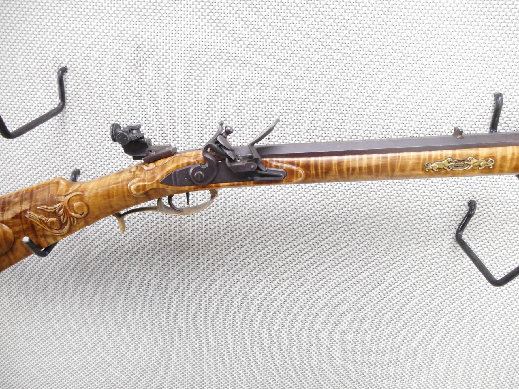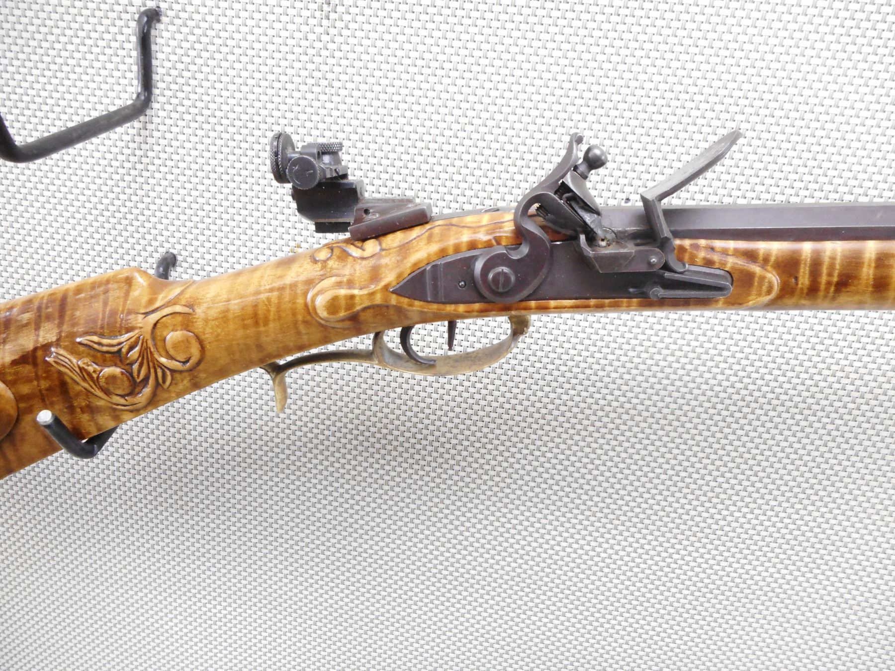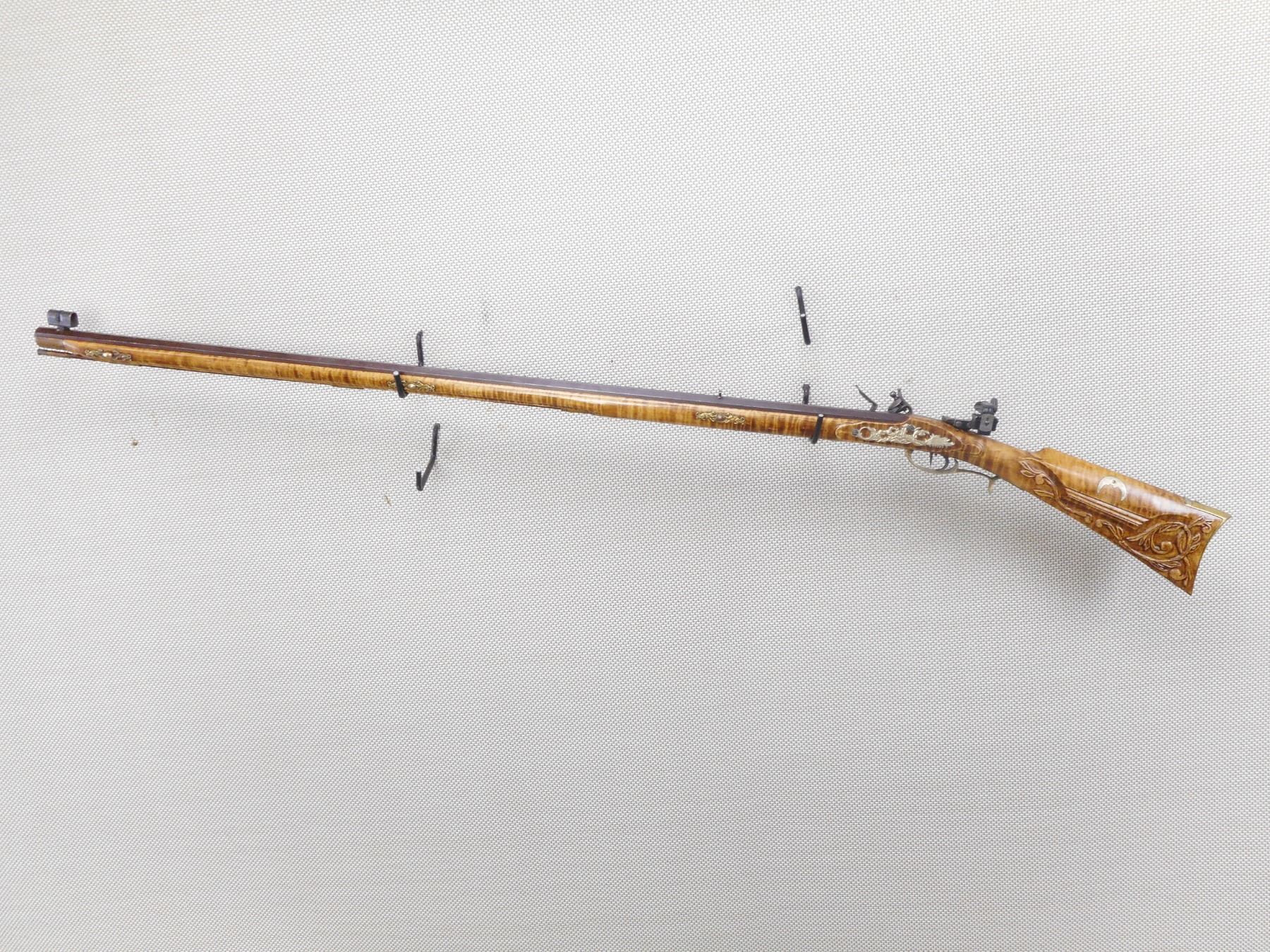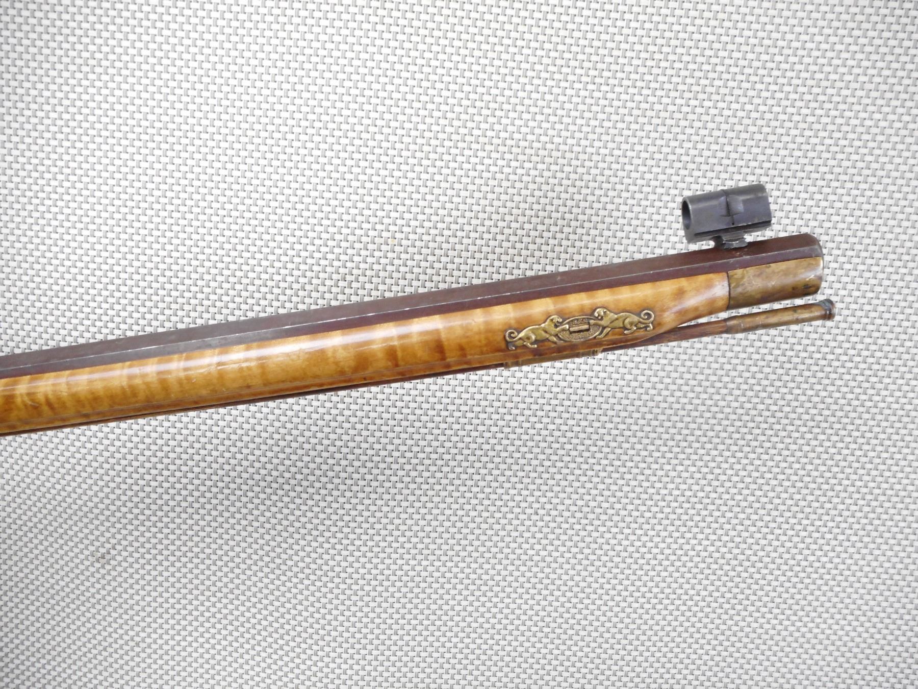 BRIAN W ALLEN , MODEL: KENTUCKY STYLE , CALIBER: 45 CAL , BORE IS VERY GOOD. HOODED TARGET STYLE FRONT SIGHT. OCTAGONAL BARREL. BRASS FITTINGS AROUND BARREL WEDGES. BRASS TRIGGER GUARD. BRASS BUTT PLATE. CUSTOM LYMAN REAR PEEP SIGHT. PATCH BOX ON RIGHT SIDE OF STOCK. SHOWS SOME HANDLING MARKS AND WEAR. ACTION: FLINTLOCK , BARREL LENGTH: 44" , SERIAL # N/A , CONDITION: 7/10 ANTIQUE , CLASS: CANADIAN ANTIQUE CLASS