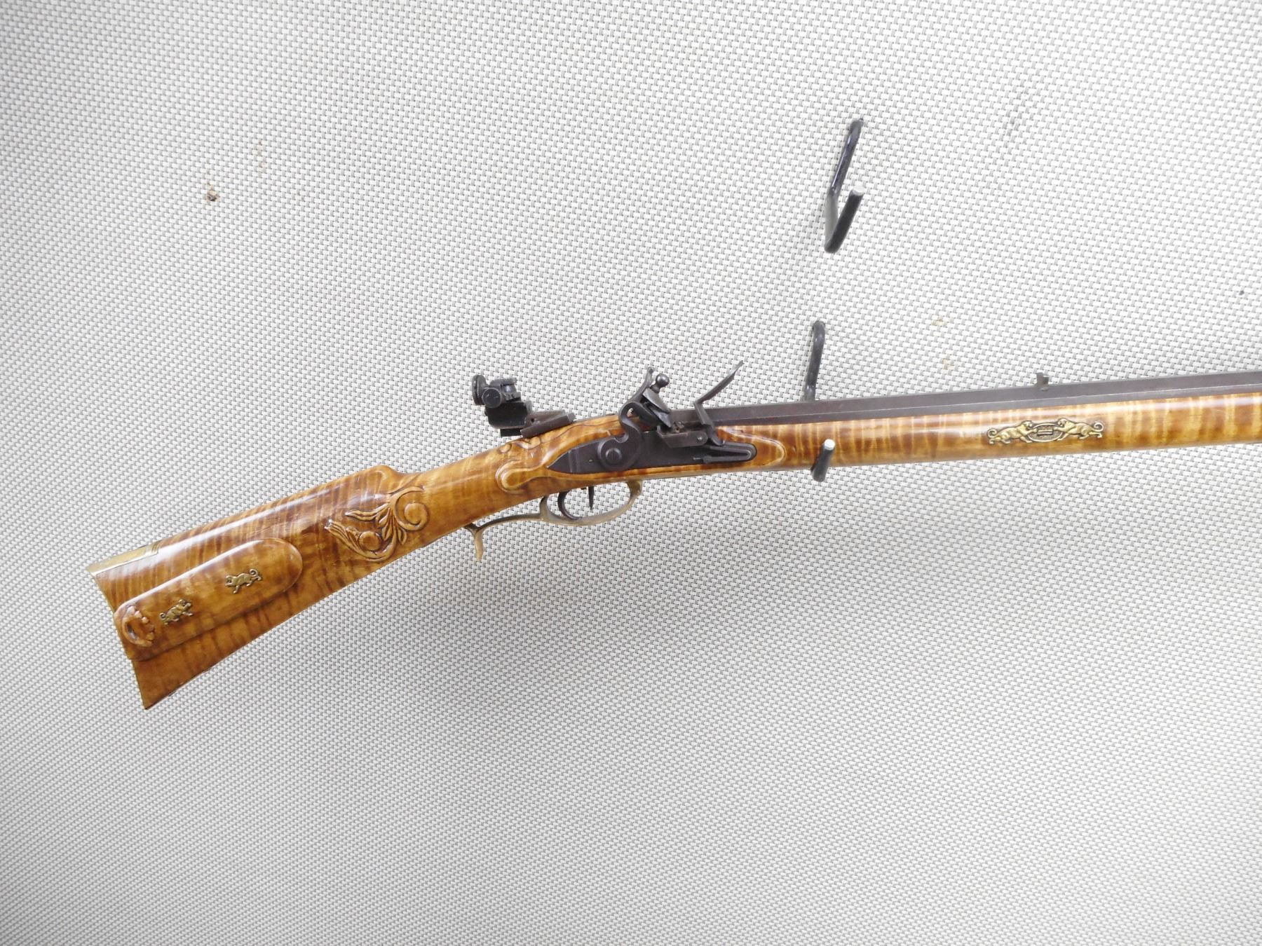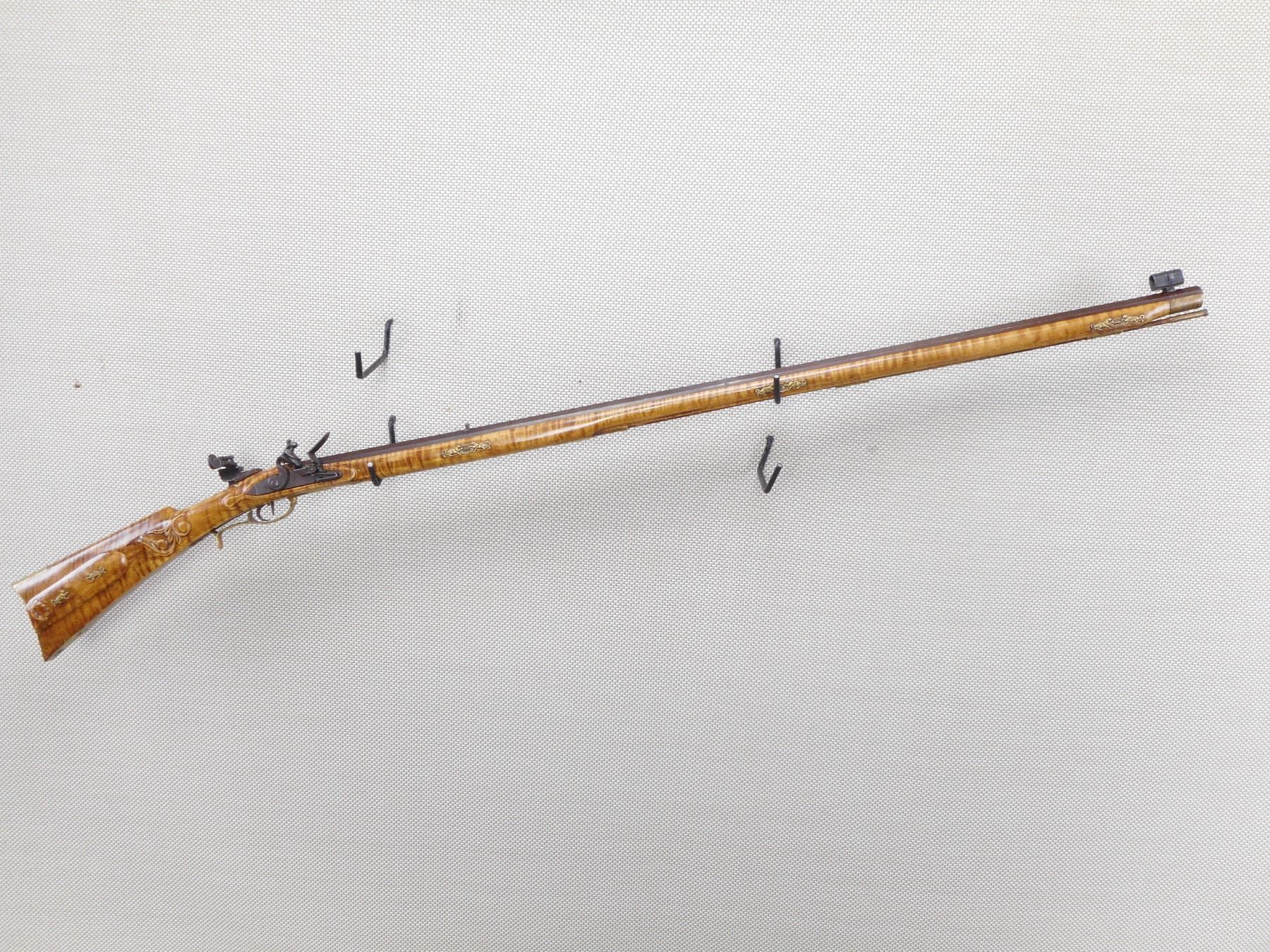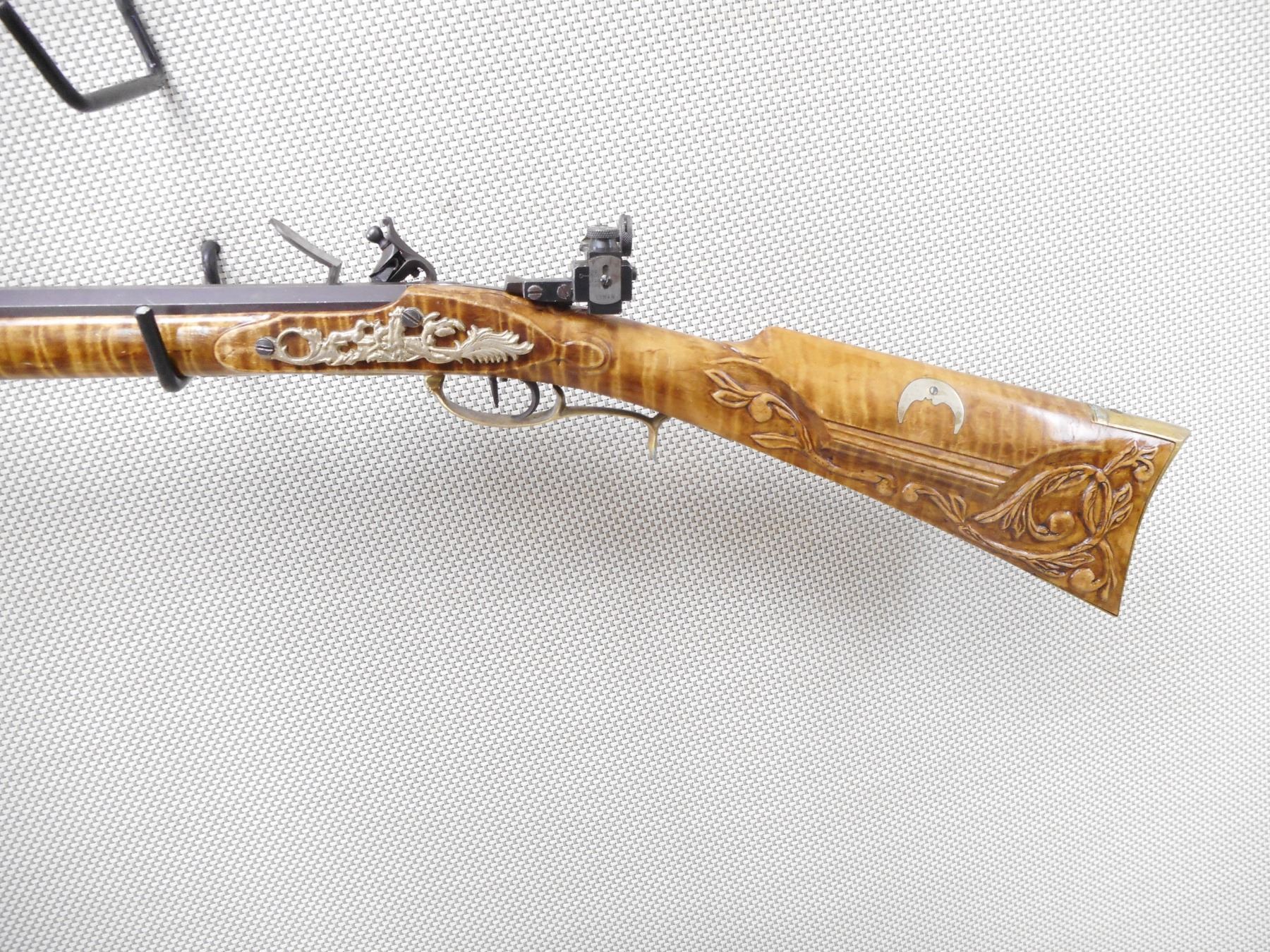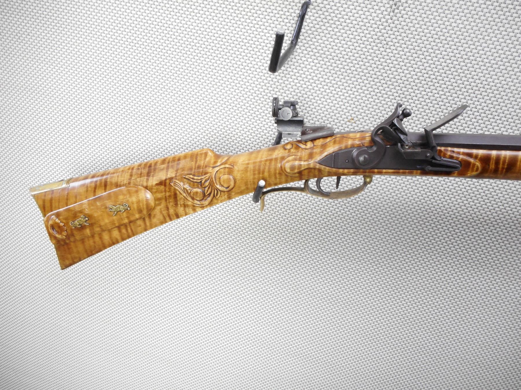 BRIAN W ALLEN , MODEL: KENTUCKY STYLE , CALIBER: 45 CAL , BORE IS VERY GOOD. HOODED TARGET STYLE FRONT SIGHT. OCTAGONAL BARREL. BRASS FITTINGS AROUND BARREL WEDGES. BRASS TRIGGER GUARD. BRASS BUTT PLATE. CUSTOM LYMAN REAR PEEP SIGHT. PATCH BOX ON RIGHT SIDE OF STOCK. SHOWS SOME HANDLING MARKS AND WEAR. ACTION: FLINTLOCK , BARREL LENGTH: 44" , SERIAL # N/A , CONDITION: 7/10 ANTIQUE , CLASS: CANADIAN ANTIQUE CLASS