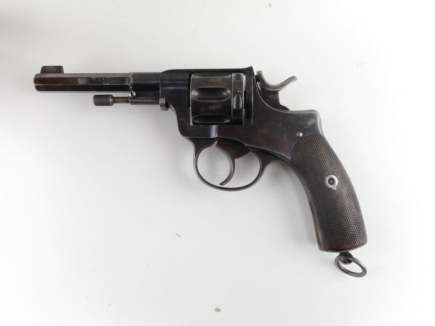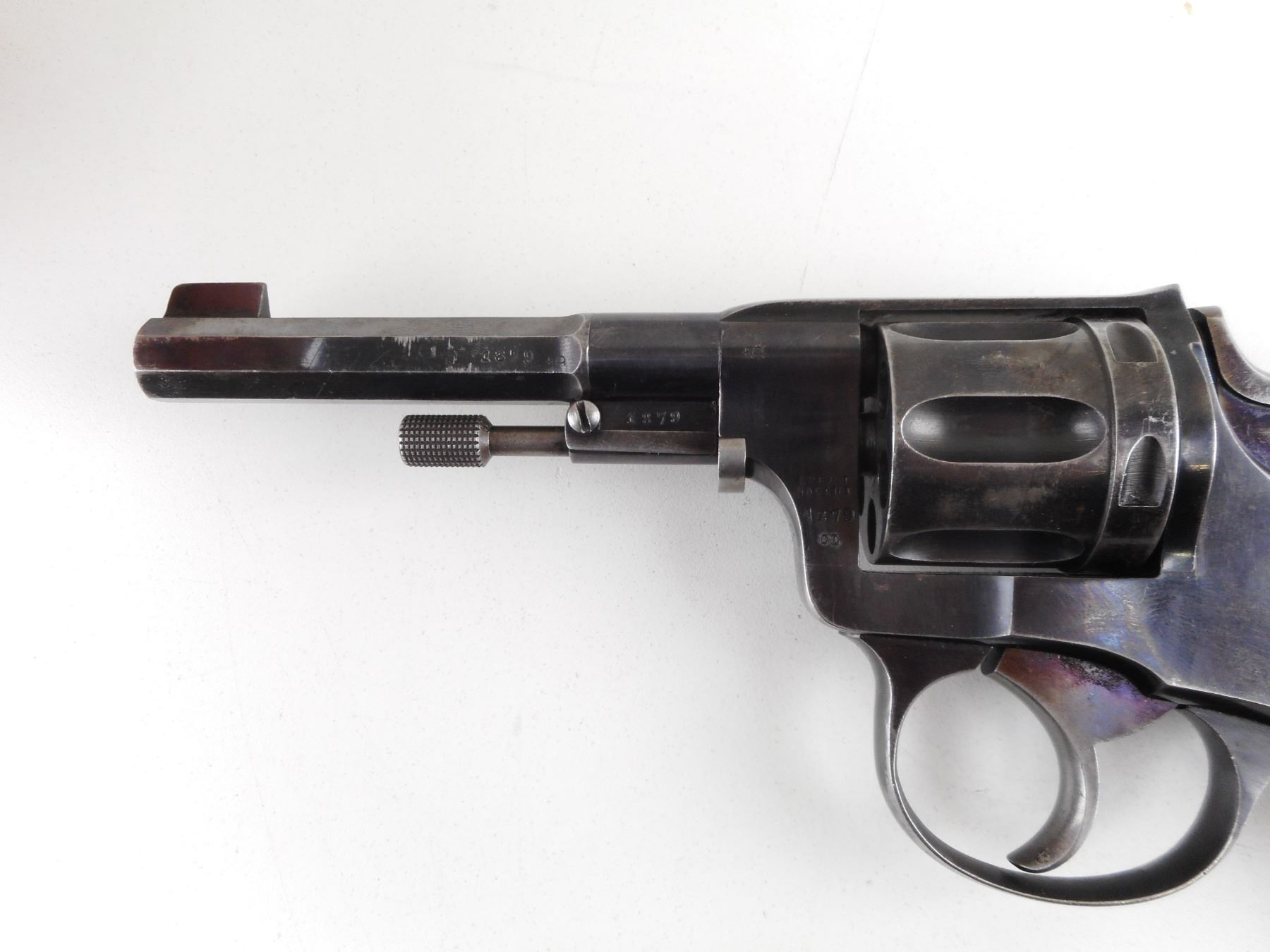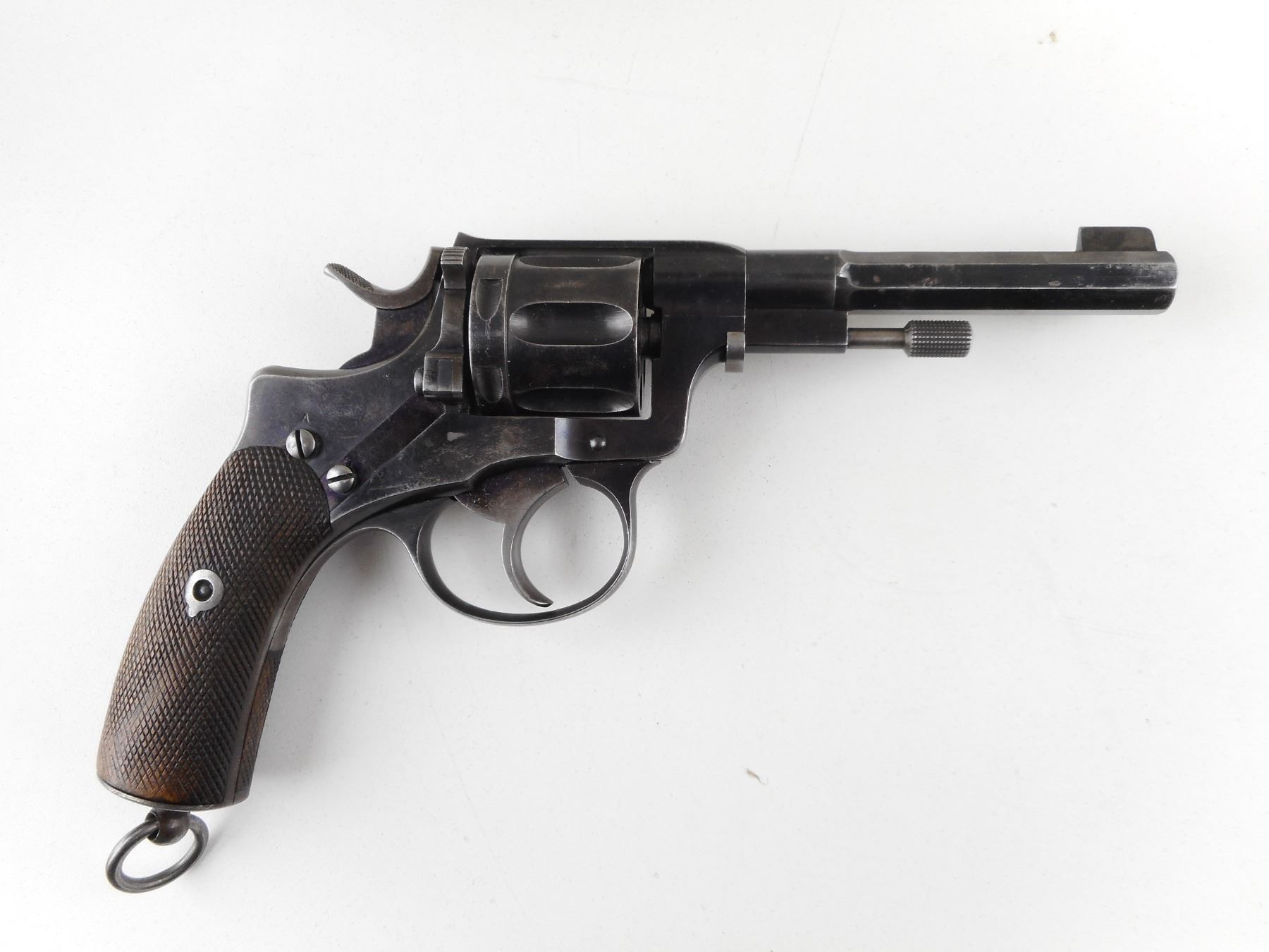 NAGANT , MODEL: 1883 , CALIBER: 7.5 NAGANT , 6 SHOT CAPACITY. BORE IS VERY GOOD. BARREL, RECEIVER ARE MATCHING BY SERIAL #. BLADE FRONT AND RAISED NOTCH REAR SIGHT. CHECKERED TWO PIECE HARDWOOD GRIPS. LANYARD LOOP. HOLDS COCK, INDEXES WELL, ACTION IS TIGHT. SHOWS SOME HANDLING MARKS. ACTION: REVOLVER , BARREL LENGTH: 112MM , SERIAL # 1879 , CONDITION: 7/10 ANTIQUE , CLASS: CANADIAN ANTIQUE CLASS