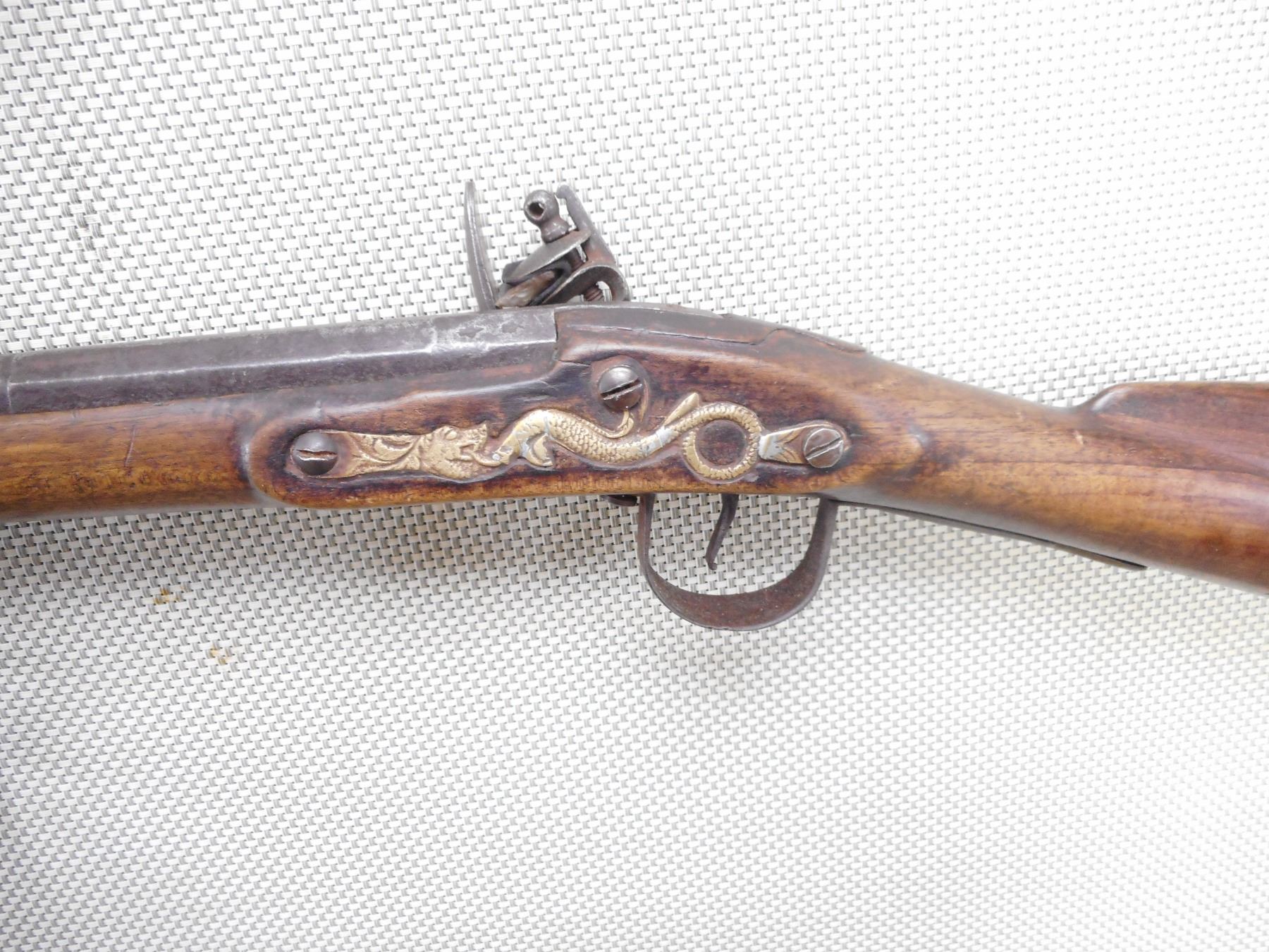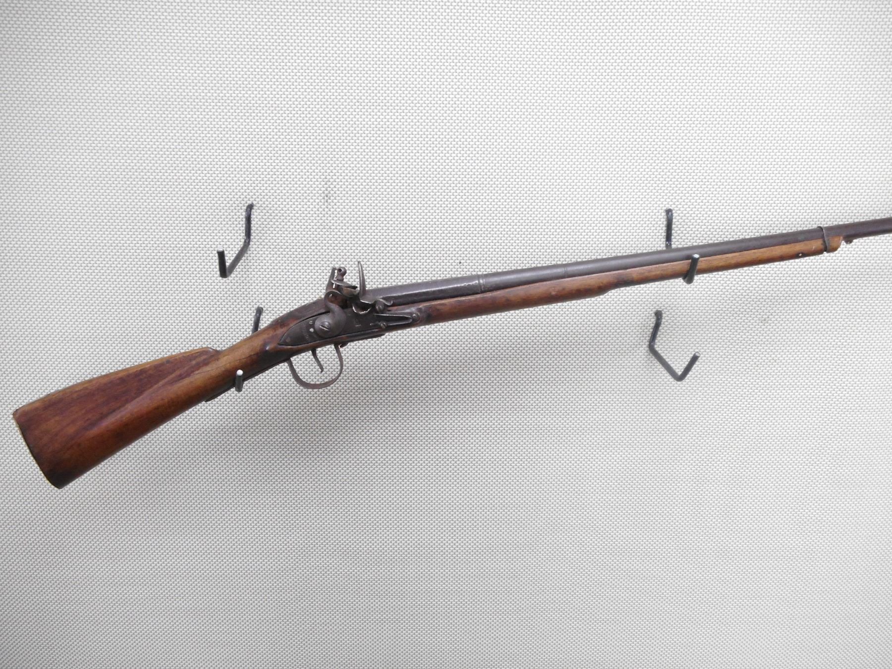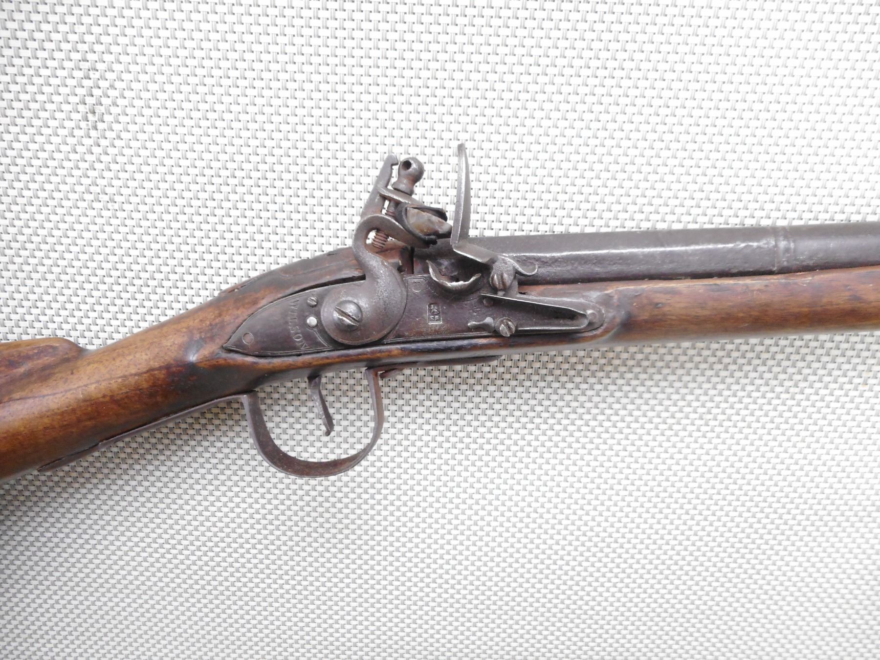 WILSON , MODEL: HUDSON BAY INDIAN TRADE MUSKET , CALIBER: 20GA , BORE IS FAIR. BLADE FRONT SIGHT. ROUND AND PARTIAL OCTAGONAL BARREL. PARTIAL LONDON ON BARREL. SEVERAL INDISTINCT PROOF MARKS. SERPENT SIDE PLATE. LOCK MARKED WILSON WITH TOMBSTONE FOX. BRASS BUTT PLATE. MISSING THE RAM ROD AND FITTINGS. WIRE AROUND THE FORESTOCK AND BARREL. SHOWS LIGHT PITTING. FINISH TURNED BROWN ON METAL. LOCK FUNCTIONS. NUMEROUS HANDLING MARKS AND WEAR. ACTION: FLINTLOCK , BARREL LENGTH: 36 1/2" , SERIAL # N/A , CONDITION: 5/10 , CLASS: CANADIAN ANTIQUE CLASS