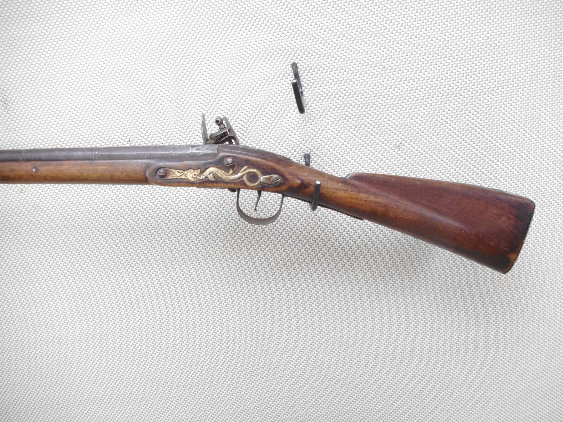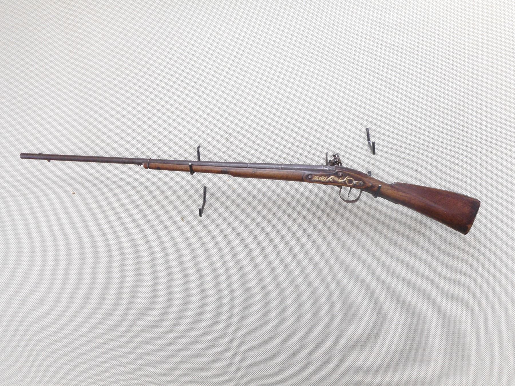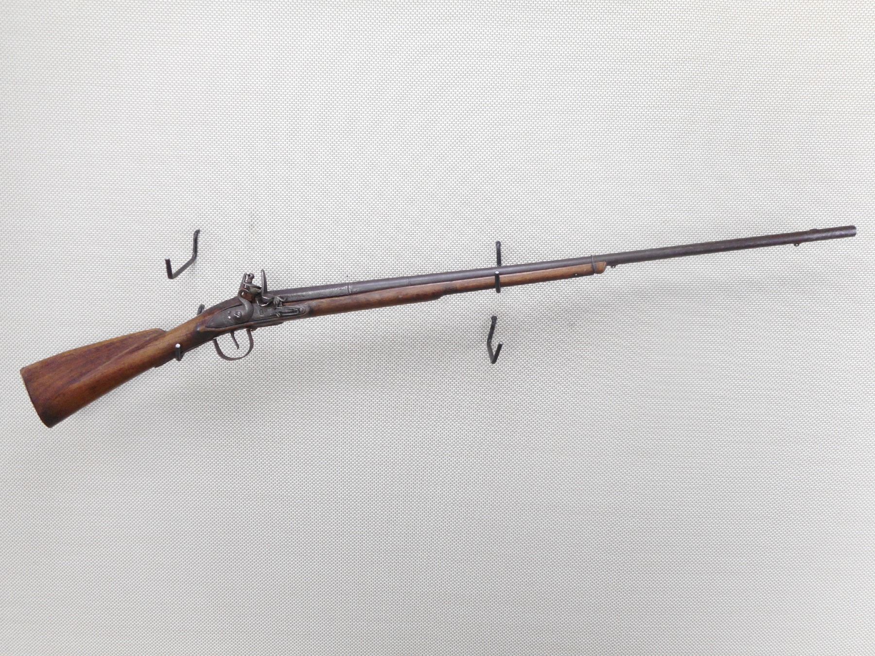WILSON , MODEL: HUDSON BAY INDIAN TRADE MUSKET , CALIBER: 20GA , BORE IS FAIR. BLADE FRONT SIGHT. ROUND AND PARTIAL OCTAGONAL BARREL. PARTIAL LONDON ON BARREL. SEVERAL INDISTINCT PROOF MARKS. SERPENT SIDE PLATE. LOCK MARKED WILSON WITH TOMBSTONE FOX. BRASS BUTT PLATE. MISSING THE RAM ROD AND FITTINGS. WIRE AROUND THE FORESTOCK AND BARREL. SHOWS LIGHT PITTING. FINISH TURNED BROWN ON METAL. LOCK FUNCTIONS. NUMEROUS HANDLING MARKS AND WEAR. ACTION: FLINTLOCK , BARREL LENGTH: 36 1/2" , SERIAL # N/A , CONDITION: 5/10 , CLASS: CANADIAN ANTIQUE CLASS