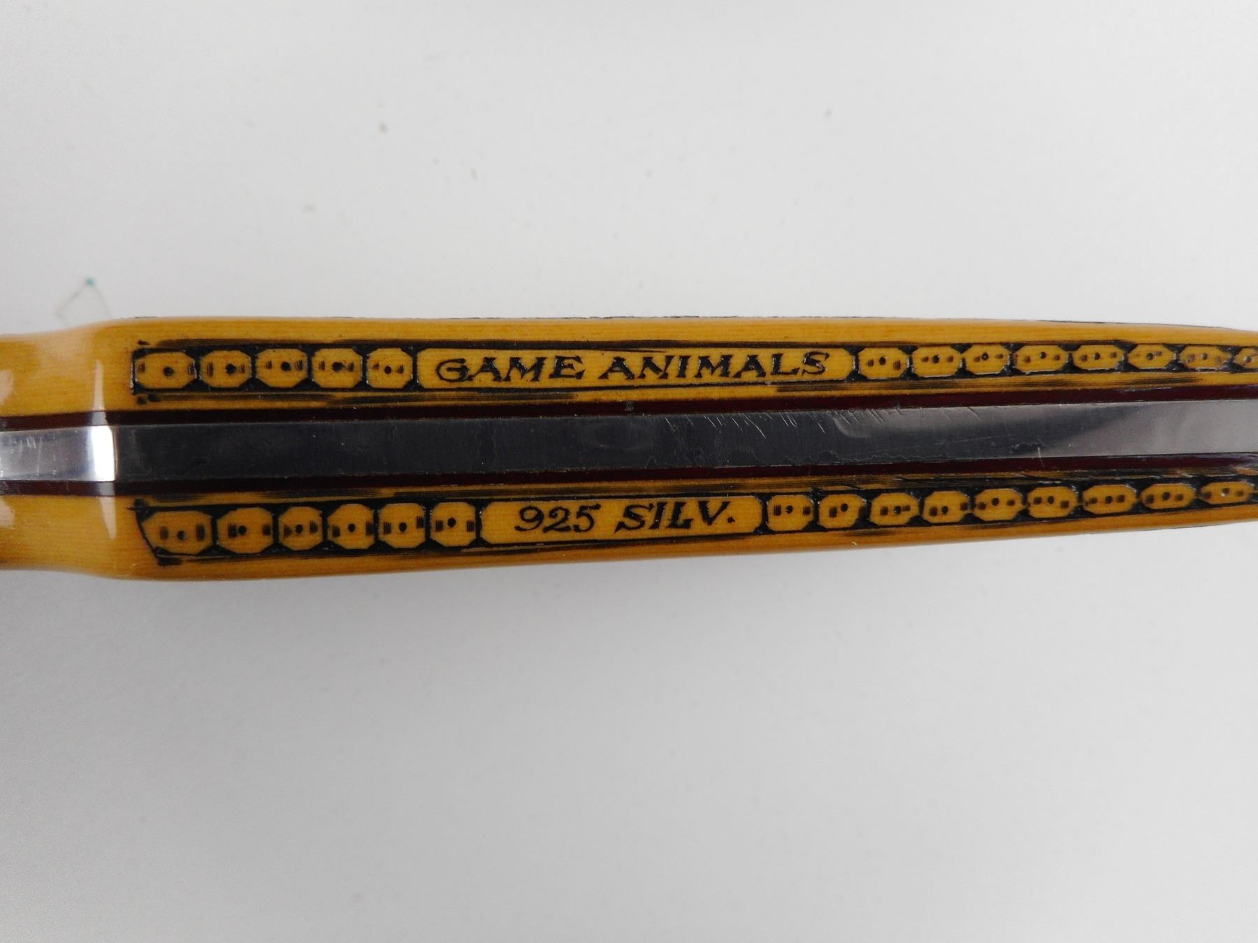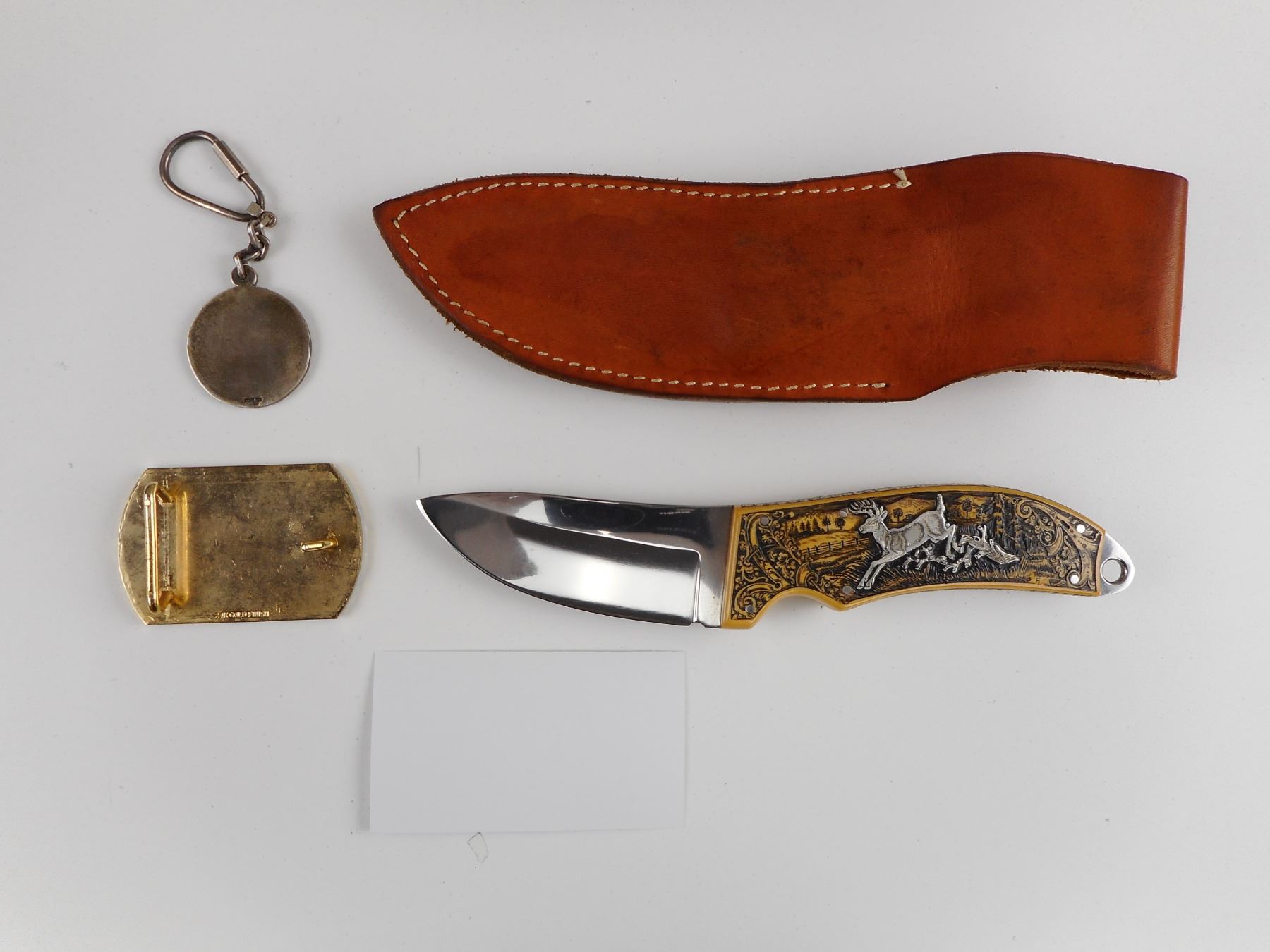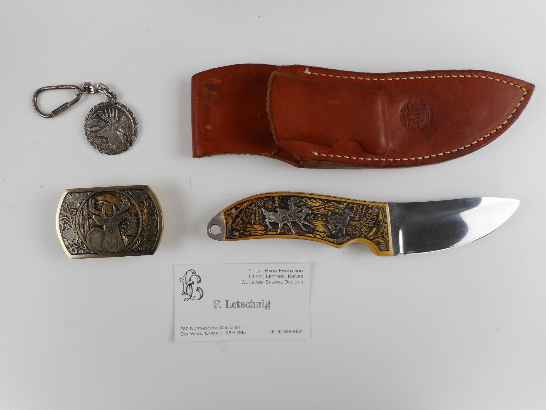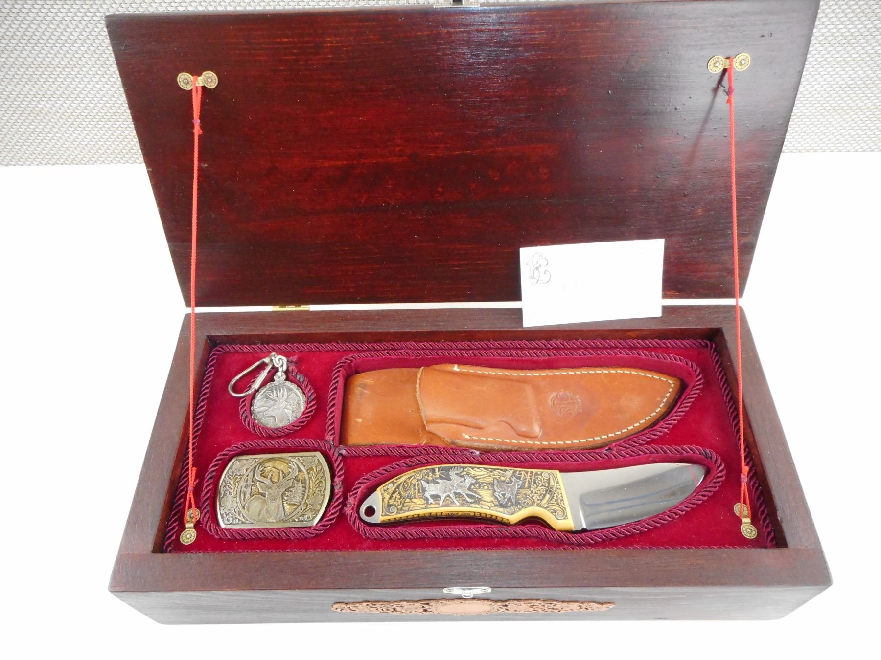 HAND CRAFTED STERLING SILVER AND BRASS FIXED BLADE KNIFE BOX SET (1) KNIFE HAND CRAFTED DEER ON IT, COMES WITH SHEATH (1) STERLING MEDAL WITH DEER ON IT (1)24K GOLD FINISH BELT BUCKLE WITH DEER ON IT. BOX HAS BEEN HAND CRAFTED WITH BRONZE TYPE DECORATIVE FINISH. CASE SIZE APPROX. DIMENSIONS 14.75" X 7". CAREFULLY HAND CRAFTED BY F. LETSCHNIG.
