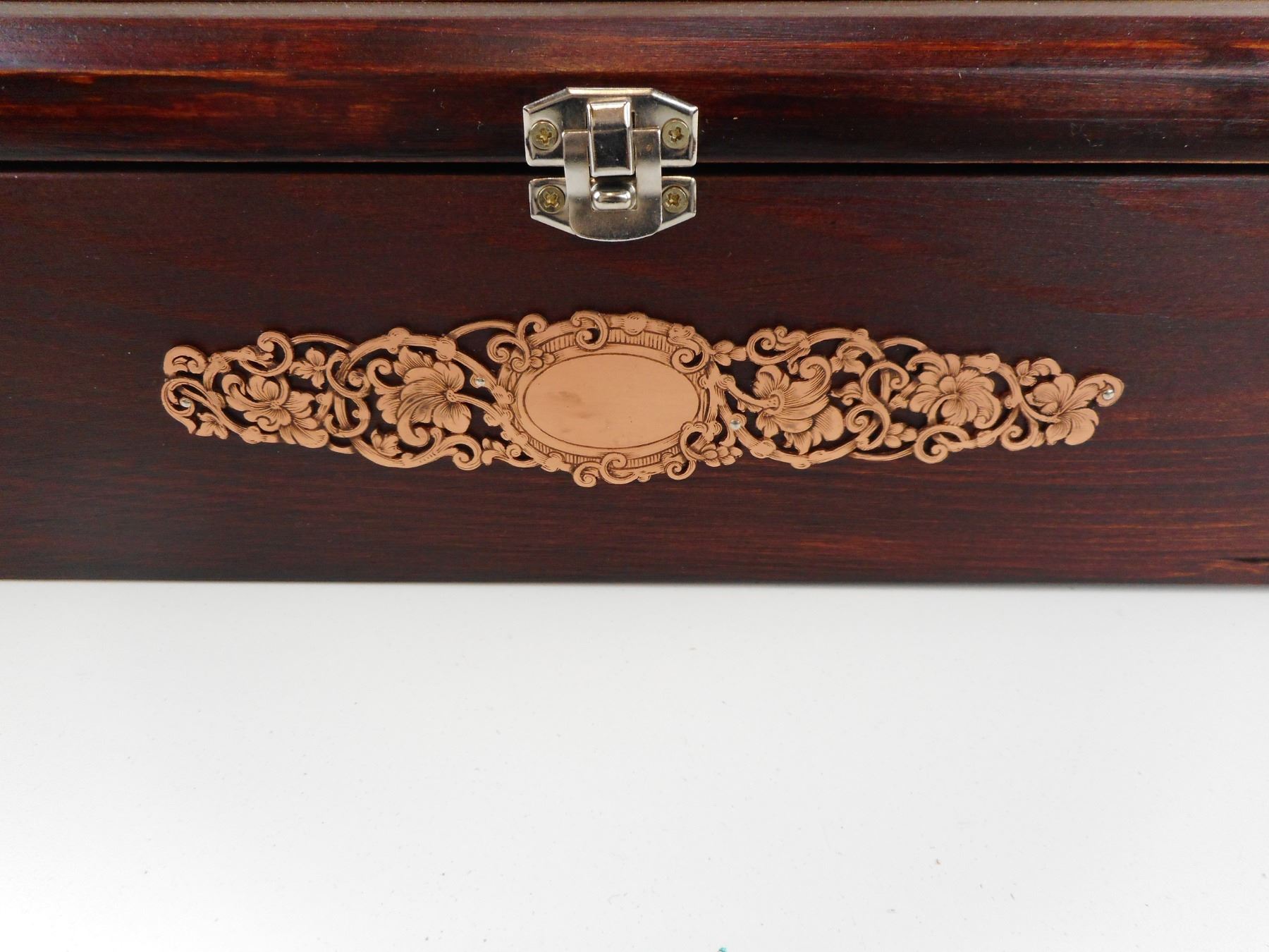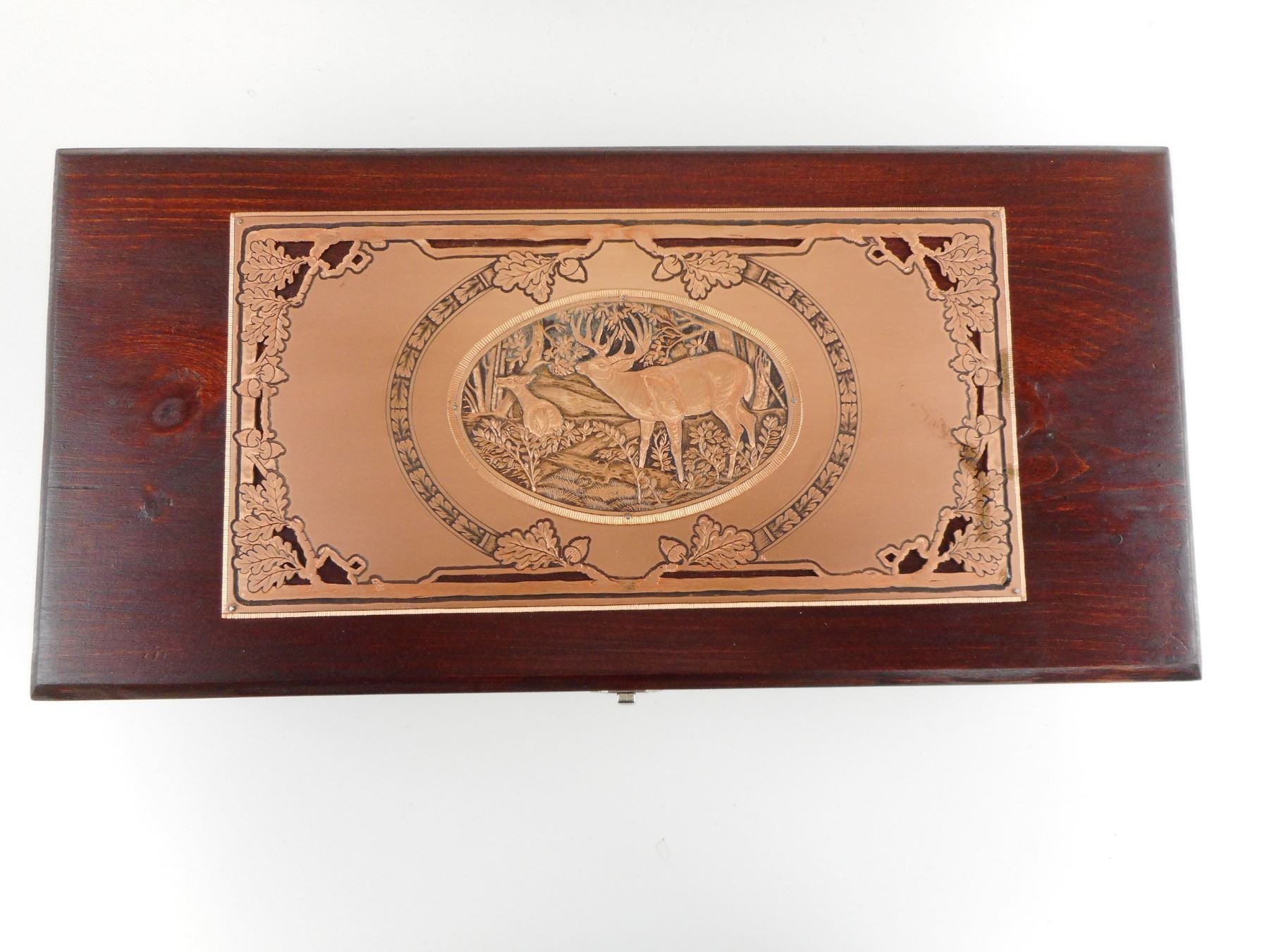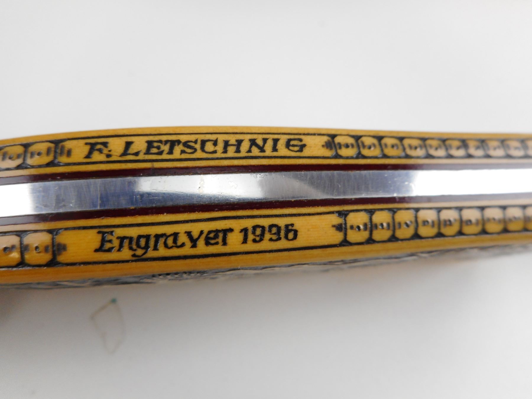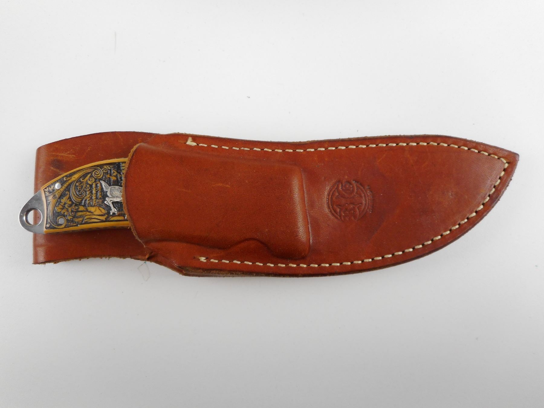 HAND CRAFTED STERLING SILVER AND BRASS FIXED BLADE KNIFE BOX SET (1) KNIFE HAND CRAFTED DEER ON IT, COMES WITH SHEATH (1) STERLING MEDAL WITH DEER ON IT (1)24K GOLD FINISH BELT BUCKLE WITH DEER ON IT. BOX HAS BEEN HAND CRAFTED WITH BRONZE TYPE DECORATIVE FINISH. CASE SIZE APPROX. DIMENSIONS 14.75" X 7". CAREFULLY HAND CRAFTED BY F. LETSCHNIG.