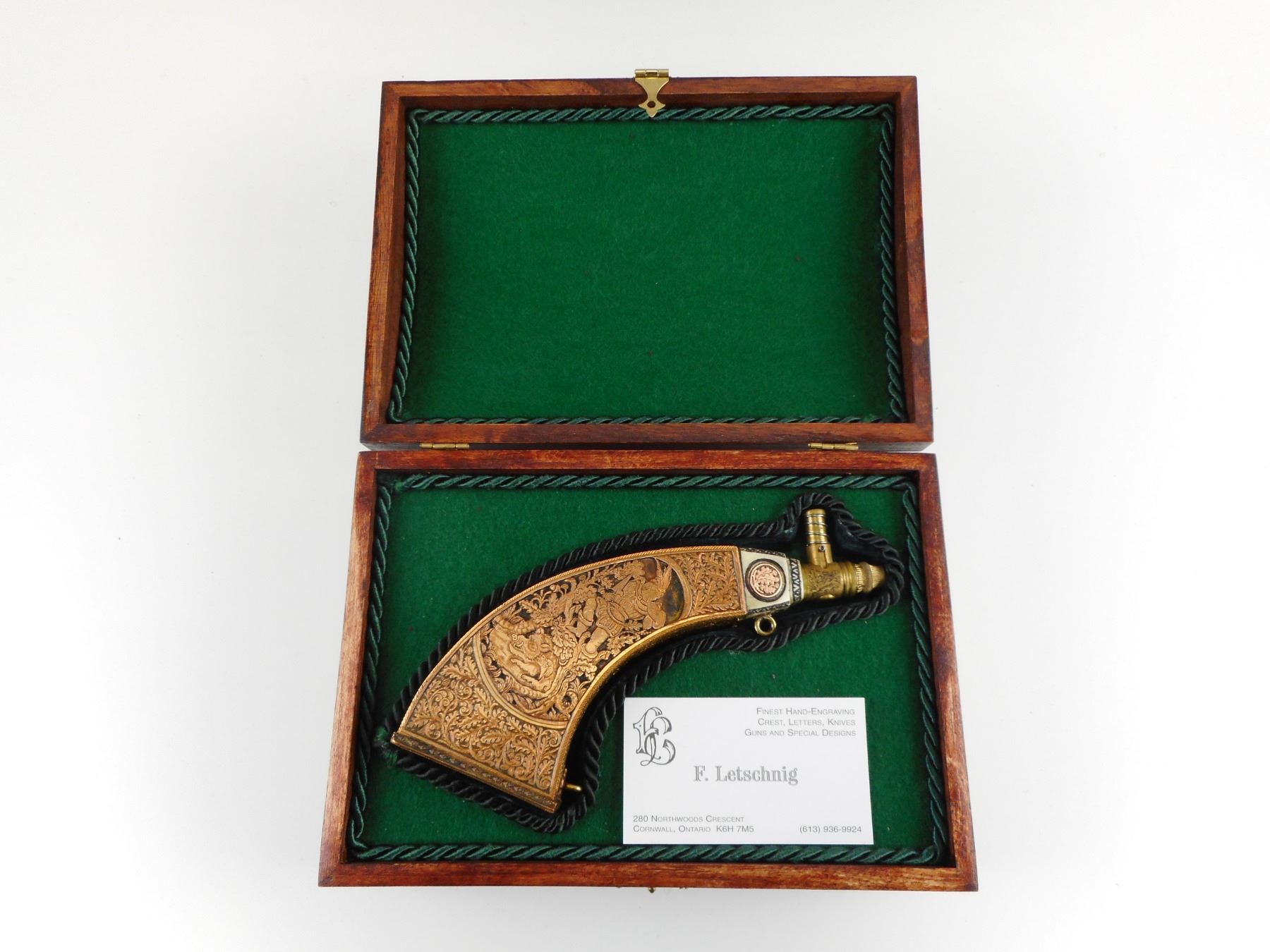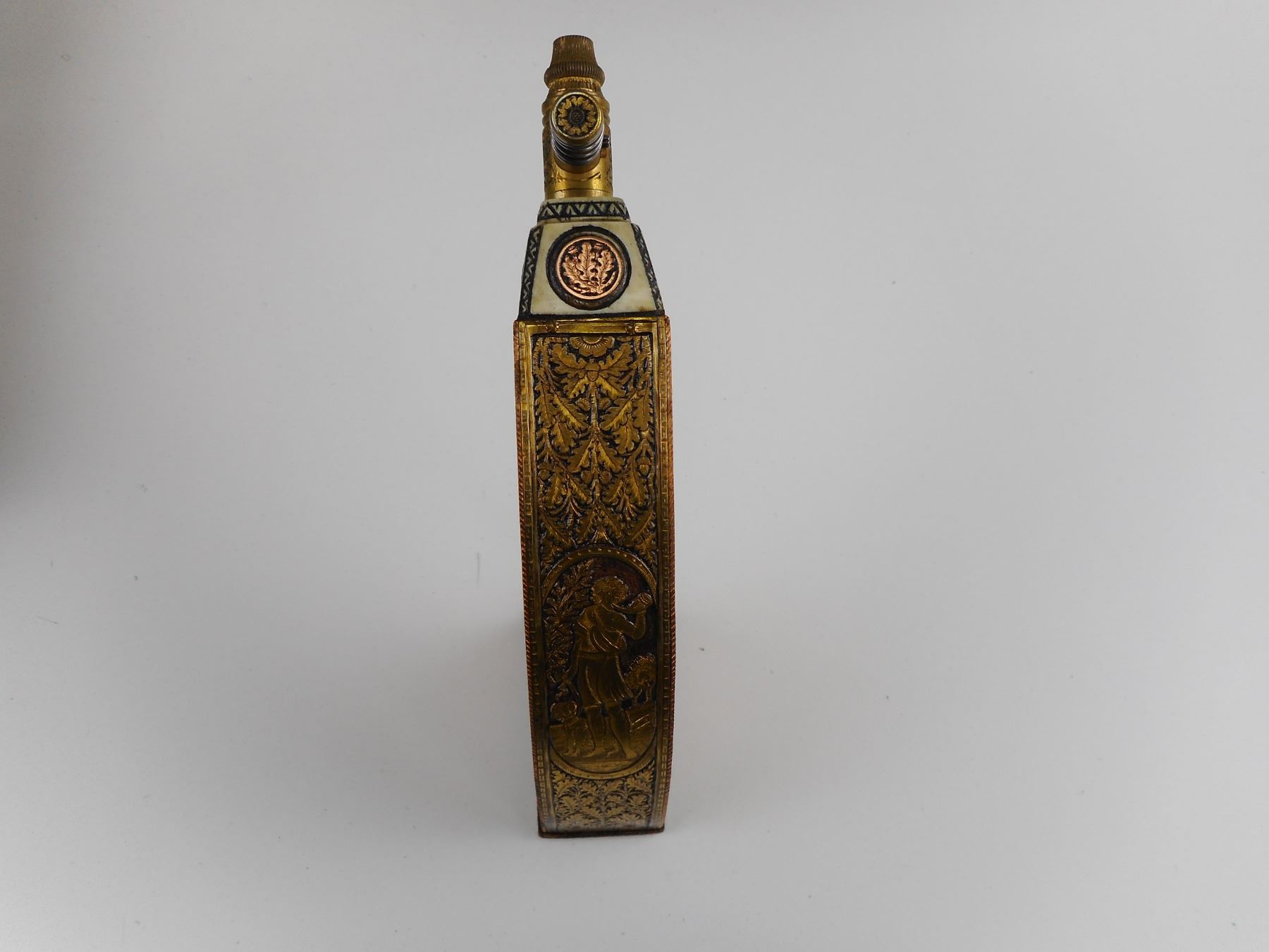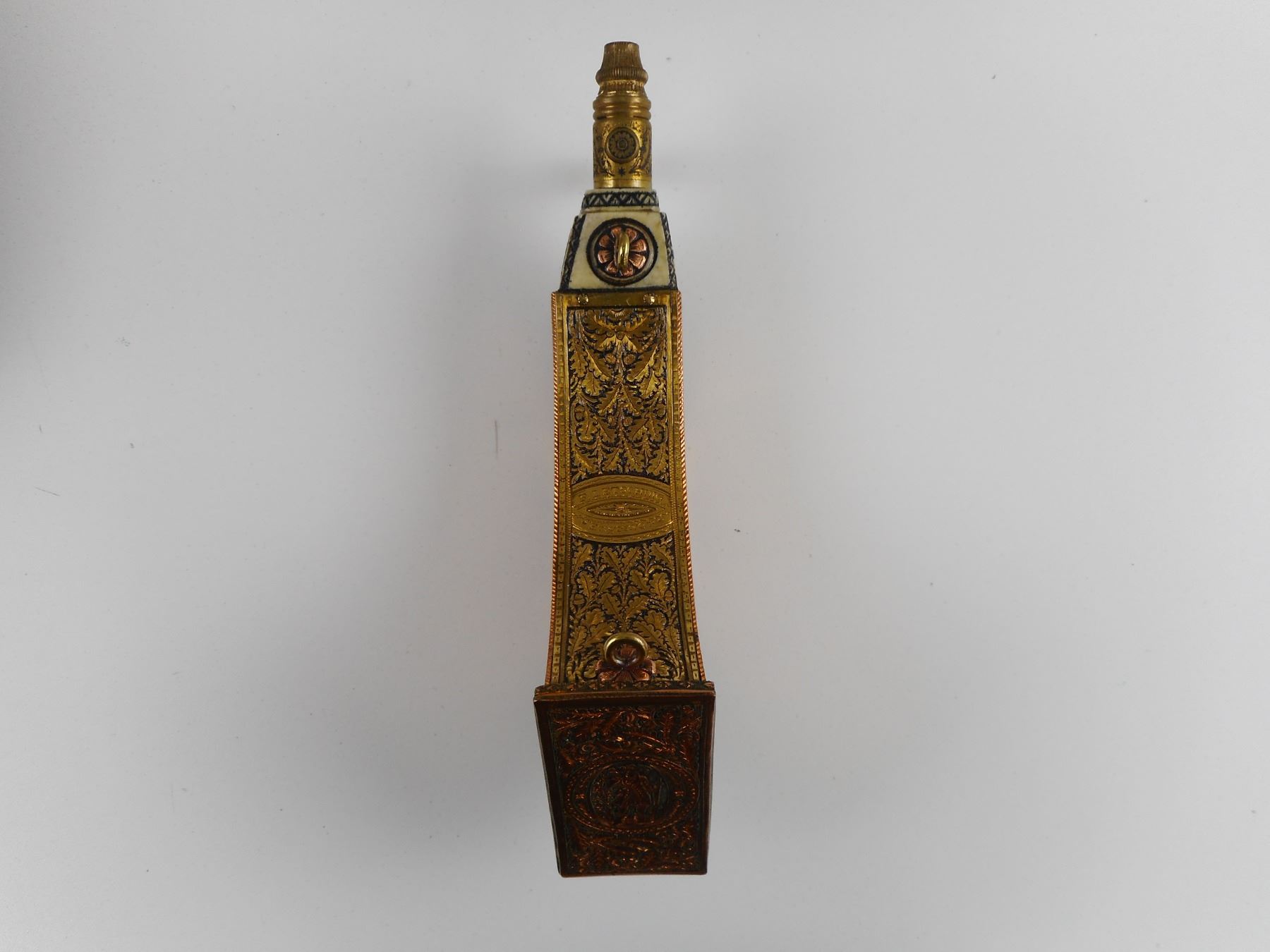 HAND CRAFTED COPPER/BRASS TYPE POWDER FLASK IN WOODEN BOX , (1) DECORATIVE POWDER FLASK, WITH BRASS AND COPPER TYPE FINISHINGS, IN VELVET LINED WOODEN BOX. BOX DIMENSIONS APPROX. 9" X 6.5". CAREFULLY HAND CRAFTED BY F. LETSCHNIG.