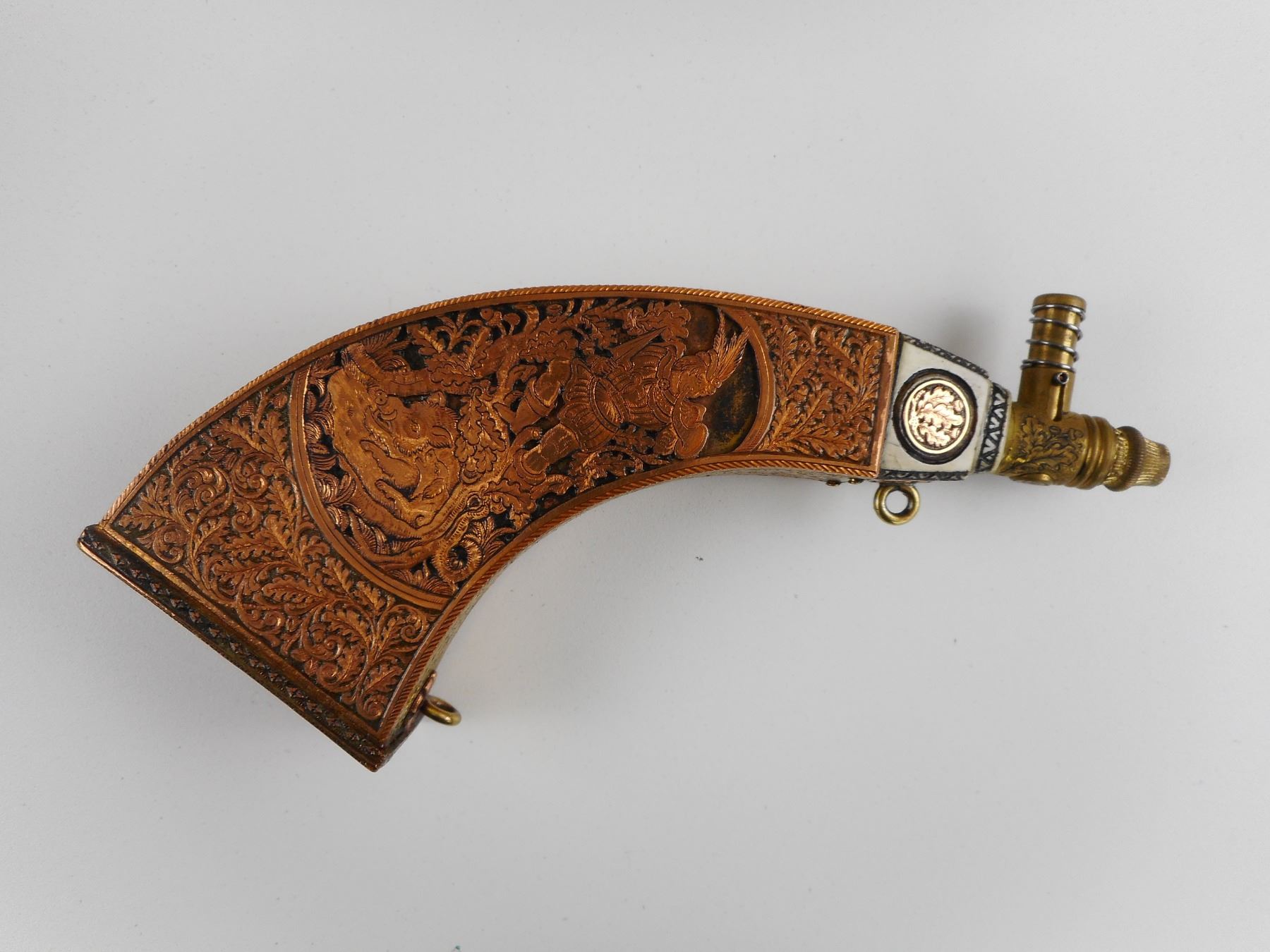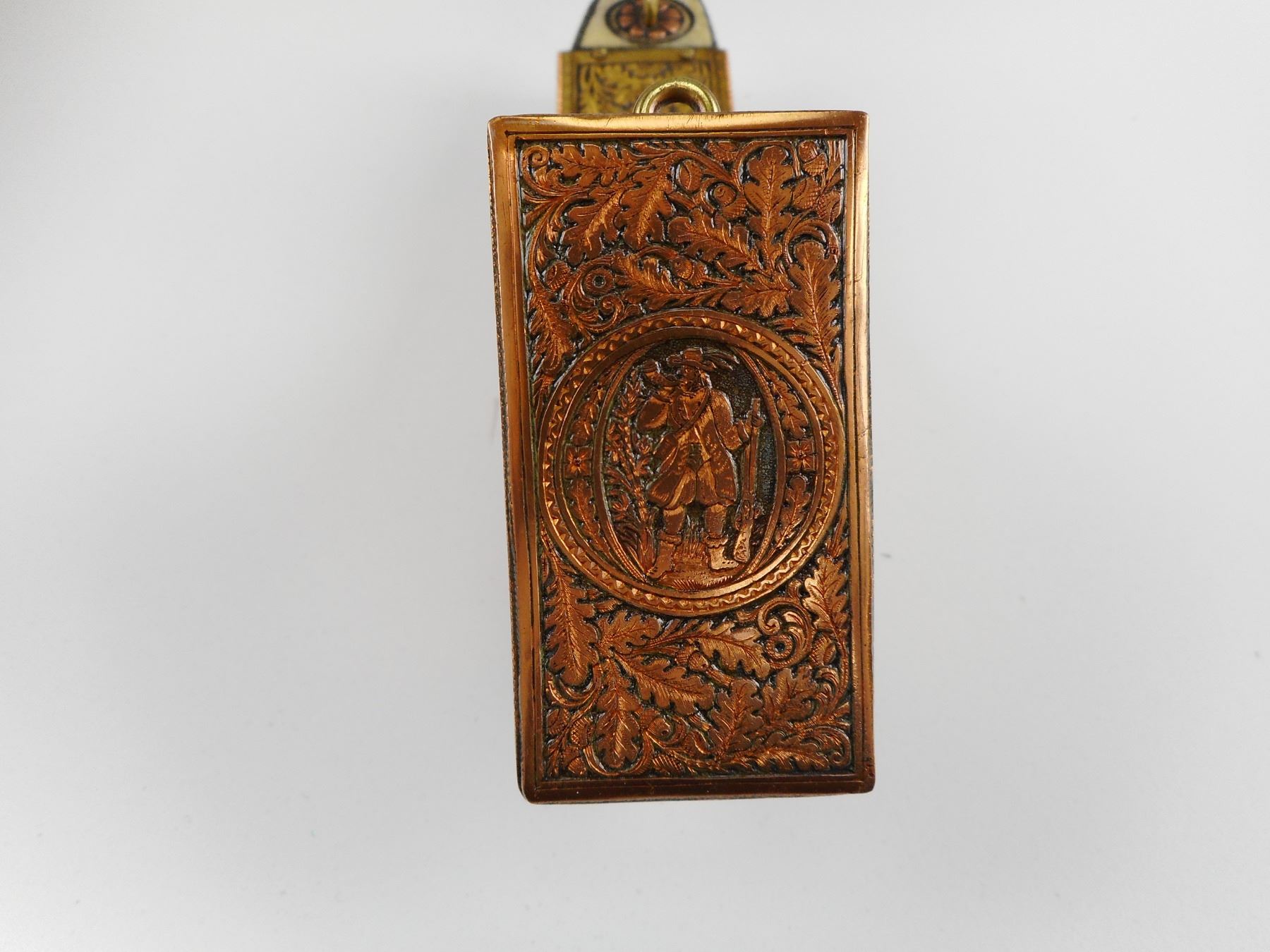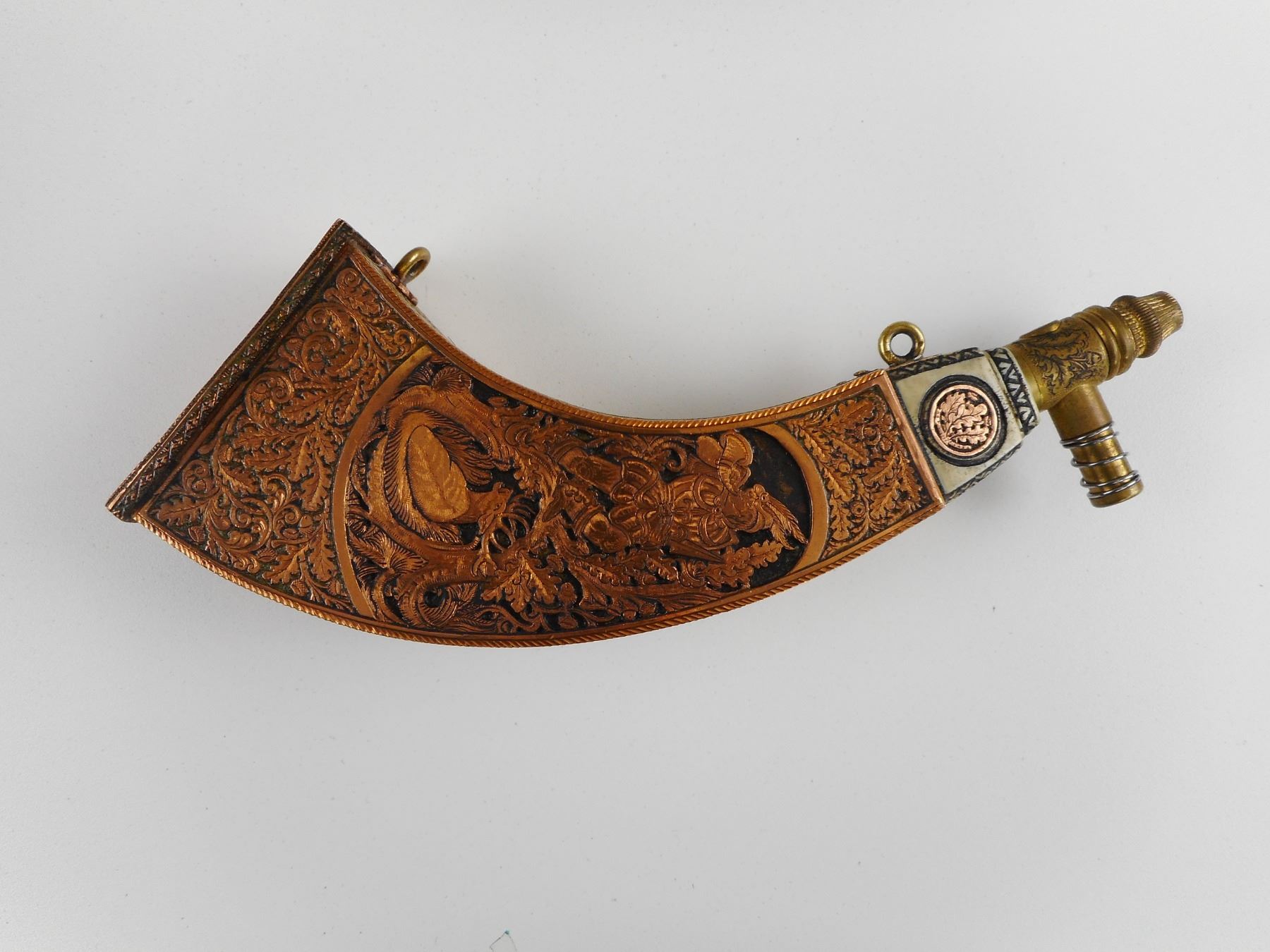Lot 1054 HAND CRAFTED COPPER/BRASS TYPE POWDER FLASK IN WOODEN BOX