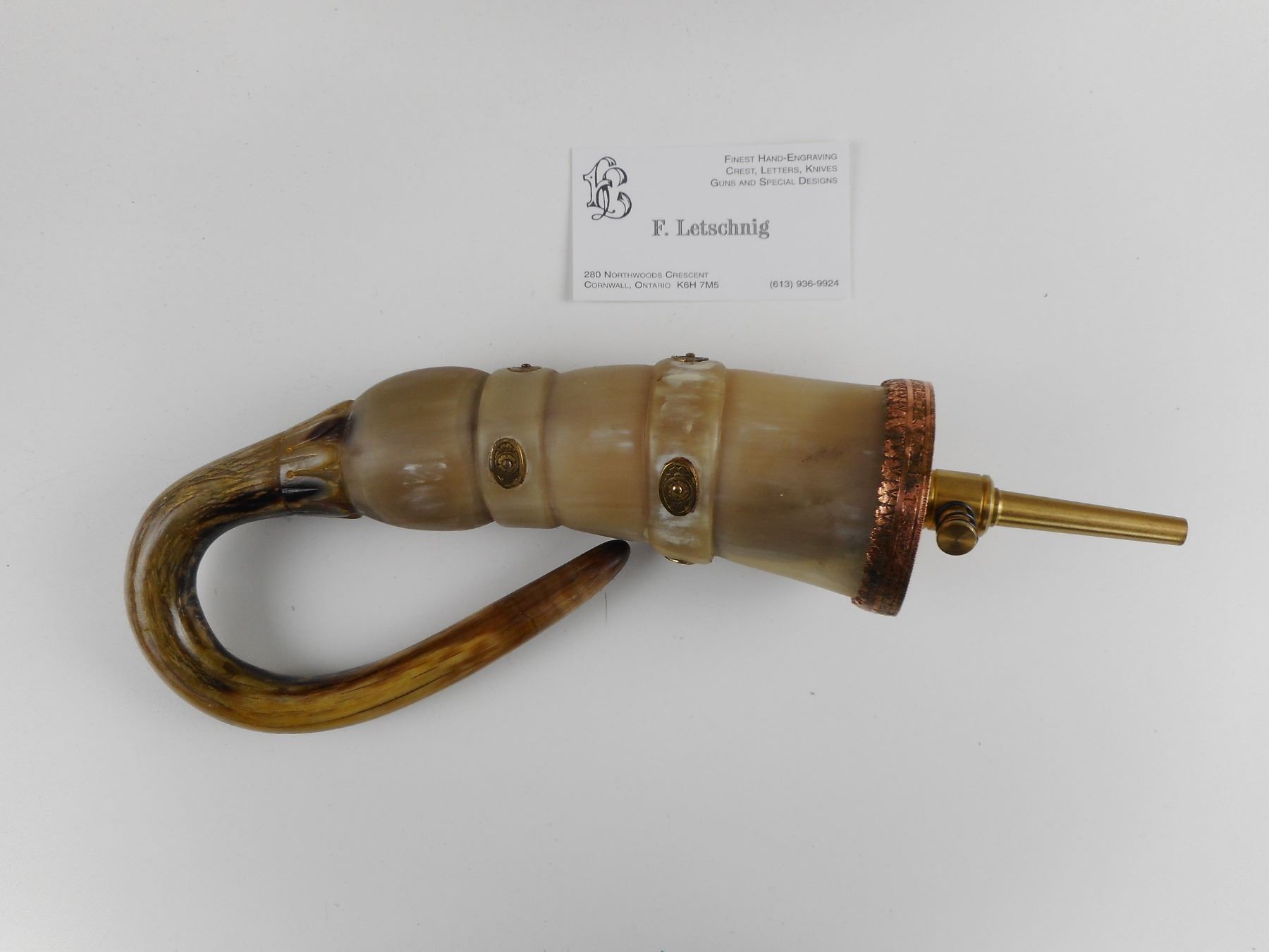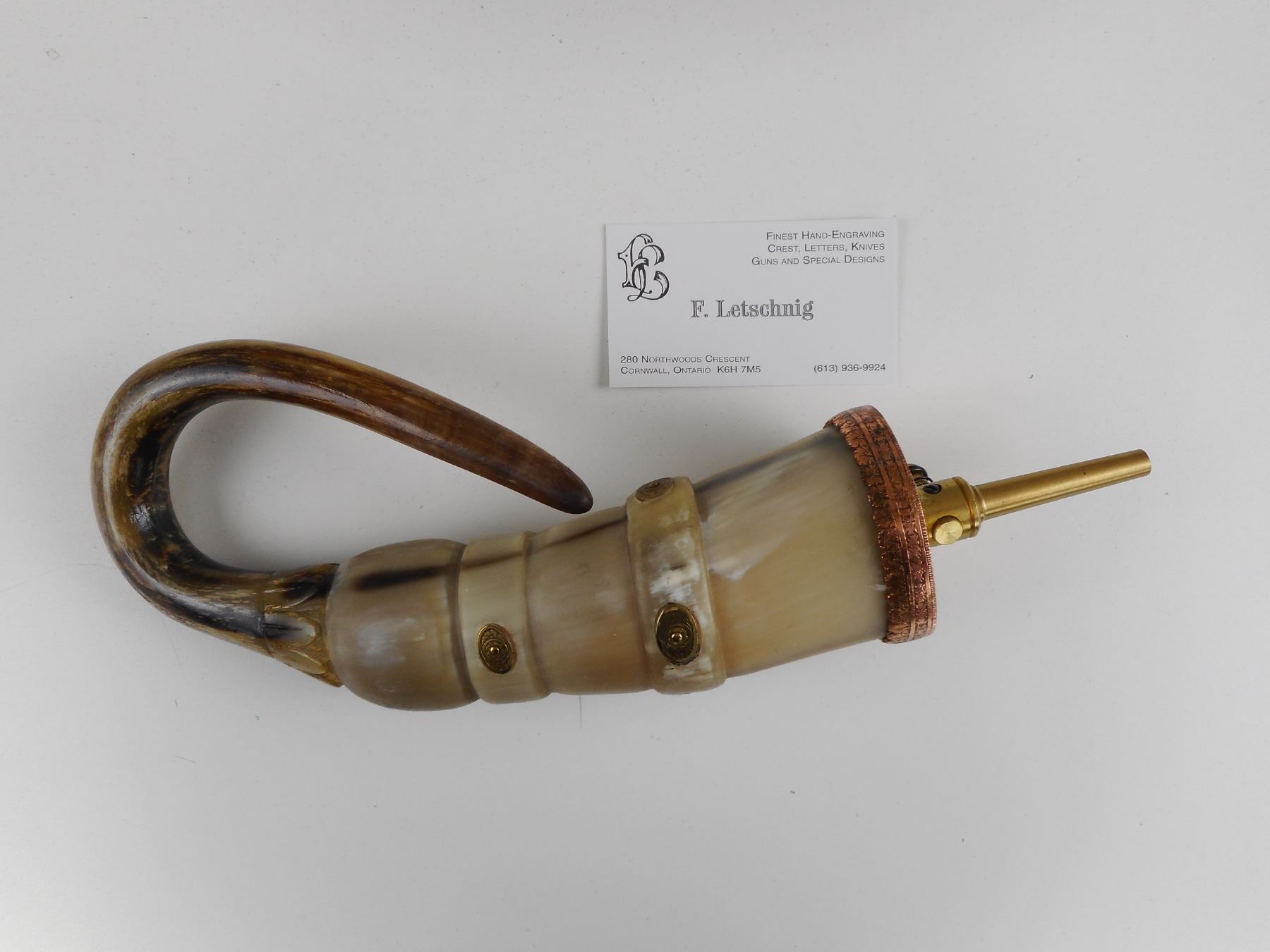 HAND CRAFTED ANIMAL ANTLER POWDER HORN , HORN LENGTH APPROX. 12". COPPER TYPE END ENGRAVED, BRASS TYPE ENGRAVINGS ON SIDE. CAREFULLY HAND CRAFTED BY F. LETSCHNIG.