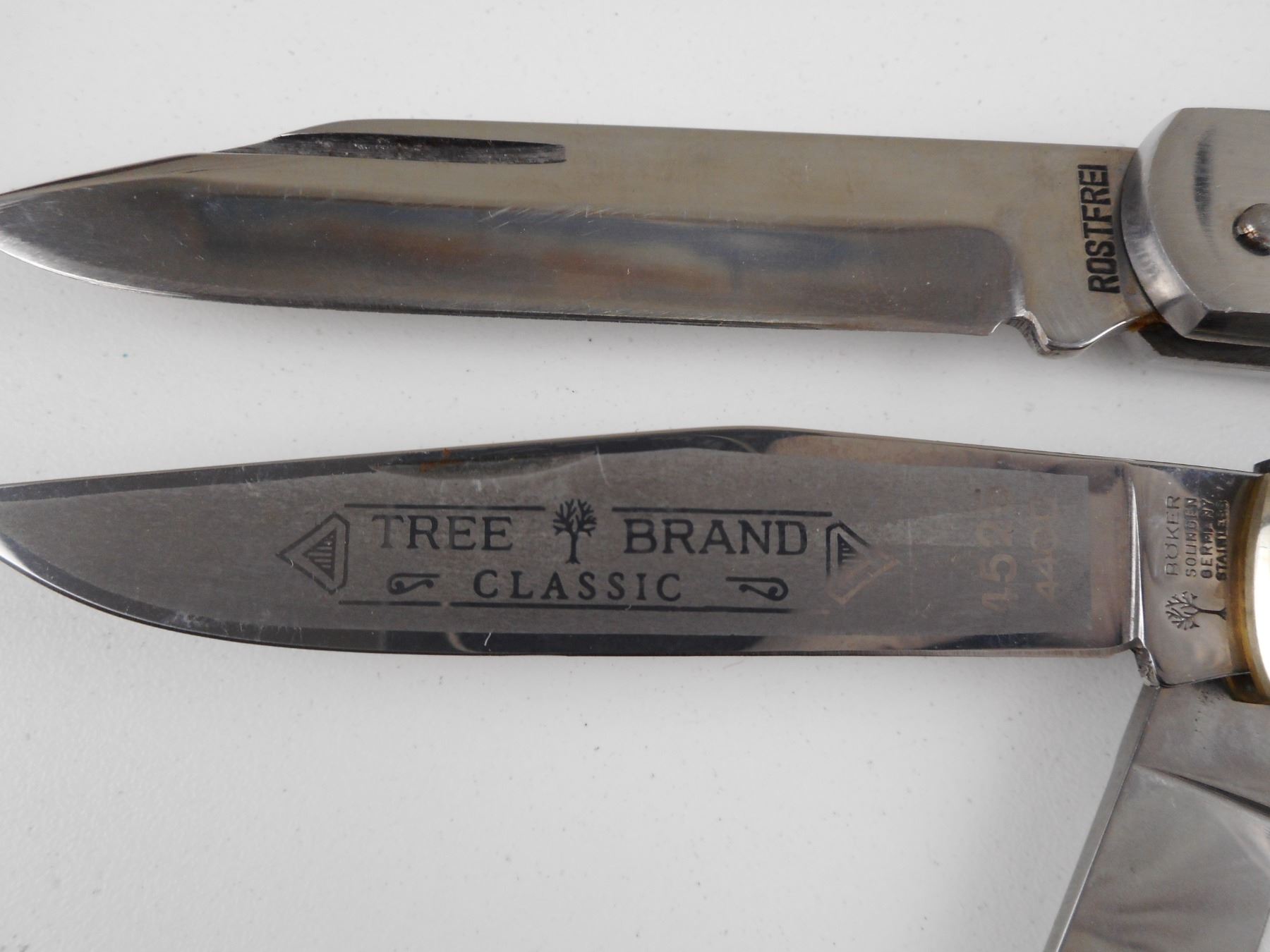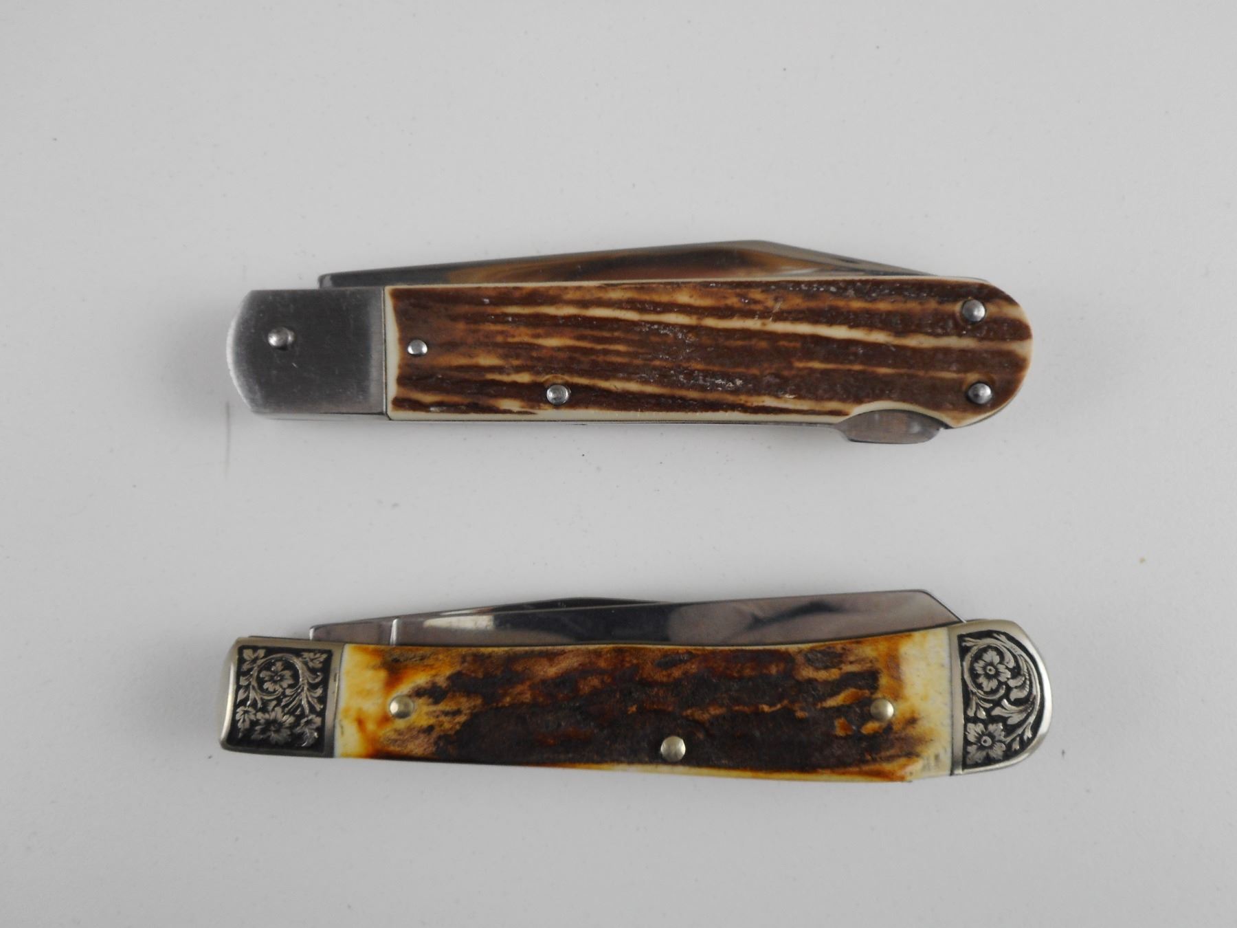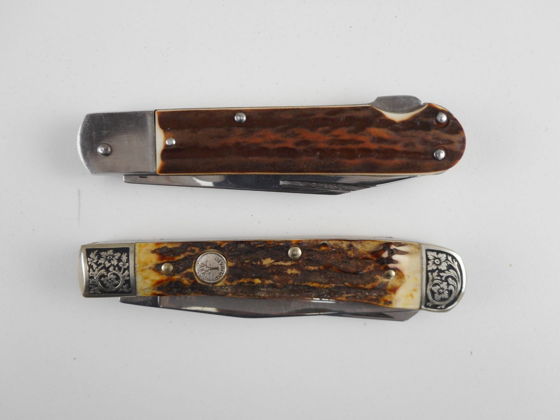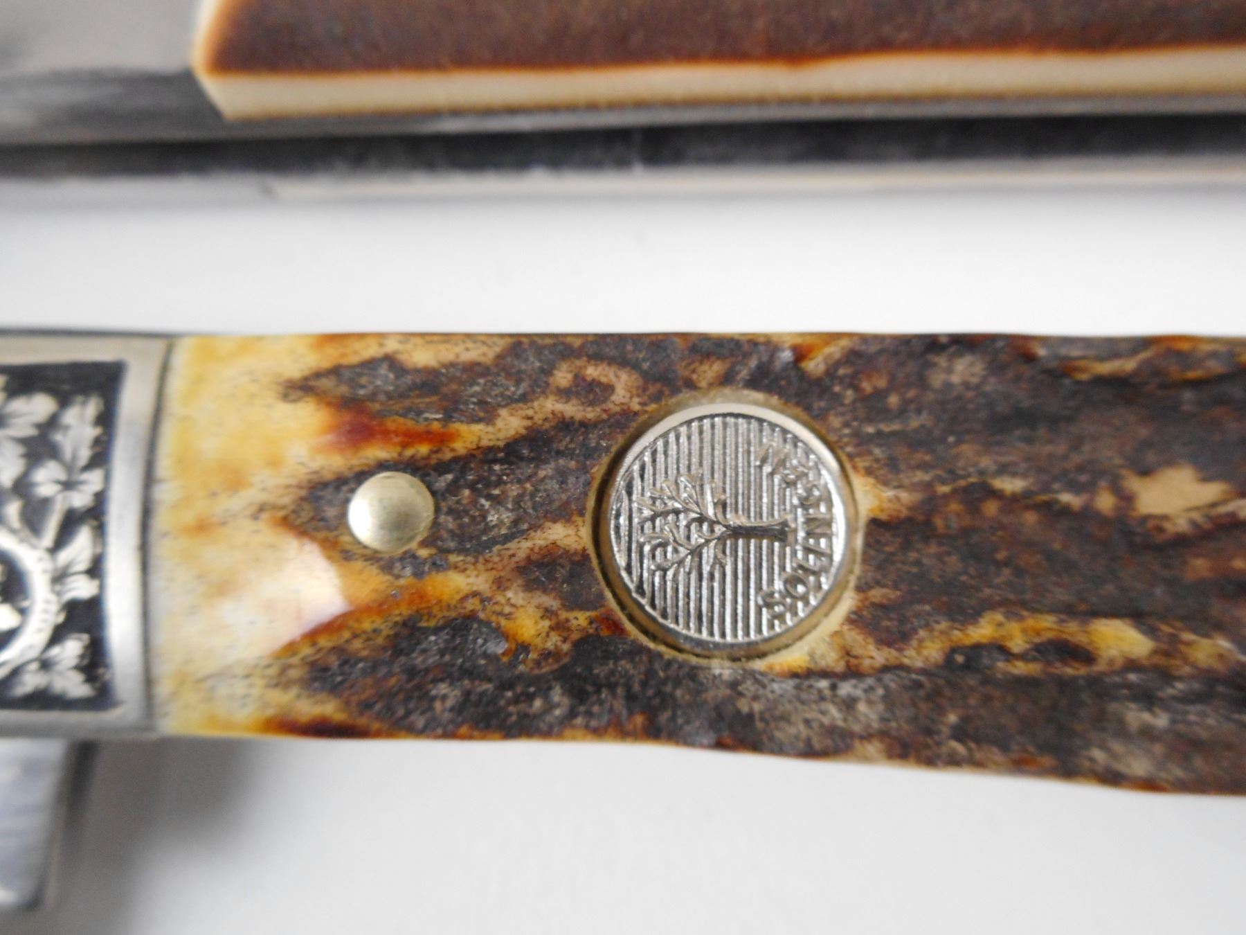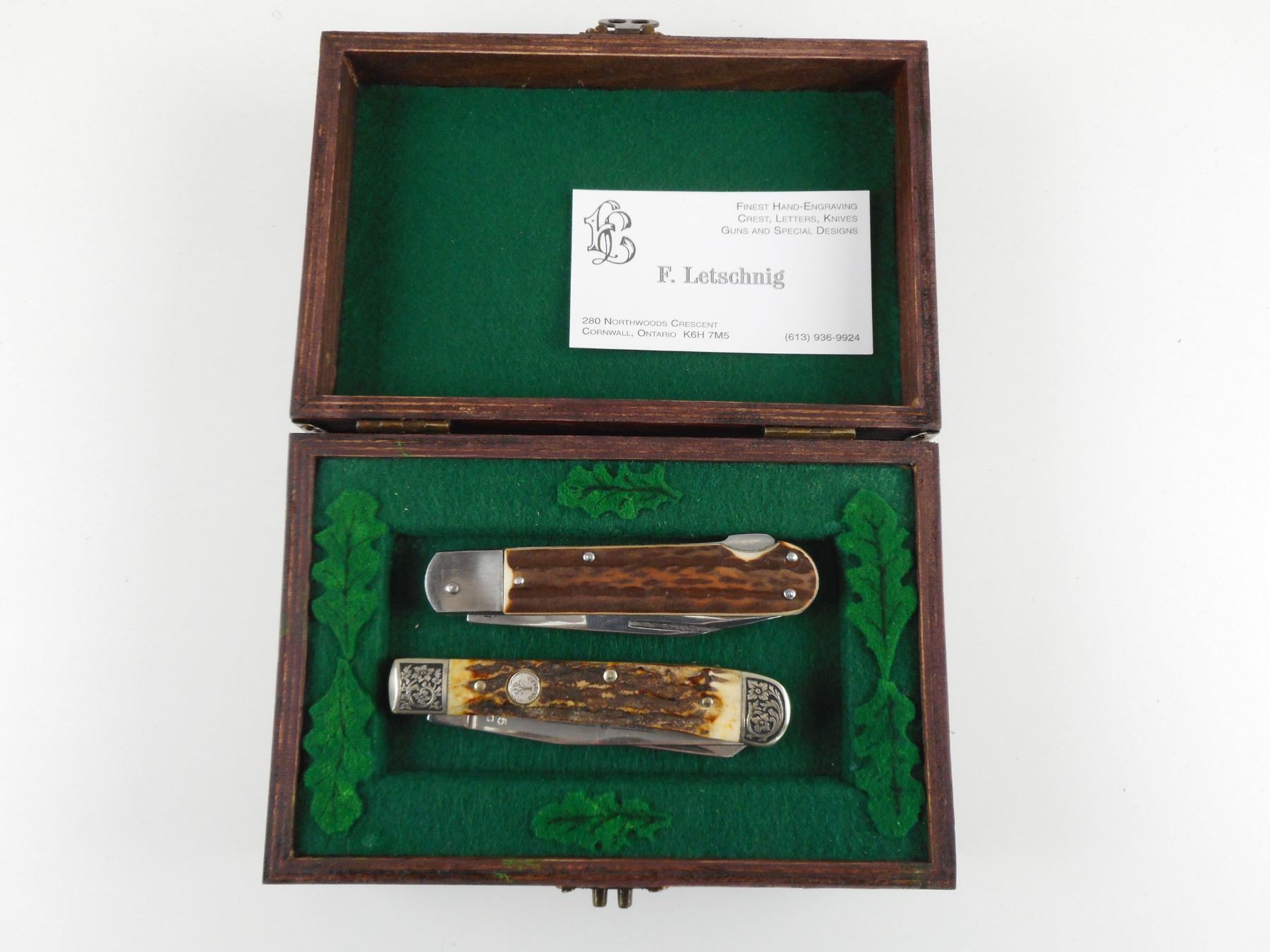 HAND CRAFTED POCKET KNIVES IN WOODEN BOX , (1) TREE BRAND CLASSIC WITH ANTLER HANDLE AND SILVER TYPE FINISHINGS. (1) MARKED ROSTFREI, WITH ANTLER TYPE HANDLE. BOX HAS BRASS TYPE MOOSE EMBLEM. WOODEN BOX DIMENSIONS 7" X 4.75". CAREFULLY HAND CRAFTED BY F. LETSCHNIG.