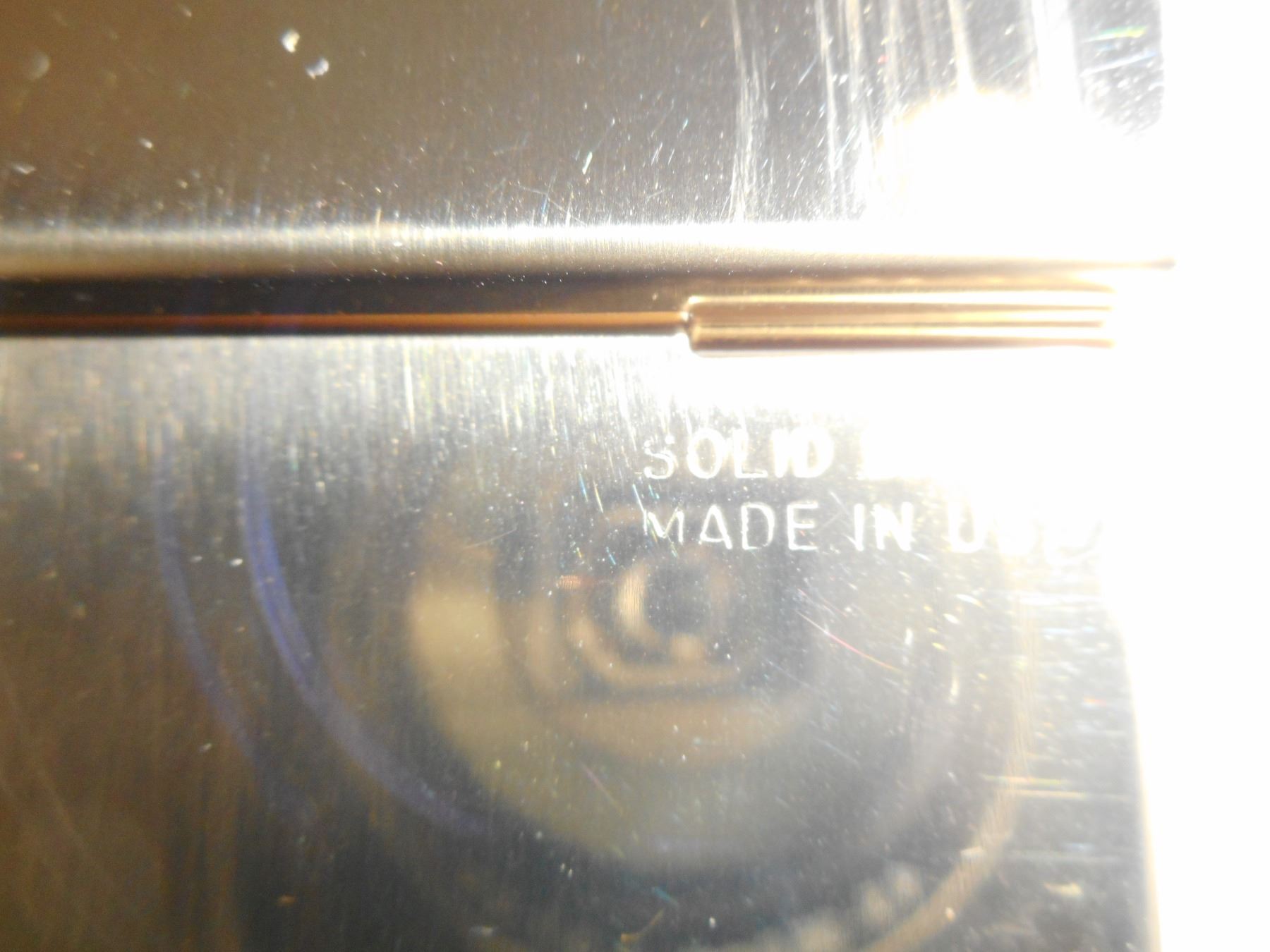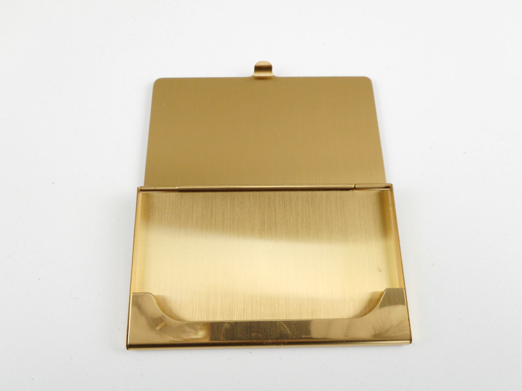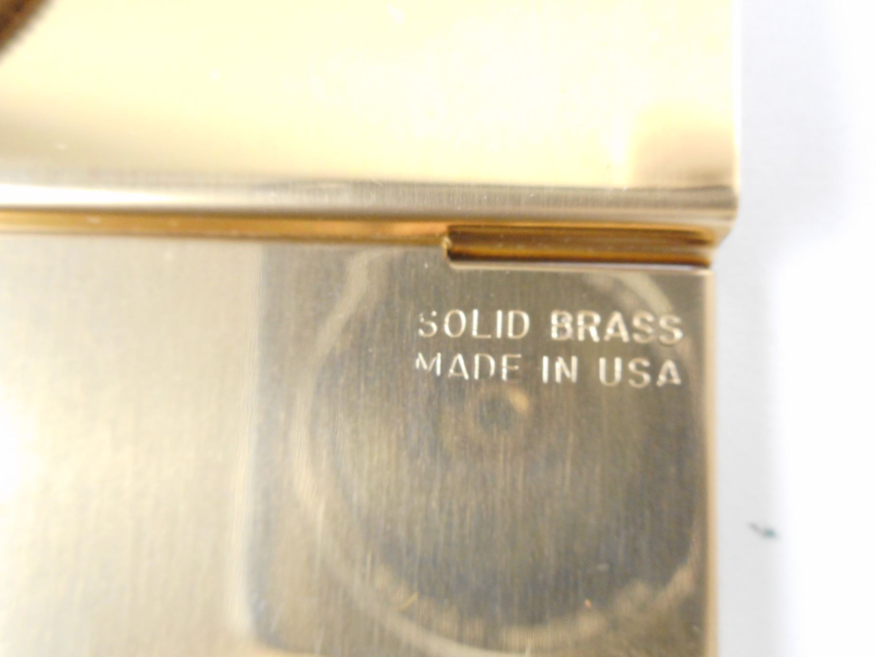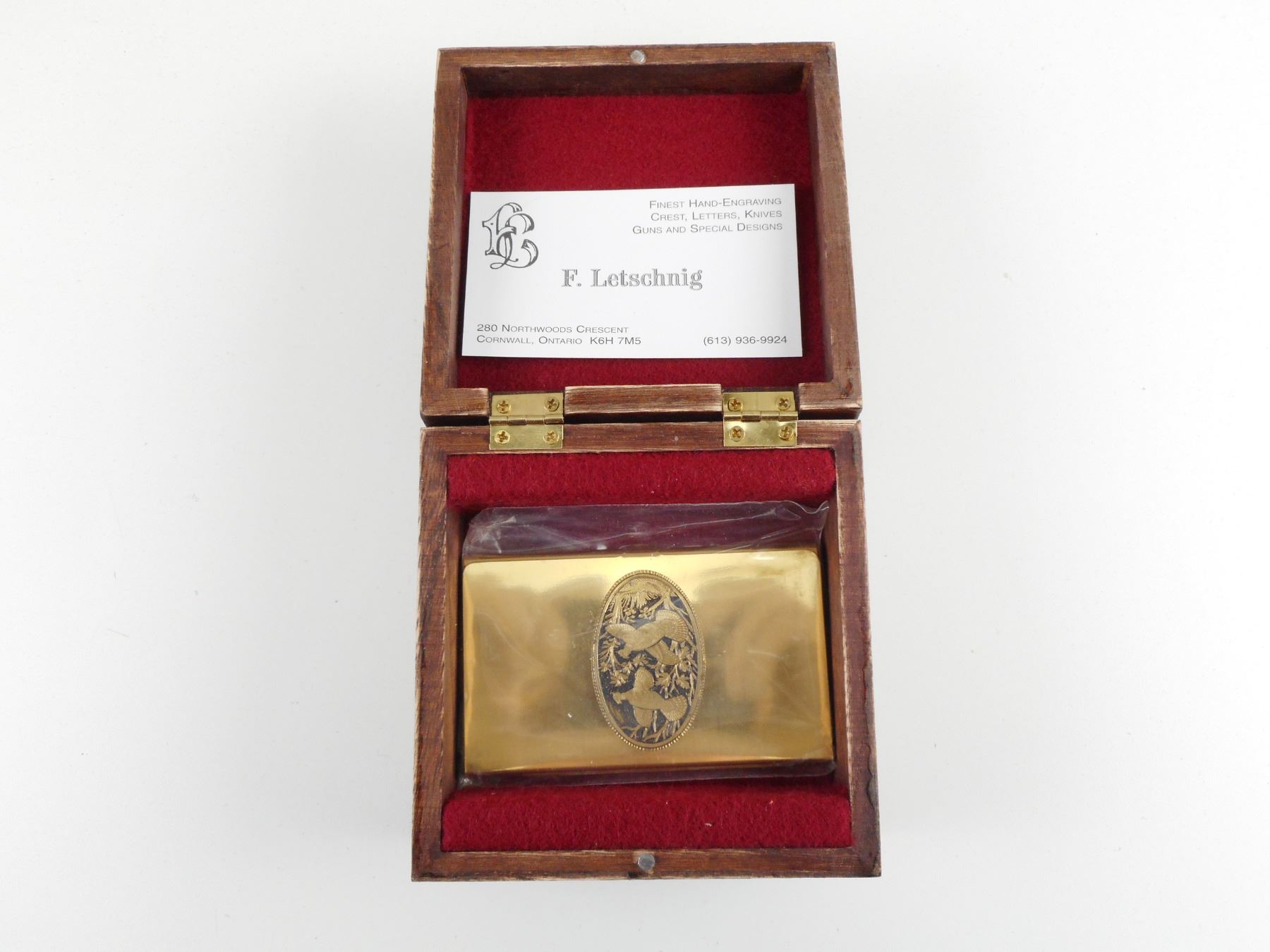 SOLID BRASS BUISNESS CARD HOLDER WITH ENGRAVED ANIMAL. AND IN WOODEN BOX , MARKED ON BACK, SOLID BRASS MADE IN USA. ANIMAL CARVING ON FRONT WAS CAREFULLY HAND CRAFTED BY F. LETSCHNIG. WOODEN BOX DIMENSIONS APPROX. 4.5" X 4.5".