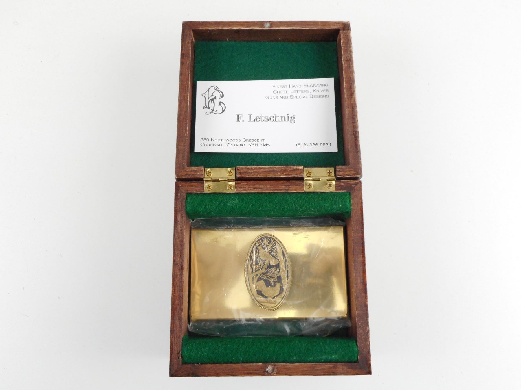SOLID BRASS BUISNESS CARD HOLDER WITH ENGRAVED ANIMAL. AND IN WOODEN BOX , MARKED ON BACK, SOLID BRASS MADE IN USA. ANIMAL CARVING ON FRONT WAS CAREFULLY HAND CRAFTED BY F. LETSCHNIG. WOODEN BOX DIMENSIONS APPROX. 4.5" X 4.5".