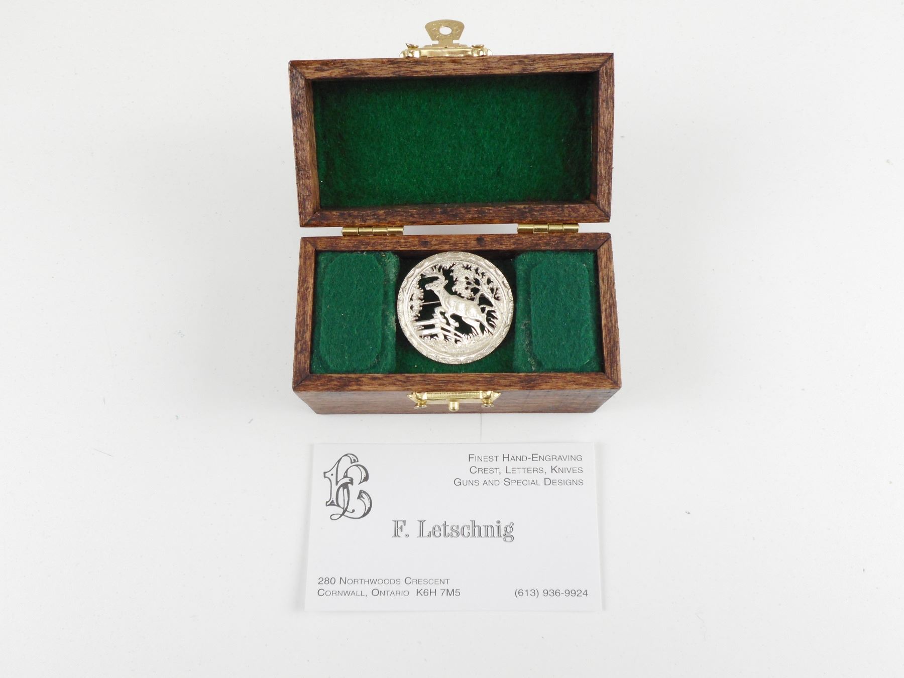 HAND CRAFTED STERLING SILVER ANIMAL BROOCH IN WOODEN BOX , MARKED FL, 925. APPROX. LENGTH 1.5". BOX DIMENSIONS APPROX. 3.75" X 2". CAREFULLY HAND CRAFTED BY F. LETSCHNIG.