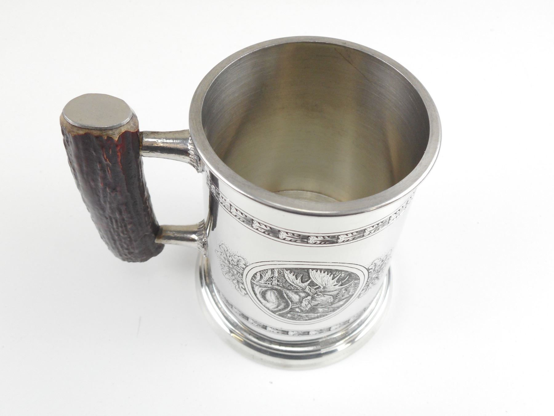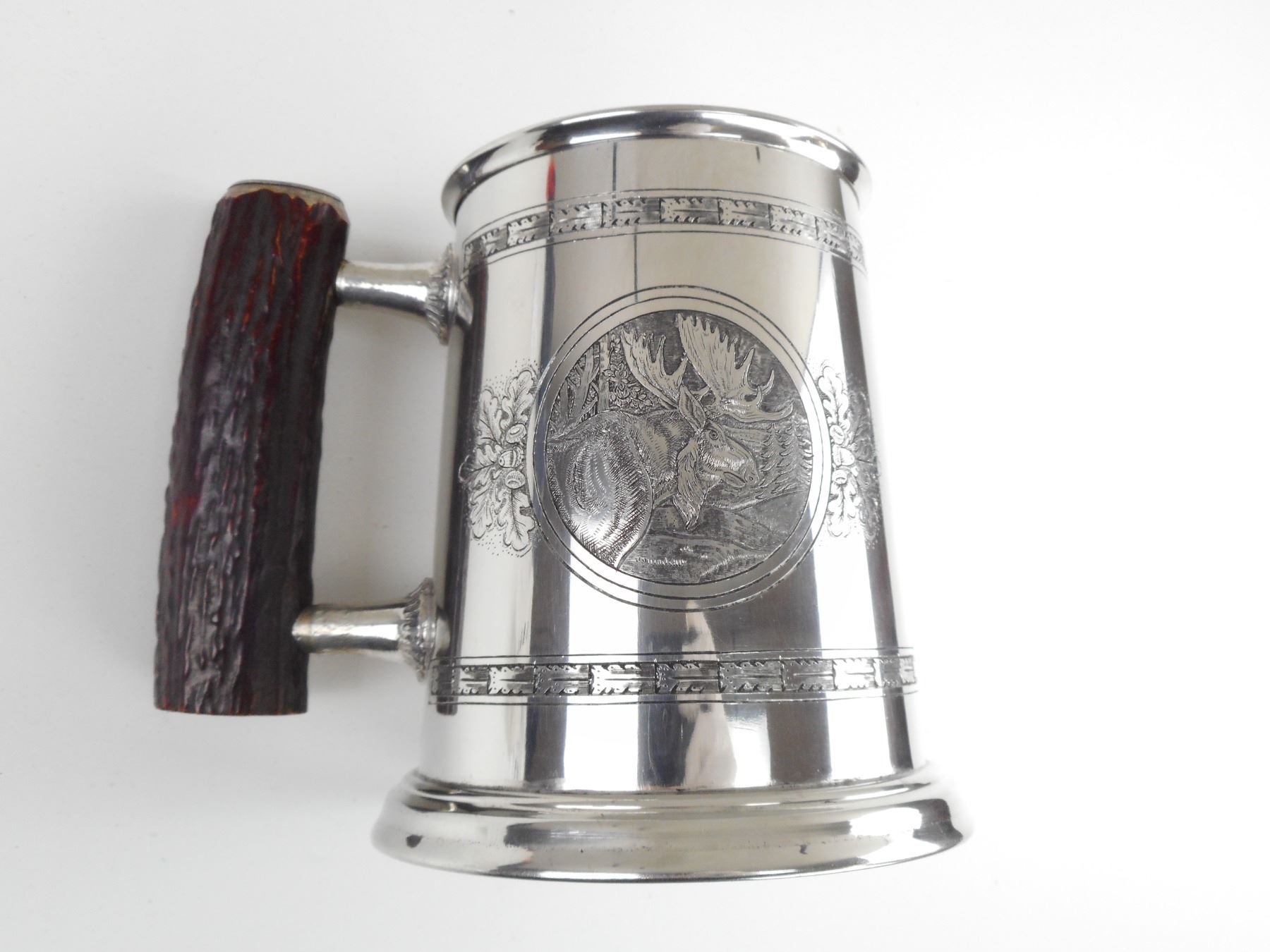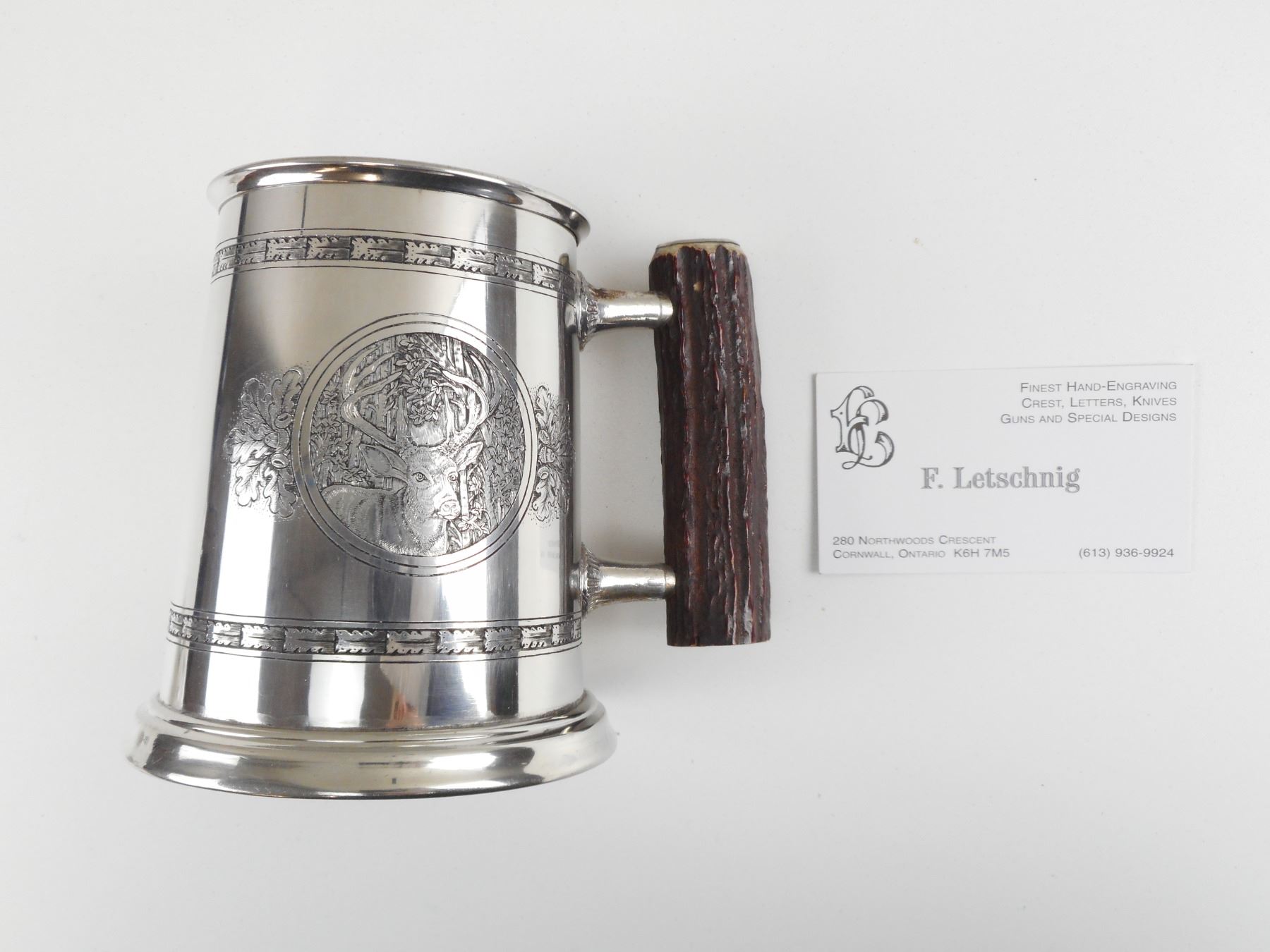 ENGLISH PEWTER MUG WITH HAND CRAFTED DESIGN , MARKED, MADE IN ENGLAND, BIRKS, 2132,ENGLISH PEWTER. MOOSE DESIGN ON ONE SIDE AND DEER ON THE OTHER SIDE WERE CAREFULLY HAND CRAFTED BY F. LETSCHNIG. APPROX. HEIGHT. 4.75"