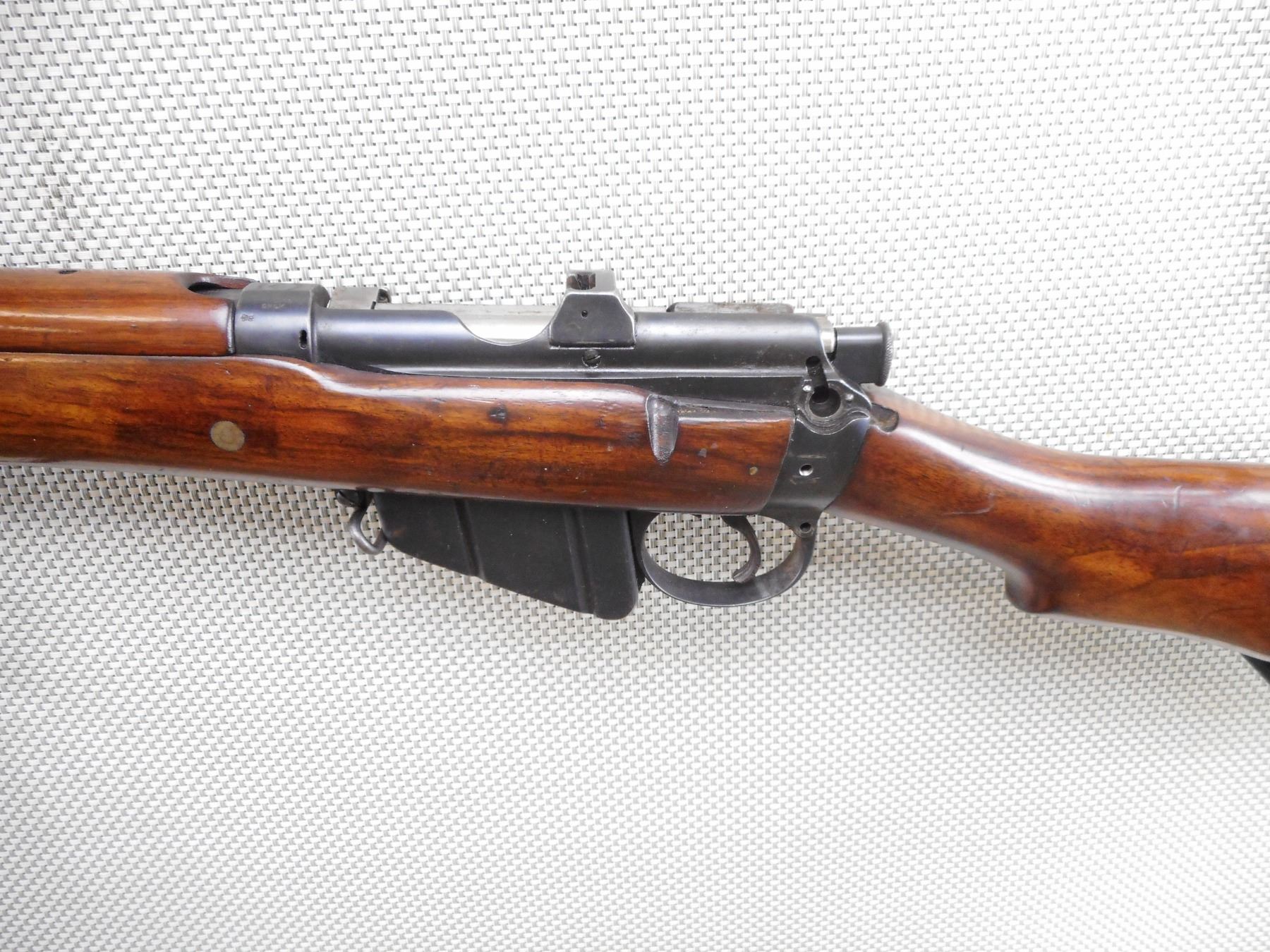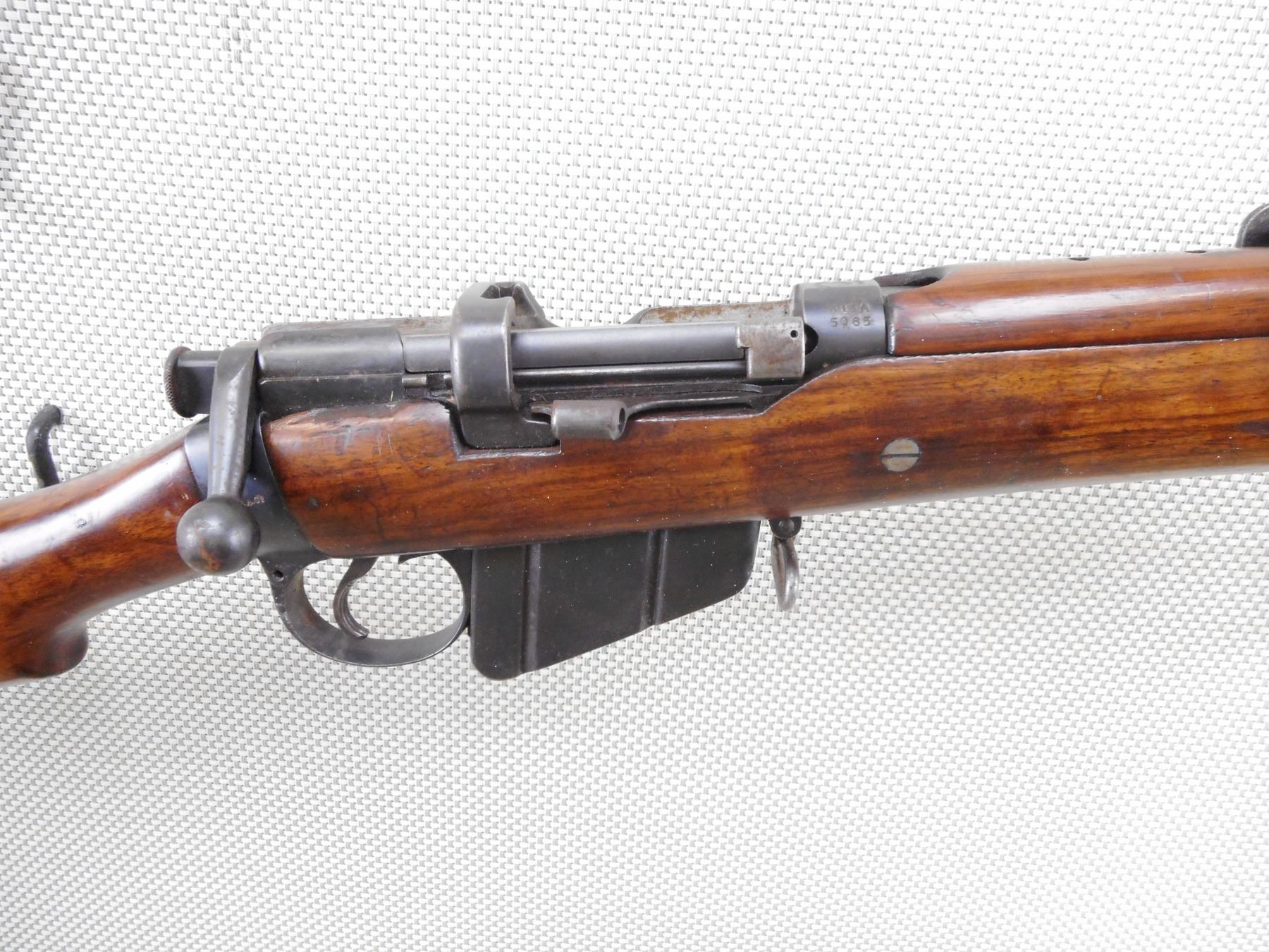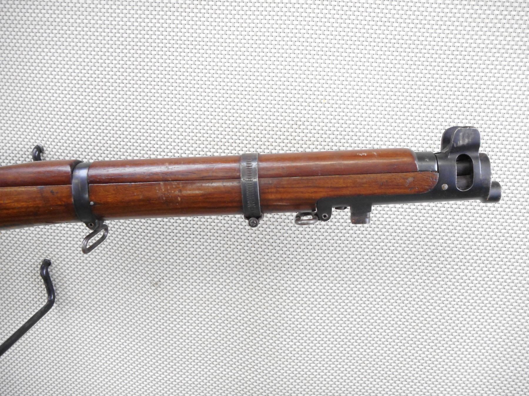 LEE ENFIELD , MODEL: NO. 1 MK III SMLE COMMERCIAL TARGET RIFLE , CALIBER: 303 BR , COMES WITH MAGAZINE WHICH IS AN EARLY MAG WITH RIVETTED ON RIGHT SIDE FEED LIP., NO SAFETY. HISTORICALLY ACCURATE IMPROVISED BARREL BAND SOURCED IN UK. COMMERCIAL BSA ACTION. MARKED "MARTIN ADJUSTED" MISSING REAR TRIGGER GUARD SCREW. NO KNOB ON FRONT VOLLEY SIGHT ARM, WITH REINFORCING SCREW, WITH CUT OFF, ALL OVER LIGHT DIRT AND RUST. AS PER GUN BOARDS ALEX MARTIN WHO WAS A GUN SMITH . WHO WORKED ON COMMERCIAL BSA SMLE RIFLES. THE JUBILEE BRAND CLAMP WAS NECESSARY TO KEEP THE CORK BEDDING MATERIAL IN PLACE. SALE PERMIT ON RECEIVER RING FOR CORDITE ONLY. REAR SIGHT IS WINDAGE ADJUSTABLE. SHOWS SOME LIGHT RUST SPECKLES ON METAL, SOME HANDLING MARKS AND WEARACTION: BOLT ACTION RIFLE , BARREL LENGTH: 25 1/2" , SERIAL # 5065 , CONDITION: 6/10 , CLASS: CANADIAN NON RESTRICTED CLASS
