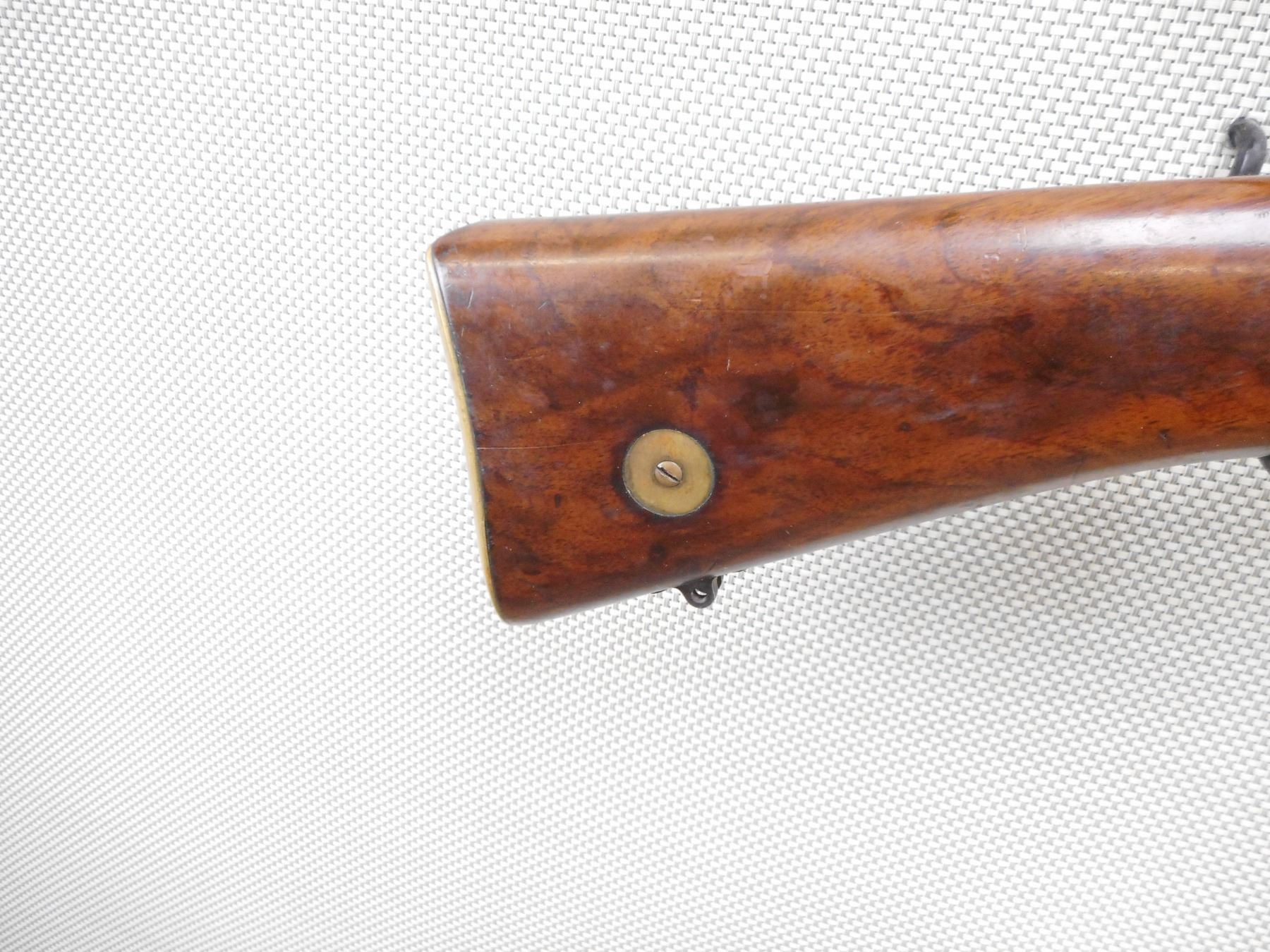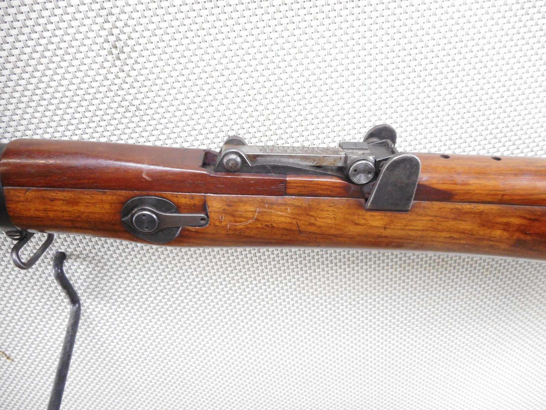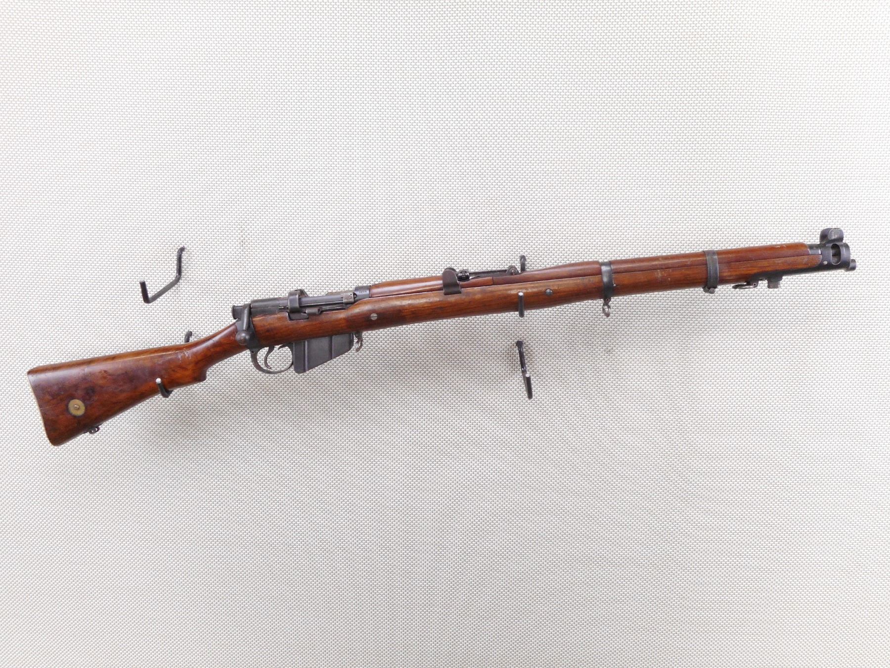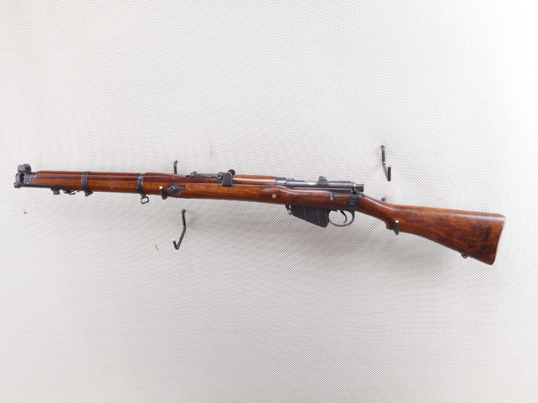 LEE ENFIELD , MODEL: NO. 1 MK III SMLE COMMERCIAL TARGET RIFLE , CALIBER: 303 BR , COMES WITH MAGAZINE WHICH IS AN EARLY MAG WITH RIVETTED ON RIGHT SIDE FEED LIP., NO SAFETY. HISTORICALLY ACCURATE IMPROVISED BARREL BAND SOURCED IN UK. COMMERCIAL BSA ACTION. MARKED "MARTIN ADJUSTED" MISSING REAR TRIGGER GUARD SCREW. NO KNOB ON FRONT VOLLEY SIGHT ARM, WITH REINFORCING SCREW, WITH CUT OFF, ALL OVER LIGHT DIRT AND RUST. AS PER GUN BOARDS ALEX MARTIN WHO WAS A GUN SMITH . WHO WORKED ON COMMERCIAL BSA SMLE RIFLES. THE JUBILEE BRAND CLAMP WAS NECESSARY TO KEEP THE CORK BEDDING MATERIAL IN PLACE. SALE PERMIT ON RECEIVER RING FOR CORDITE ONLY. REAR SIGHT IS WINDAGE ADJUSTABLE. SHOWS SOME LIGHT RUST SPECKLES ON METAL, SOME HANDLING MARKS AND WEARACTION: BOLT ACTION RIFLE , BARREL LENGTH: 25 1/2" , SERIAL # 5065 , CONDITION: 6/10 , CLASS: CANADIAN NON RESTRICTED CLASS