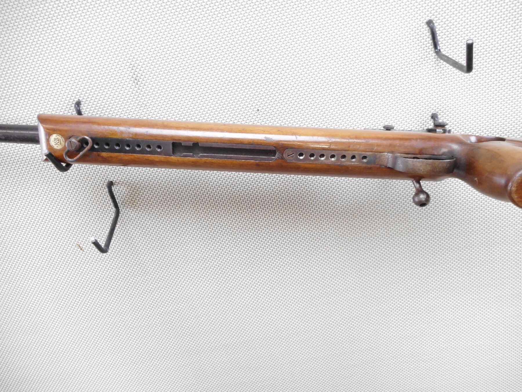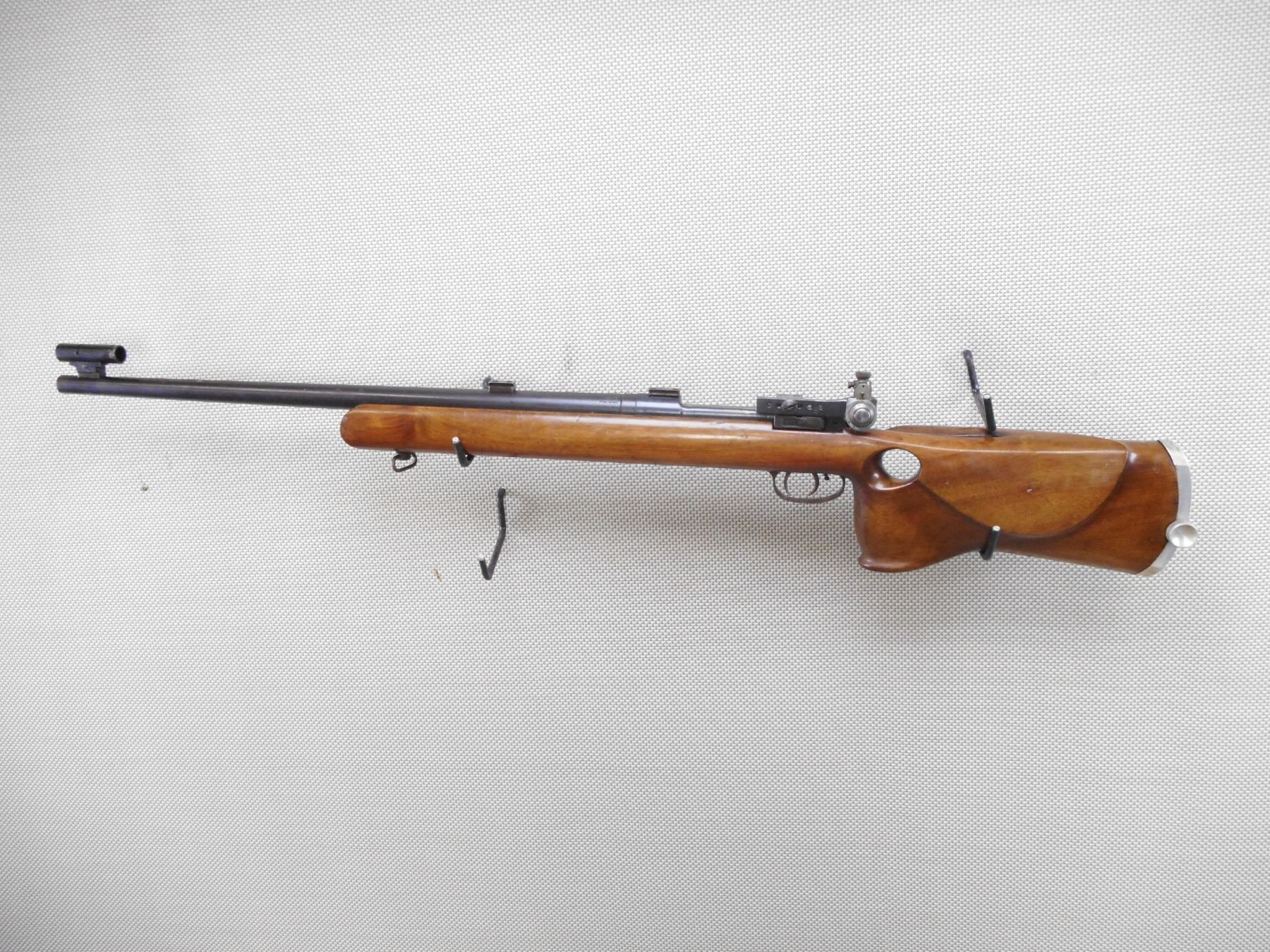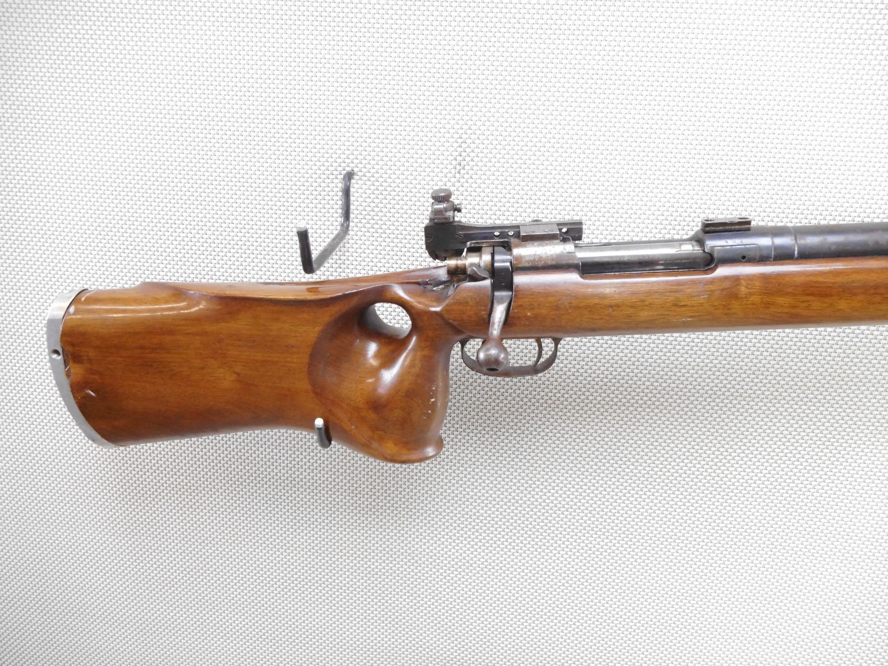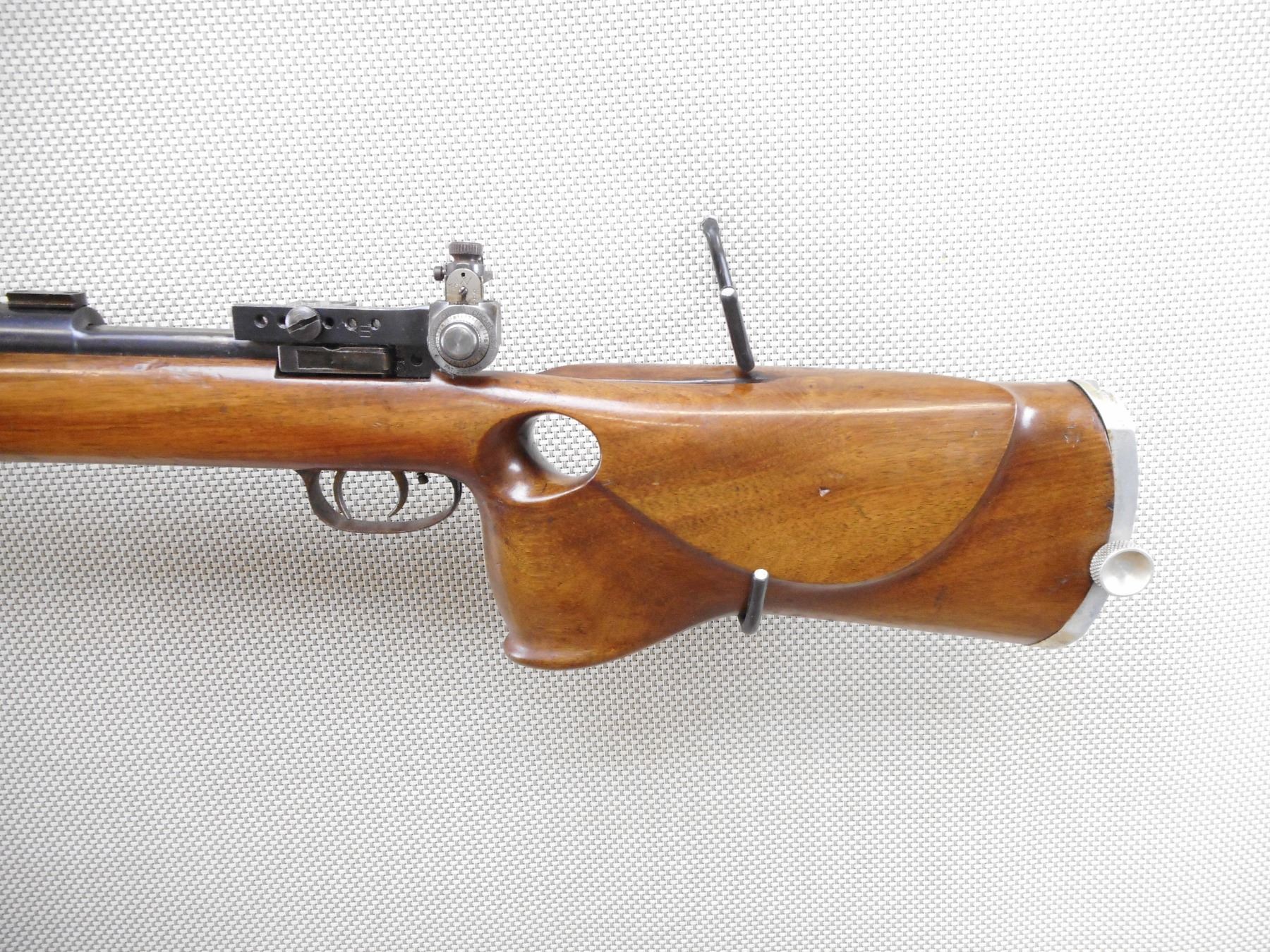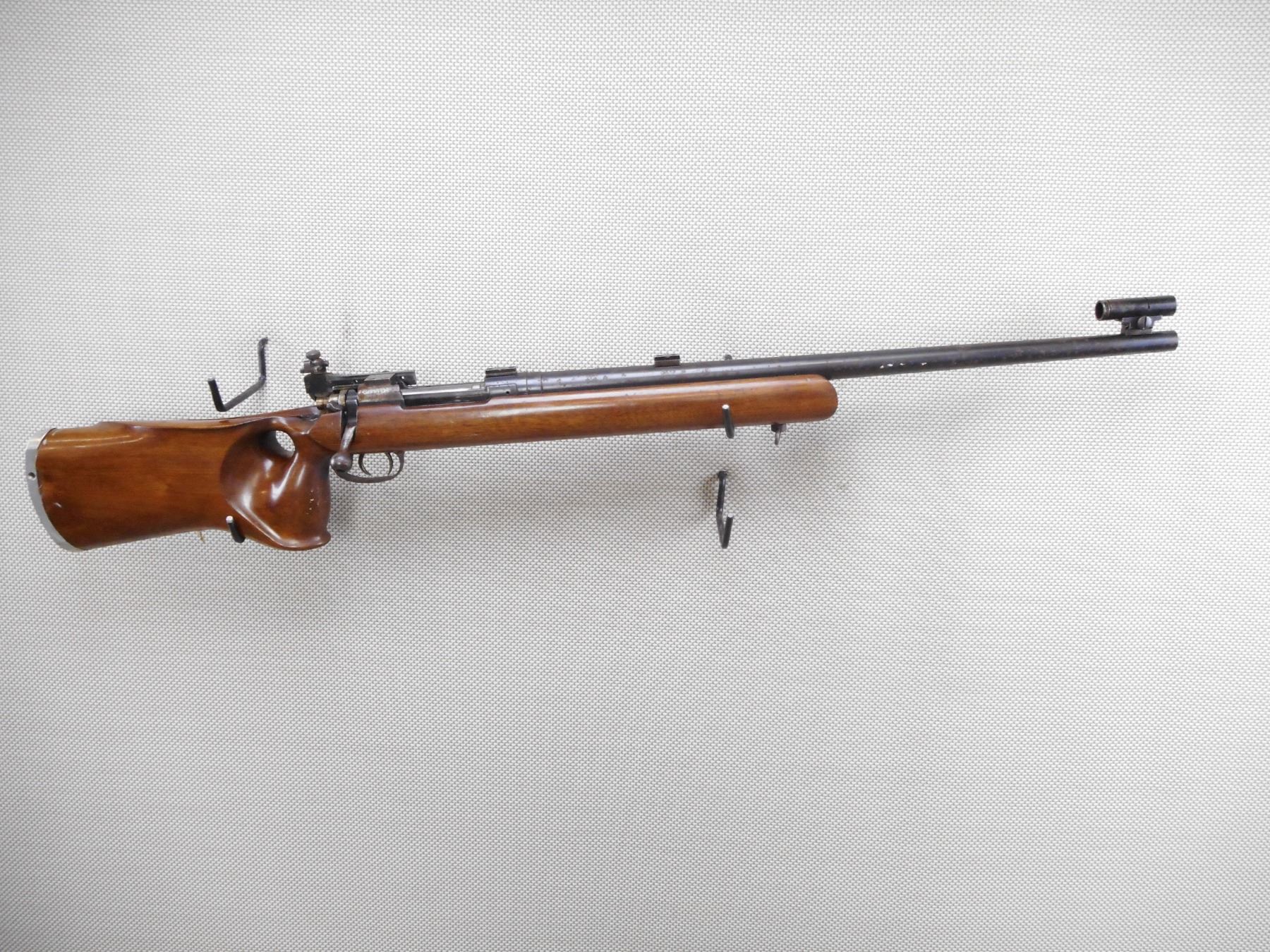 JOHN CJ KNOTT CUSTOM GUNS , MODEL: P13 CUSTOM , CALIBER: 303 BR , COMES WITH PALM REST AND PEEP APERTURE DISK. BORE IS GOOD. HEAVILY CONVERTED PATTERN 13 MILITARY RIFLE TO AN OLYMPIC STYLE FREE-RIFLE. NO BUTT HOOK. VAVER CORP BACK SIGHT. GALLERY STYLE SCOPE BLOCKS. STRAIGHTENED BOLT HANDLE. RADIUSED RECEIVER. DOUBLE SET TRIGGERS. THUMBHOLE STOCK. SINGLE LOAD BLIND MAGAZINE. SURFACE RUST SPECKS. BARREL IS DRILLED AND TAPPED ABOVE THE FOREND. TUNNEL FRONT SIGHT. SHOWS SOME HANDLING MARKS. ACTION: BOLT ACTION RIFLE , BARREL LENGTH: 26" , SERIAL # 481 , CONDITION: 6/10 , CLASS: CANADIAN NON RESTRICTED CLASS
