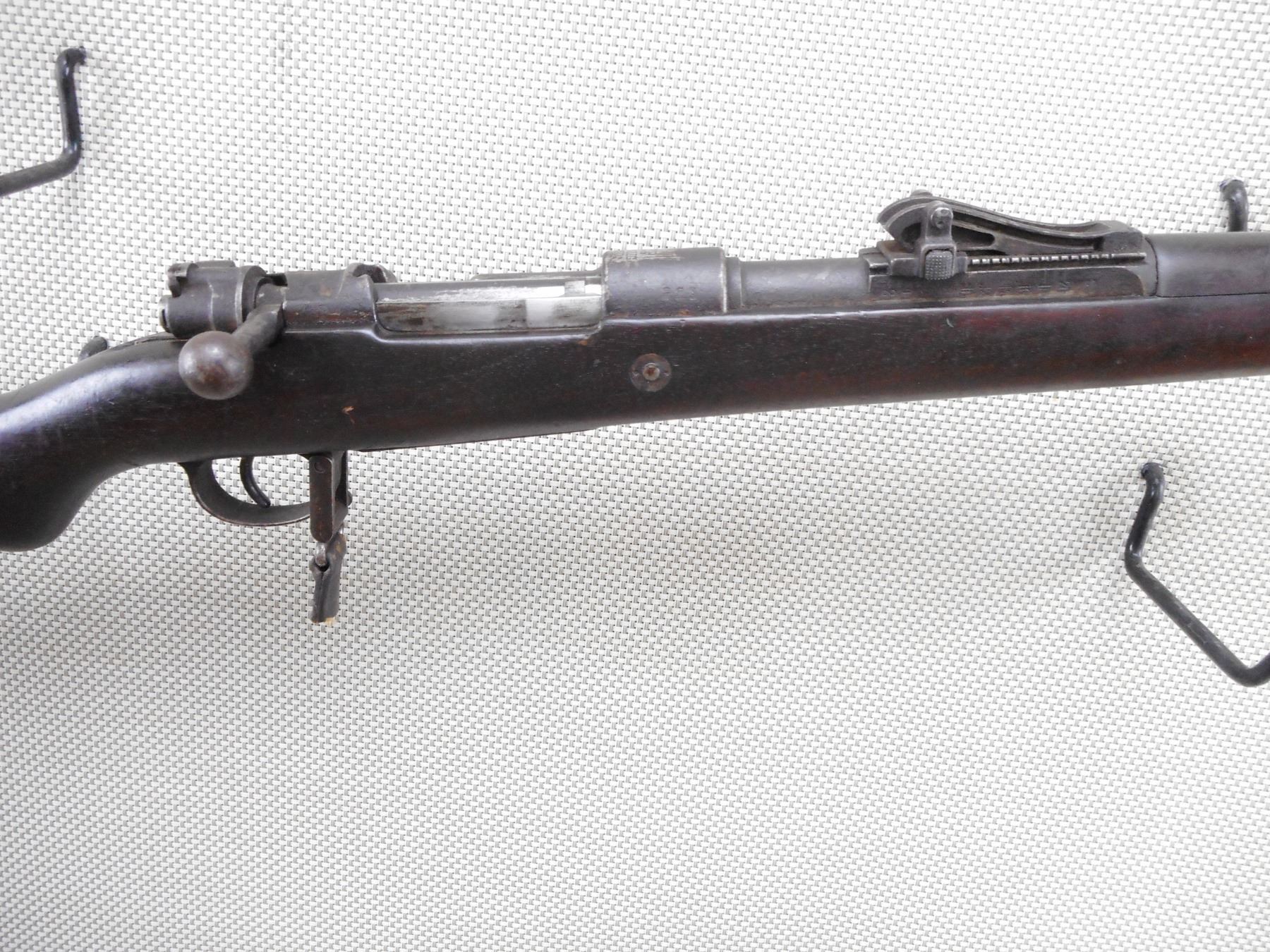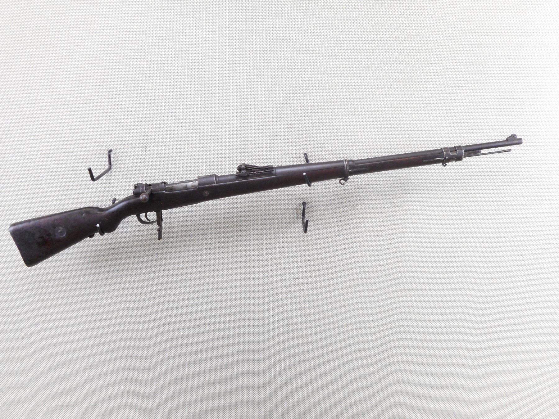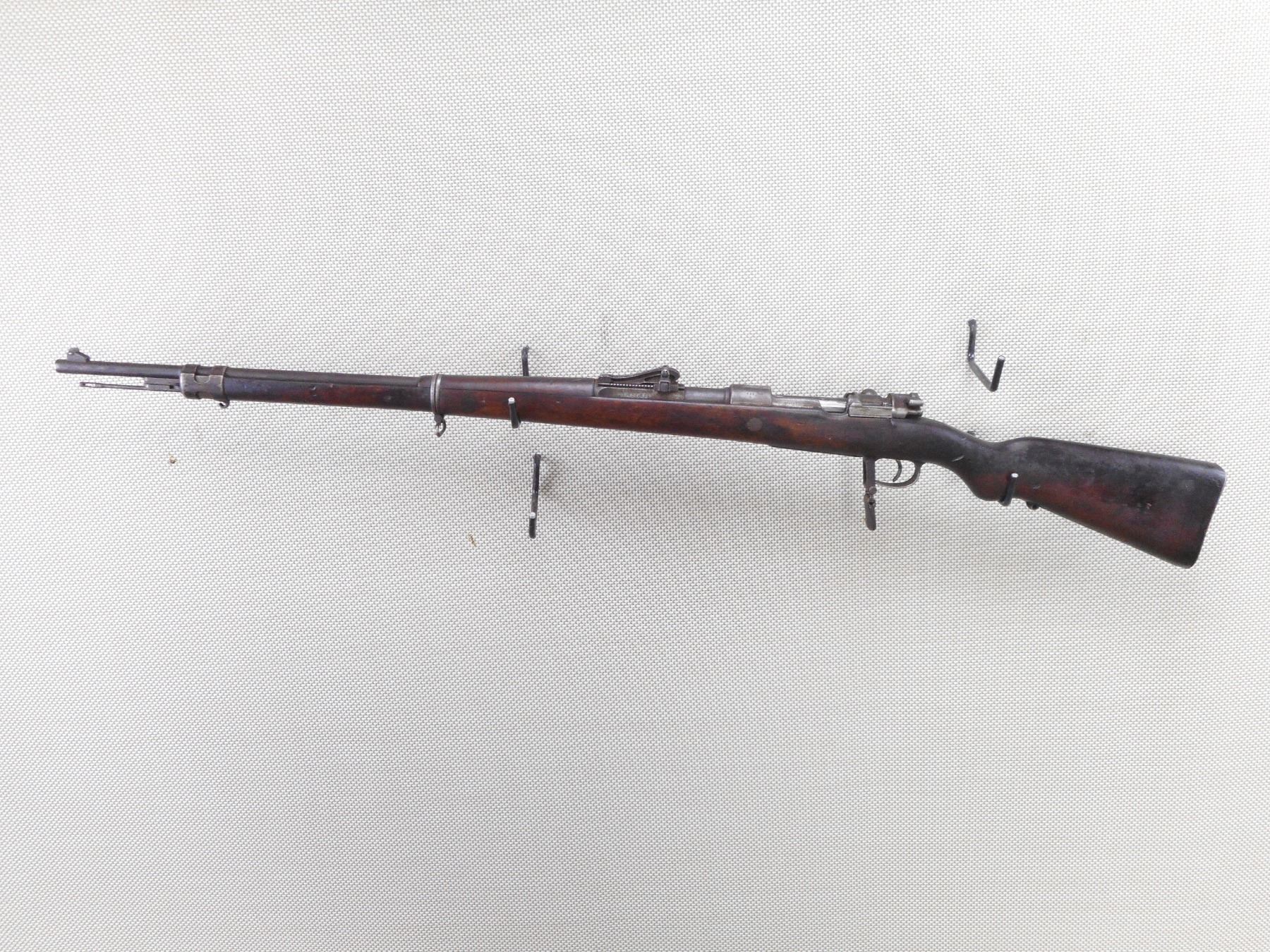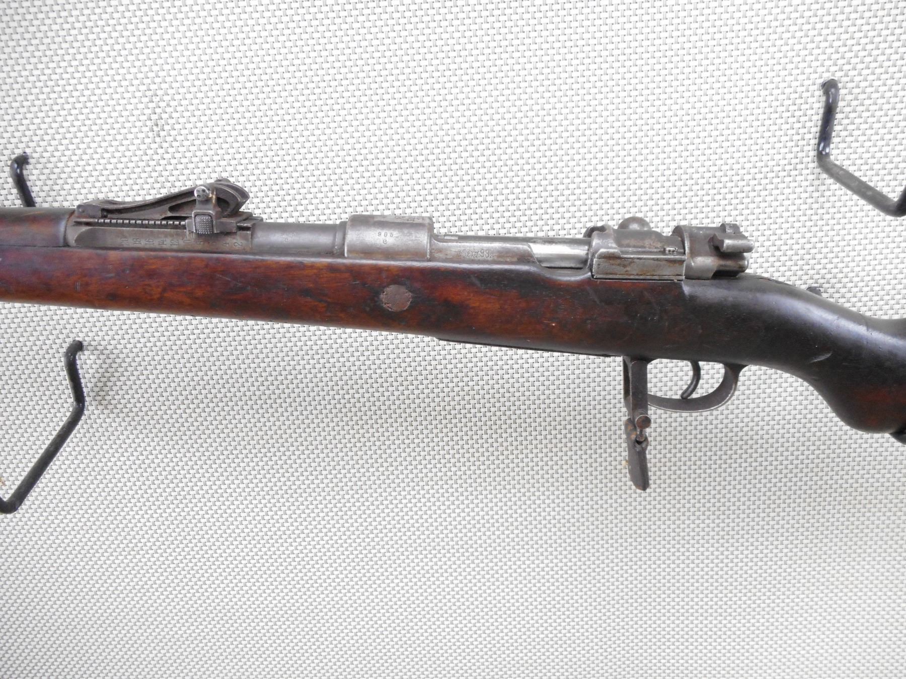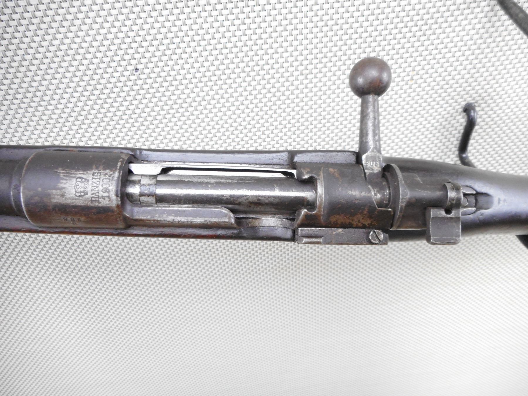 MAUSER , MODEL: GEW 98 , CALIBER: 8MM MAUSER , WWI GERMAN MAUSER 98 DANZIG ARSENAL 1900. MATCHING SERIAL NUMBERS WITH CLEANING ROD. STRAIGHT BOLT. BORE IS GOOD WITH SOME PITTING. VERY OLD HARDENED GREASE OVERALL. REMNANTS OF A LEATHER SLING ON DETACHABLE LOOP ON TRIGGER GUARD. (LEATHER SLING NOT PRESENT). BLADE FRONT AND ORIGINAL ADJUSTABLE REAR SIGHT. NUMEROUS MILITARY MARKINGS. SHOWS EXTENSIVE HANDLING MARKS. ACTION: BOLT ACTION RIFLE , BARREL LENGTH: 29 1/2" , SERIAL # 905C , CONDITION: 6/10 , CLASS: CANADIAN NON RESTRICTED CLASS