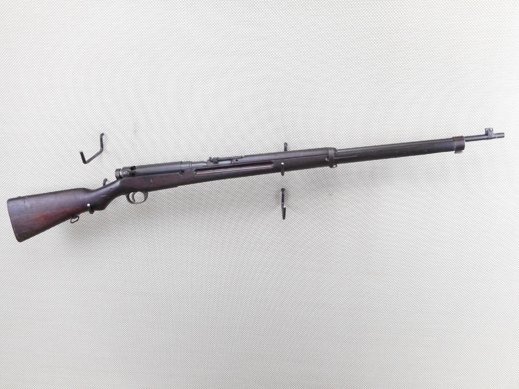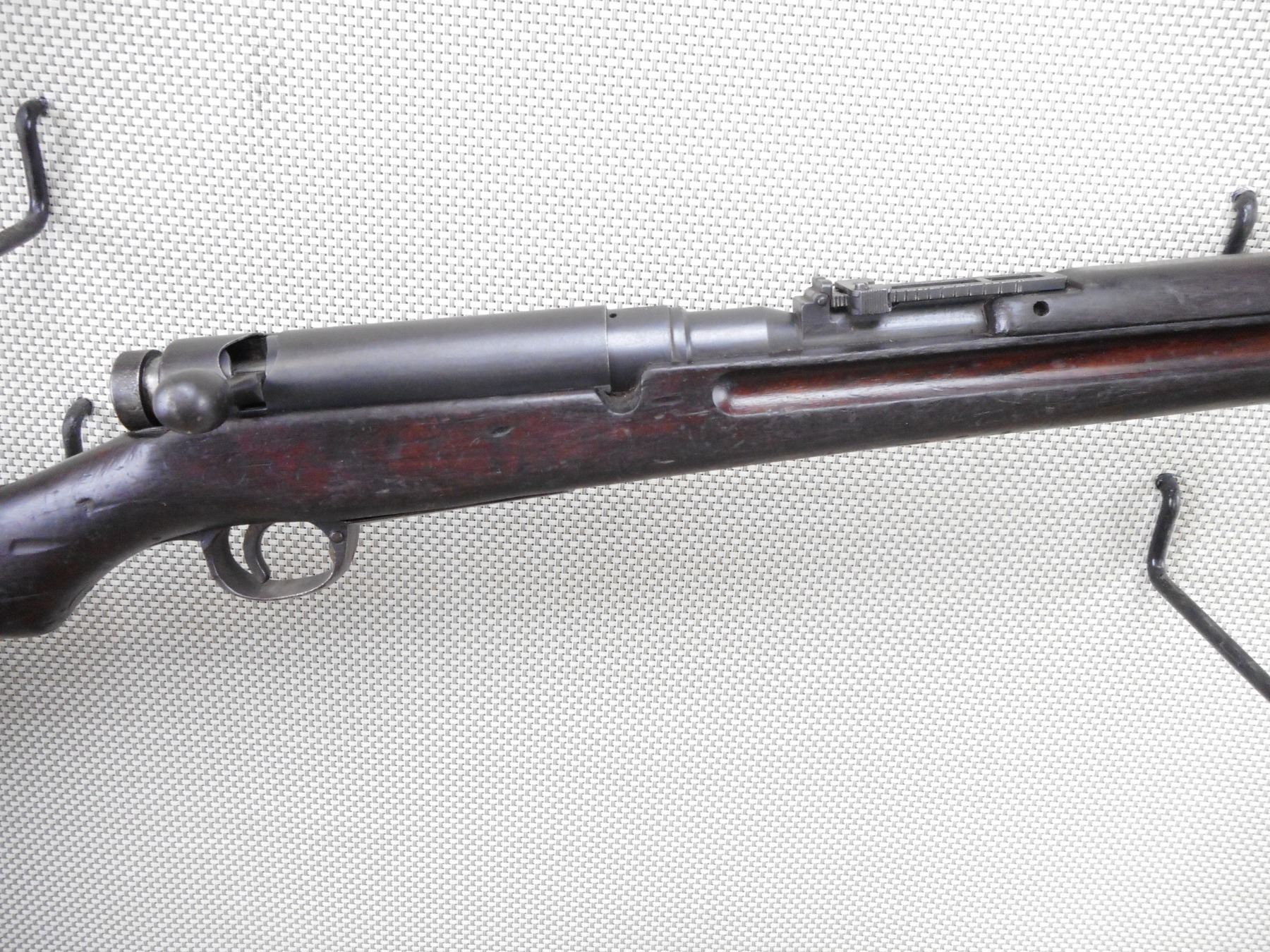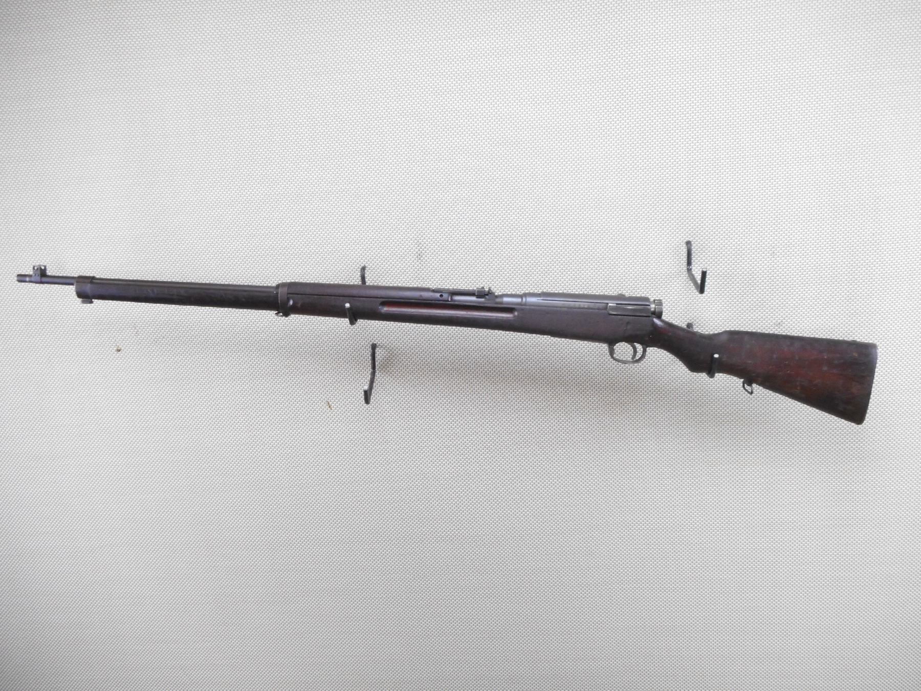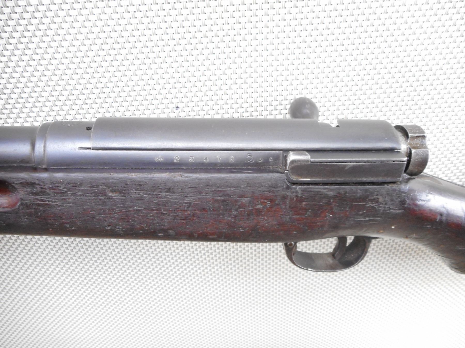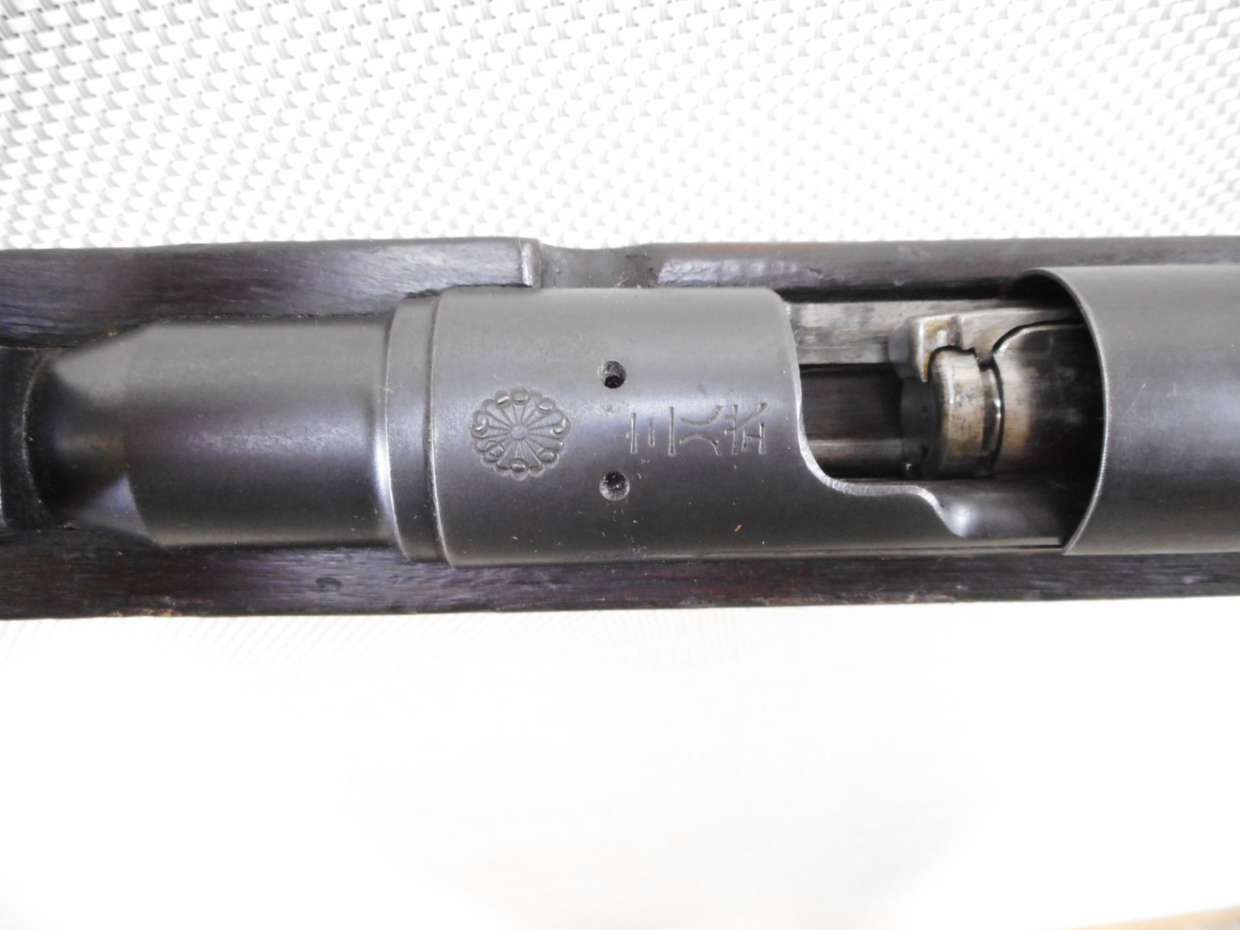ARISAKA , MODEL: TYPE 38 MODEL 1905 RIFLE , CALIBER: 6.5 X 50 JAPANESE ARISAKA , SCHOOL OR CADET MARKED "MUM" STRAIGHT BOLT WITH DUST COVER. EXCELLENT BORE WITH SLIGHT WEAR. BARLEY CORN FRONT AND ADJUSTABLE REAR SIGHT. TWO PIECE HARDWOOD STOCK SHOWS SOME HANDLING MARKS AND DENTS. SLING SWIVEL LOOPS. MISSING CLEANING RODACTION: BOLT ACTION RIFLE , BARREL LENGTH: 31 1/2" , SERIAL # 23475 , CONDITION: 6/10 , CLASS: CANADIAN NON RESTRICTED CLASS