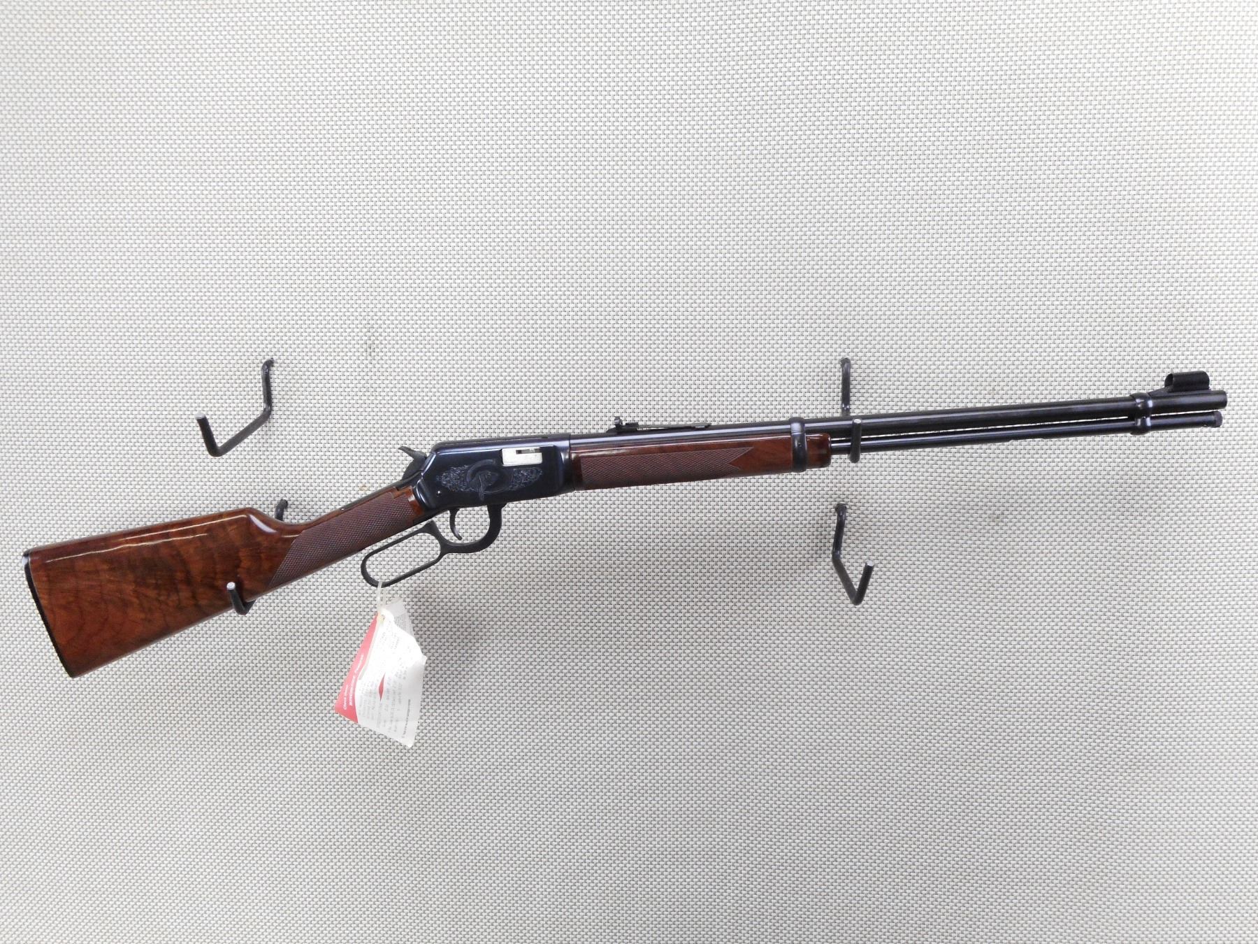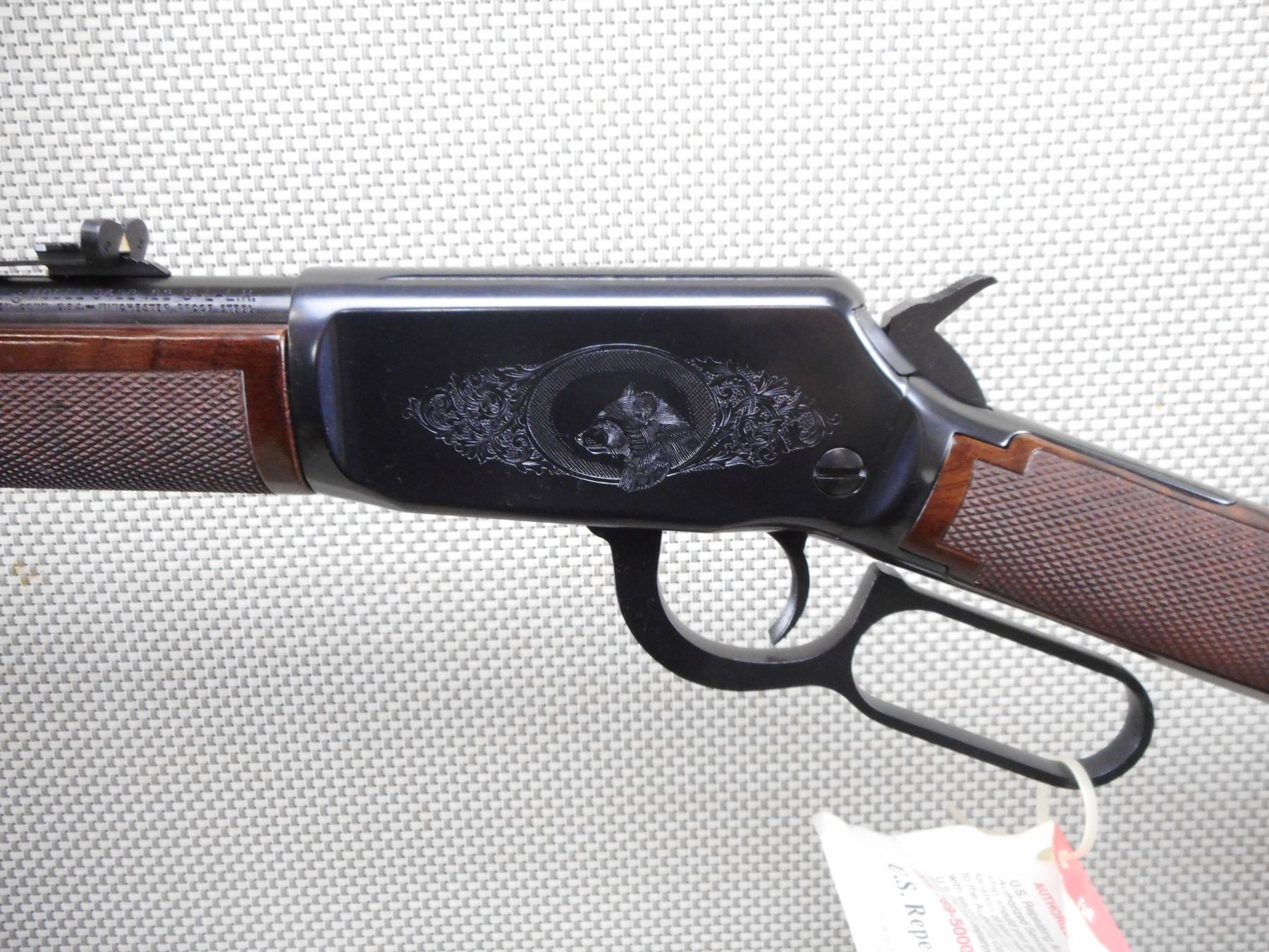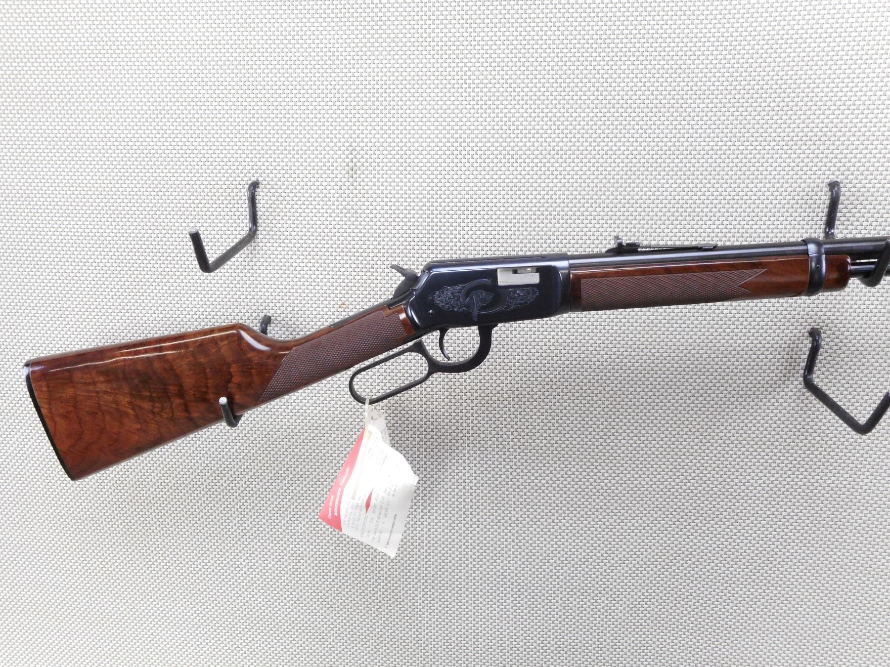 WINCHESTER , MODEL: 94 22 , CALIBER: 22 LR , COMES WITH BOX, MANUAL, AND HAMMER SPUR EXTENSION. BORE IS EXCELLENT, APPEARS AS NEW, MAY HAVE BEEN TEST FIRED. HOODED FRONT SIGHT AND ADJUSTABLE REAR SIGHT. CHECKERED TWO PIECE HARDWOOD STOCK WITH FANCY GRADE WOOD. ENGRAVED RECEIVER WITH ANIMAL SCENE. PLASTIC BUTT PLATE. SHOWS VIRTUALLY NO HANLDING MARKS. ACTION: LEVER ACTION RIFLE , BARREL LENGTH: 20" , SERIAL # F678205 , CONDITION: AS NEW IN BOX , CLASS: CANADIAN NON RESTRICTED CLASS