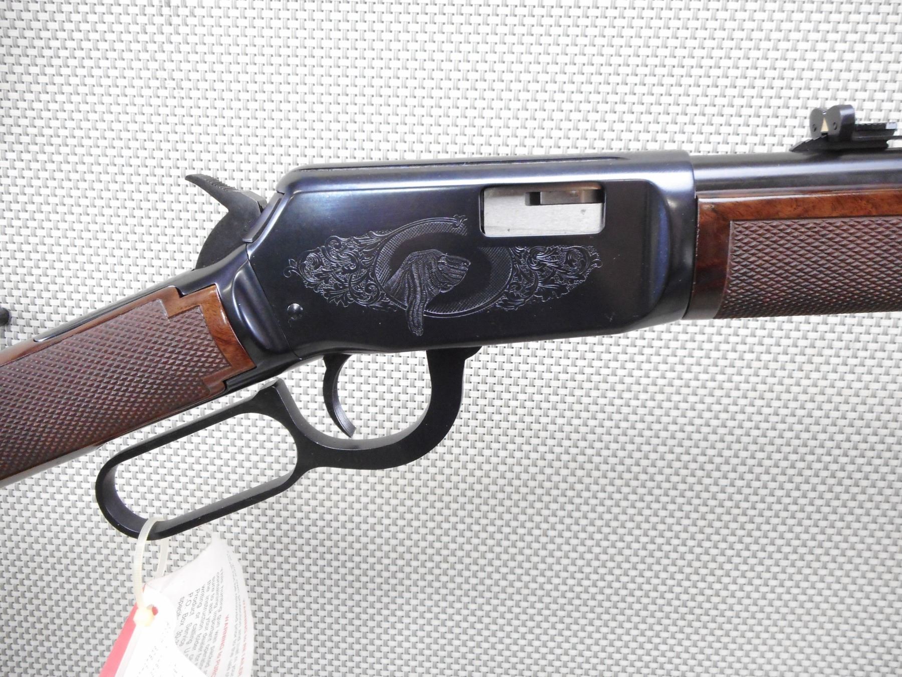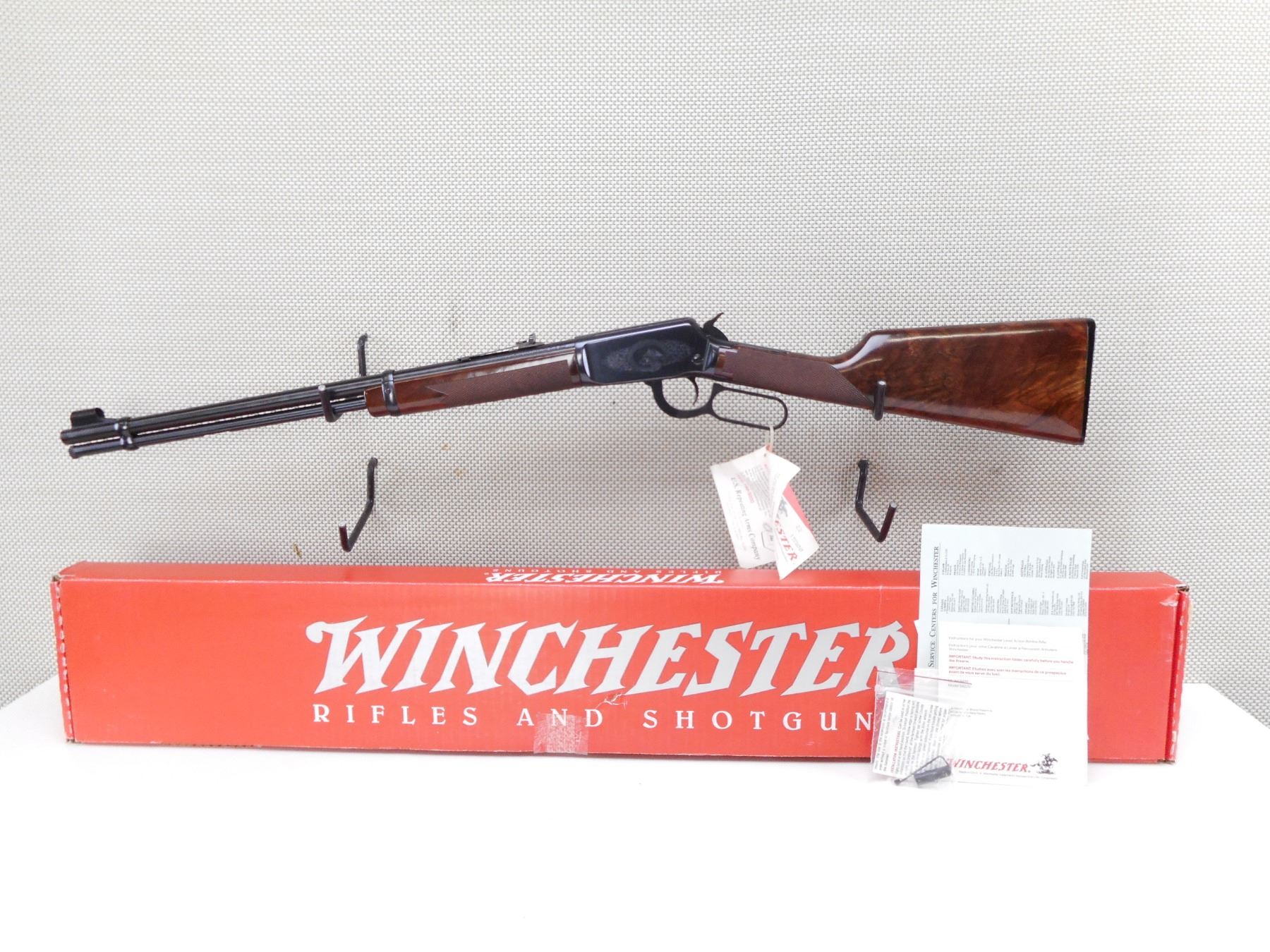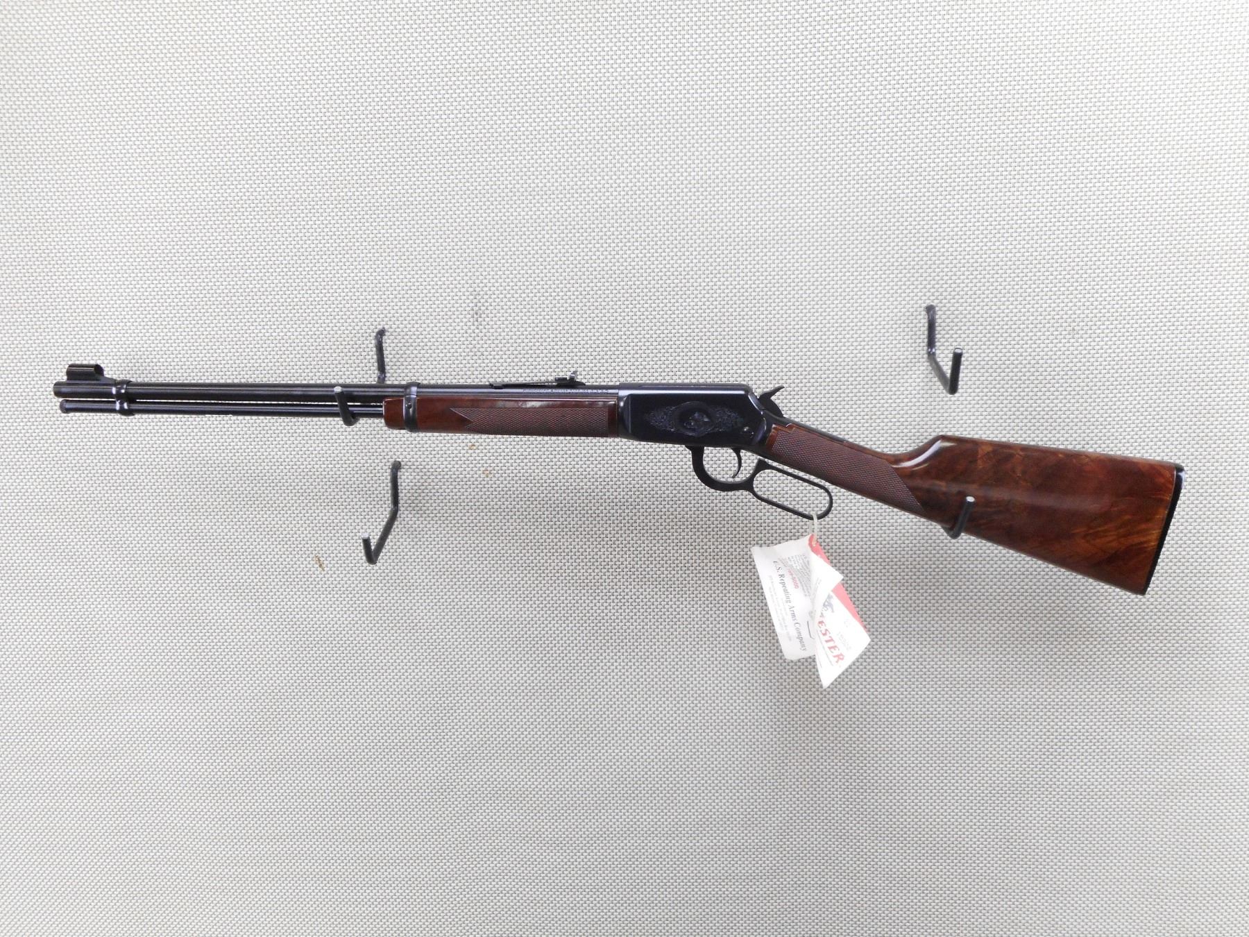 WINCHESTER , MODEL: 94 22 , CALIBER: 22 LR , COMES WITH BOX, MANUAL, AND HAMMER SPUR EXTENSION. BORE IS EXCELLENT, APPEARS AS NEW, MAY HAVE BEEN TEST FIRED. HOODED FRONT SIGHT AND ADJUSTABLE REAR SIGHT. CHECKERED TWO PIECE HARDWOOD STOCK WITH FANCY GRADE WOOD. ENGRAVED RECEIVER WITH ANIMAL SCENE. PLASTIC BUTT PLATE. SHOWS VIRTUALLY NO HANLDING MARKS. ACTION: LEVER ACTION RIFLE , BARREL LENGTH: 20" , SERIAL # F678205 , CONDITION: AS NEW IN BOX , CLASS: CANADIAN NON RESTRICTED CLASS
