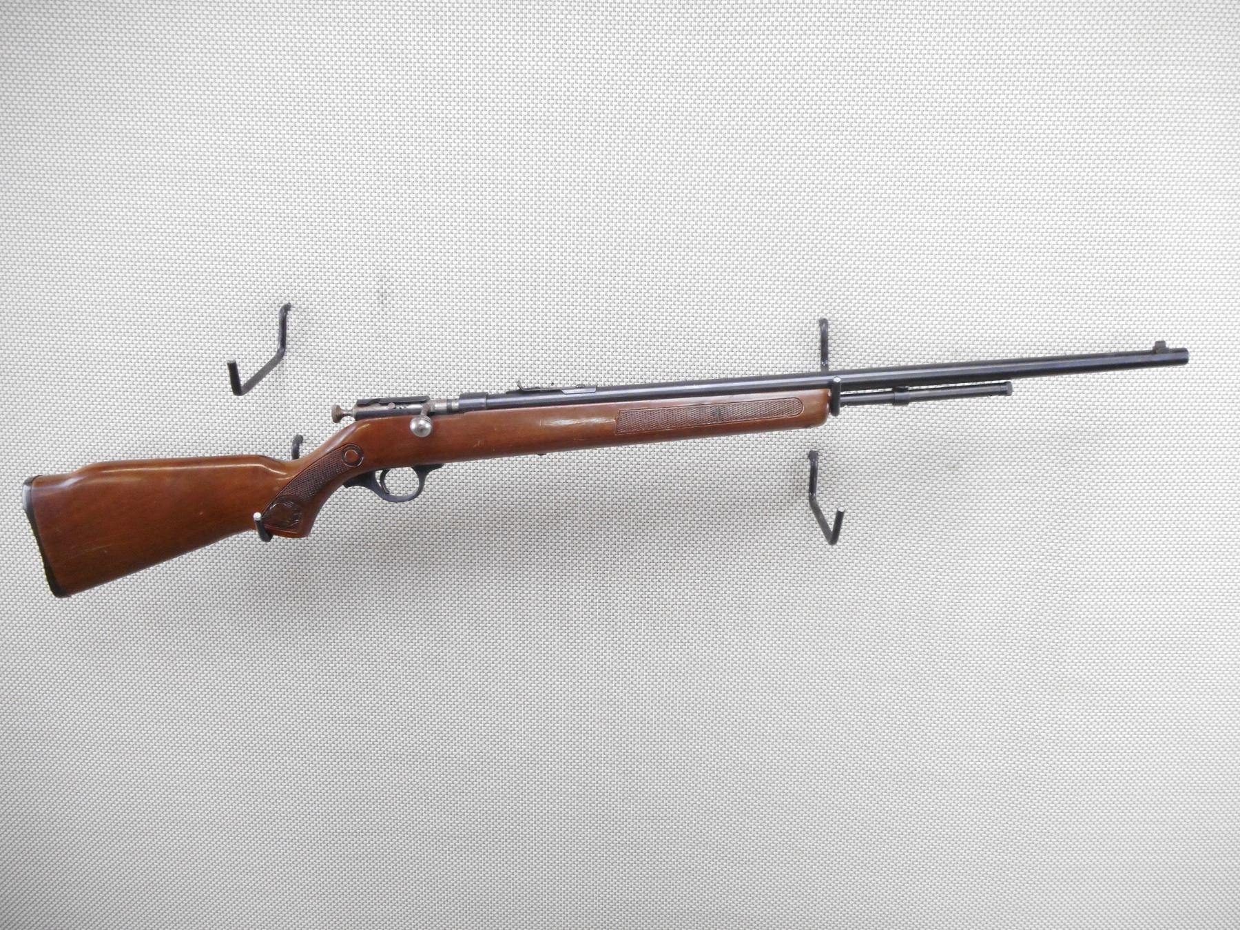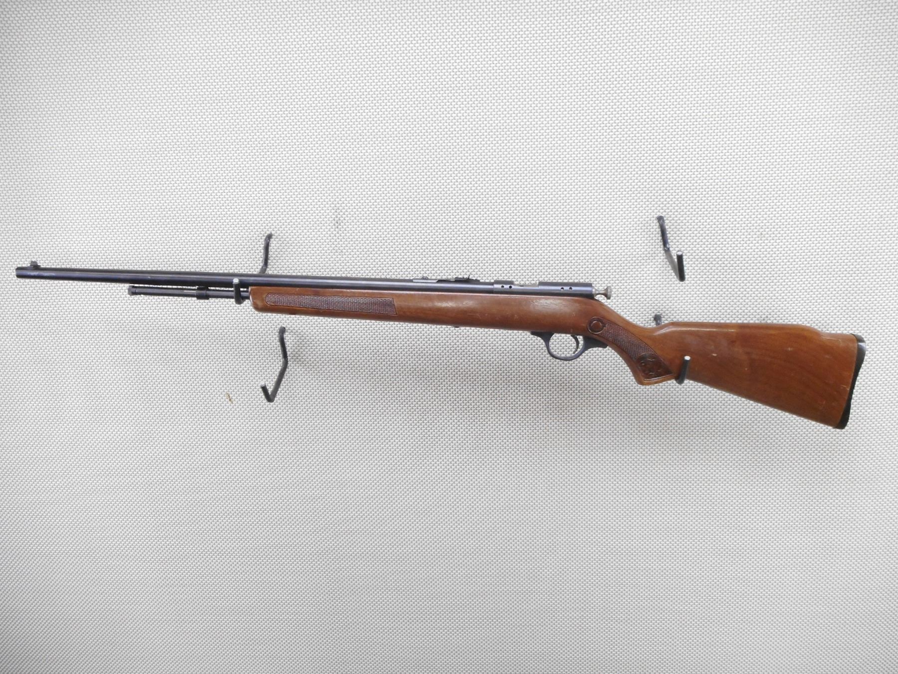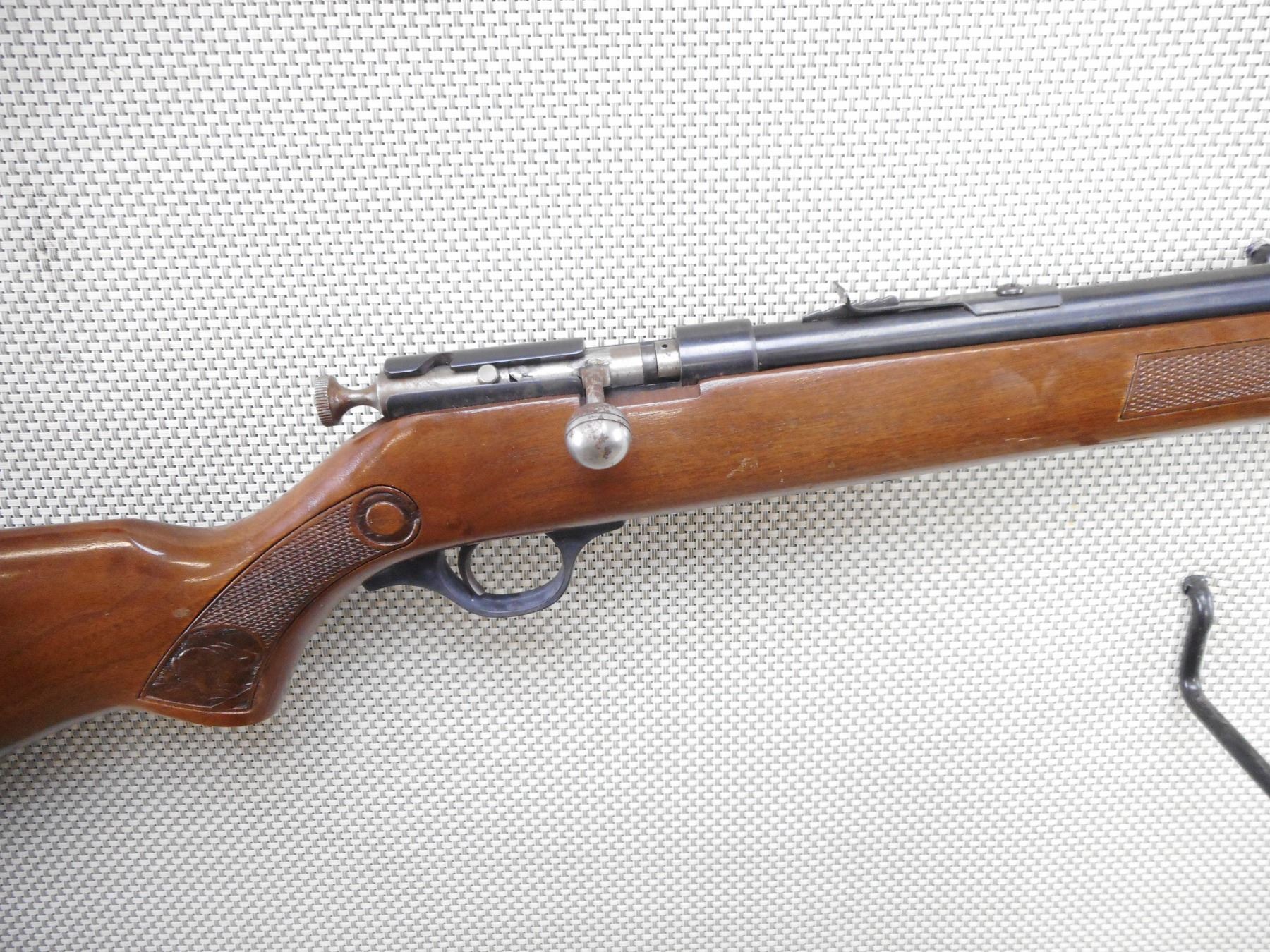 COOEY , MODEL: 600 , CALIBER: 22 LR , BORE IS EXCELLENT. BLADE FRONT AND ADJUSTABLE REAR SIGHT. ONE PIECE PRESSED CHECKERED HARDWOOD STOCK. PLASTIC BUTT PLATE. SHOWS SOME HANDLING MARKS. ACTION: BOLT ACTION RIFLE , BARREL LENGTH: 24" , SERIAL # N/A , CONDITION: 7/10 , CLASS: CANADIAN NON RESTRICTED CLASS