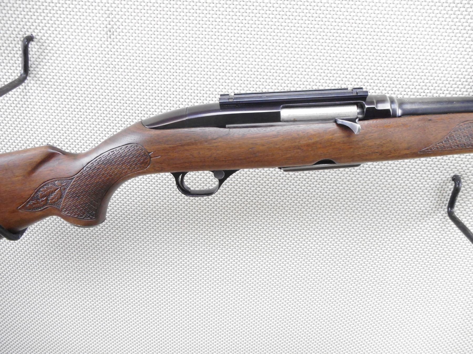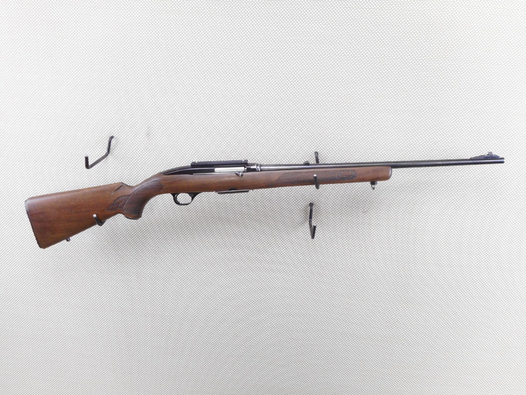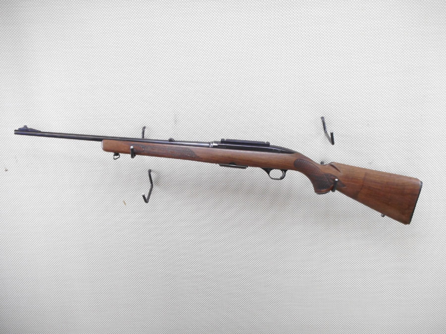 WINCHESTER , MODEL: 100 , CALIBER: 308 WIN , COMES WITH MAGAZINE. VERY GOOD BORE. CHECKERED ONE PIECE HARD WOOD STOCK WITH AFULL LENGTH CRACK IN THE FOREND. RAMP FRONT AND ADJUSTABLE REAR SIGHT. DRILLED AND TAPPED WITH SCOPE RAIL. REPLACED UNDERSIZED BUTT PLATE. SLING SWIVEL LOOP AND A STUD. SHOWS SOME HANDLING MARKS. ACTION: SEMI-AUTOMATIC RIFLE , BARREL LENGTH: 22" , SERIAL # 18125 , CONDITION: 5/10 , CLASS: CANADIAN NON RESTRICTED CLASS