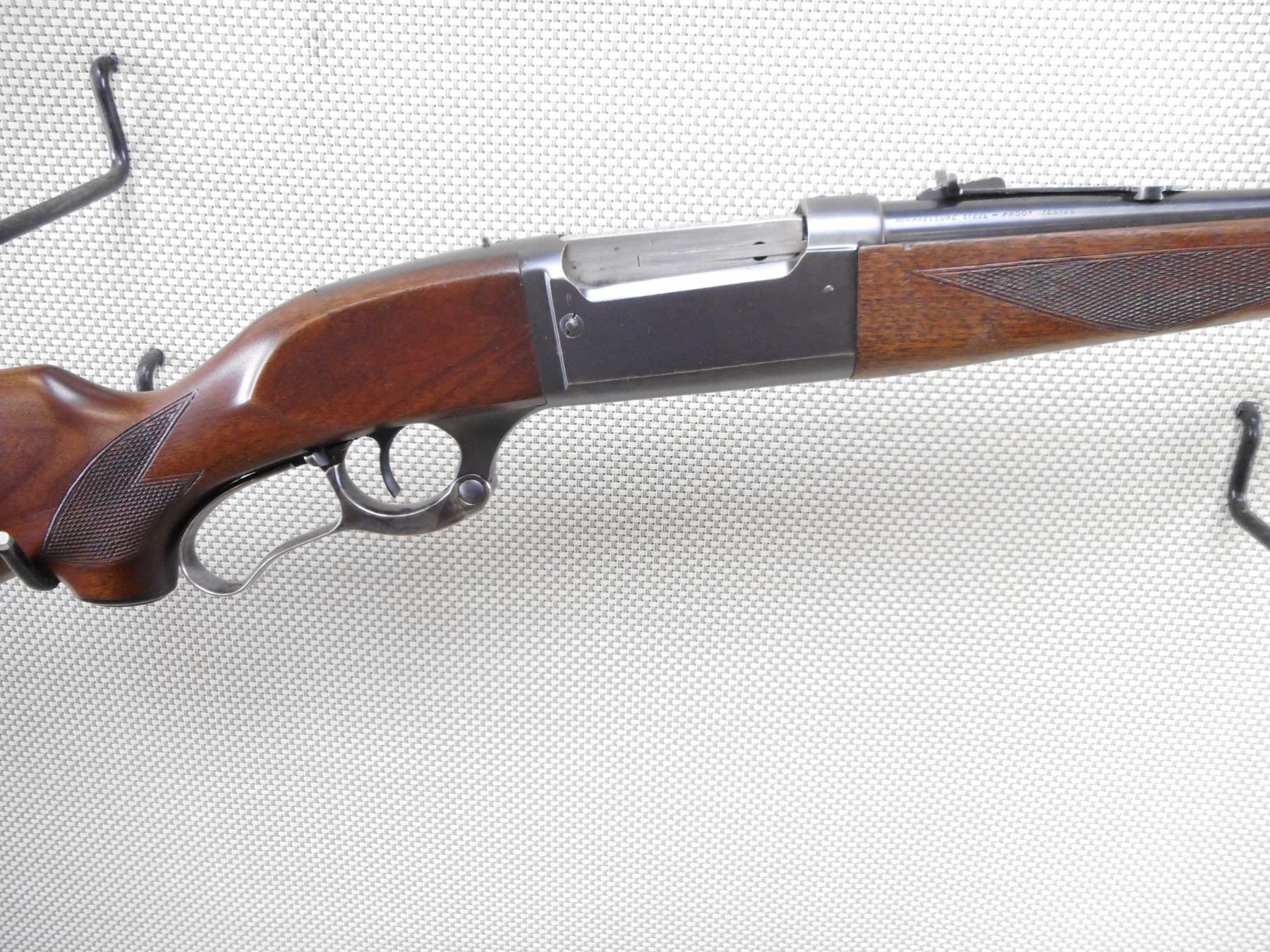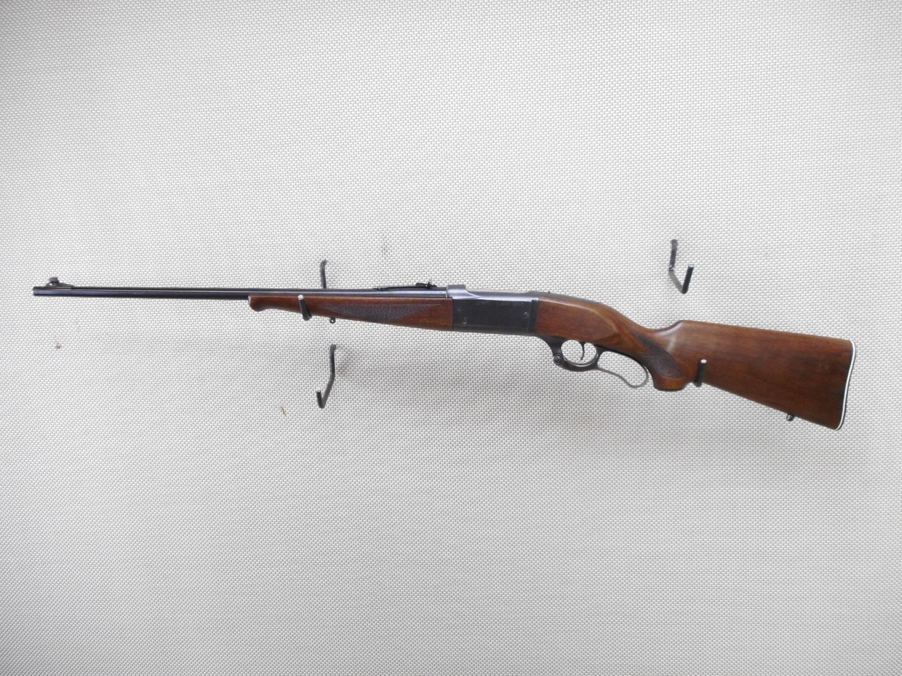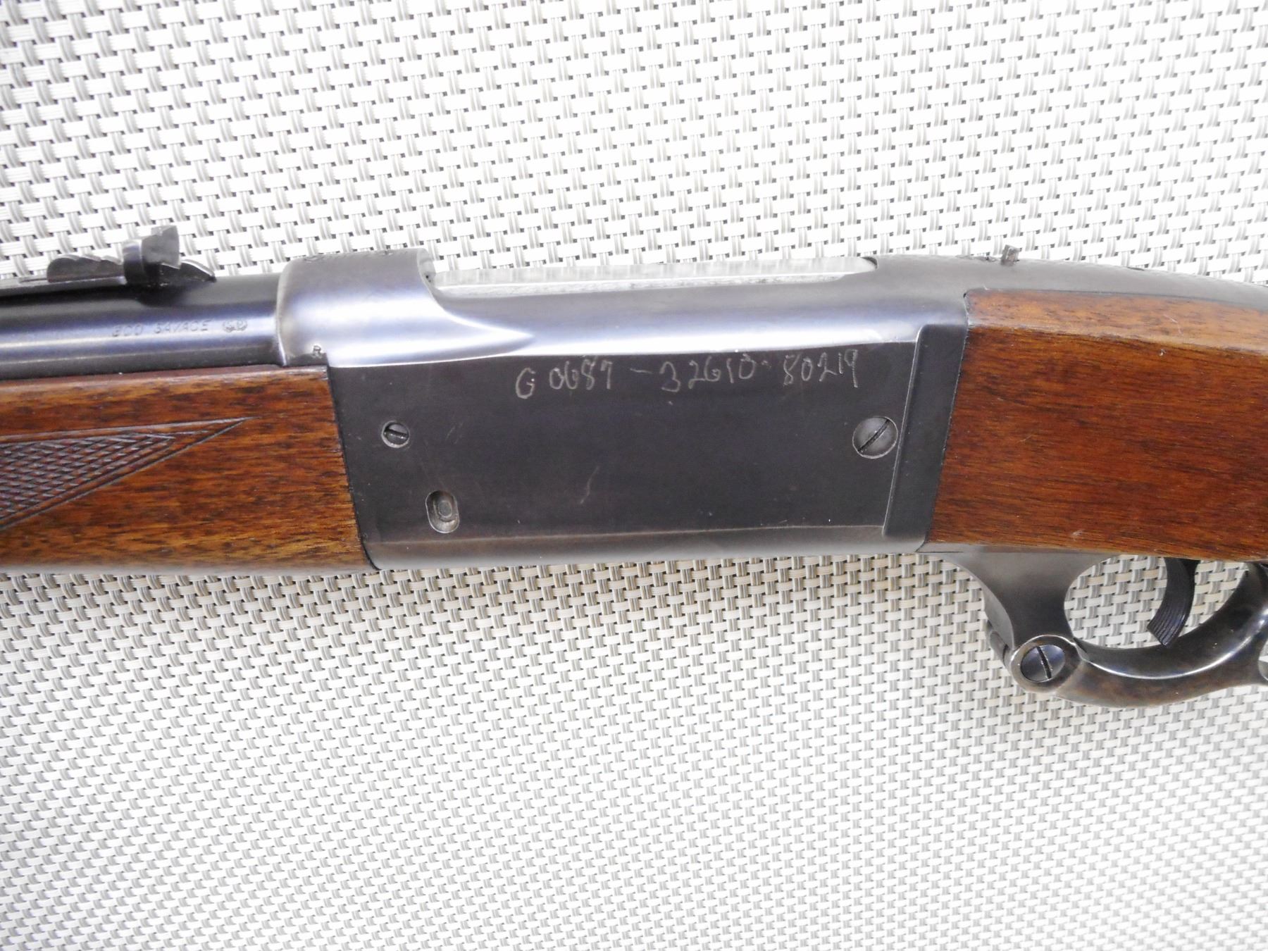 SAVAGE , MODEL: 99 , CALIBER: 300 SAV , BORE IS VERY GOOD. RAMP FRONT AND ADJUSTABLE REAR SIGHT. CHECKERED TWO PIECE HARDWOOD STOCK WITH STEEL BUTT PLATE. SLING SWIVEL STUDS. ELECTRO PENCIL POSSIBLE DRIVERS LICENSE # IS ON THE RECEIVER. SHOWS SOME HANDLING MARKS. ACTION: LEVER ACTION RIFLE , BARREL LENGTH: 24" , SERIAL # 696732 , CONDITION: 7/10 , CLASS: CANADIAN NON RESTRICTED CLASS