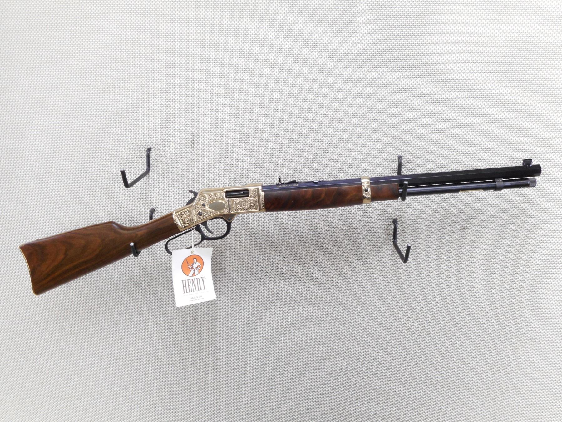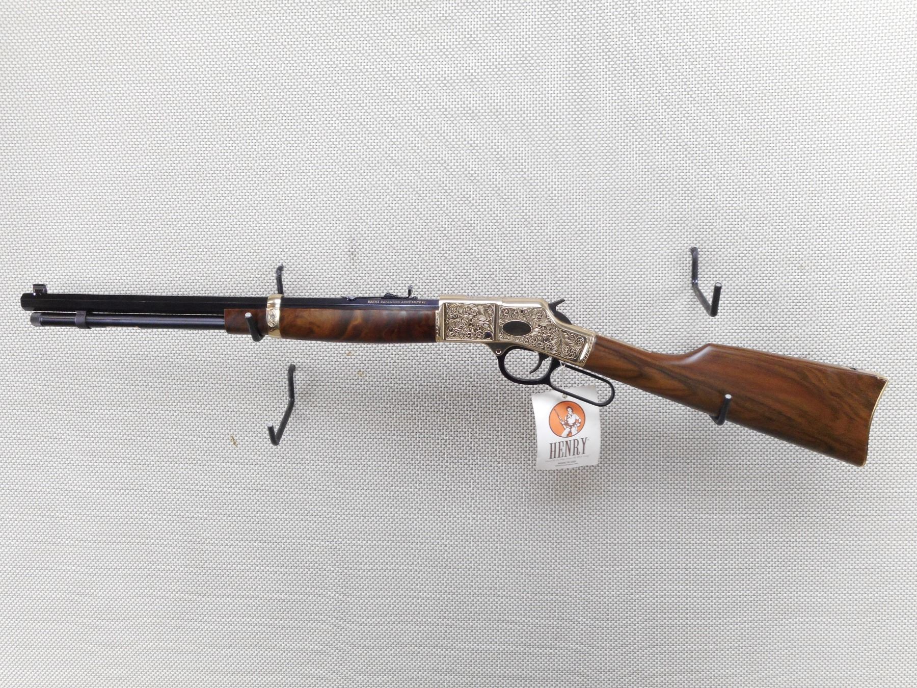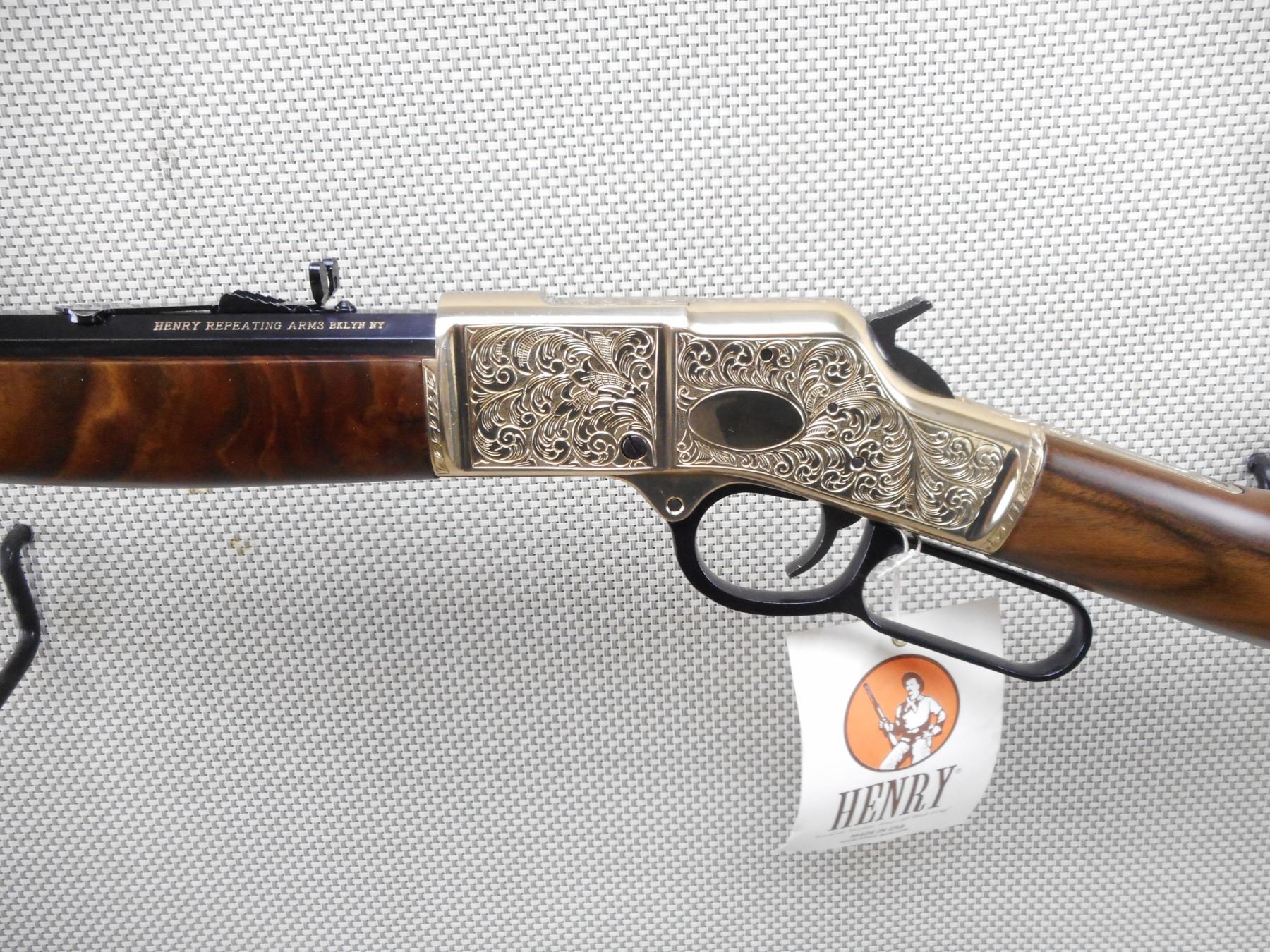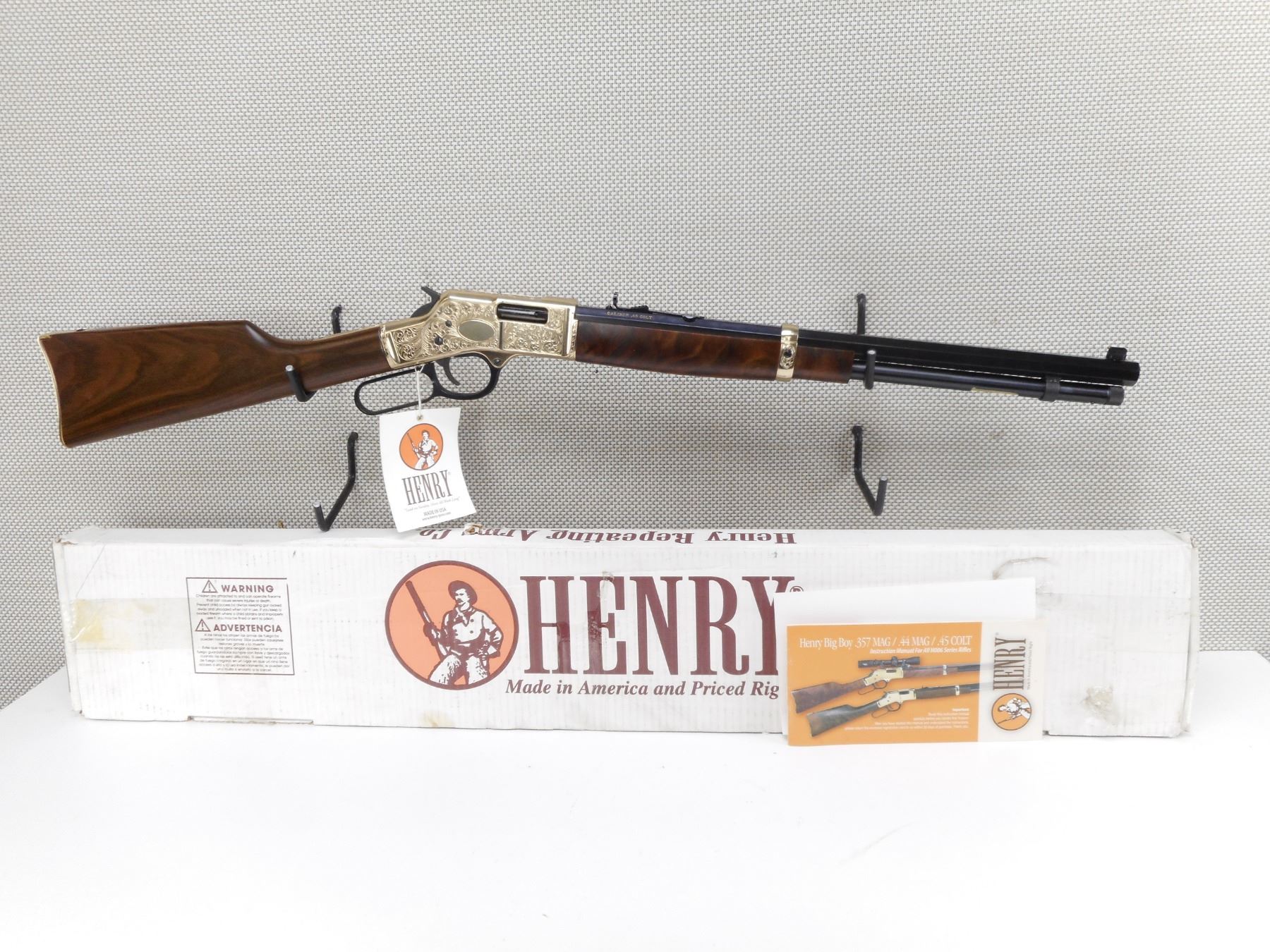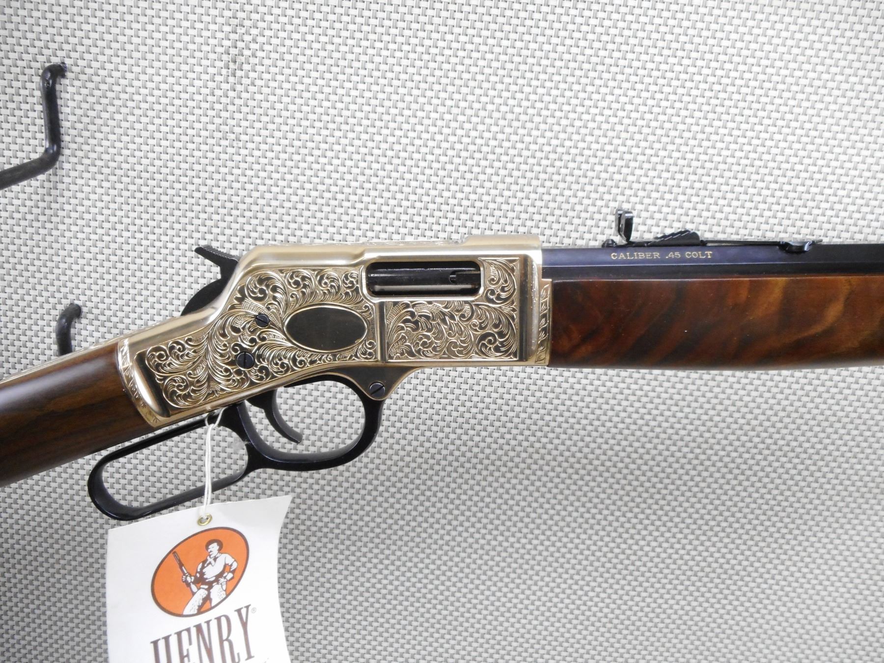 HENRY REPEATING ARMS , MODEL: BIG BOY DELUXE, H006CDD , CALIBER: 45 COLT , COMES WITH BOX, MANUAL. BORE IS EXCELLENT. APPEARS AS NEW, MAY HAVE BEEN TEST FIRED. TWO PIECE HARDWOOD STOCK WITH BRASS BUTT PLATE. BLADE FRONT AND ADJUSTABLE REAR SIGHT. RICHLY ENGRAVED BRASS RECEIVER FRAME. SHOWS VIRTUALLY NO HANDLING MARKS. ACTION: LEVER ACTION RIFLE , BARREL LENGTH: 19 1/2" , SERIAL # BB00408 , CONDITION: AS NEW IN BOX , CLASS: CANADIAN NON RESTRICTED CLASS