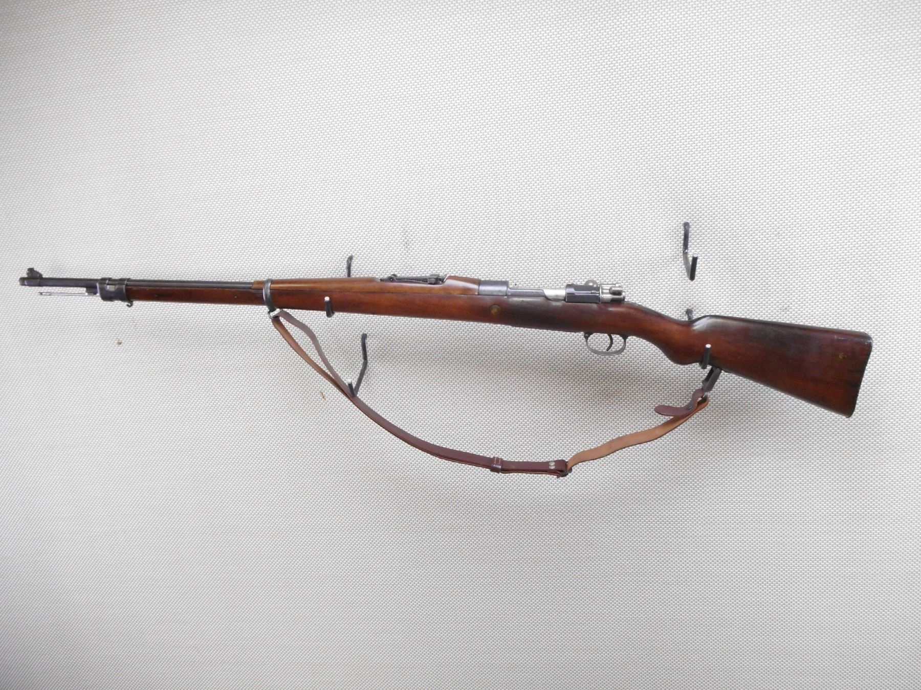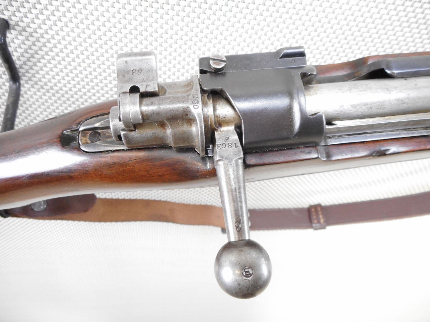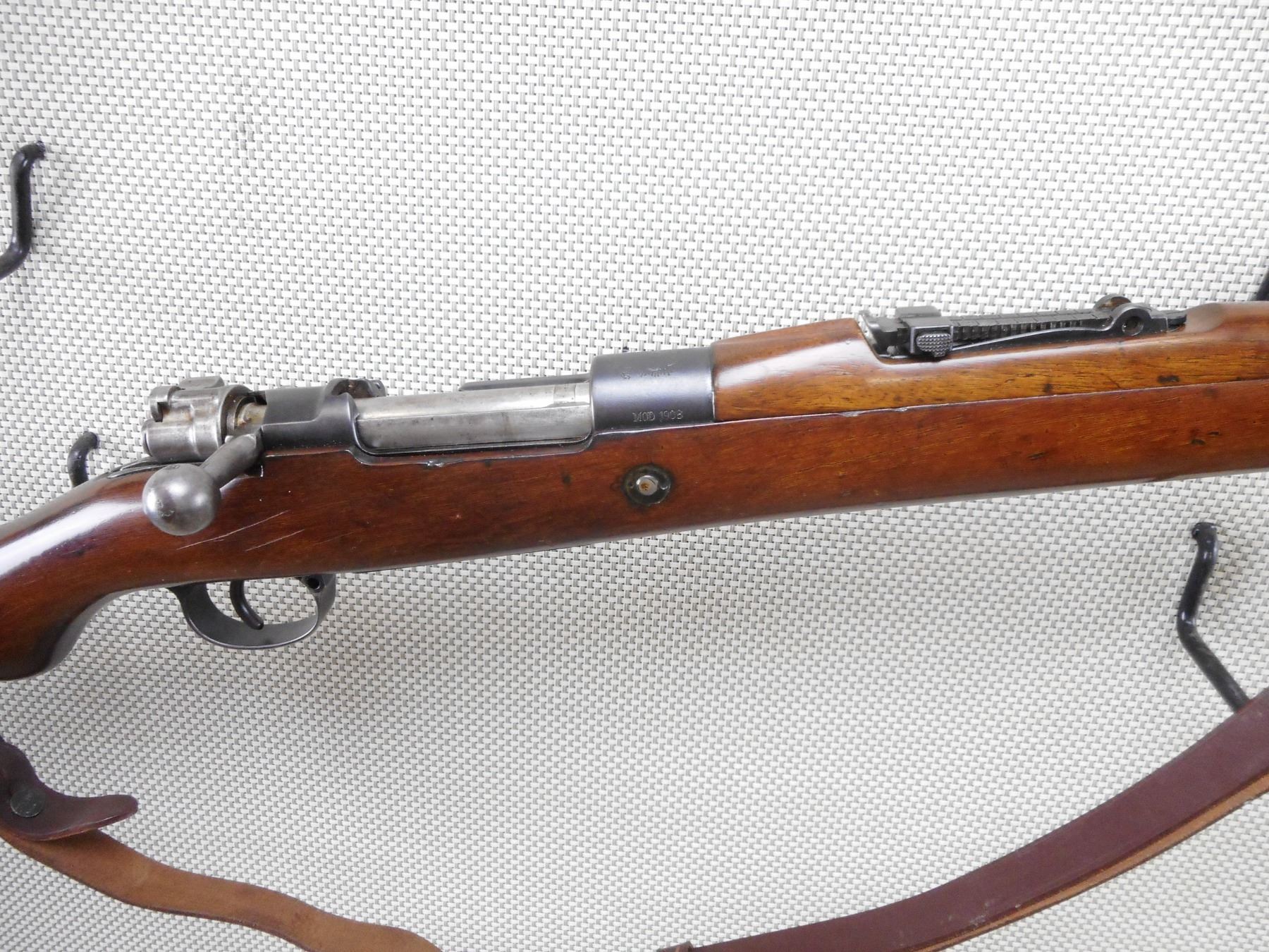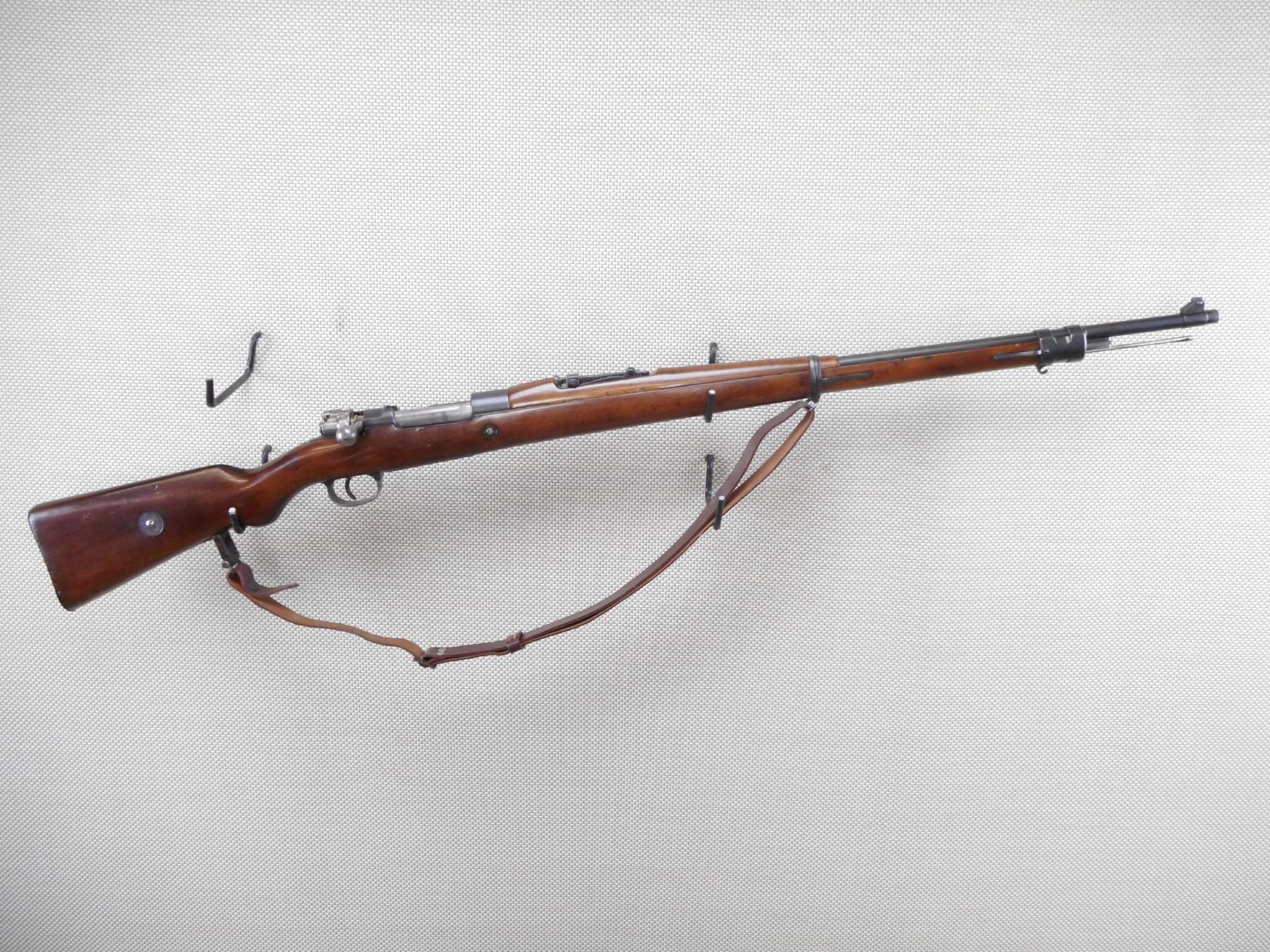 MAUSER , MODEL: 1908 BRAZILIAN , CALIBER: 7 MM MAUSER , BORE IS VERY GOOD. BOLT AND RECEIVER ARE MATCHING BY SERIAL #. BLADE FRONT AND ADJUSTABLE REAR SIGHTS. TWO PIECE HARDWOOD STOCK WITH STEEL BUTT PLAT. LEATHER SLING. CLEANING ROD. RETAINS FULL MILITARY CONFIGURATION. LEATHER SLING. SHOWS SOME HANDLING MARKS.ACTION: BOLT ACTION RIFLE , BARREL LENGTH: 29" , SERIAL # 1863 , CONDITION: 7/10 , CLASS: CANADIAN NON RESTRICTED CLASS