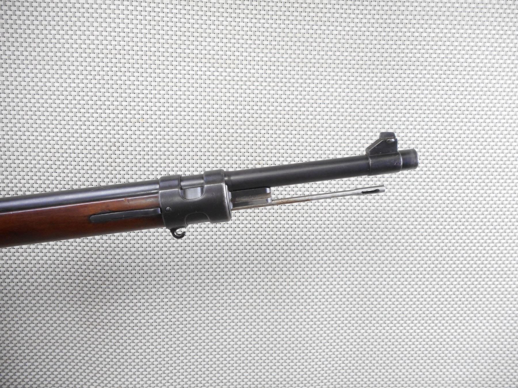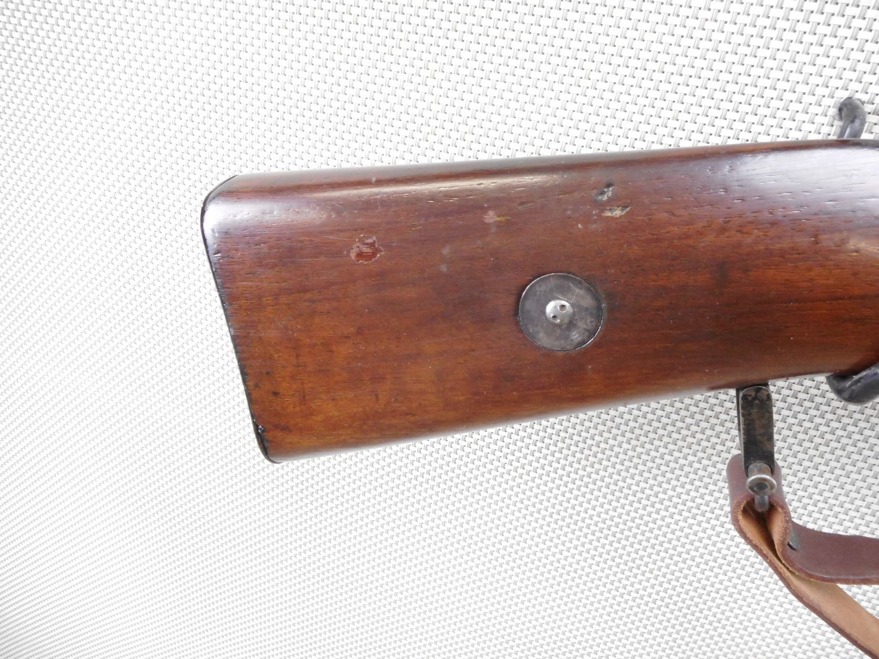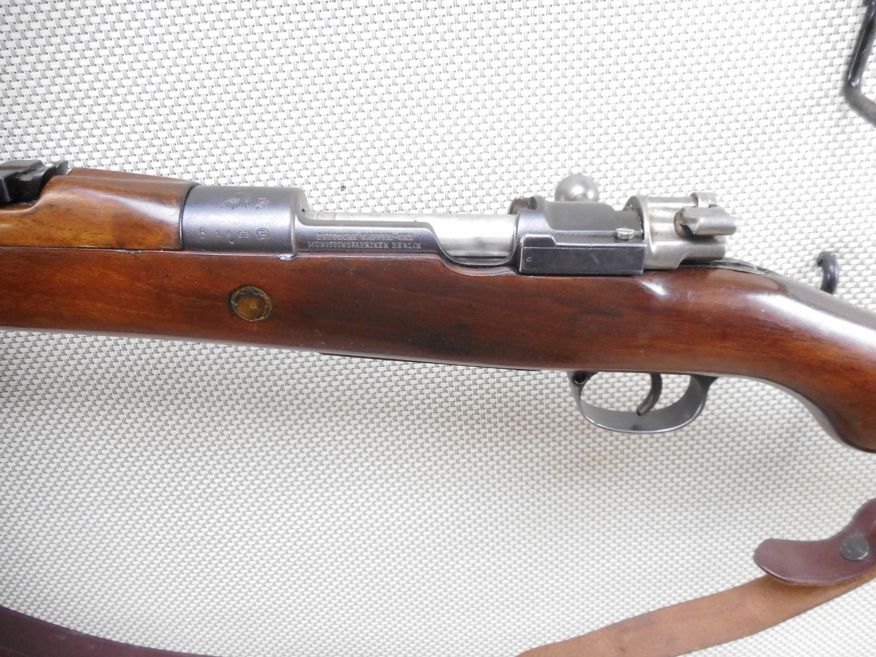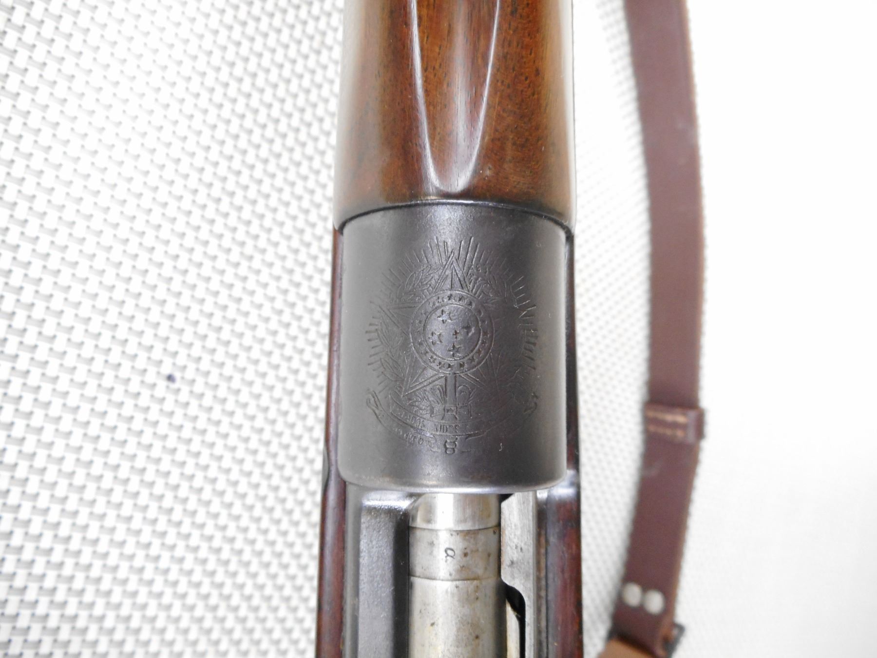 MAUSER , MODEL: 1908 BRAZILIAN , CALIBER: 7 MM MAUSER , BORE IS VERY GOOD. BOLT AND RECEIVER ARE MATCHING BY SERIAL #. BLADE FRONT AND ADJUSTABLE REAR SIGHTS. TWO PIECE HARDWOOD STOCK WITH STEEL BUTT PLAT. LEATHER SLING. CLEANING ROD. RETAINS FULL MILITARY CONFIGURATION. LEATHER SLING. SHOWS SOME HANDLING MARKS.ACTION: BOLT ACTION RIFLE , BARREL LENGTH: 29" , SERIAL # 1863 , CONDITION: 7/10 , CLASS: CANADIAN NON RESTRICTED CLASS