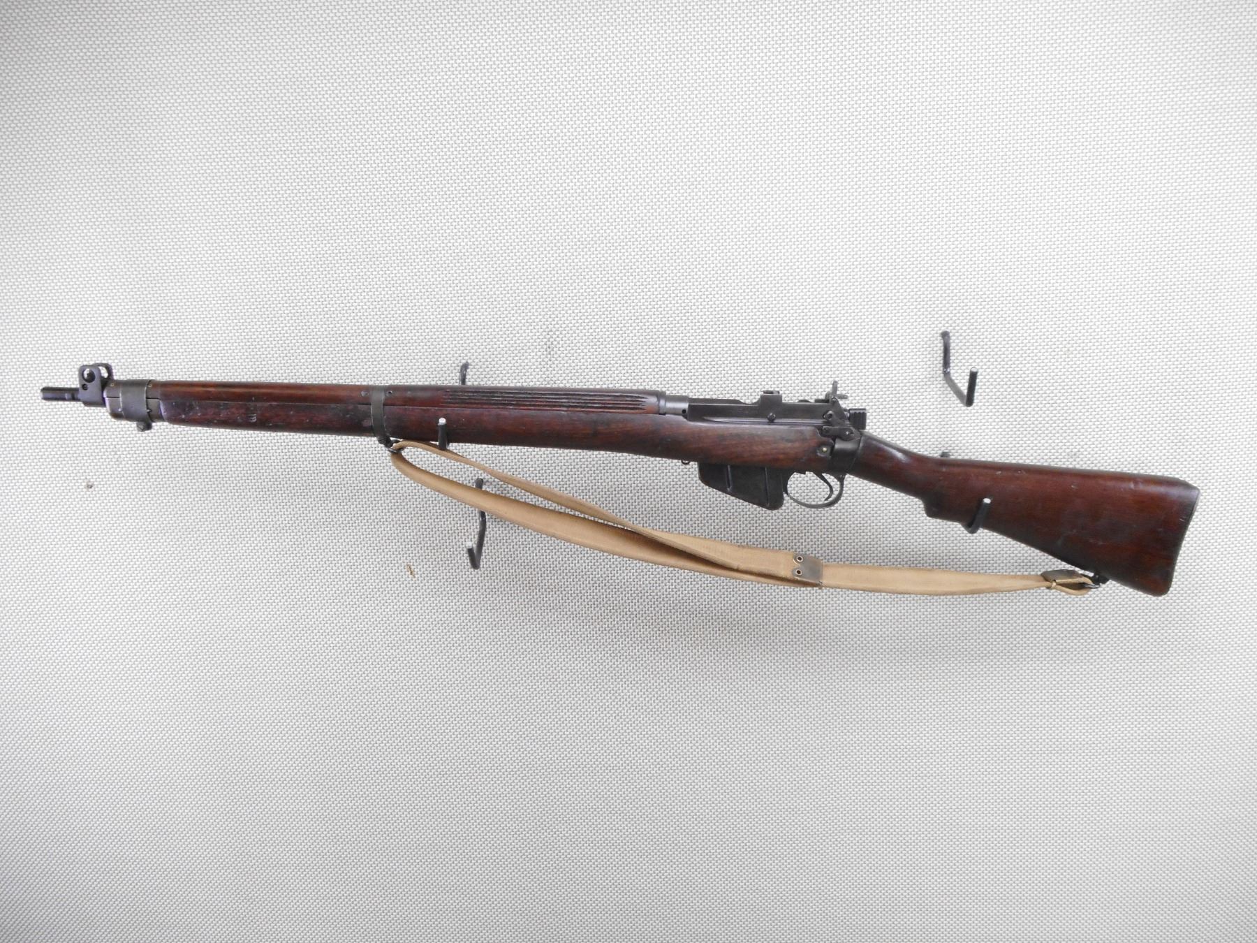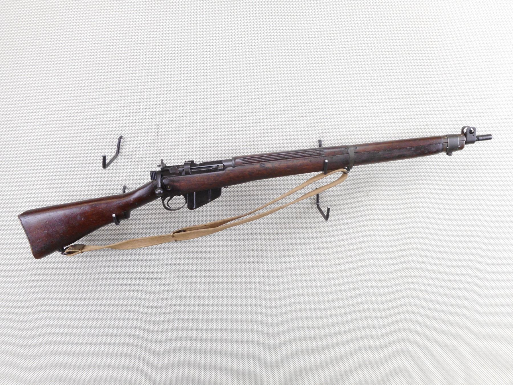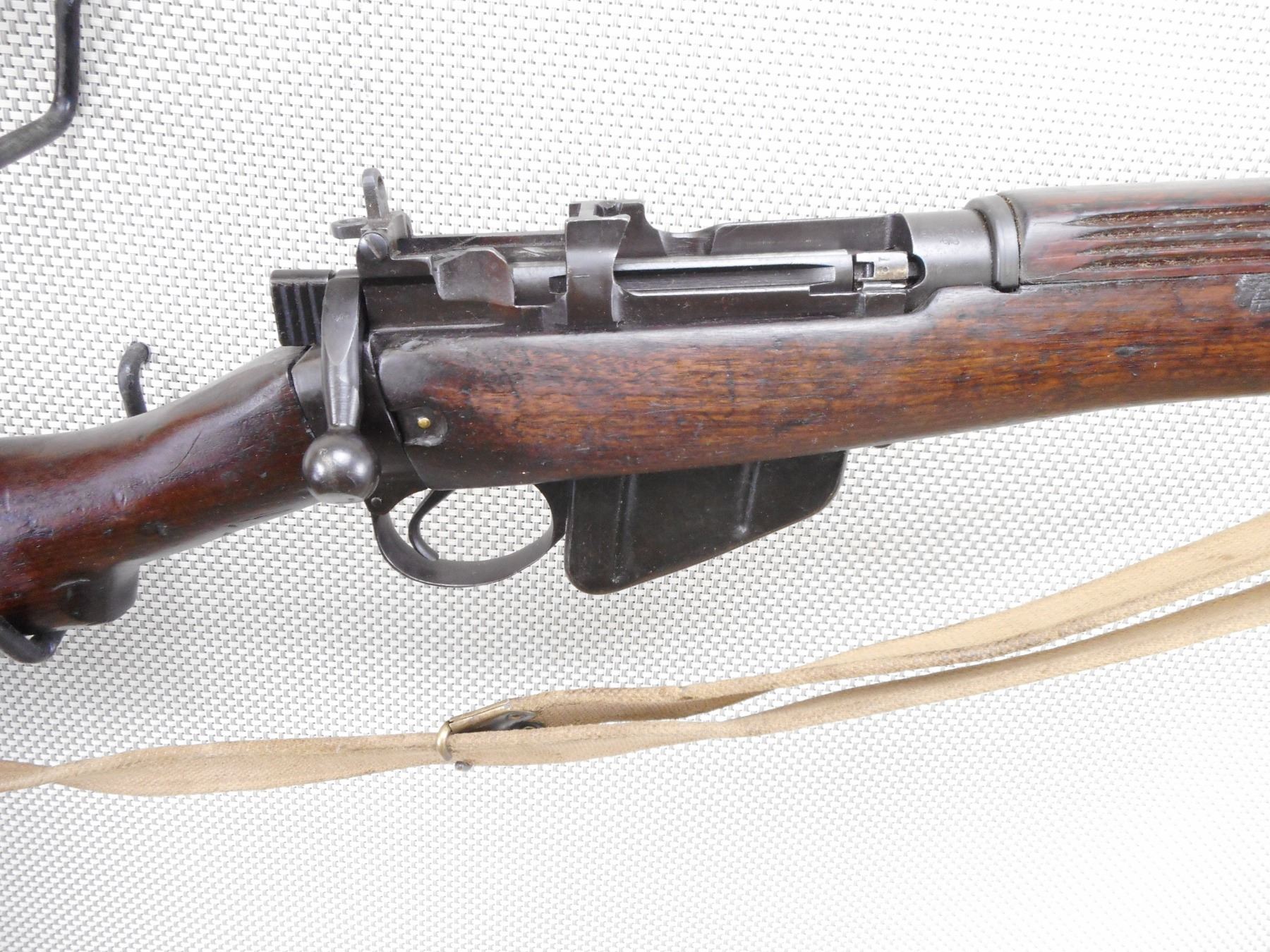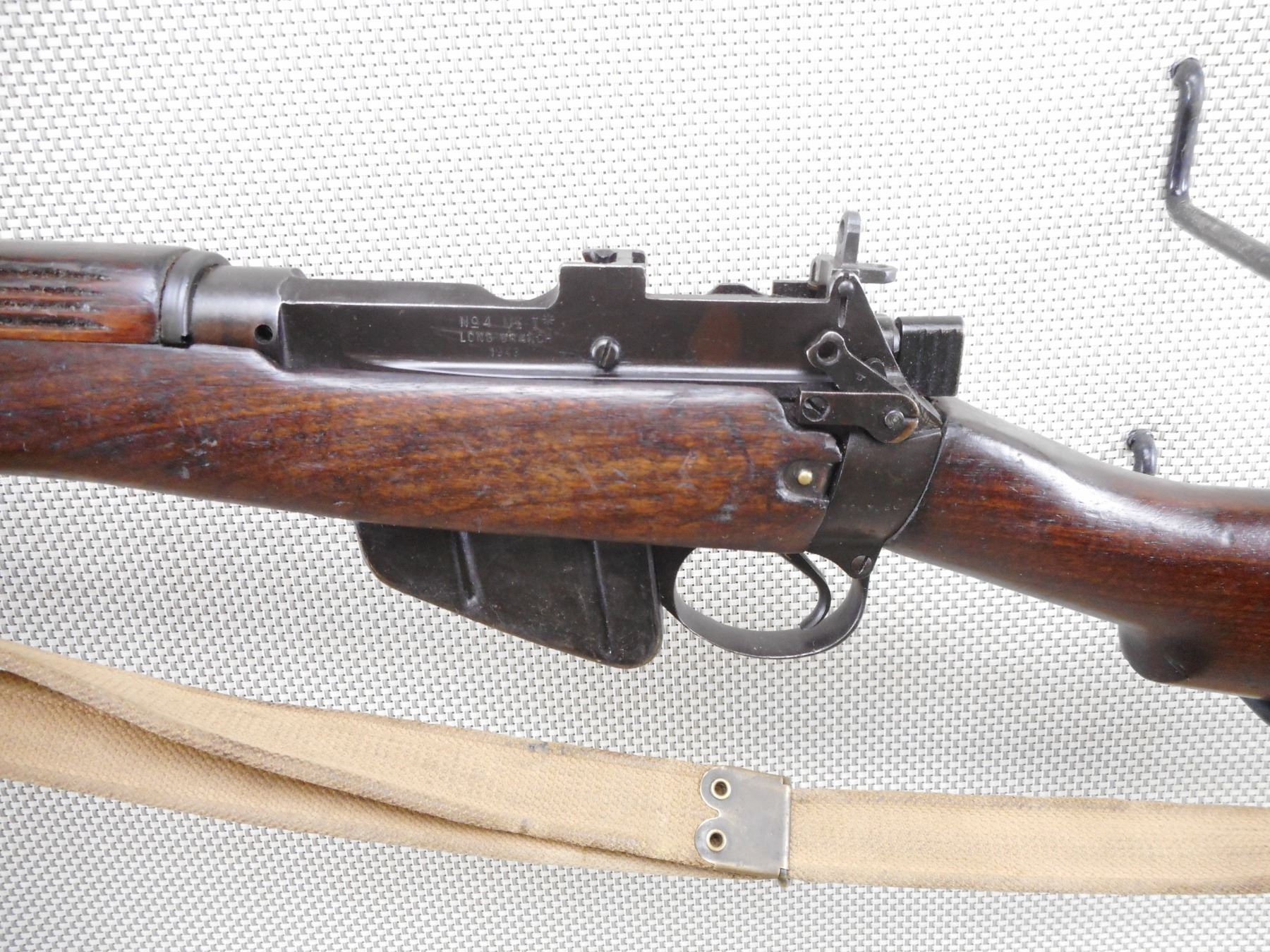 WWII ERA, LEE ENFIELD , MODEL: NO. 4 MK I* LONG BRANCH , CALIBER: 303 BR , COMES WITH MAGAZINE. BORE IS VERY GOOD. DATED 1943. BOLT AND RECEIVER MATCH BY SERIAL #. SOME MILITARY MARKINGS. BARLEY CORN FRONT AND PEEP REAR SIGHTS. 4 PIECE HARDWOOD STOCK WITH STEEL BUTT PLATE. ORIGINAL CANVAS SLING. FULL MILITARY CONFIGURATION. SHOWS SOME HANDLING MARKS. ACTION: BOLT ACTION RIFLE , BARREL LENGTH: 25 1/2" , SERIAL # 32L7454 , CONDITION: 7/10 , CLASS: CANADIAN NON RESTRICTED CLASS