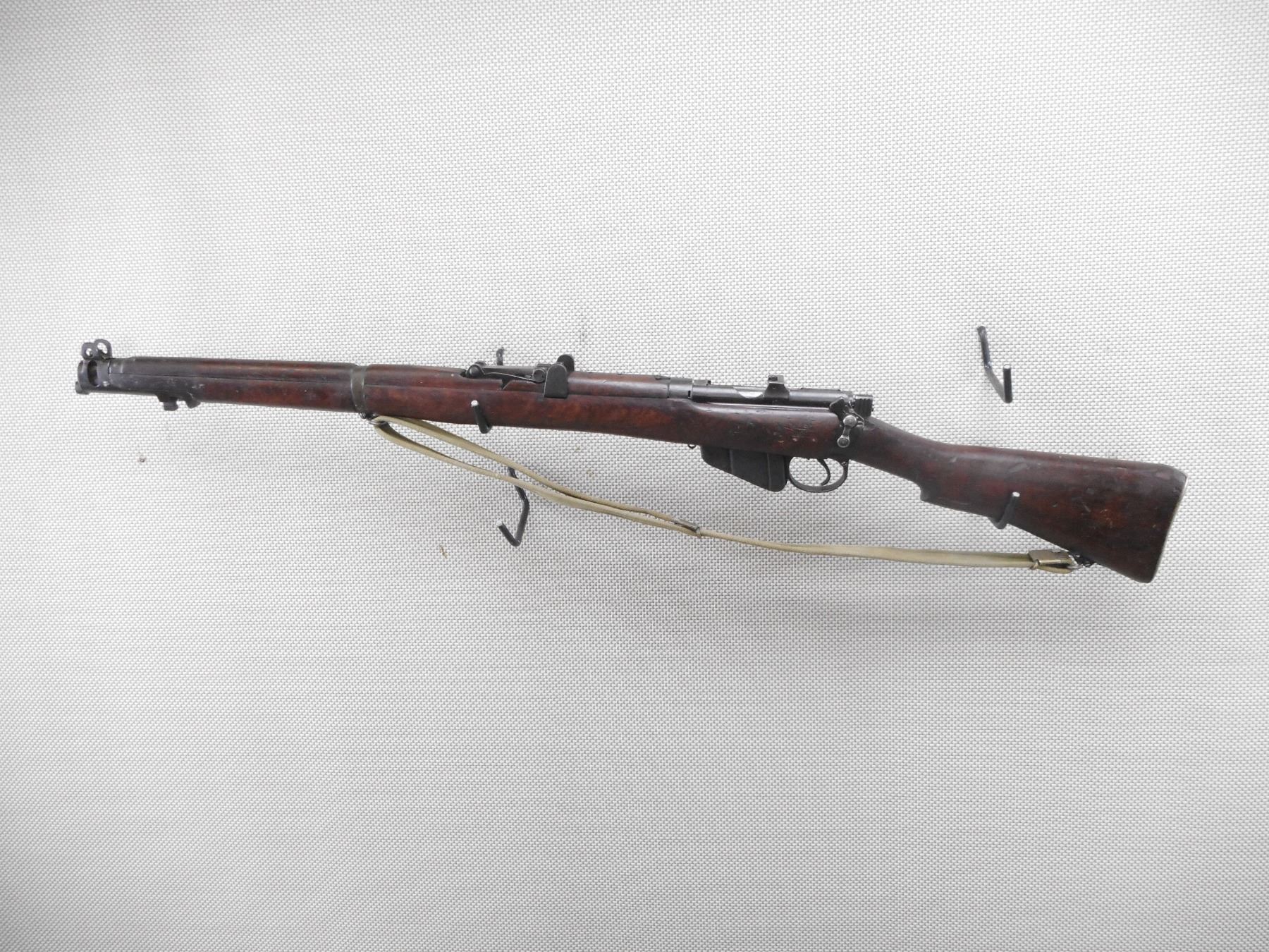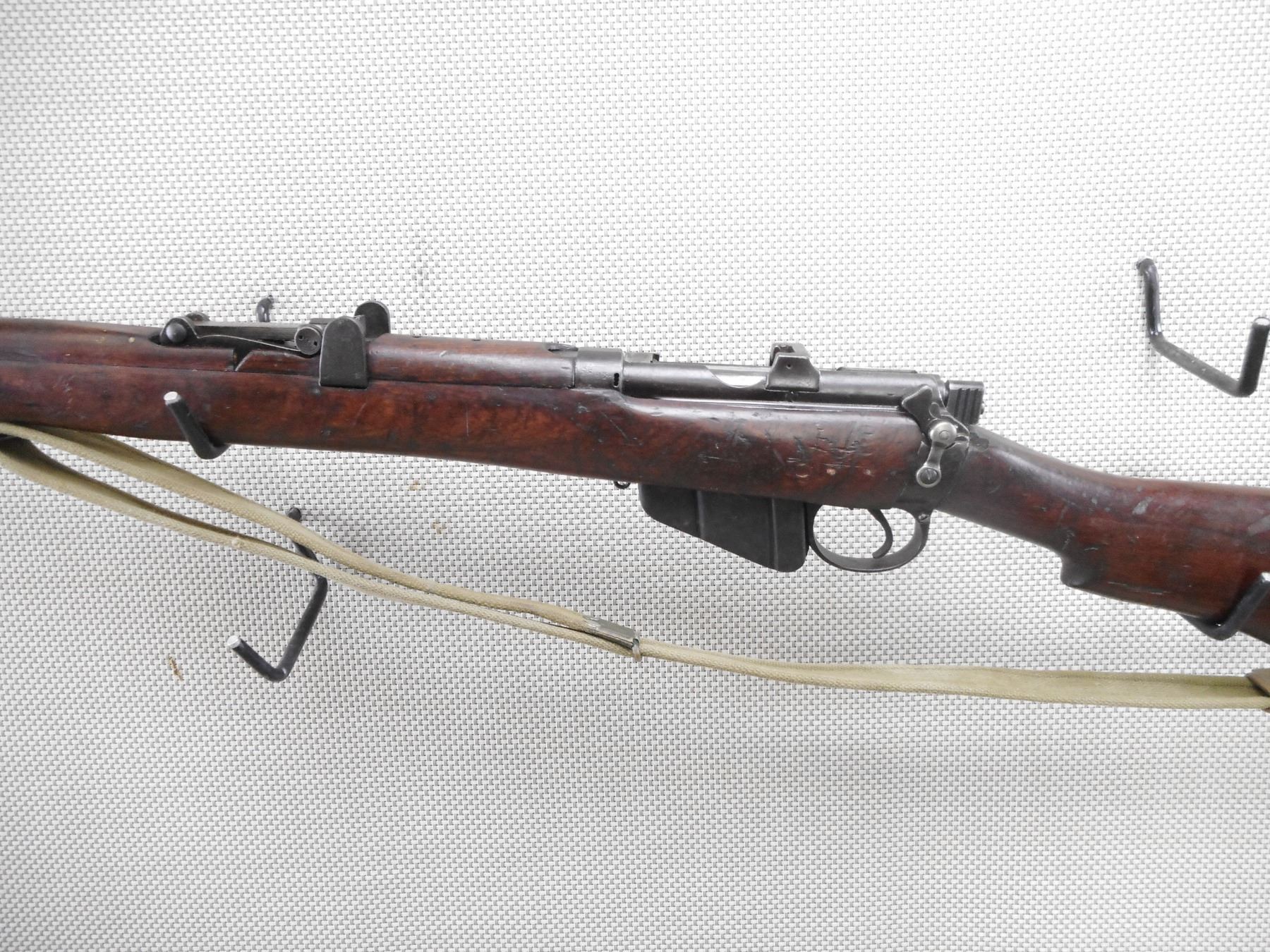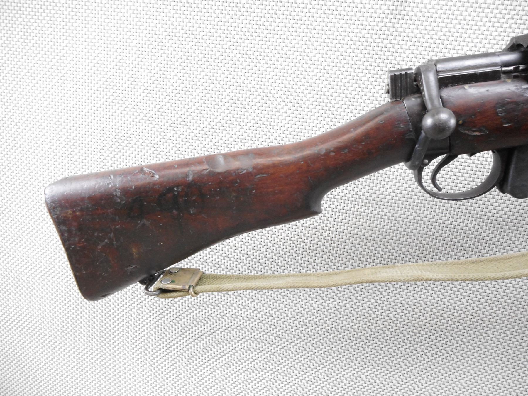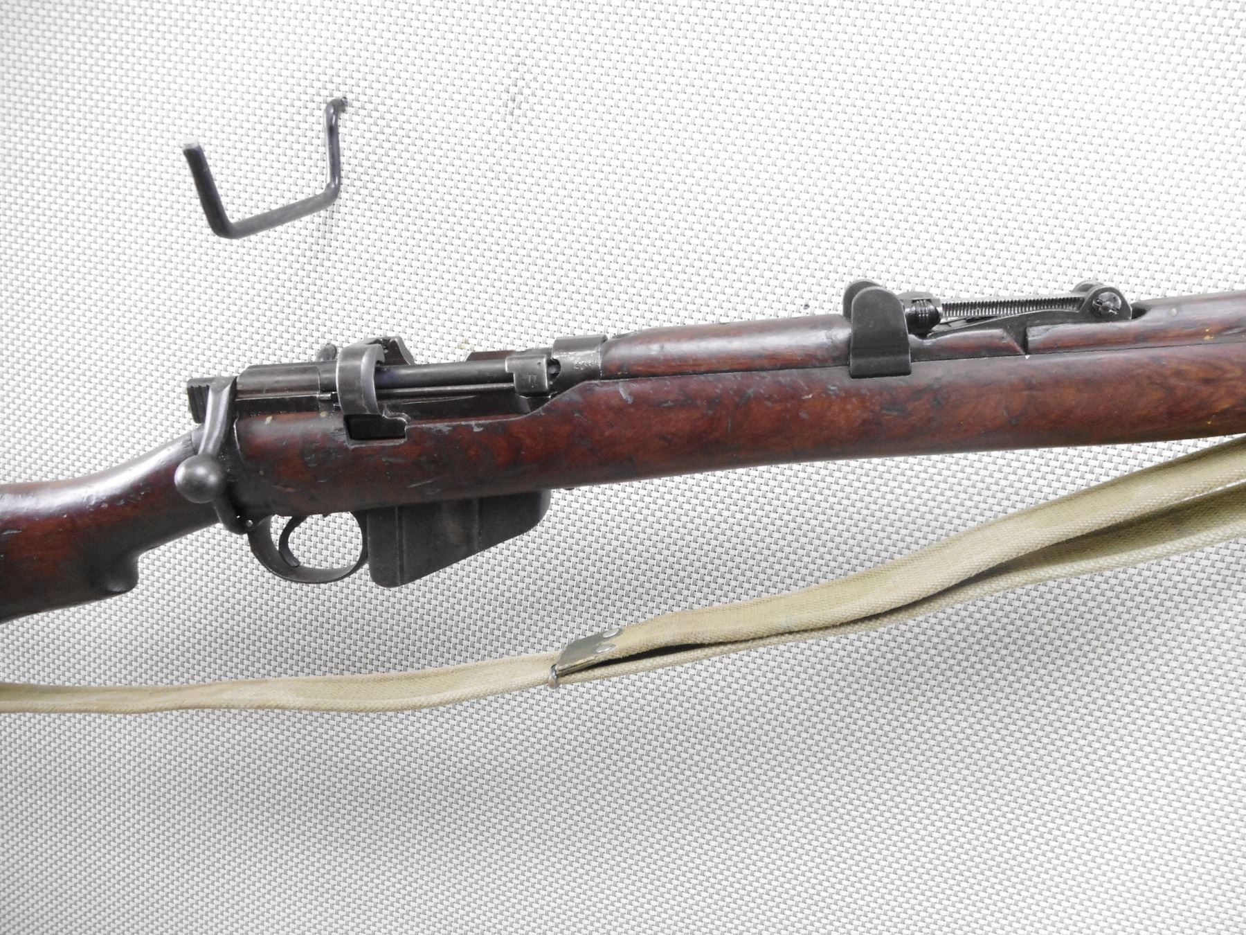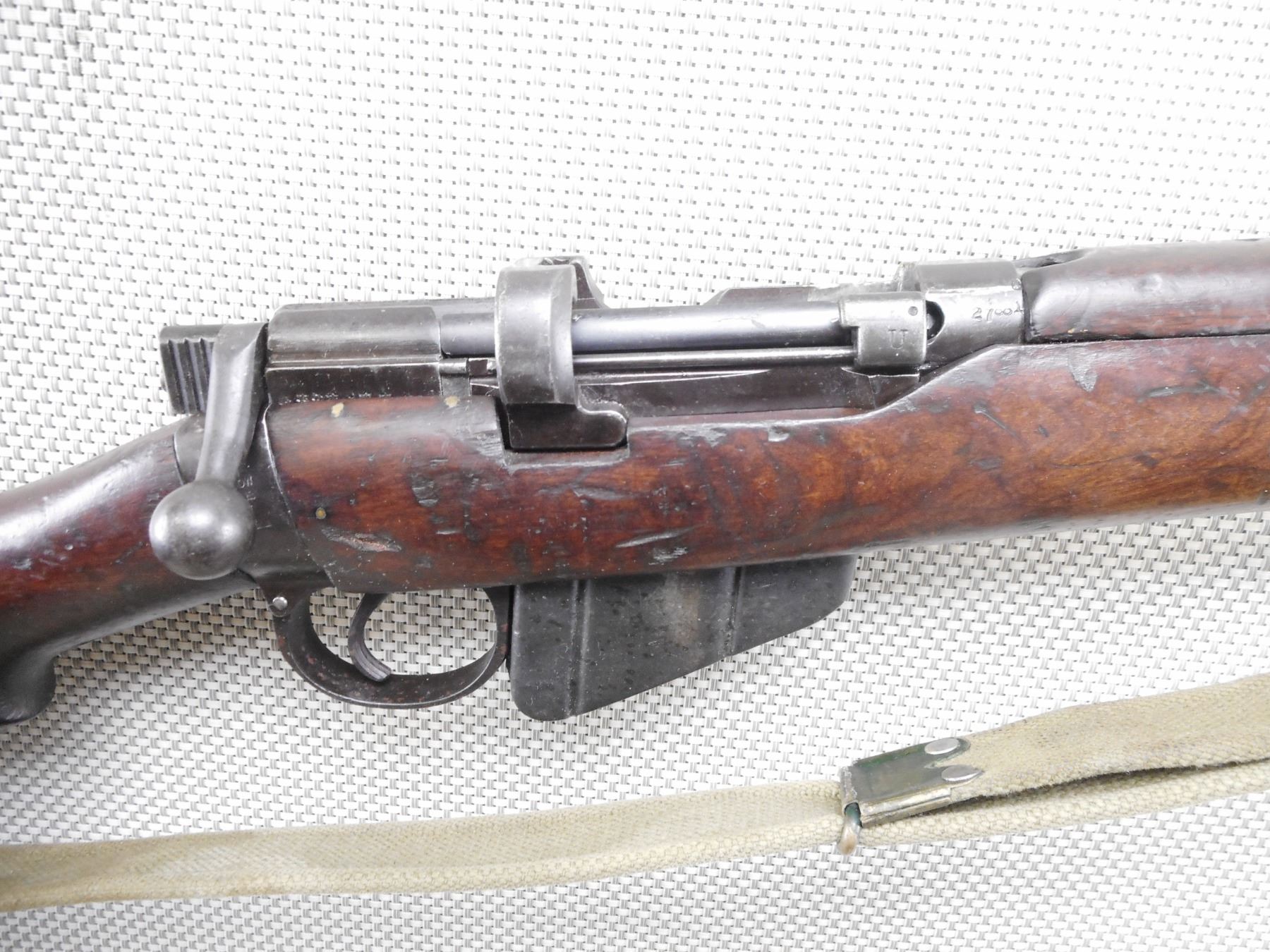 LEE ENFIELD , MODEL: NO. 1 MK III* , CALIBER: 303 BR , COMES WITH MAGAZINE. BORE IS VERY GOOD. BOLT AND RECEIVER MATCH BY SERIAL #. ORIGINAL COCKING KNOB REPLACED WITH LONG BRANCH COCKING KNOB BARLEY CORN FRONT AND ADJUSTABLE REAR SIGHT. RETAINS FULL MILITARY CONFIGURATION. BRASS BUTT PLATE. ORIGINAL MILITARY CANVAS SLING. SHOWS SOME HANDLING MARKS.ACTION: BOLT ACTION RIFLE , BARREL LENGTH: 25 1/2" , SERIAL # 27881 , CONDITION: 6/10 , CLASS: CANADIAN NON RESTRICTED CLASS