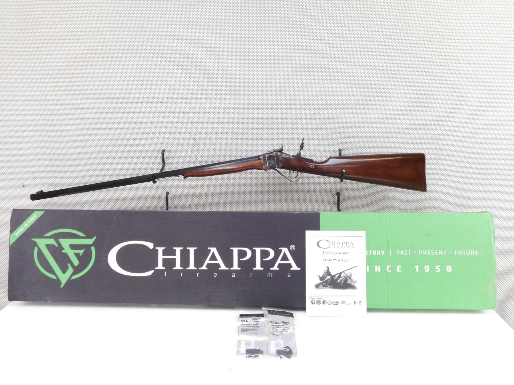 CHIAPPA , MODEL: SHARPS RIFLE , CALIBER: 22 HORNET , COMES WITH BOX, MANUAL, SCOPE RAIL AND SCREWS, BORE IS EXCELLENT, APPEARS AS NEW, MAY HAVE BEEN TEST FIRED. BLADE FRONT REAR APERTURE PEEP SIGHT. TWO PIECE HARDWOOD STOCK WITH STEEL BUTT PLATE. OCTAGONAL BARREL. CASE HARDENED RECEIVER LEVER. SET TRIGGER. SHOWS VIRTUALLY NO HANDLING MARKS. ACTION: FALLING BLOCK ACTION , BARREL LENGTH: 26" , SERIAL # 17H03385 , CONDITION: AS NEW IN BOX , CLASS: CANADIAN NON RESTRICTED CLASS