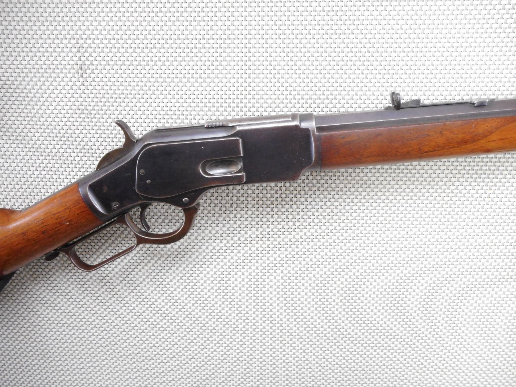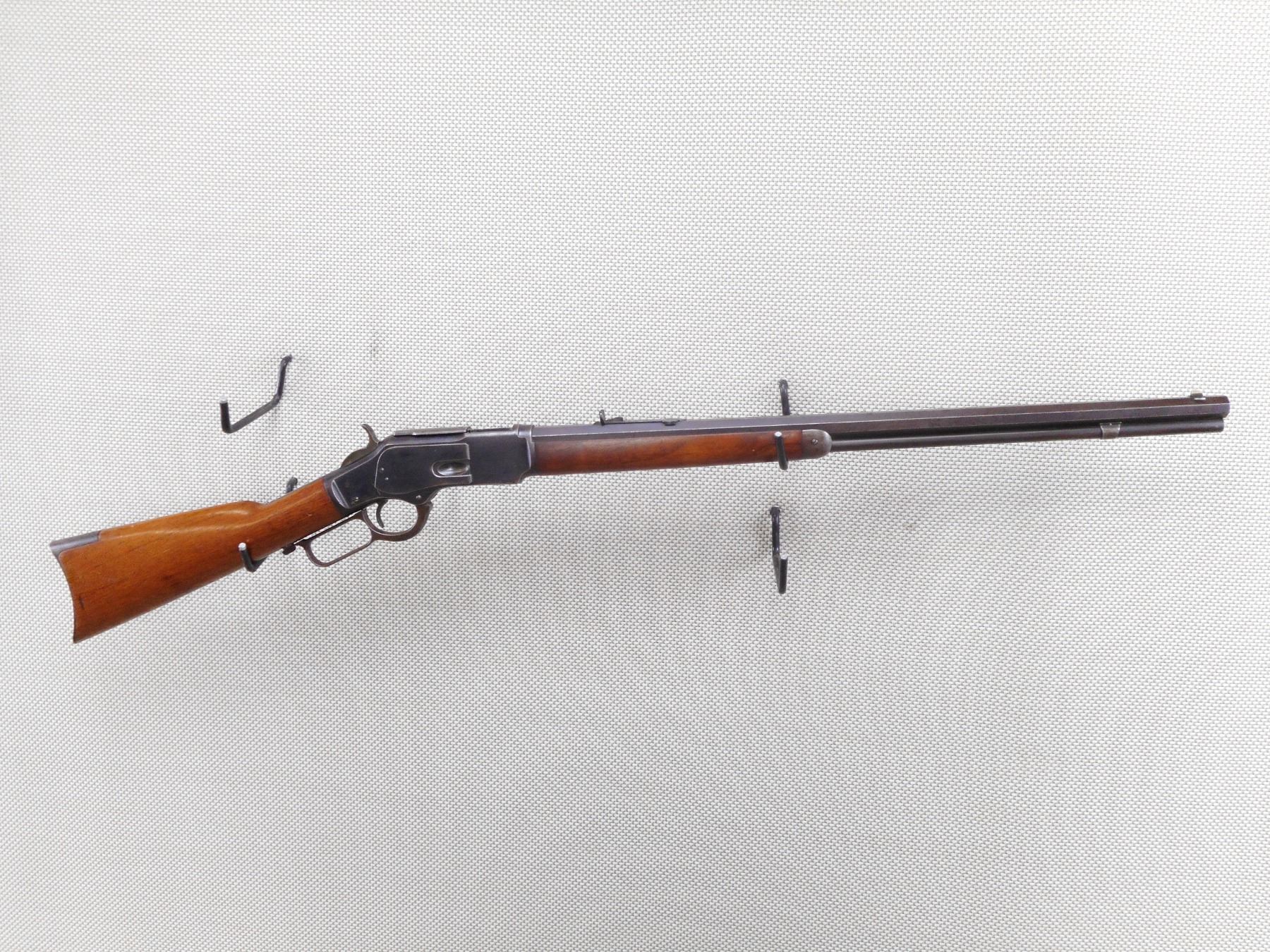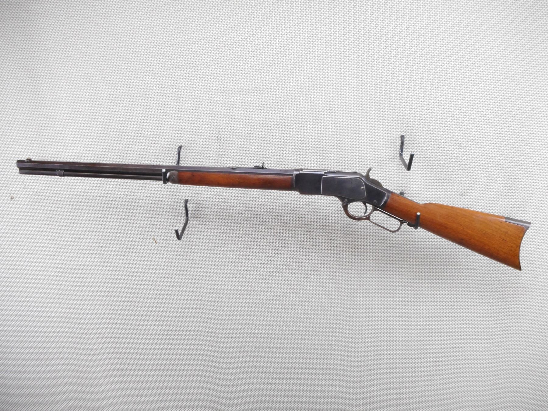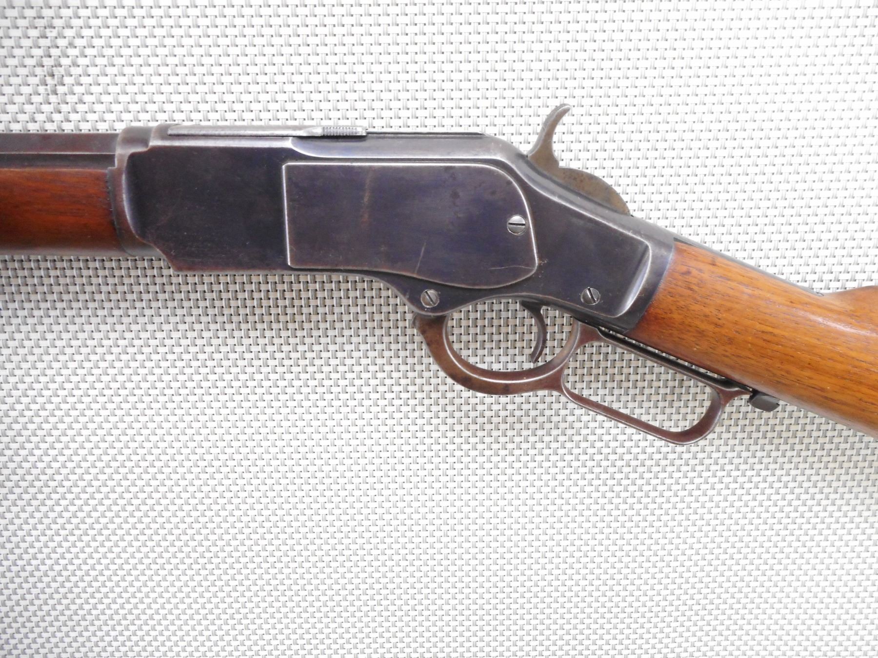 WINCHESTER , MODEL: 1873 , CALIBER: 32 WCF , GOOD BORE. MANUFACTURED IN 1895 (ANTIQUE IN THE USA). BLADE FRONT AND ADJUSTABLE REAR SIGHT ON AN OCTAGONAL BARREL. TWO PIECE HARDWOOD STOCK WITH CRESCENT BUTT PLATE. SHOWS MINOR HANDLING MARKS. RETAINS APPROX 50% OF THE ORIGINAL BLUEING. ACTION: LEVER ACTION RIFLE , BARREL LENGTH: 24" , SERIAL # 484064B , CONDITION: 7/10 , CLASS: CANADIAN NON RESTRICTED CLASS