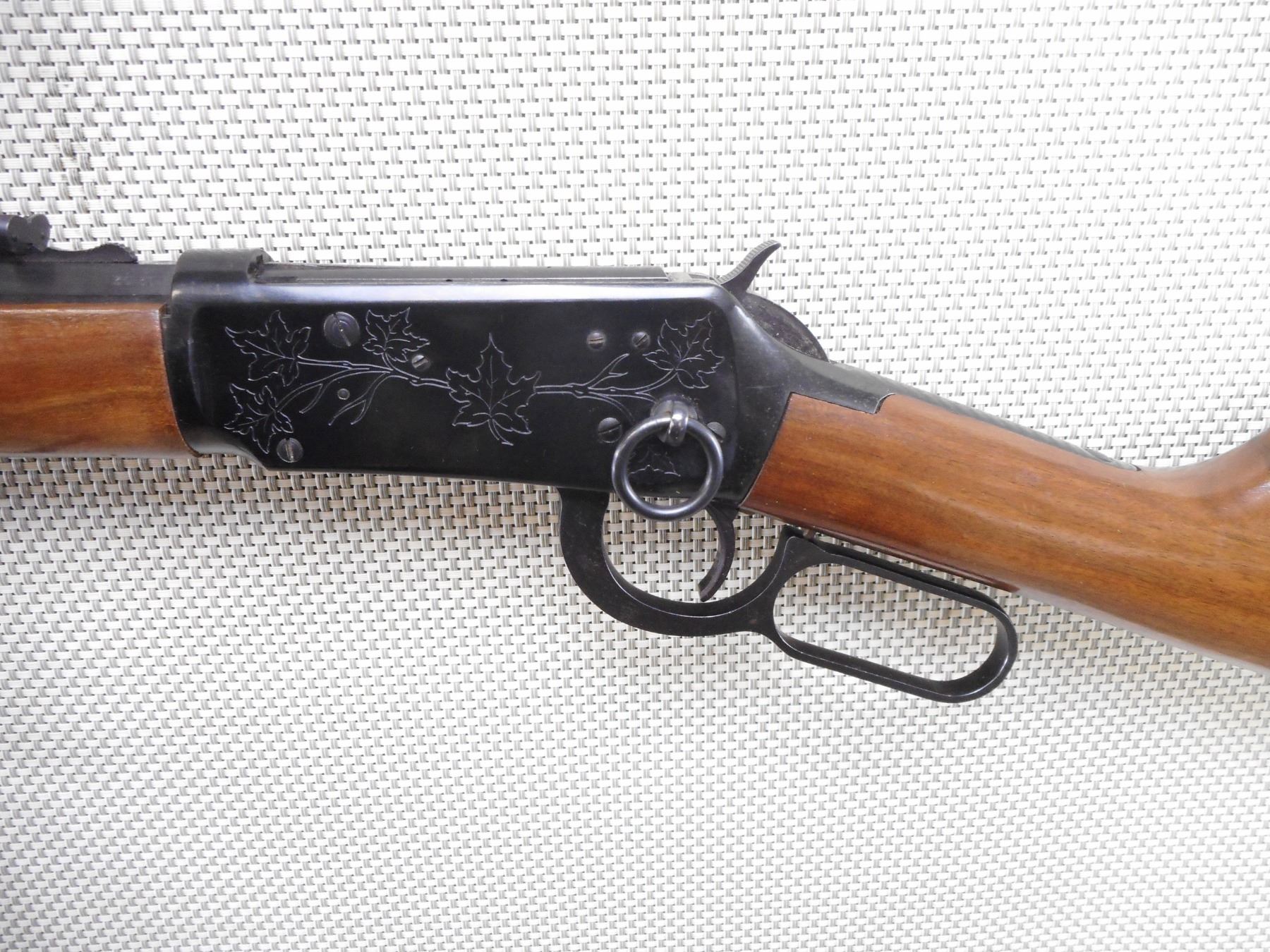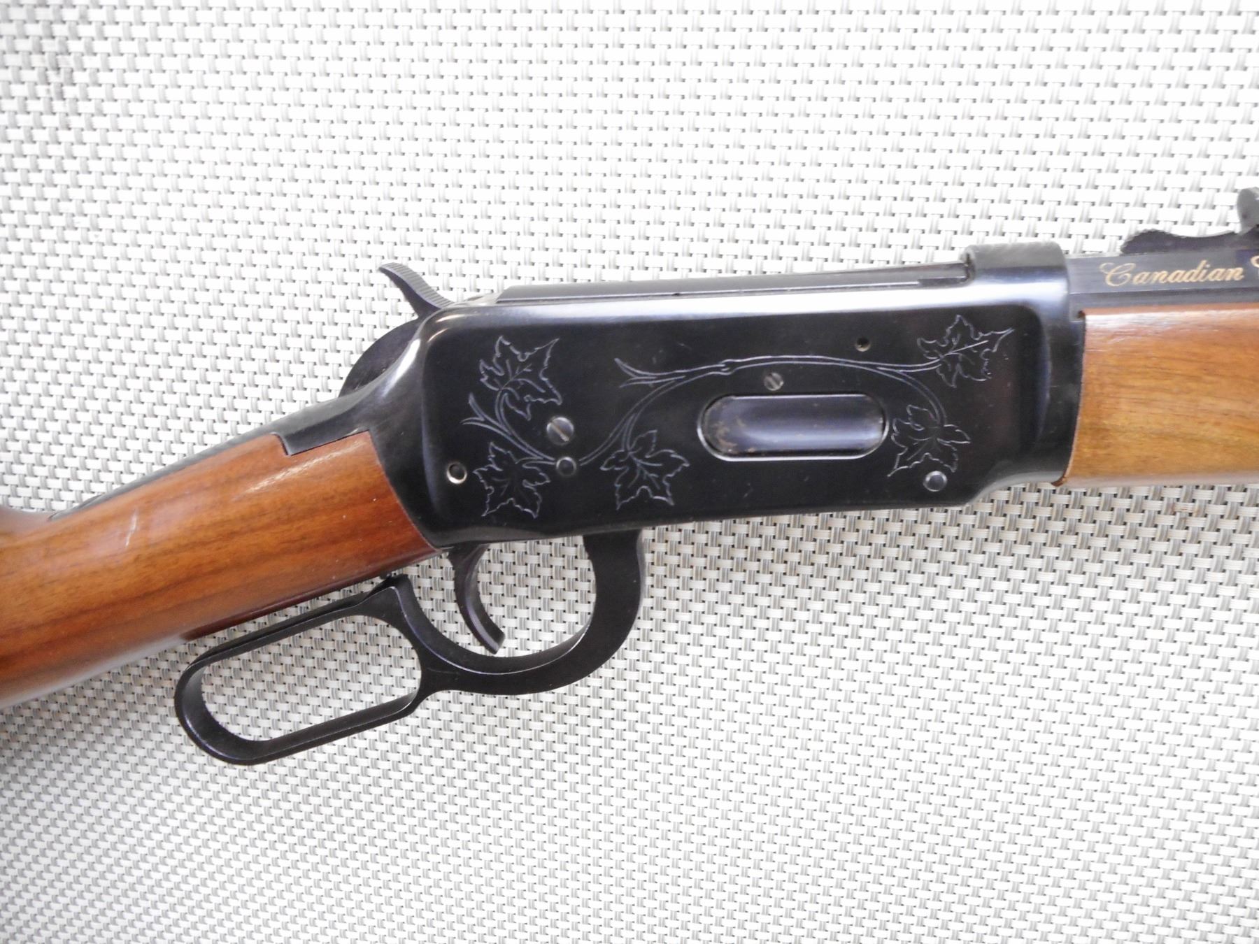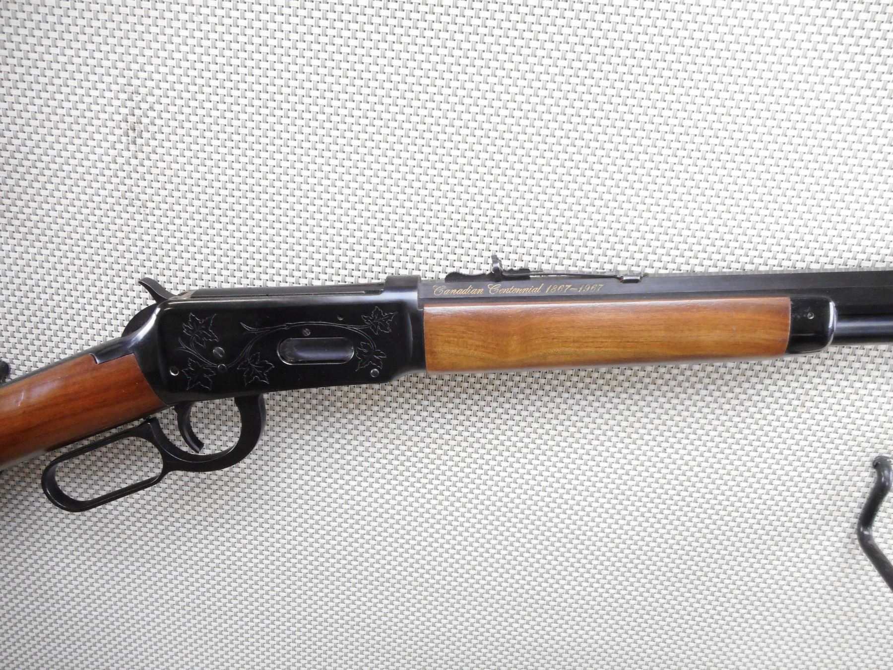WINCHESTER , MODEL: 1894 CANADIAN CENTENNIAL , CALIBER: 30-30 WIN , COMES WITH BOX. BORE IS EXCELLENT. BLADE FRONT AND ADJUSTABLE REAR SIGHT ON AN OCTAGONAL BARREL. TWO PIECE HARDWOOD STOCK WITH STEEL BUTT PLATE. SADDLE RING. SHOWS VERY LITTLE HANDLING MARKS. ACTION: LEVER ACTION RIFLE , BARREL LENGTH: 20" , SERIAL # 7455 , CONDITION: 8/10 , CLASS: CANADIAN NON RESTRICTED CLASS