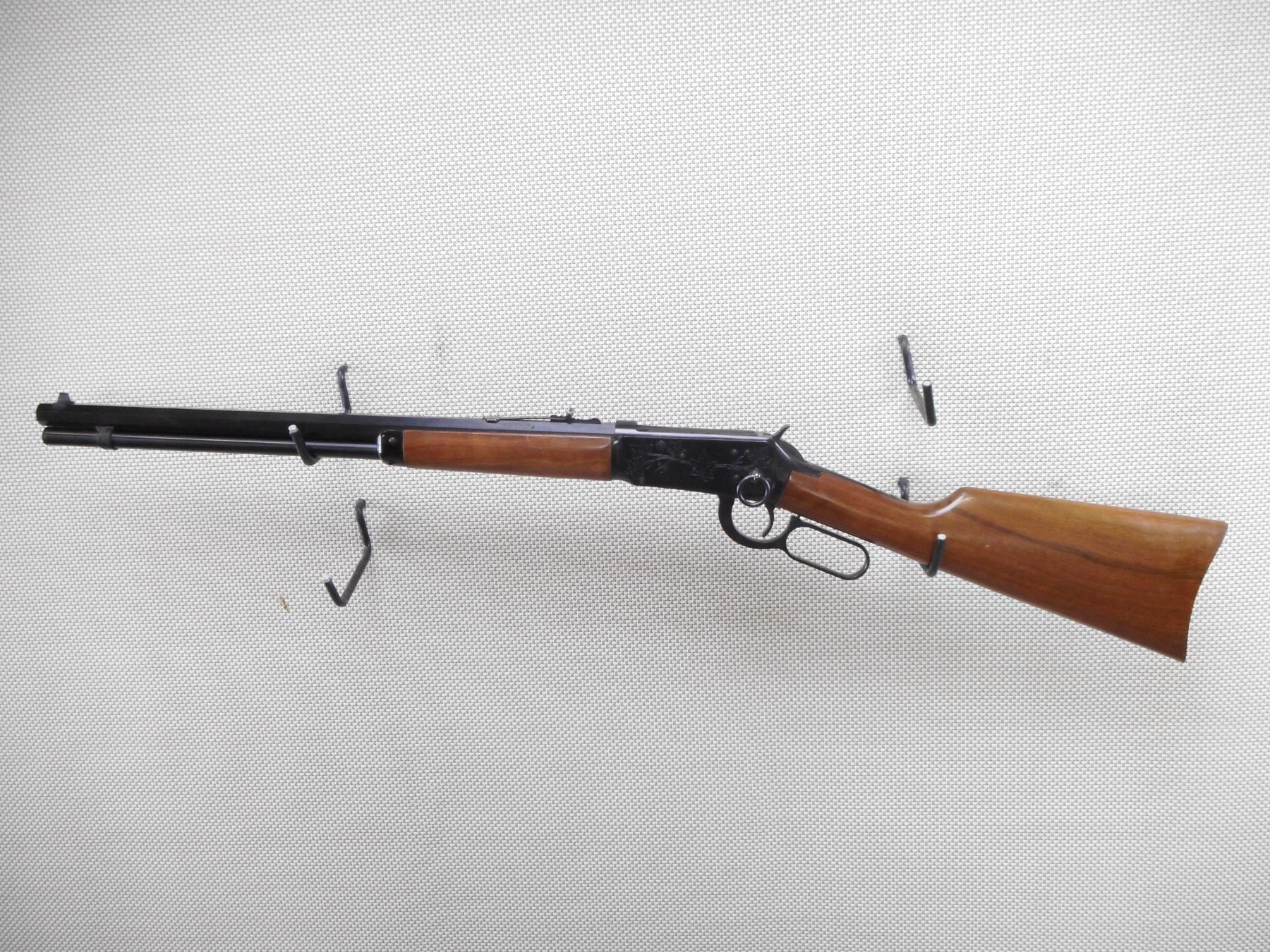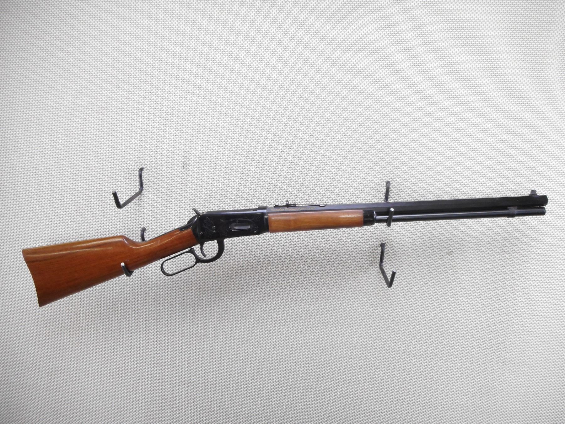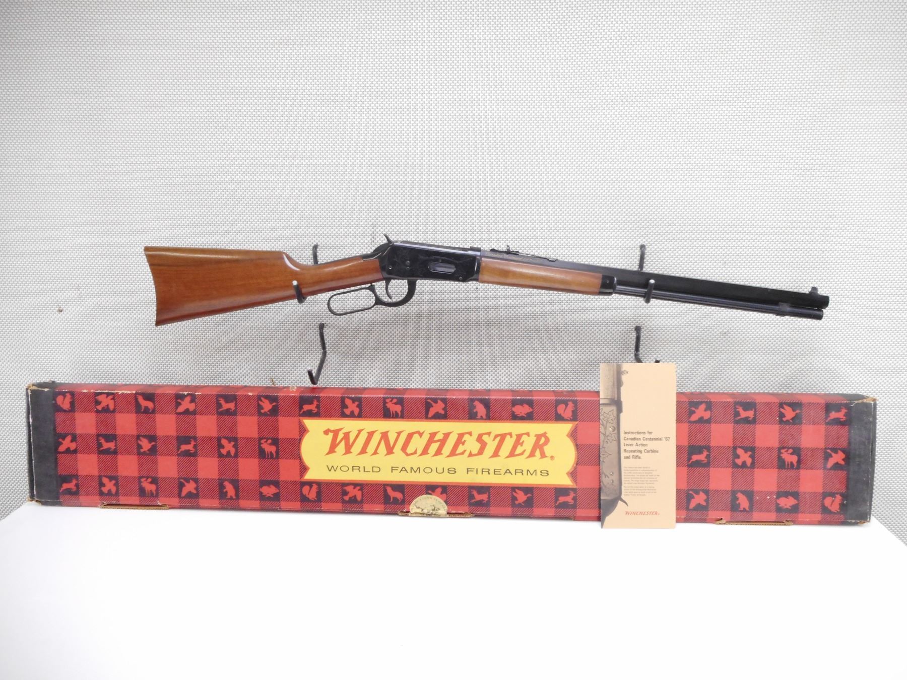 WINCHESTER , MODEL: 1894 CANADIAN CENTENNIAL , CALIBER: 30-30 WIN , COMES WITH BOX. BORE IS EXCELLENT. BLADE FRONT AND ADJUSTABLE REAR SIGHT ON AN OCTAGONAL BARREL. TWO PIECE HARDWOOD STOCK WITH STEEL BUTT PLATE. SADDLE RING. SHOWS VERY LITTLE HANDLING MARKS. ACTION: LEVER ACTION RIFLE , BARREL LENGTH: 20" , SERIAL # 7455 , CONDITION: 8/10 , CLASS: CANADIAN NON RESTRICTED CLASS