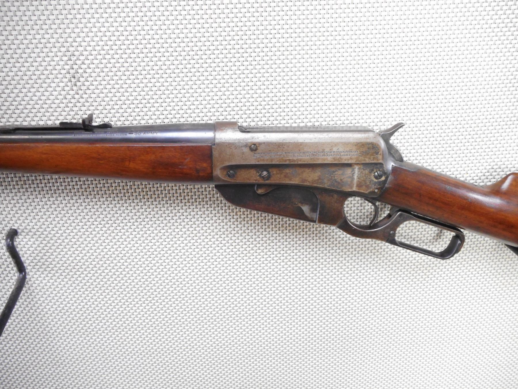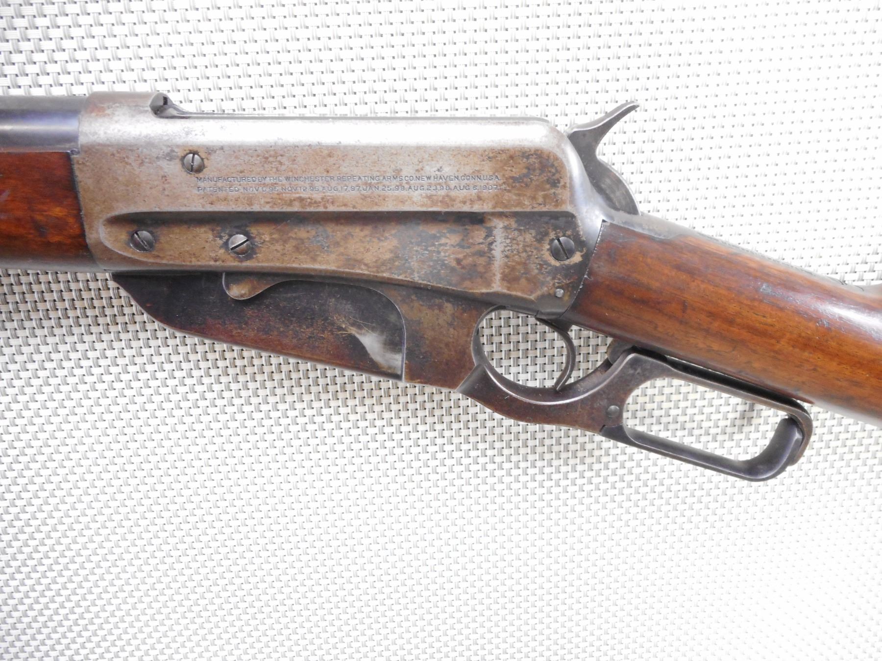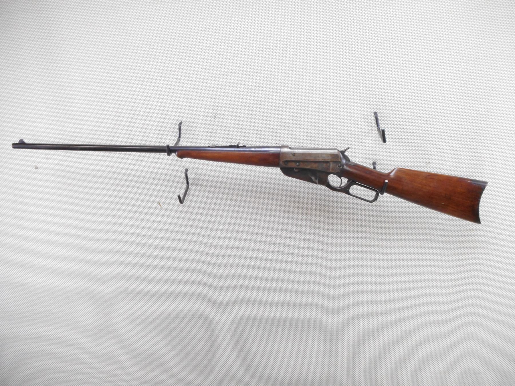 WINCHESTER , MODEL: 1895 , CALIBER: 30 ARMY (.30-40 KRAG) , MANUFACTURED IN 1924. BORE IS GOOD WITH SLIGHT PITTING AND WEAR. BLADE FRONT AND ADJUSTABLE REAR SIGHT. TWO PIECE HARDWOOD STOCK WITH SCHNOBEL FOREND AND ONYX INSERT. SHOWS SOME HANDLING MARKS. ACTION: LEVER ACTION RIFLE , BARREL LENGTH: 20" , SERIAL # 412291 , CONDITION: 6/10 , CLASS: CANADIAN NON RESTRICTED CLASS