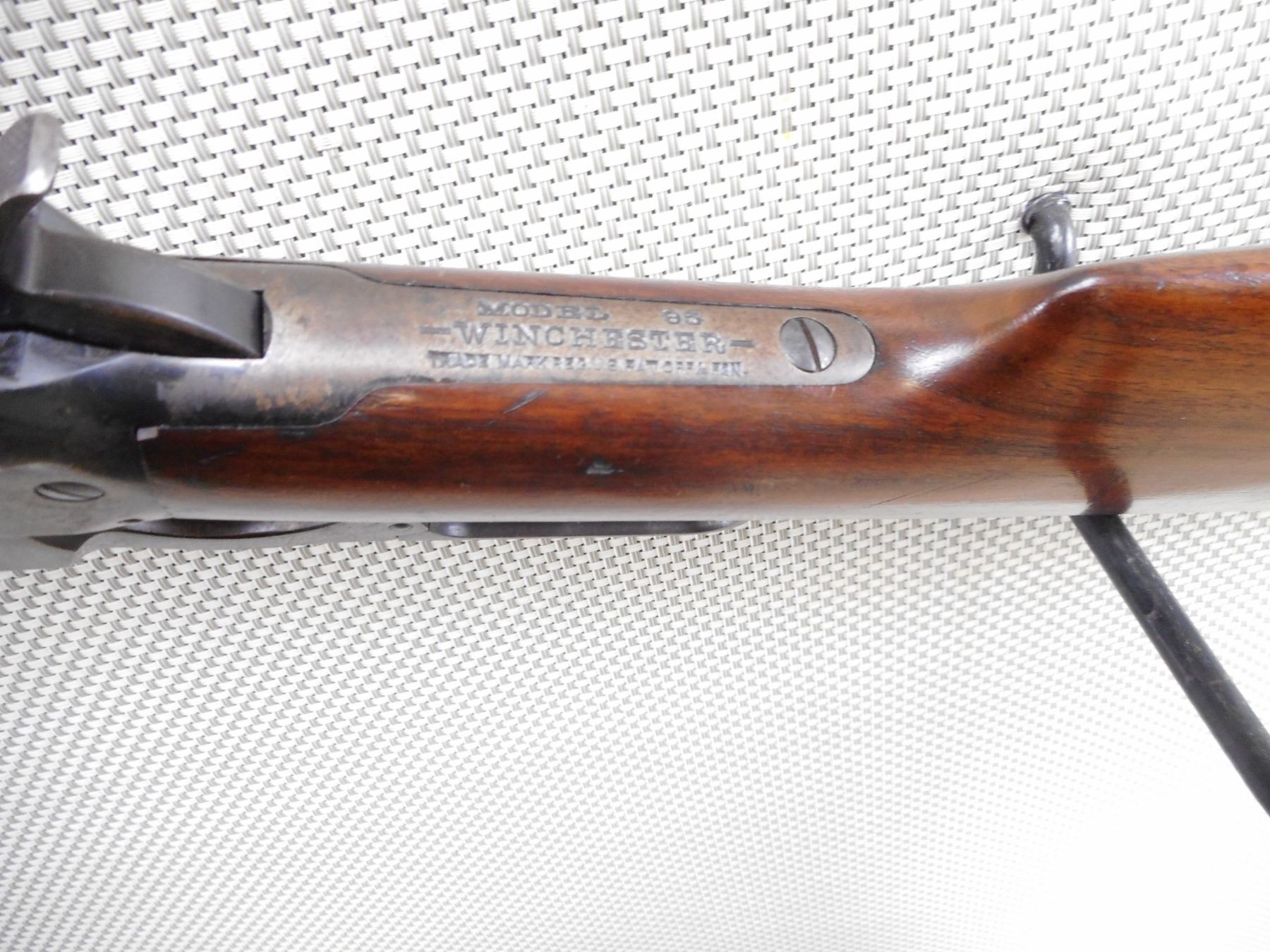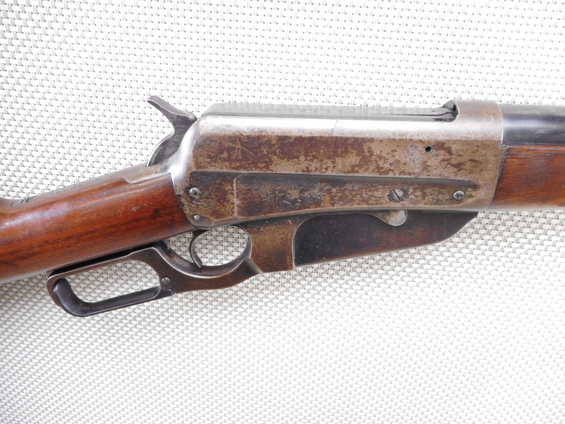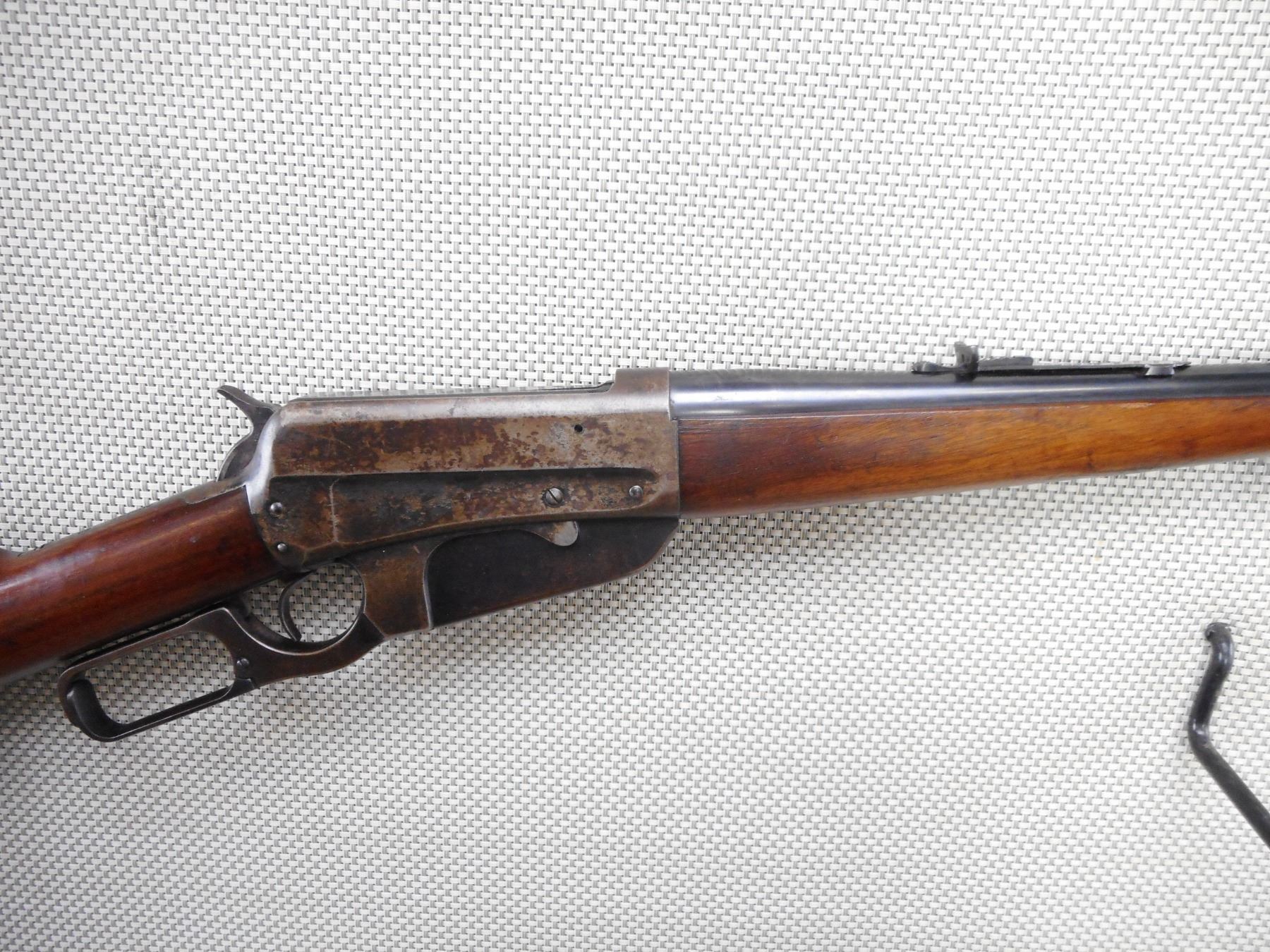 WINCHESTER , MODEL: 1895 , CALIBER: 30 ARMY (.30-40 KRAG) , MANUFACTURED IN 1924. BORE IS GOOD WITH SLIGHT PITTING AND WEAR. BLADE FRONT AND ADJUSTABLE REAR SIGHT. TWO PIECE HARDWOOD STOCK WITH SCHNOBEL FOREND AND ONYX INSERT. SHOWS SOME HANDLING MARKS. ACTION: LEVER ACTION RIFLE , BARREL LENGTH: 20" , SERIAL # 412291 , CONDITION: 6/10 , CLASS: CANADIAN NON RESTRICTED CLASS