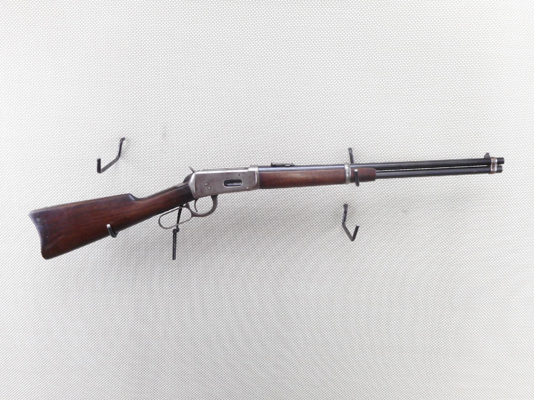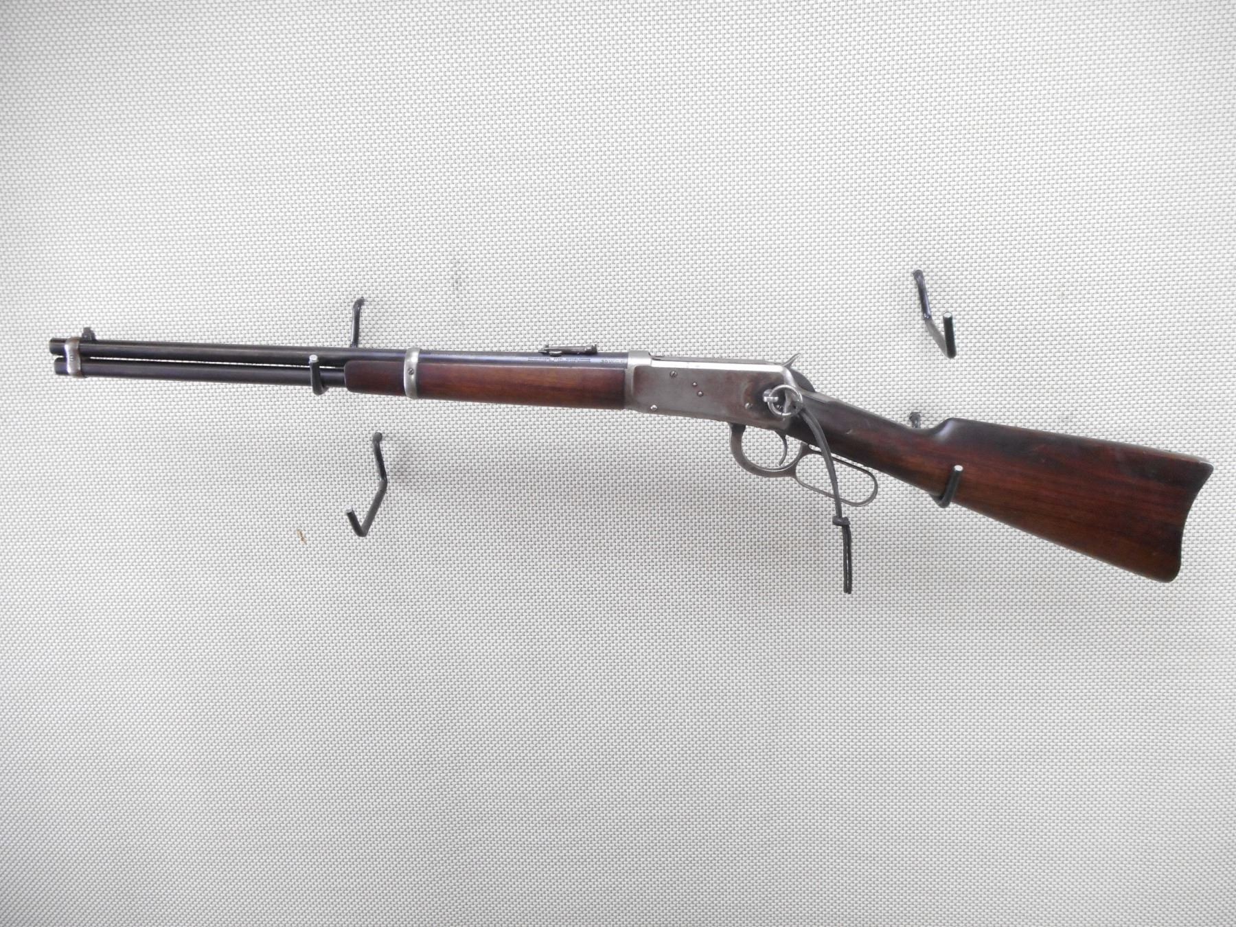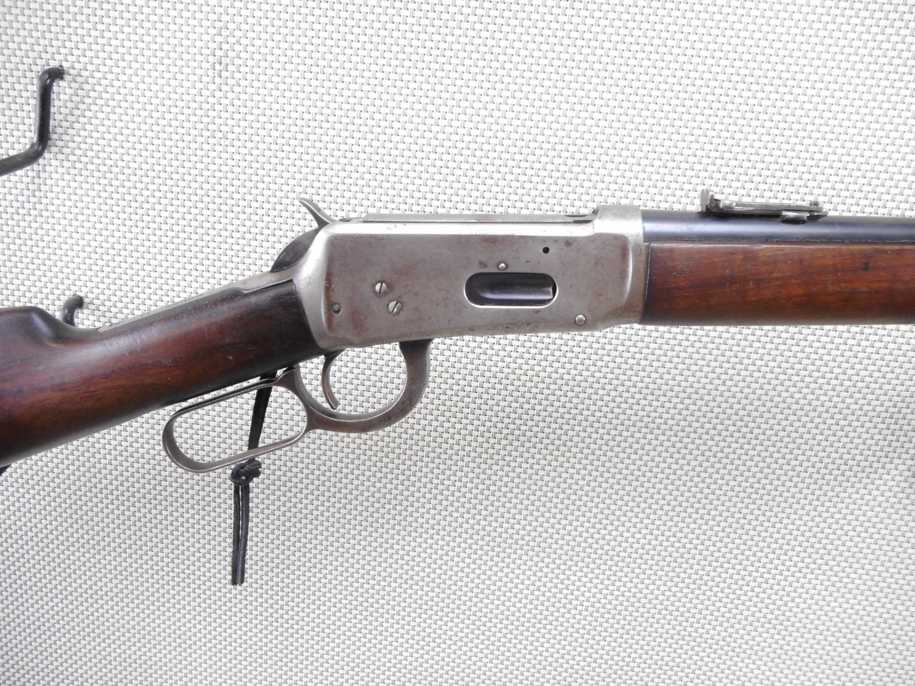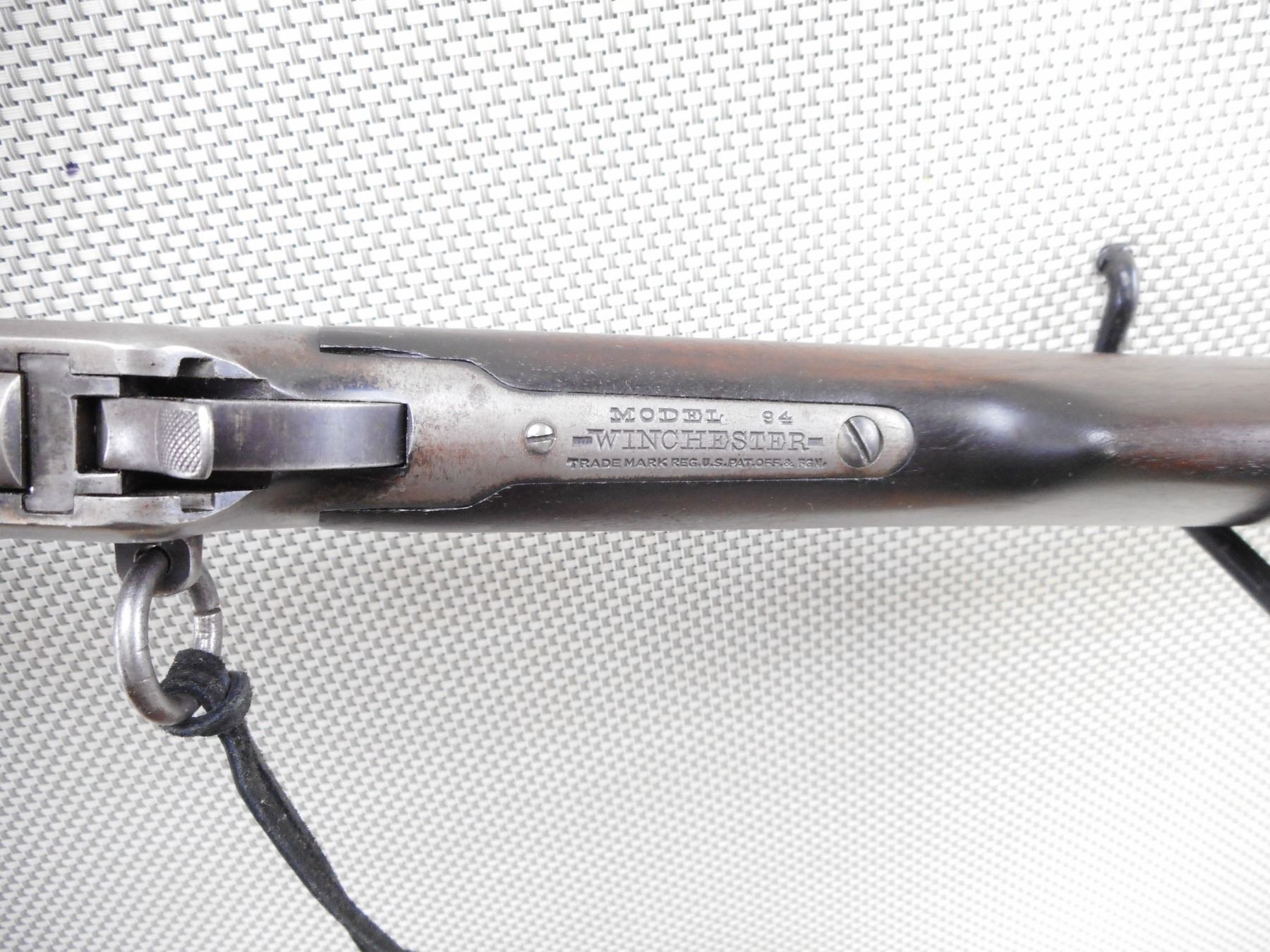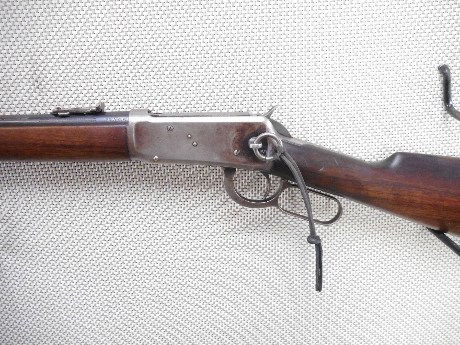 WINCHESTER , MODEL: 1894 SADDLE RING CARBINE , CALIBER: 30 WCF , MANUFACTURED IN 1897 ( ANTIQUE IN THE USA) GOOD BORE WITH SLIGHT PITTING. BLADE FRONT AND ADJUSTABLE REAR SIGHT. TWO PIECE HARDWOOD STOCK. SMALL CHIP OUT OF THE WRIST. SOME NOTCHES HAVE BEEN CARVED IN THE BUTT PLATE. SHOWS SOME HANDLING MARKS. ACTION: LEVER ACTION RIFLE , BARREL LENGTH: 20" , SERIAL # 904210 , CONDITION: 6/10 , CLASS: CANADIAN NON RESTRICTED CLASS