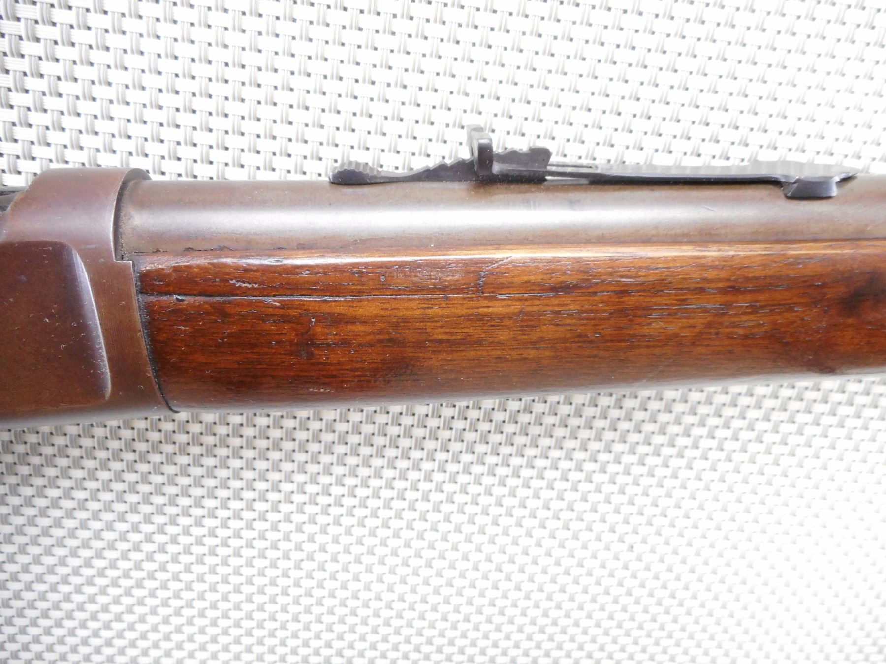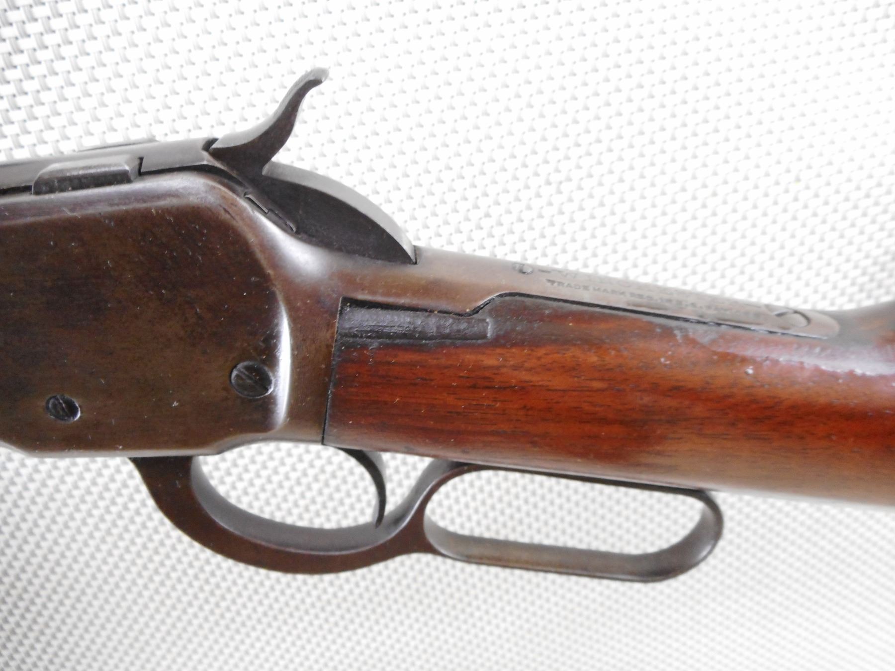 WINCHESTER , MODEL: 1892 , CALIBER: 44 WCF , BORE IS GOOD WITH SLIGHT WEAR. BLADE FRONT AND ADJUSTABLE REAR SIGHT. TWO PIECE HARDWOOD STOCK WITH CRACKED FOREND. CRACKED AT THE WRIST. SHORTENED BUTT STOCK WITH REPLACED RUBBER BUTT PAD. SHOWS EXTENSIVE HANDLING MARKS.ACTION: LEVER ACTION RIFLE , BARREL LENGTH: 24" , SERIAL # N/A , CONDITION: 4/10 , CLASS: CANADIAN NON RESTRICTED CLASS