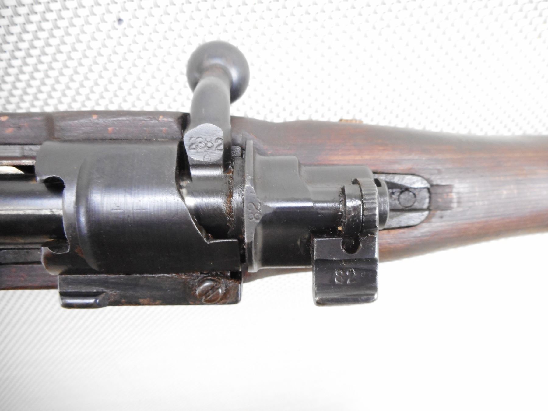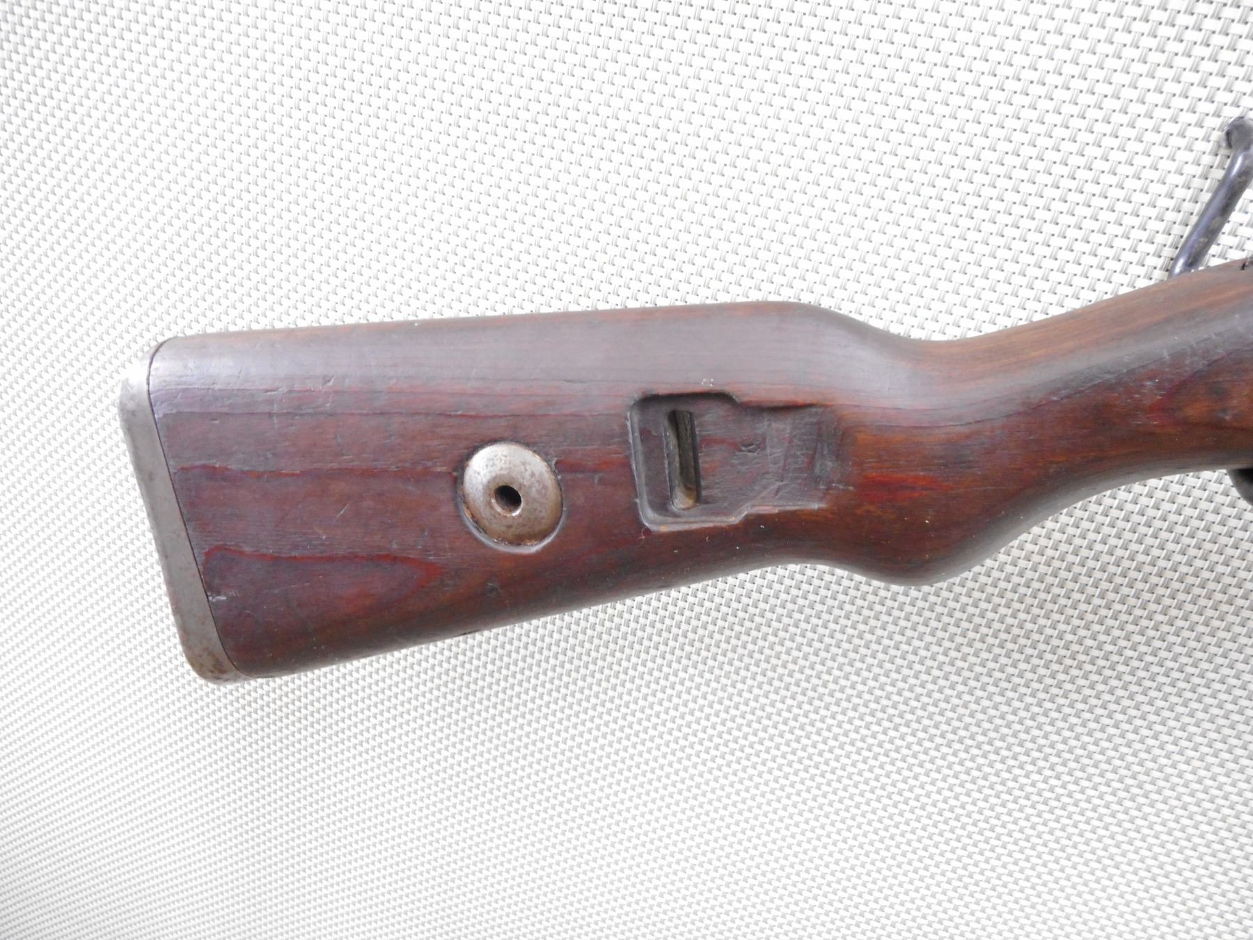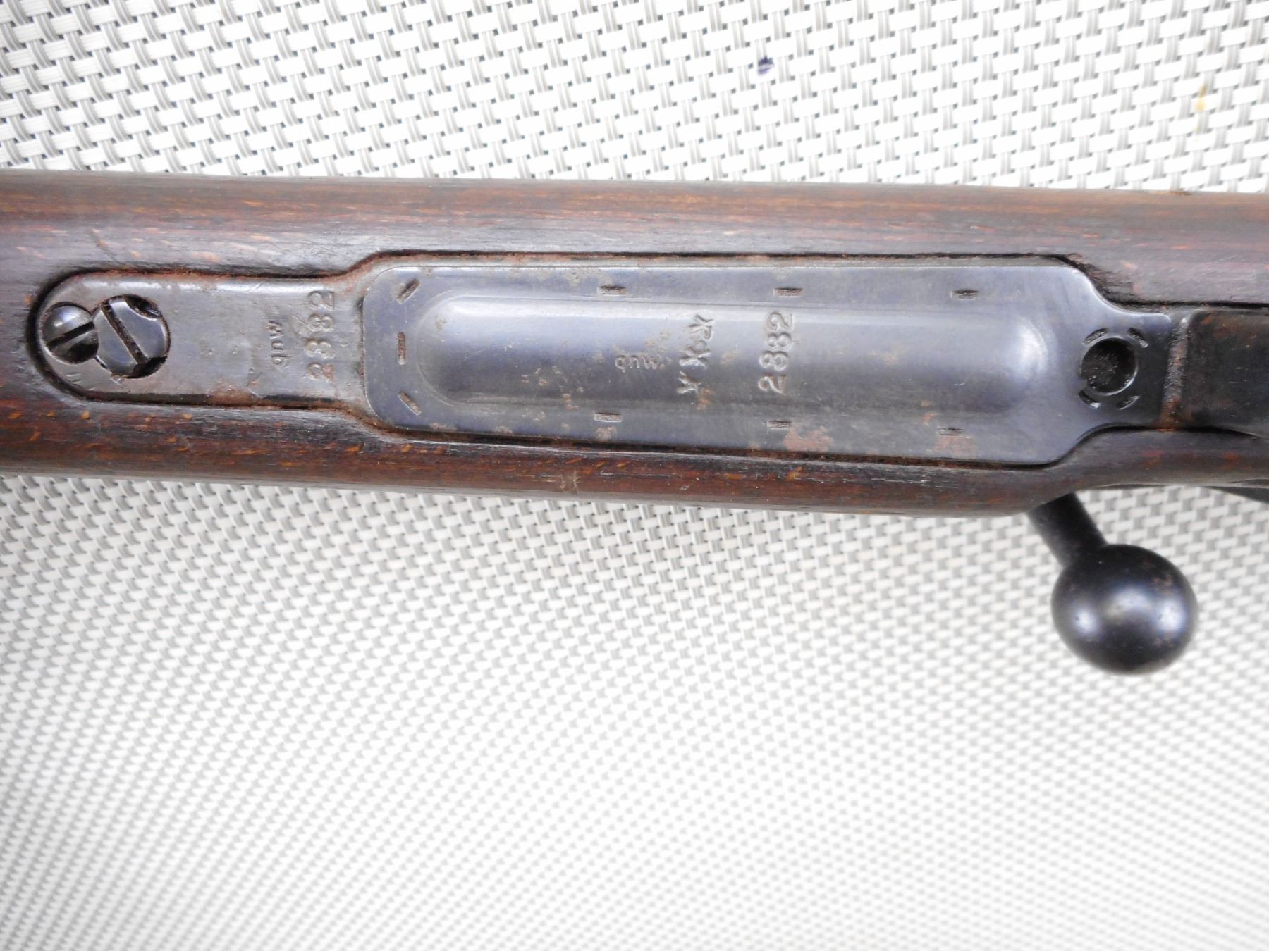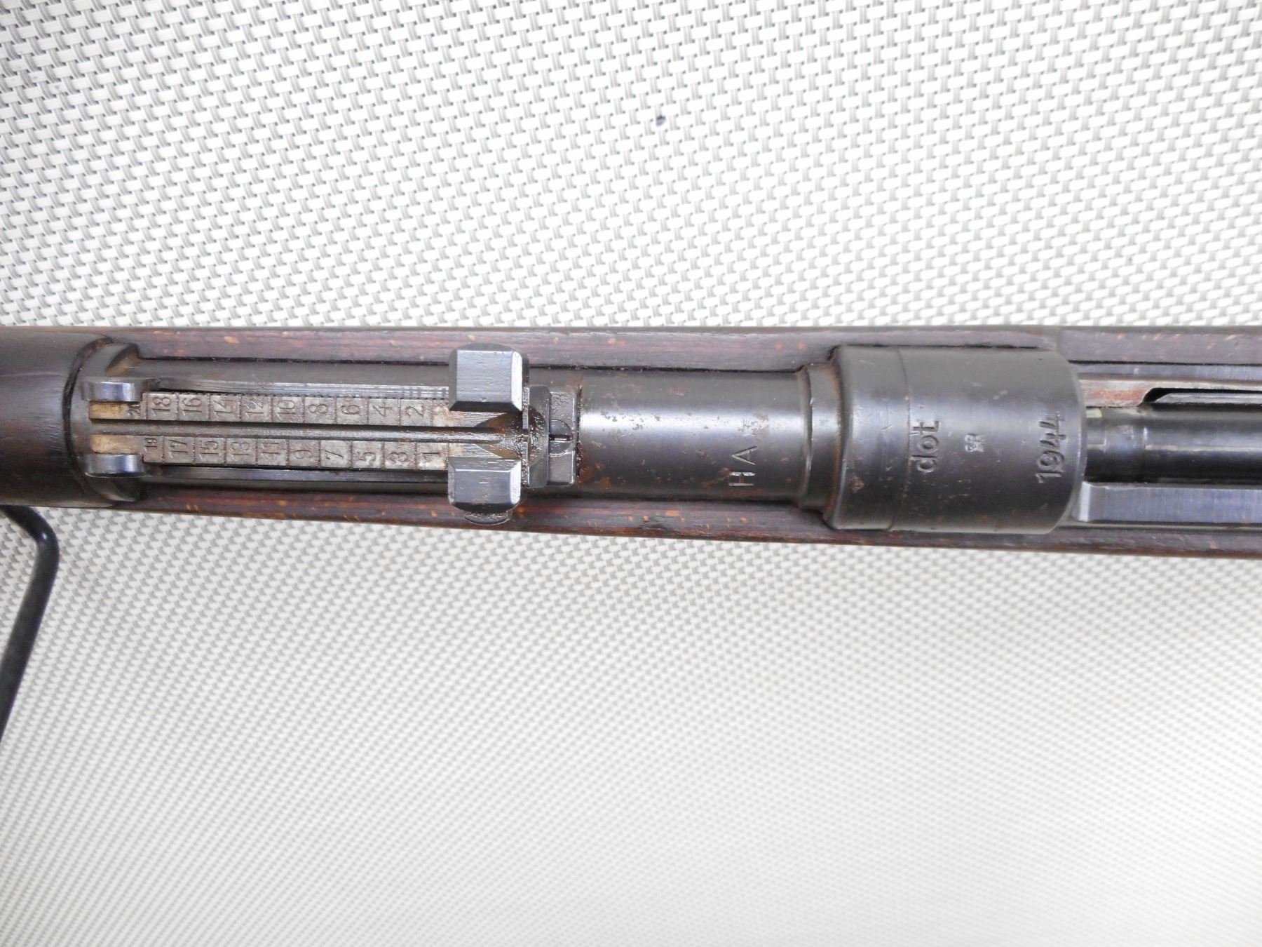 MAUSER , MODEL: K98 , CALIBER: 8 MM MAUSER , BORE IS DARK. BOLT AND RECEIVER MATCH BY SERIAL #. DATED 1944 WITH NUMEROUS GERMAN MILITARY MARKINGS. MADE BY WAFFENWEKE BRUNN. BLADE FRONT AND ADJUSTABLE REAR SIGHT.TWO PIECE HARDWOOD STOCK WITH RUSTY STEEL BUTT PLATE. SOME LIGHT SURFACE RUST ON MOST METAL PARTS AND SOME HANDLING MARKS. ACTION: BOLT ACTION RIFLE , BARREL LENGTH: 23 1/2" , SERIAL # 2382 , CONDITION: 6/10 , CLASS: CANADIAN NON RESTRICTED CLASS