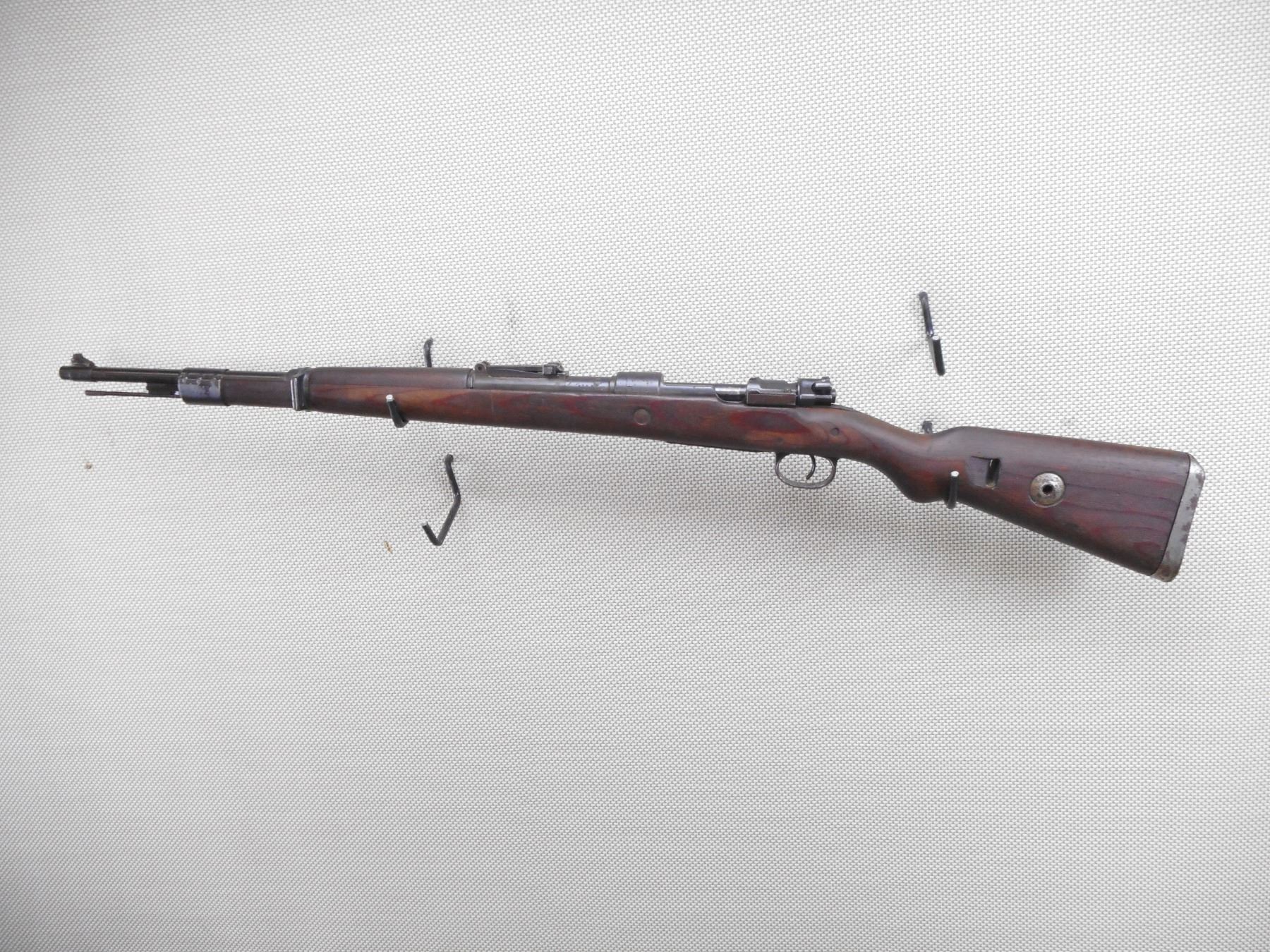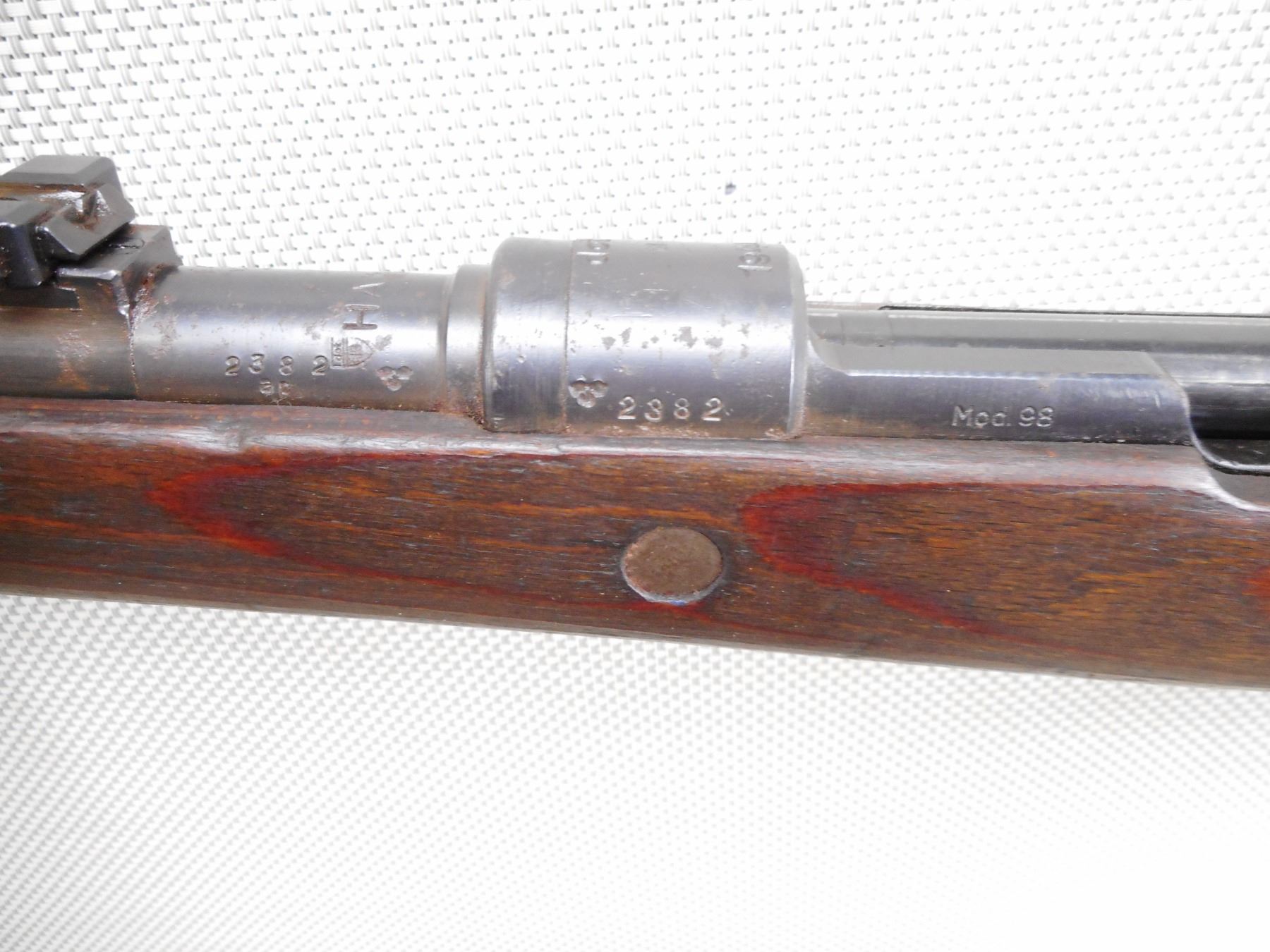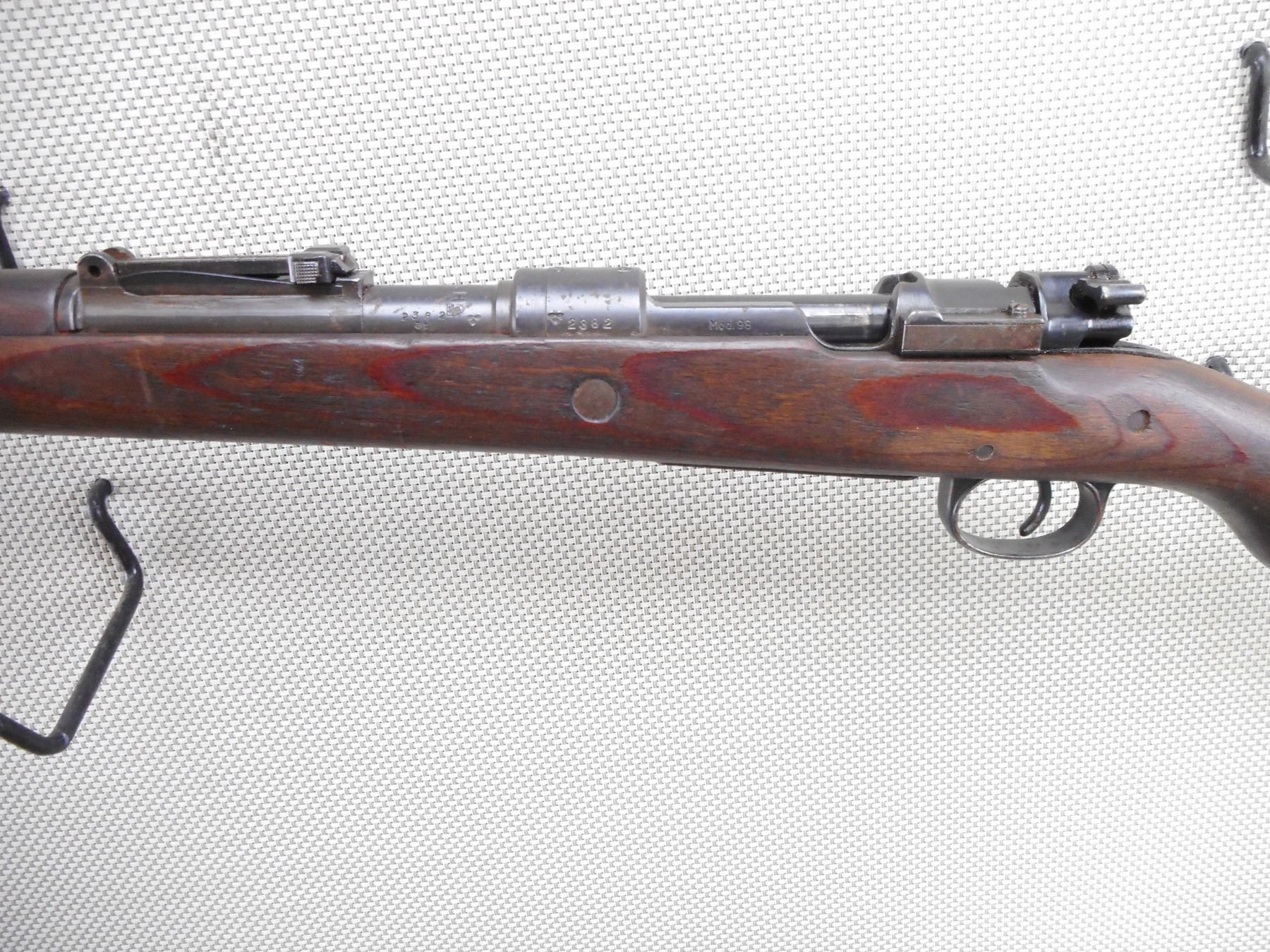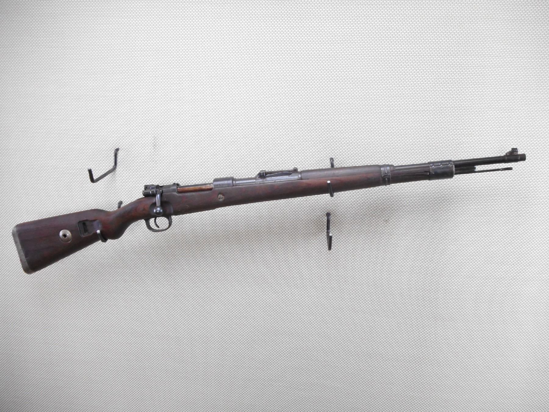 MAUSER , MODEL: K98 , CALIBER: 8 MM MAUSER , BORE IS DARK. BOLT AND RECEIVER MATCH BY SERIAL #. DATED 1944 WITH NUMEROUS GERMAN MILITARY MARKINGS. MADE BY WAFFENWEKE BRUNN. BLADE FRONT AND ADJUSTABLE REAR SIGHT.TWO PIECE HARDWOOD STOCK WITH RUSTY STEEL BUTT PLATE. SOME LIGHT SURFACE RUST ON MOST METAL PARTS AND SOME HANDLING MARKS. ACTION: BOLT ACTION RIFLE , BARREL LENGTH: 23 1/2" , SERIAL # 2382 , CONDITION: 6/10 , CLASS: CANADIAN NON RESTRICTED CLASS