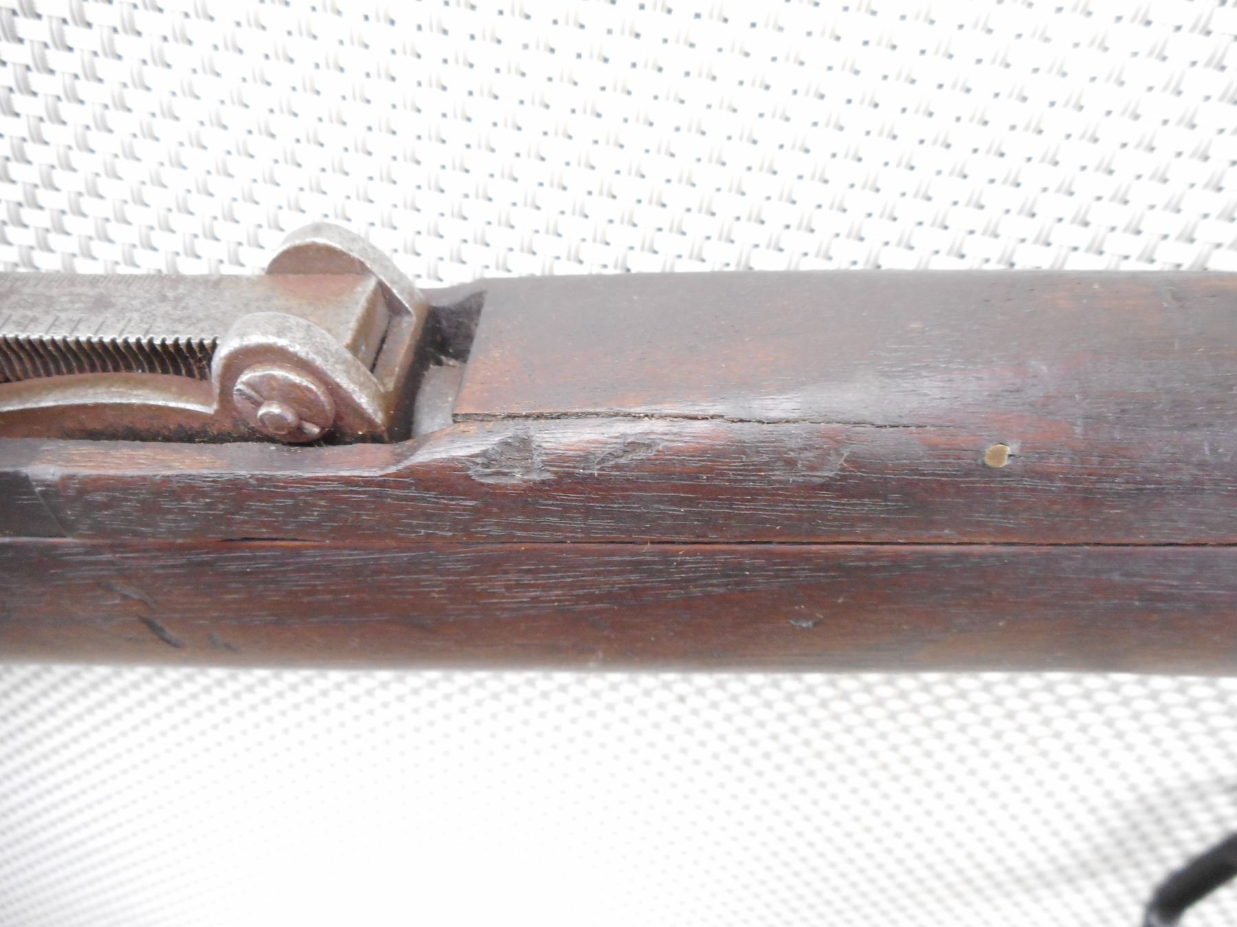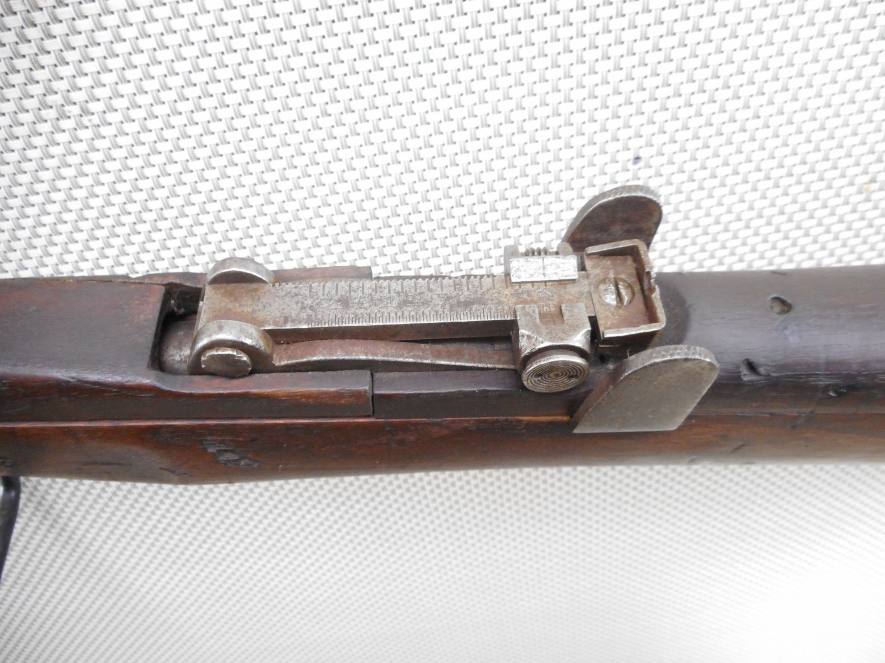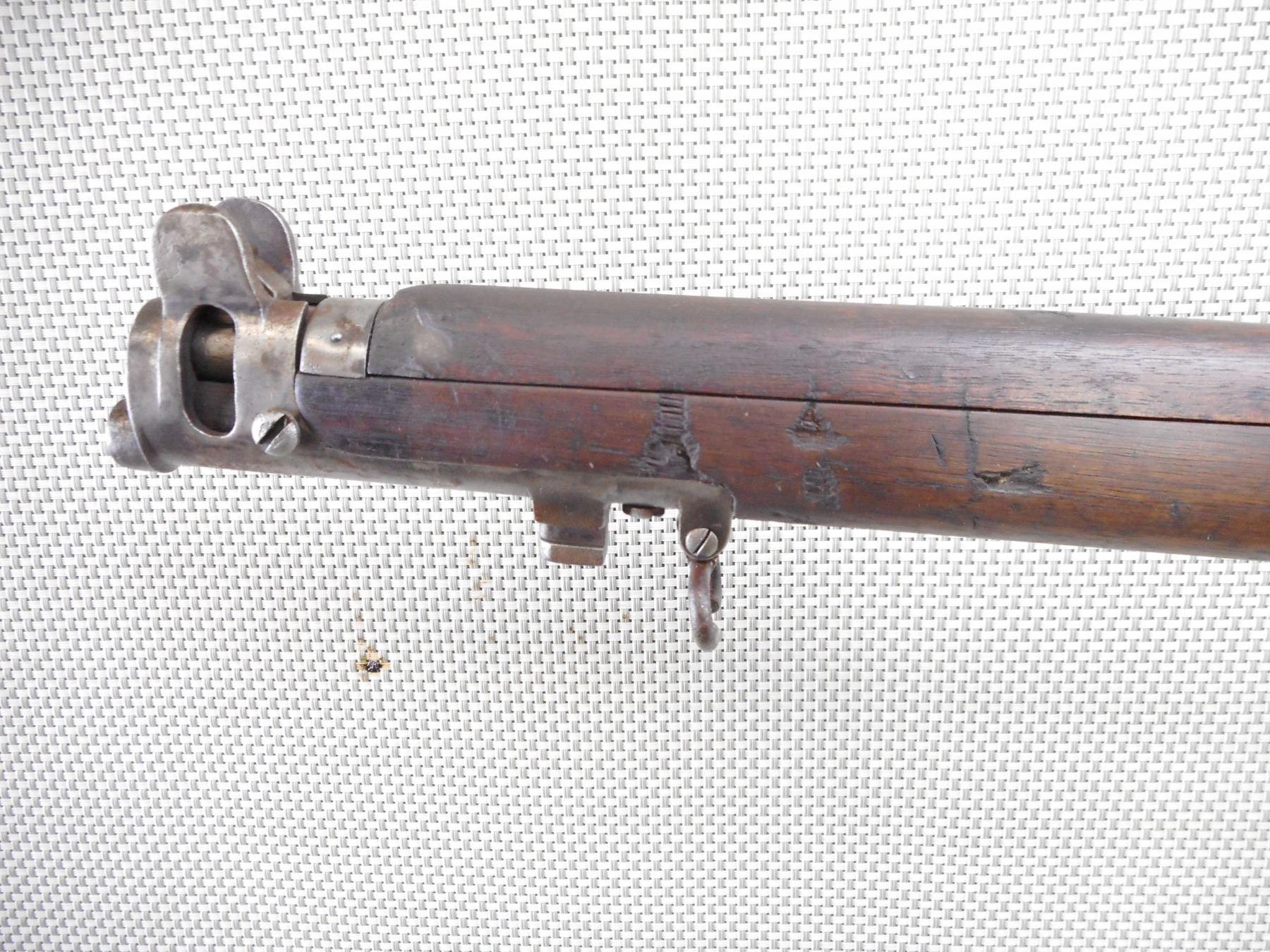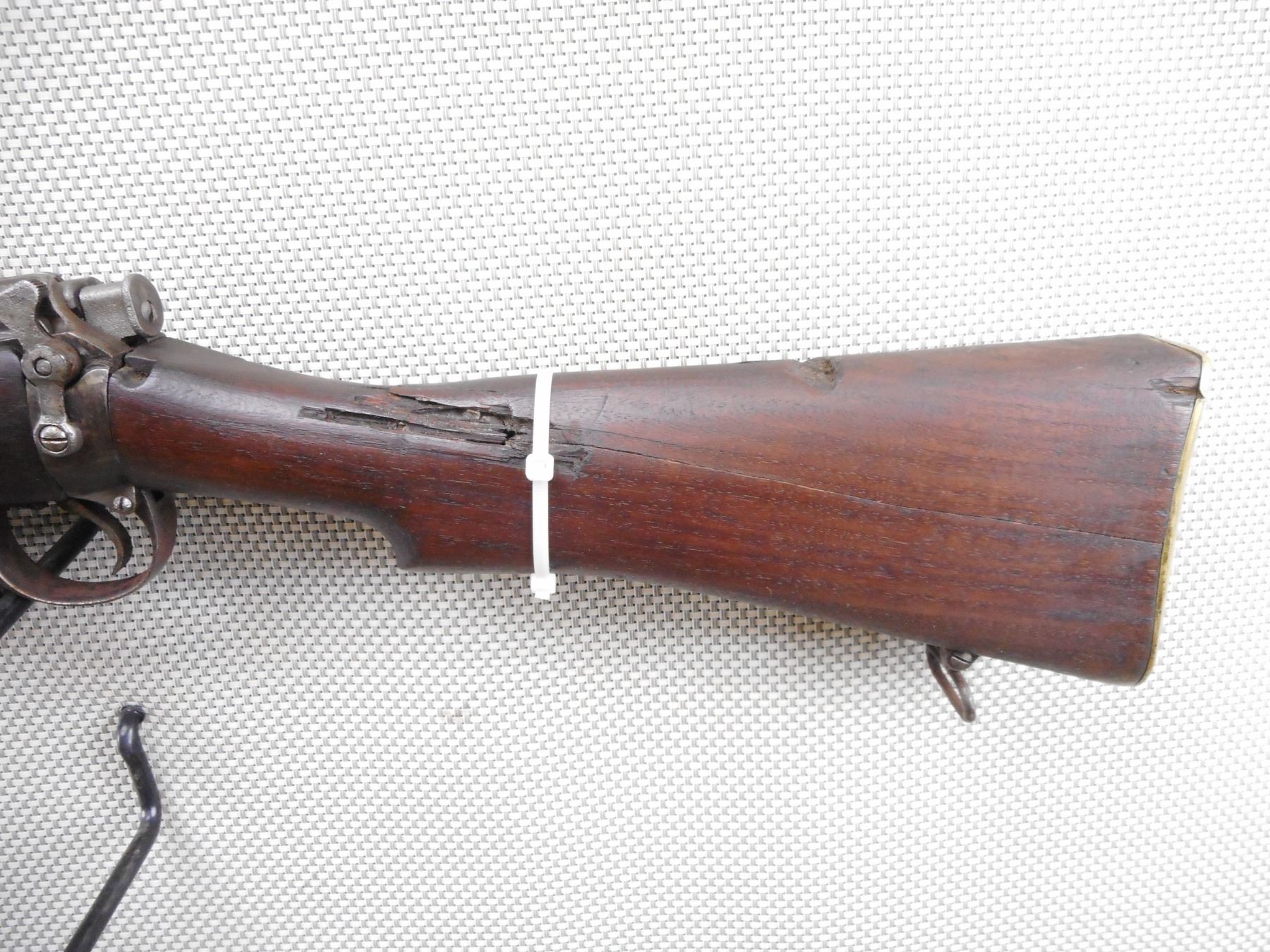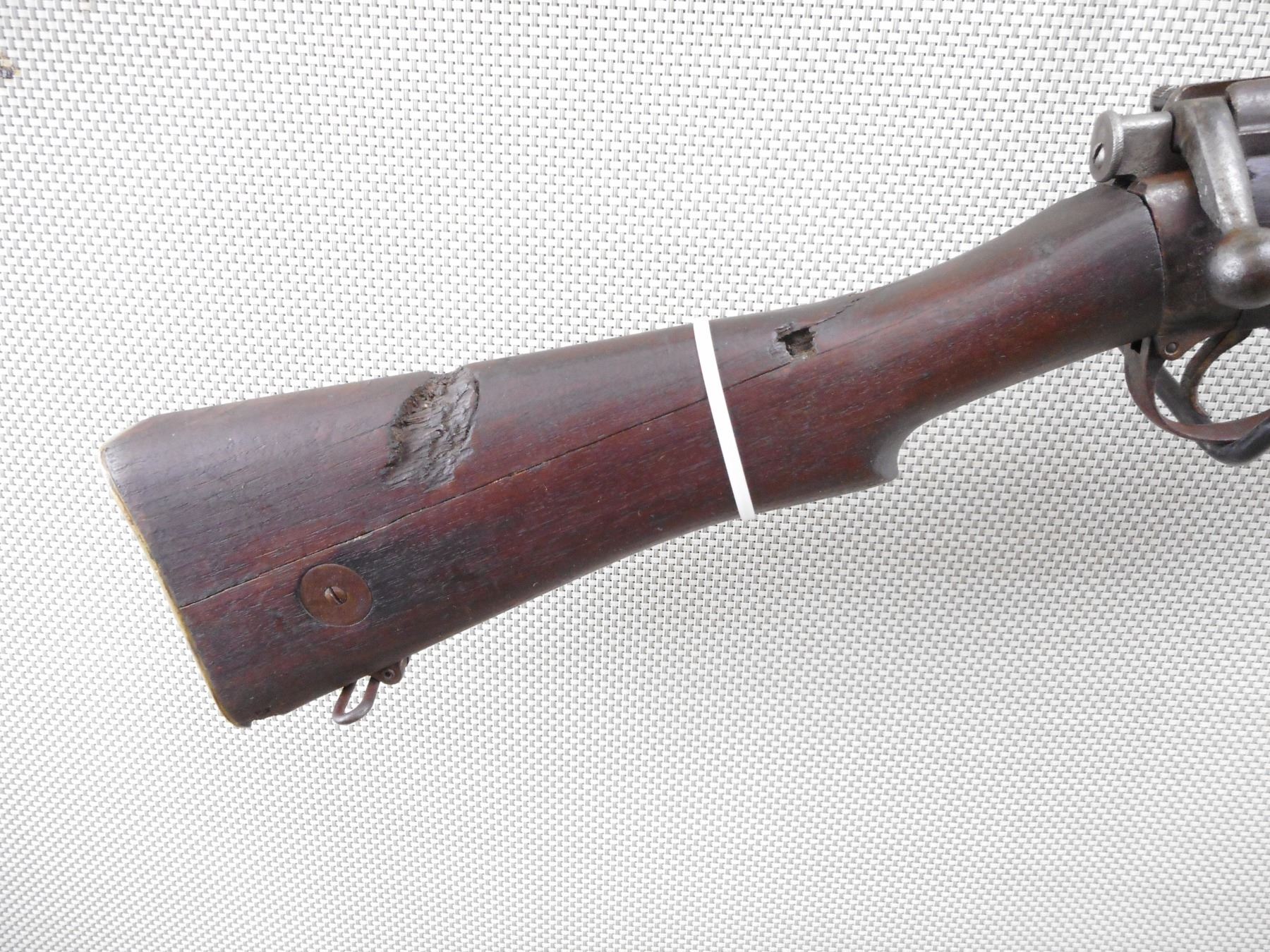 WWI ERA, LEE ENFIELD , MODEL: NO. 1 MK III* , CALIBER: 303 BR , COMES WITH MAGAZINE. BORE IS POOR DARK AND PITTED. MANUFACTURED BY LSA COMPANY 1916. NUMEROUS MILITARY MARKS INCLUDING THE BRD ARROW. NOSE CAP IS MISMATCHED BY SERIAL # ALL OTHER VISIBLE PARTS ARE MATCHING. BLADE FRONT SIGHT WITH PROTECTIVE EARS. ADJUSTABLE U NOTCH REAR SIGHT. FULL MILITARY STOCKS. MISSING MIDDLE SWIVEL. METAL PARTS HAVE NO REMAINING FINISH. HAS LIGHT PITTING OVERALL. TOP WOOD IS CRACKED. FORESTOCK SHOWS SOME DINGS AND CHIPS. BRASS BUTT PLATE. BUTT STOCK IS DAMAGED AT THE TOE. HAS ONE LARGE CHIP/GOUGE. APPEARS TO HAVE A BULLET HOLE CAUSING EXTENSIVE CHIPPING AND CRACK THROUGH ENTIRE BUTT STOCK, BUTT STOCK IS BEING HELD TOGETHER WITH A ZIP TIE. HAS BRASS DISK IN THE BUTT STOCK. SHOWS NUMEROUS HANDLING MARKS AND WEAR. ACTION: BOLT ACTION RIFLE , BARREL LENGTH: 25" , SERIAL # N35853 , CONDITION: 3/10 , CLASS: CANADIAN NON RESTRICTED CLASS