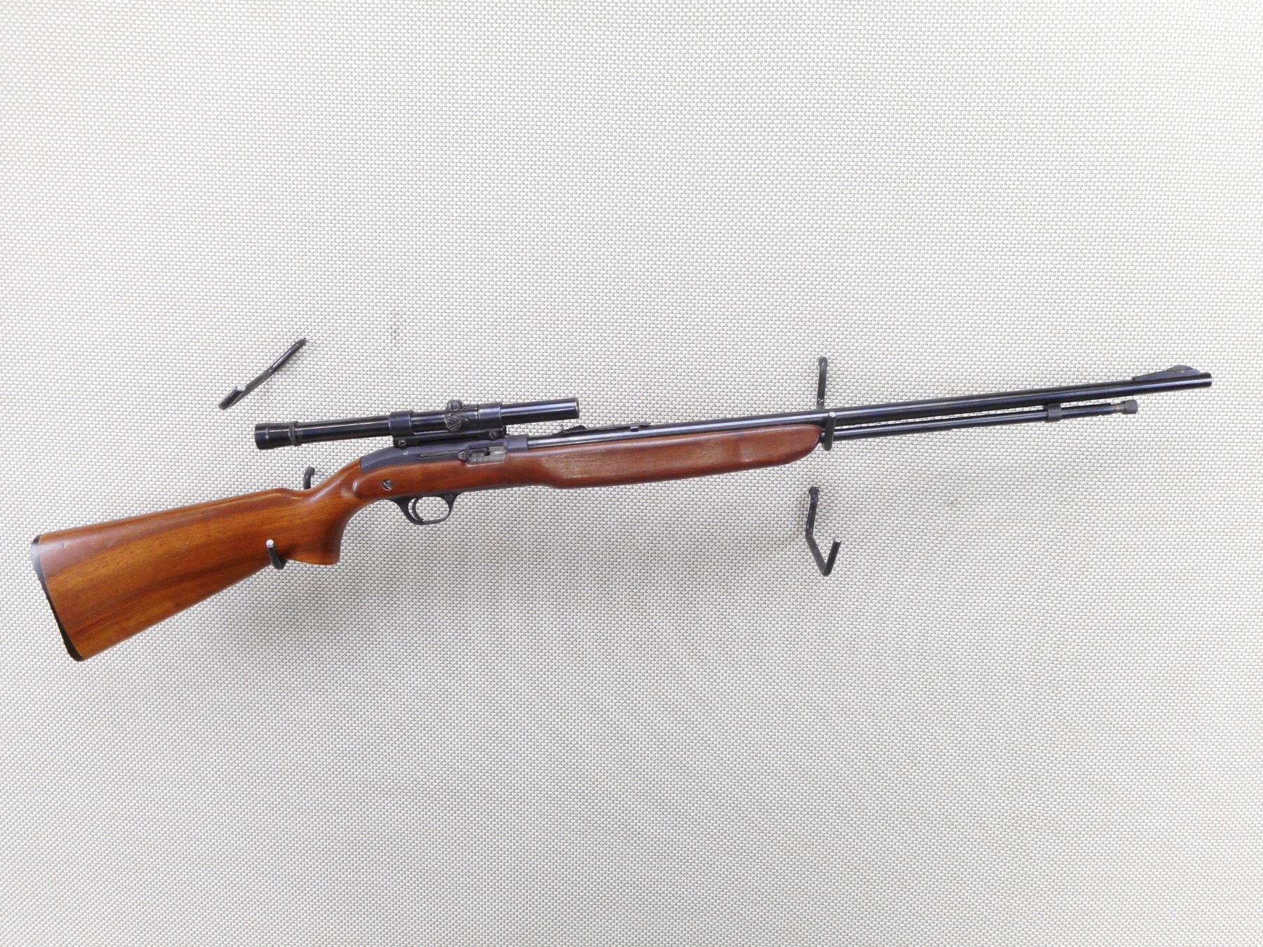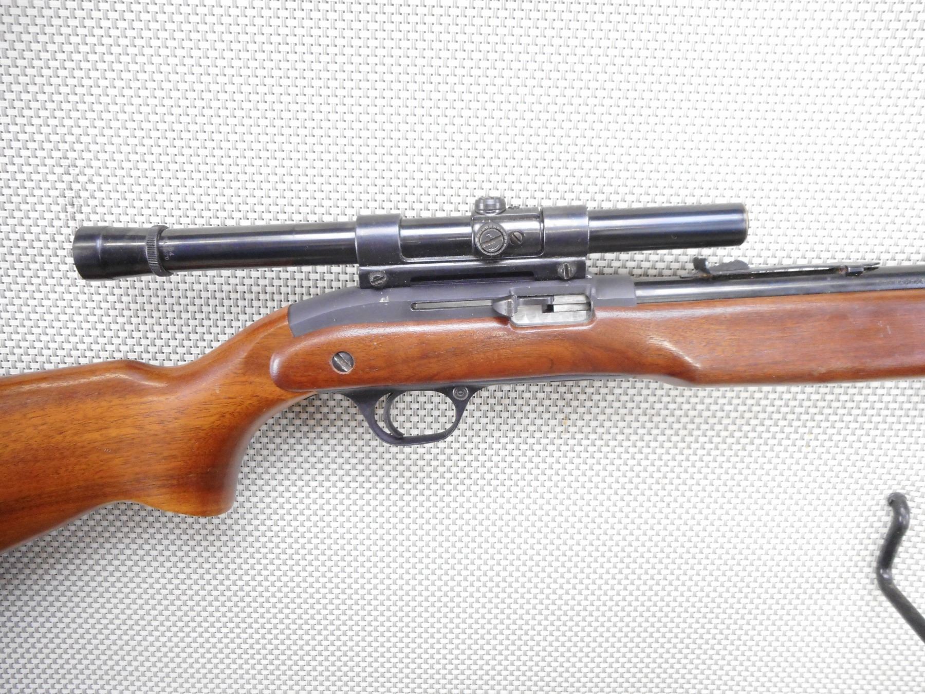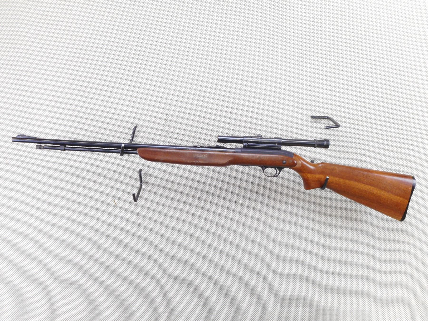 J.C. HIGGINS , MODEL: 29 , CALIBER: 22 LR , VERY GOOD BORE. RAMP FRONT AND ADJUSTABLE REAR SIGHT. WEAVER B4 SCOPE. ONE PIECE HARDWOOD STOCK WITH PLASTIC BUTT PLATE. SHOWS SOME HANDLING MARKS. ACTION: SEMI-AUTOMATIC RIFLE , BARREL LENGTH: 24" , SERIAL # N/A , CONDITION: 7/10 , CLASS: CANADIAN NON RESTRICTED CLASS