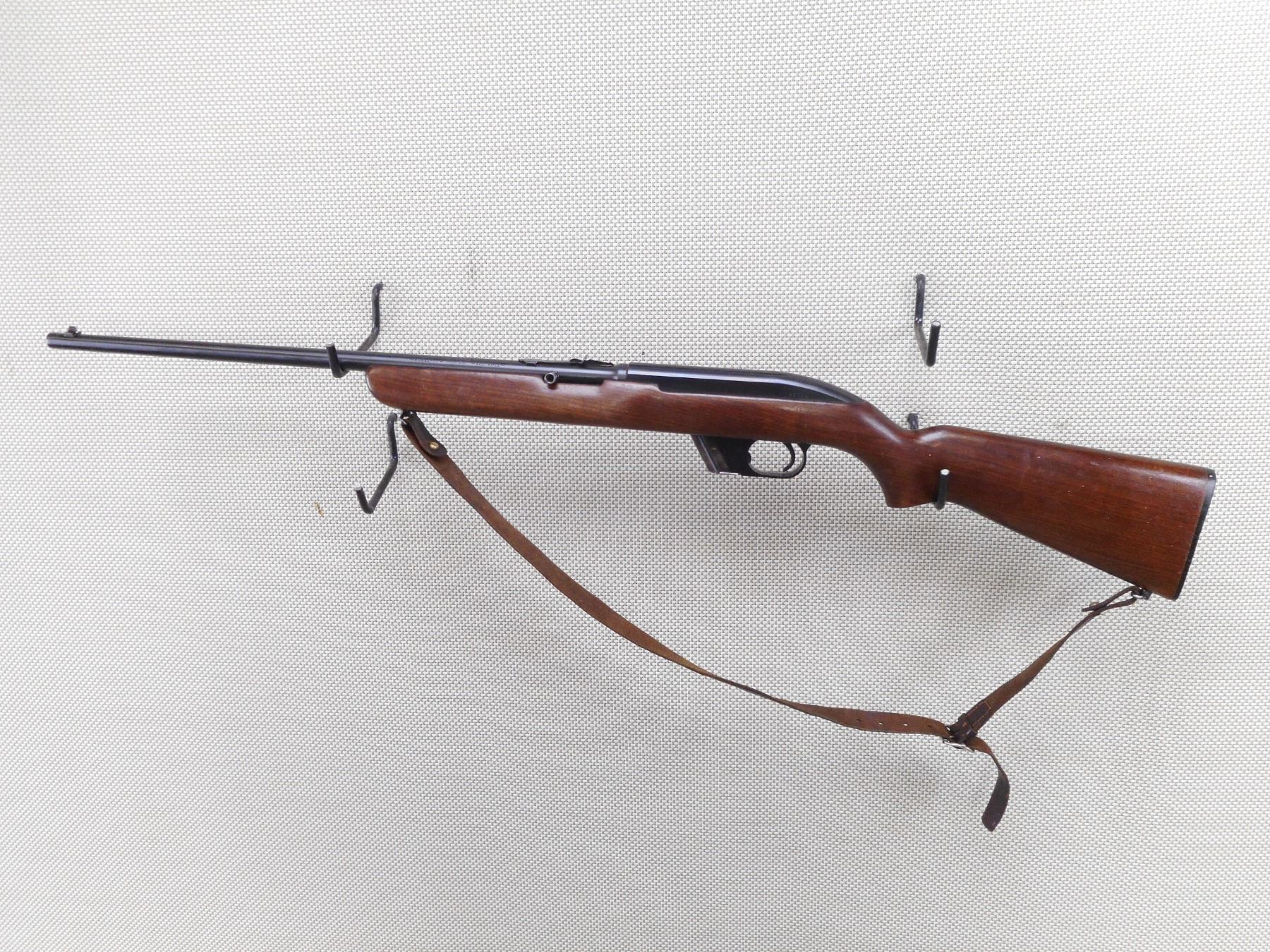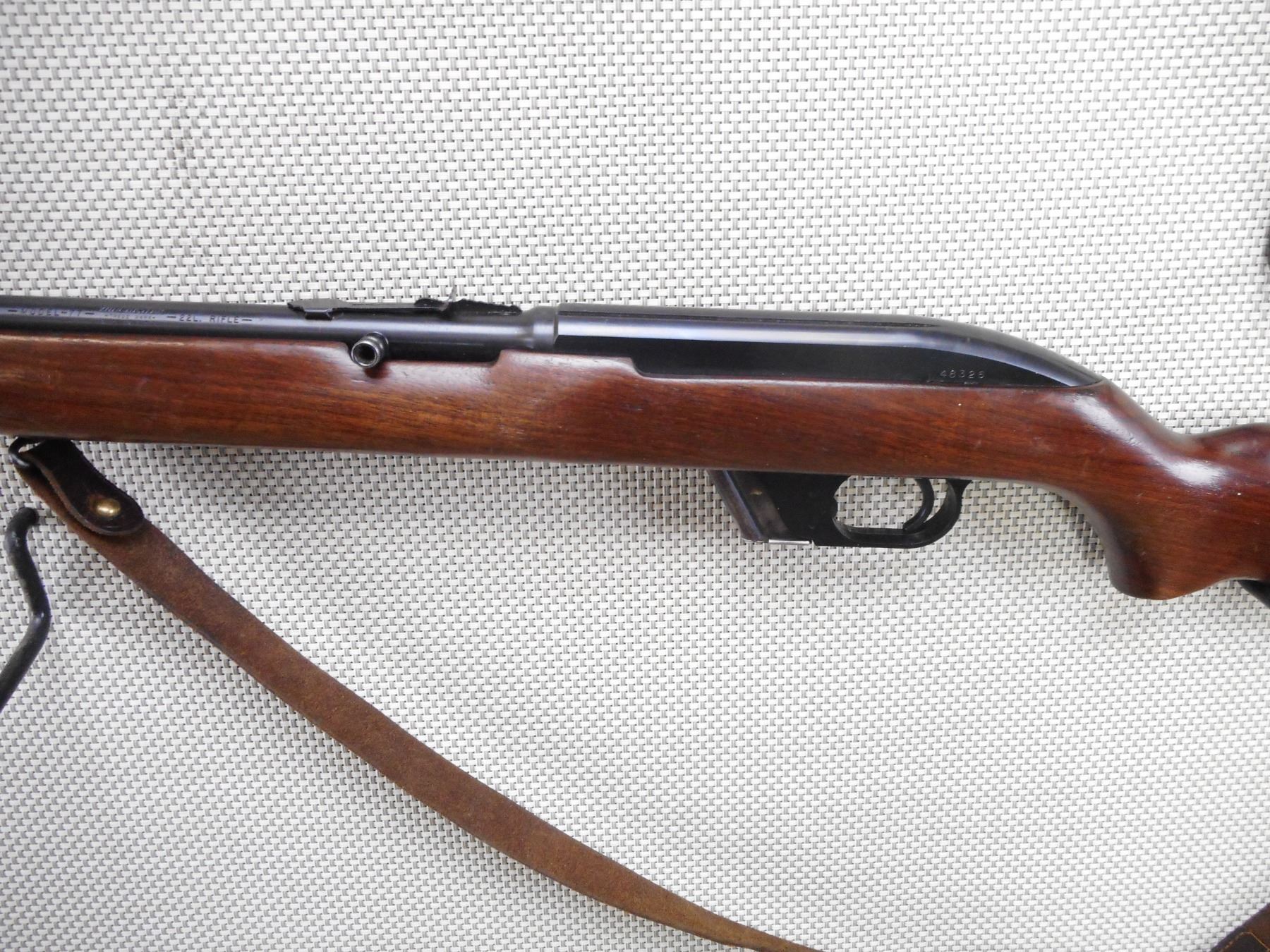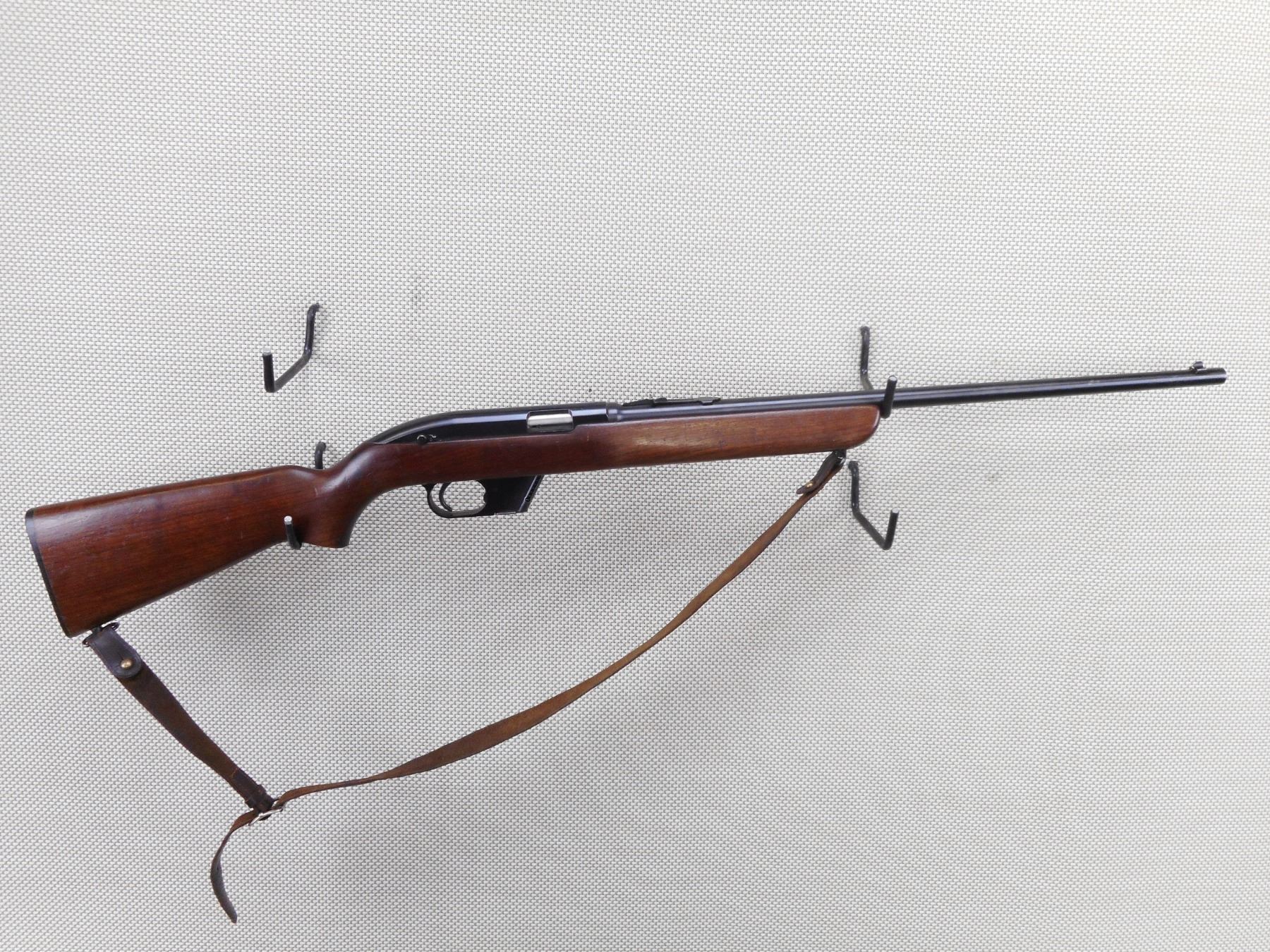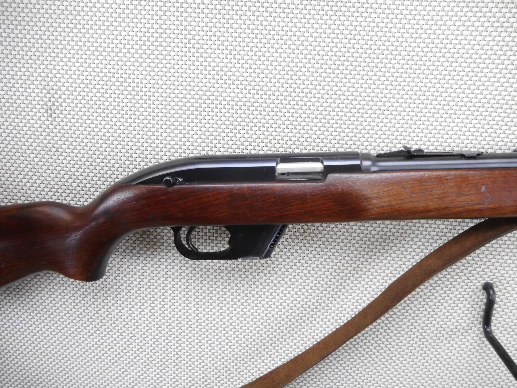 WINCHESTER , MODEL: 77 , CALIBER: 22 LR , COMES WITH MAGAZINE. BORE IS GOOD. BLADE FRONT AND ADJUSTABLE REAR SIGHT. ONE PIECE HARDWOOD STOCK WITH PLASTIC BUTT PLATE. LEATHER SLING. SHOWS VERY LITTLE HANDLING MARKS. ACTION: SEMI-AUTOMATIC RIFLE , BARREL LENGTH: 22" , SERIAL # 48326 , CONDITION: 8/10 , CLASS: CANADIAN NON RESTRICTED CLASS