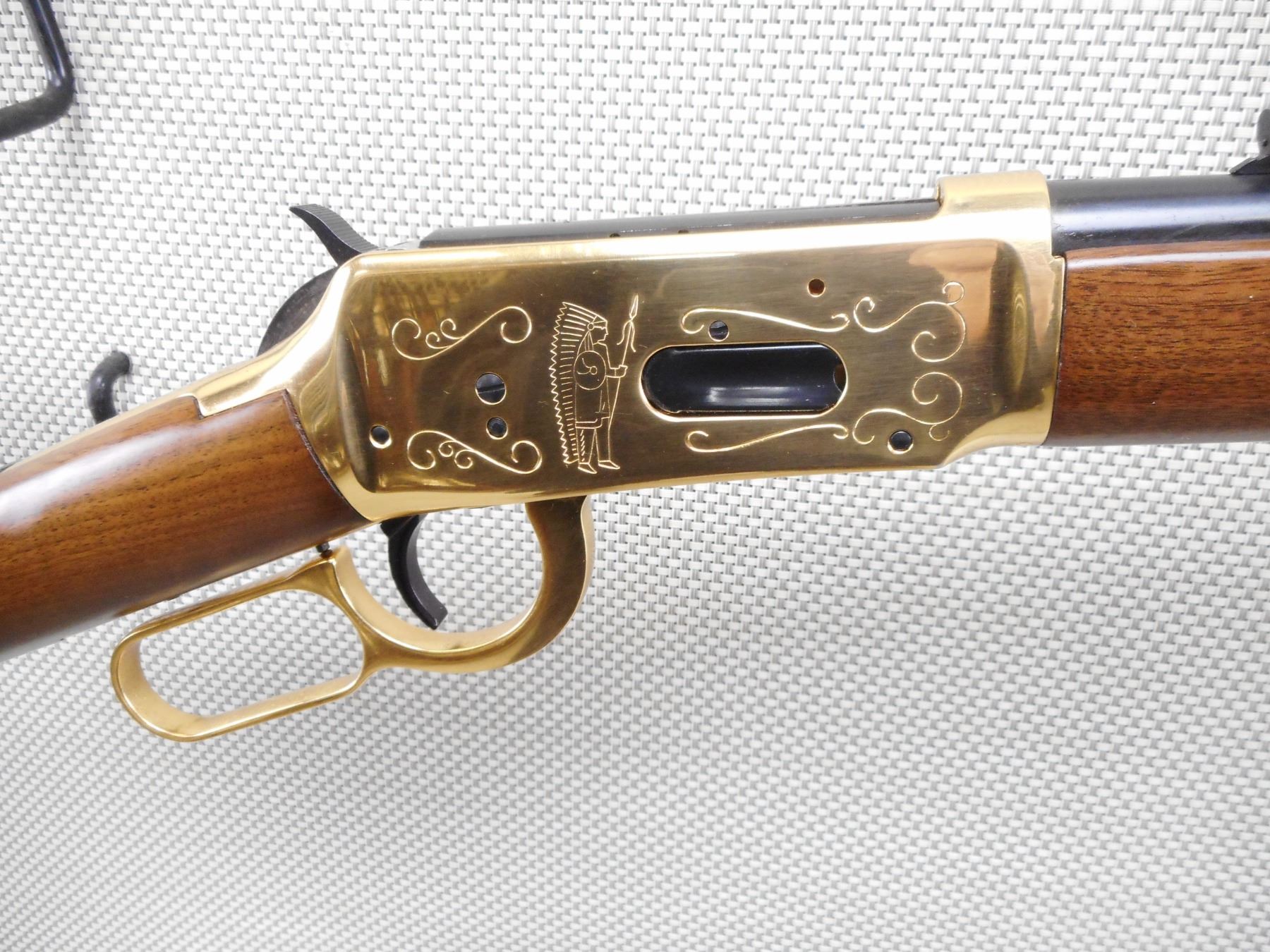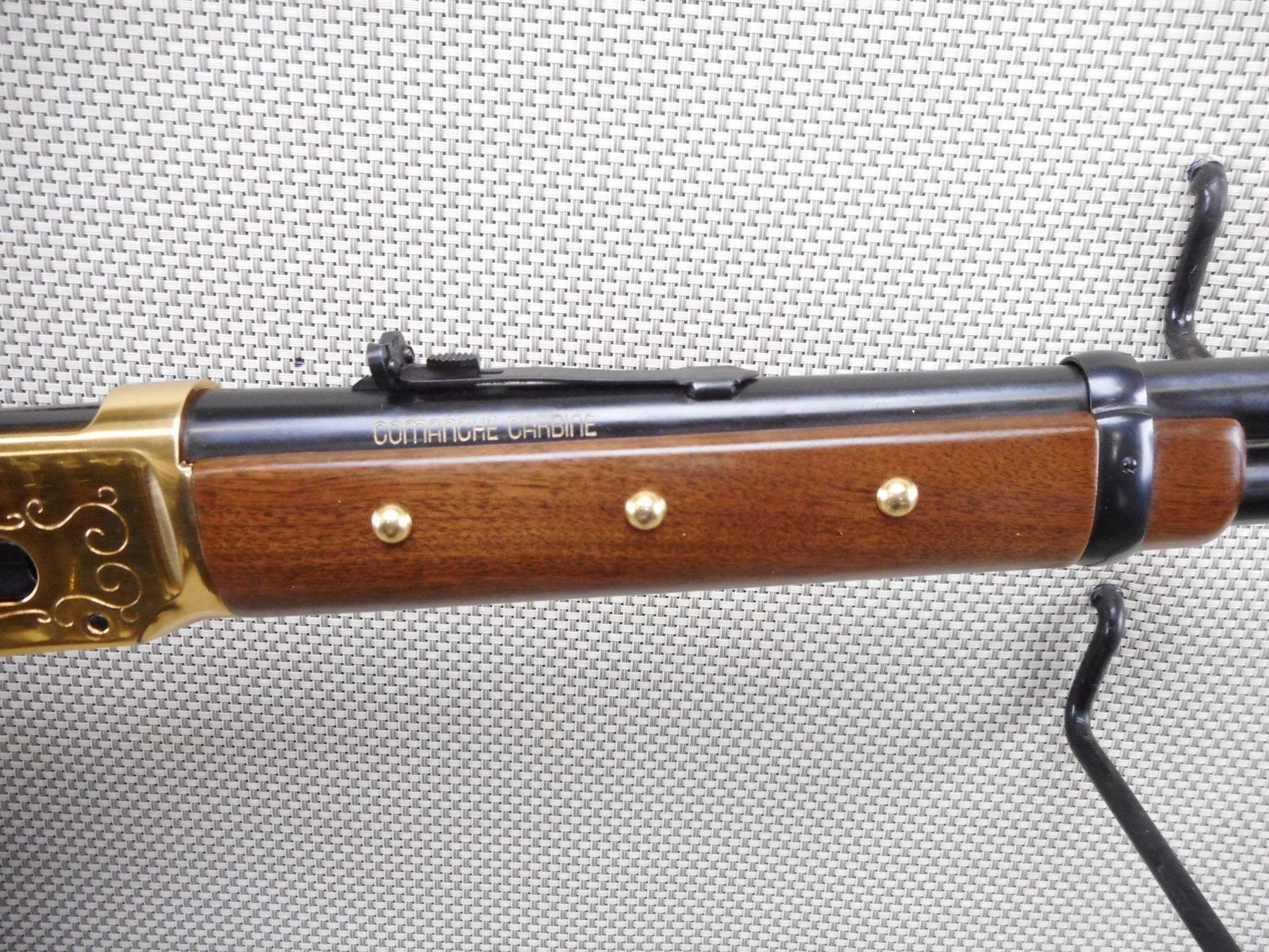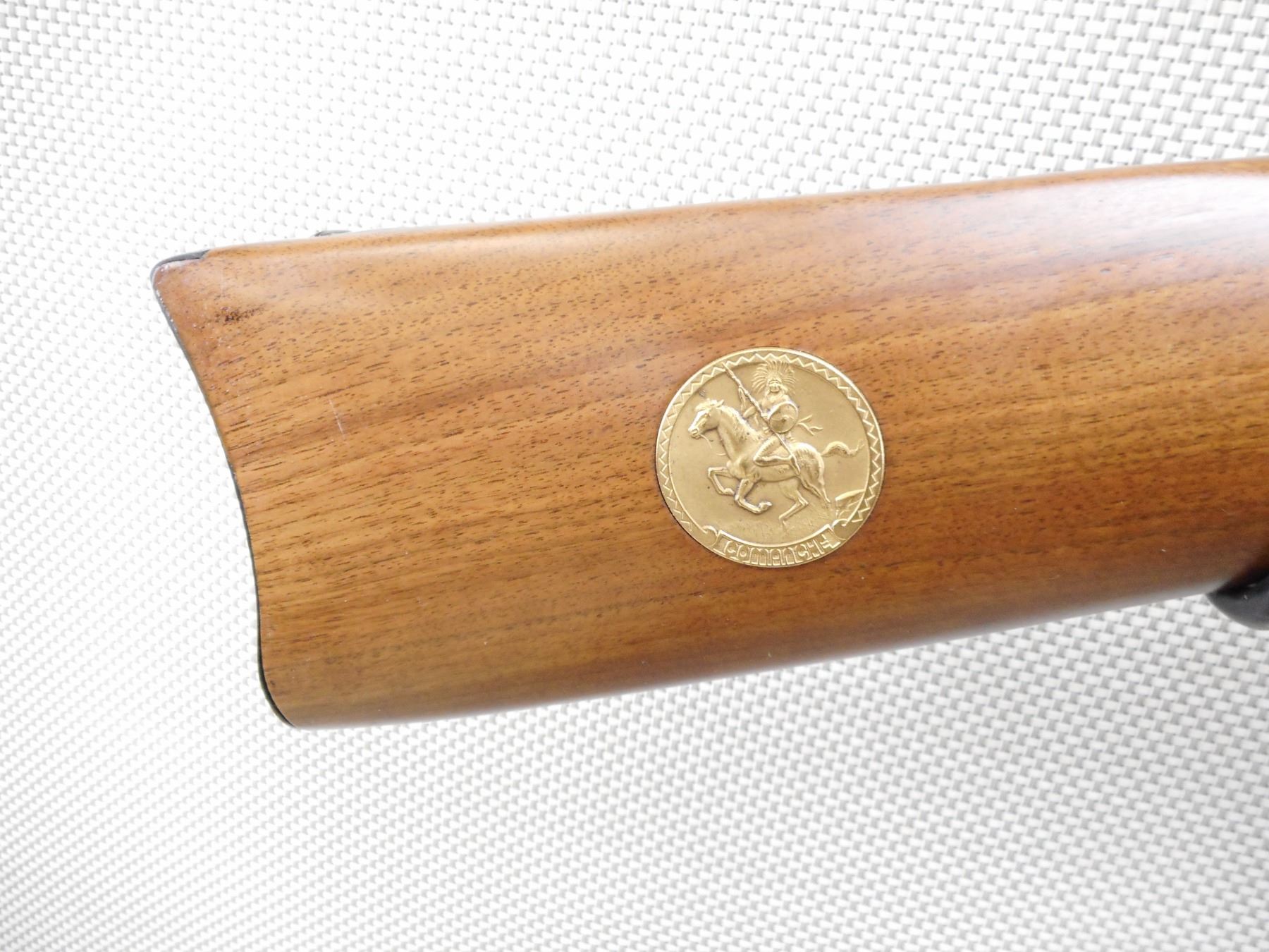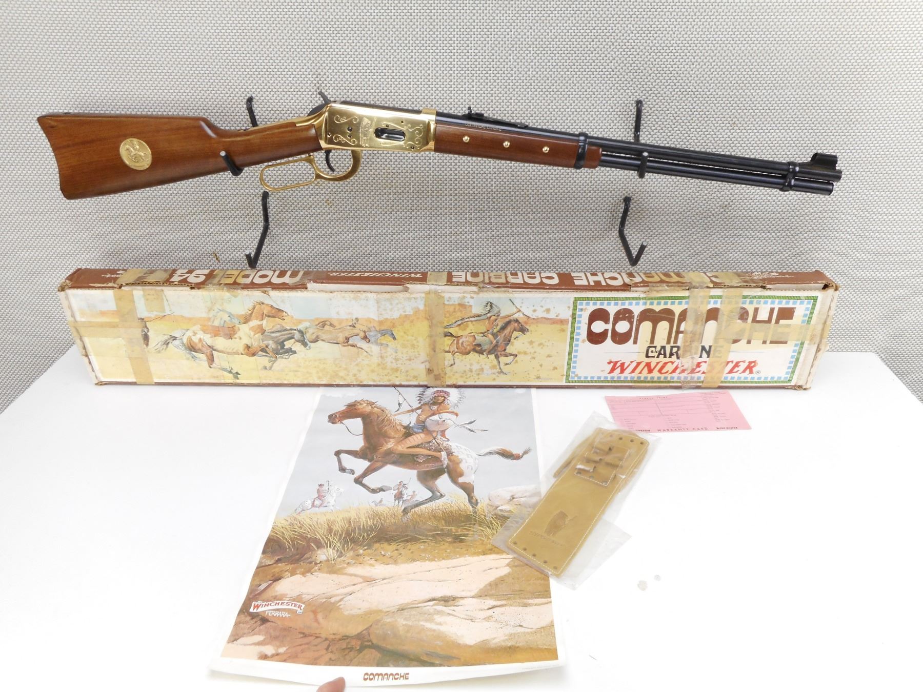 WINCHESTER , MODEL: COMANCHE CARBINE COMMEMORATIVE , CALIBER: 30-30 WIN , COMES WITH BOX (DAMAGED), POSTER, LEATHER CARTRIDGE HOLDER. BORE IS EXCELLENT. THERE IS MINOR RUST AND PITTING AT THE MUZZLE. HOODED FRONT AND ADUSTABLE REAR SIGHT. ENGRAVED GOLD RECEIVER. TWO PIECE HARDWOOD STOCK WITH 6 THUMB TACKS IN THE FOREND AND BRASS COMMEMORATIVE DISK IN THE BUTT. SHOWS VIRTUALLY NO HANDLING MARKS. ACTION: LEVER ACTION RIFLE , BARREL LENGTH: 20" , SERIAL # CC6630 , CONDITION: 9/10 , CLASS: CANADIAN NON RESTRICTED CLASS