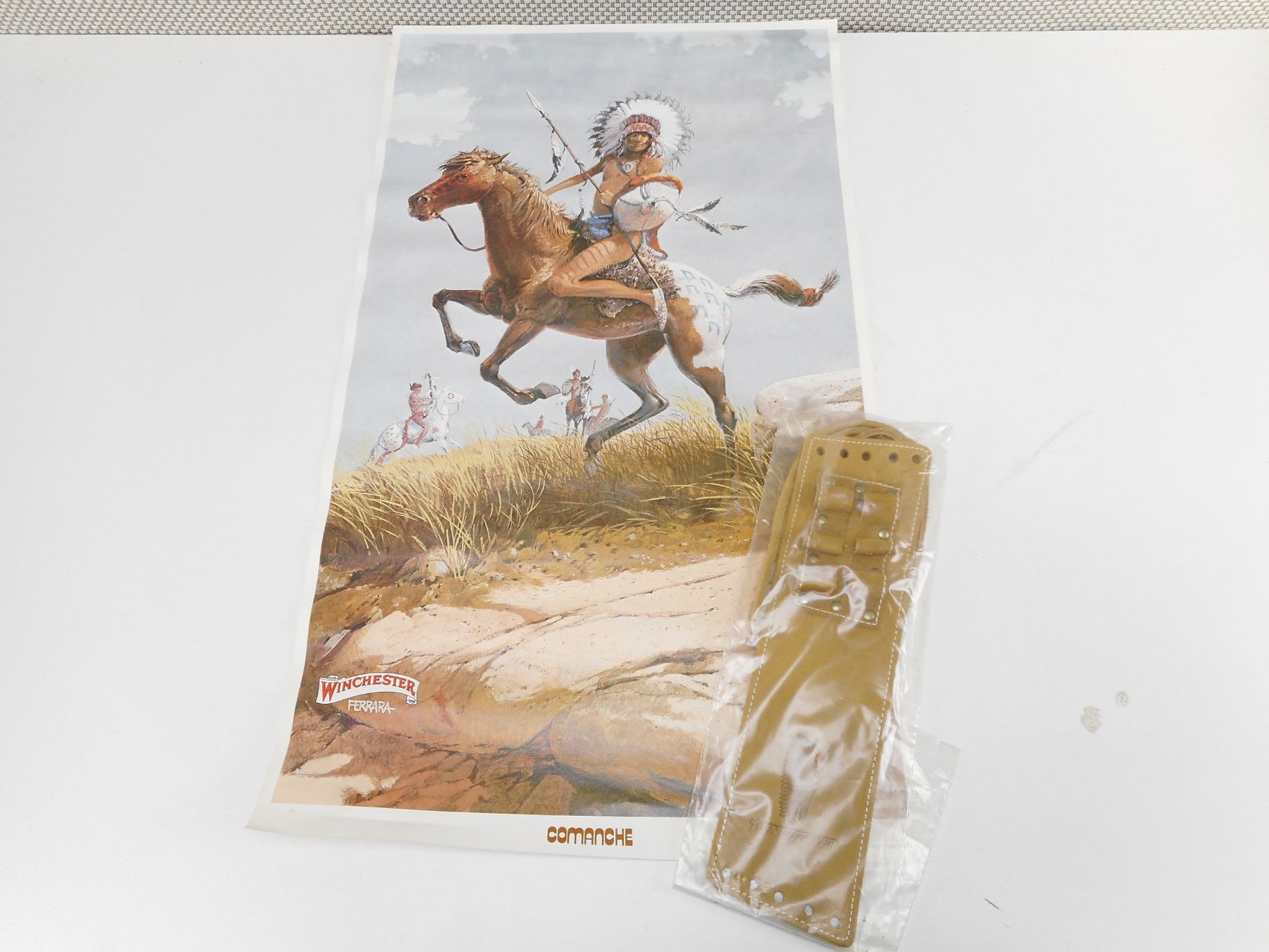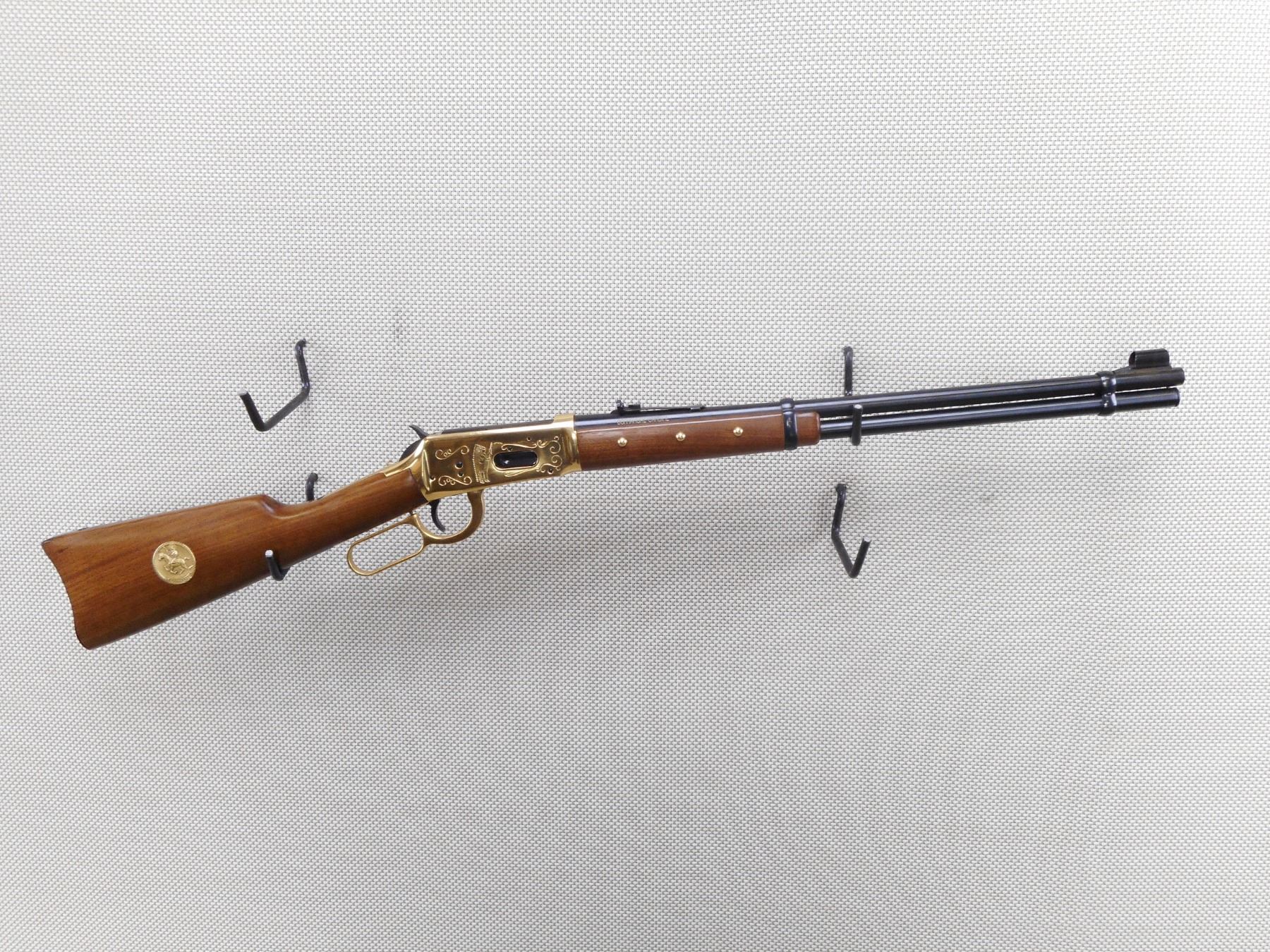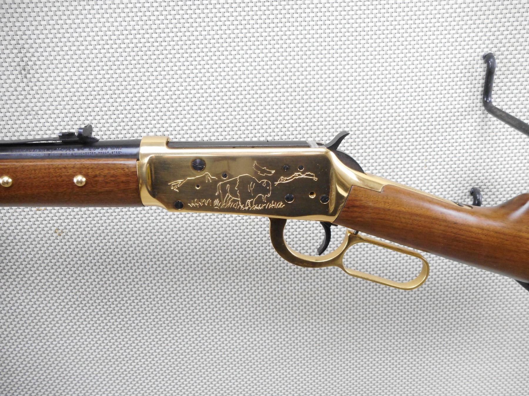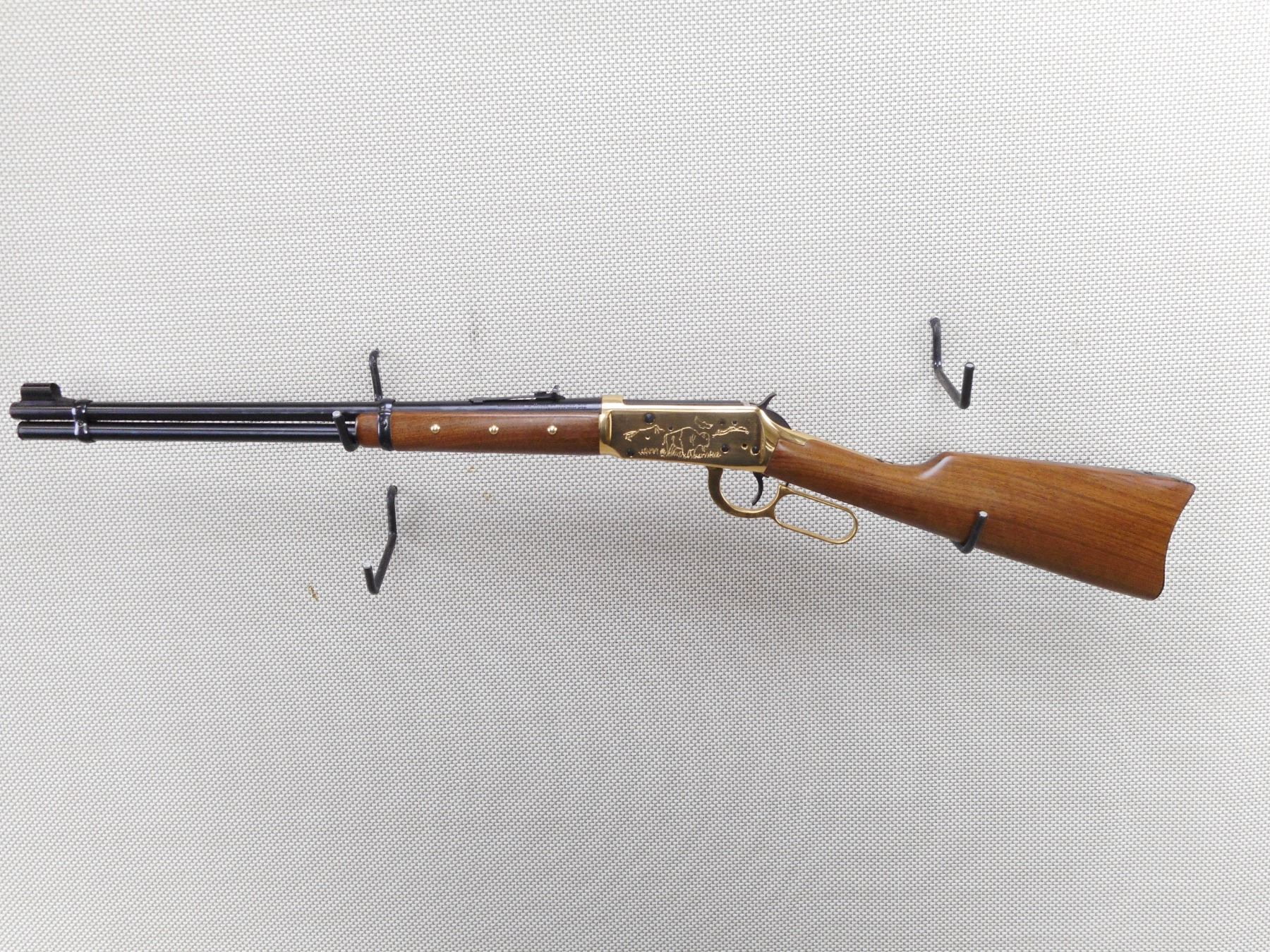 WINCHESTER , MODEL: COMANCHE CARBINE COMMEMORATIVE , CALIBER: 30-30 WIN , COMES WITH BOX (DAMAGED), POSTER, LEATHER CARTRIDGE HOLDER. BORE IS EXCELLENT. THERE IS MINOR RUST AND PITTING AT THE MUZZLE. HOODED FRONT AND ADUSTABLE REAR SIGHT. ENGRAVED GOLD RECEIVER. TWO PIECE HARDWOOD STOCK WITH 6 THUMB TACKS IN THE FOREND AND BRASS COMMEMORATIVE DISK IN THE BUTT. SHOWS VIRTUALLY NO HANDLING MARKS. ACTION: LEVER ACTION RIFLE , BARREL LENGTH: 20" , SERIAL # CC6630 , CONDITION: 9/10 , CLASS: CANADIAN NON RESTRICTED CLASS