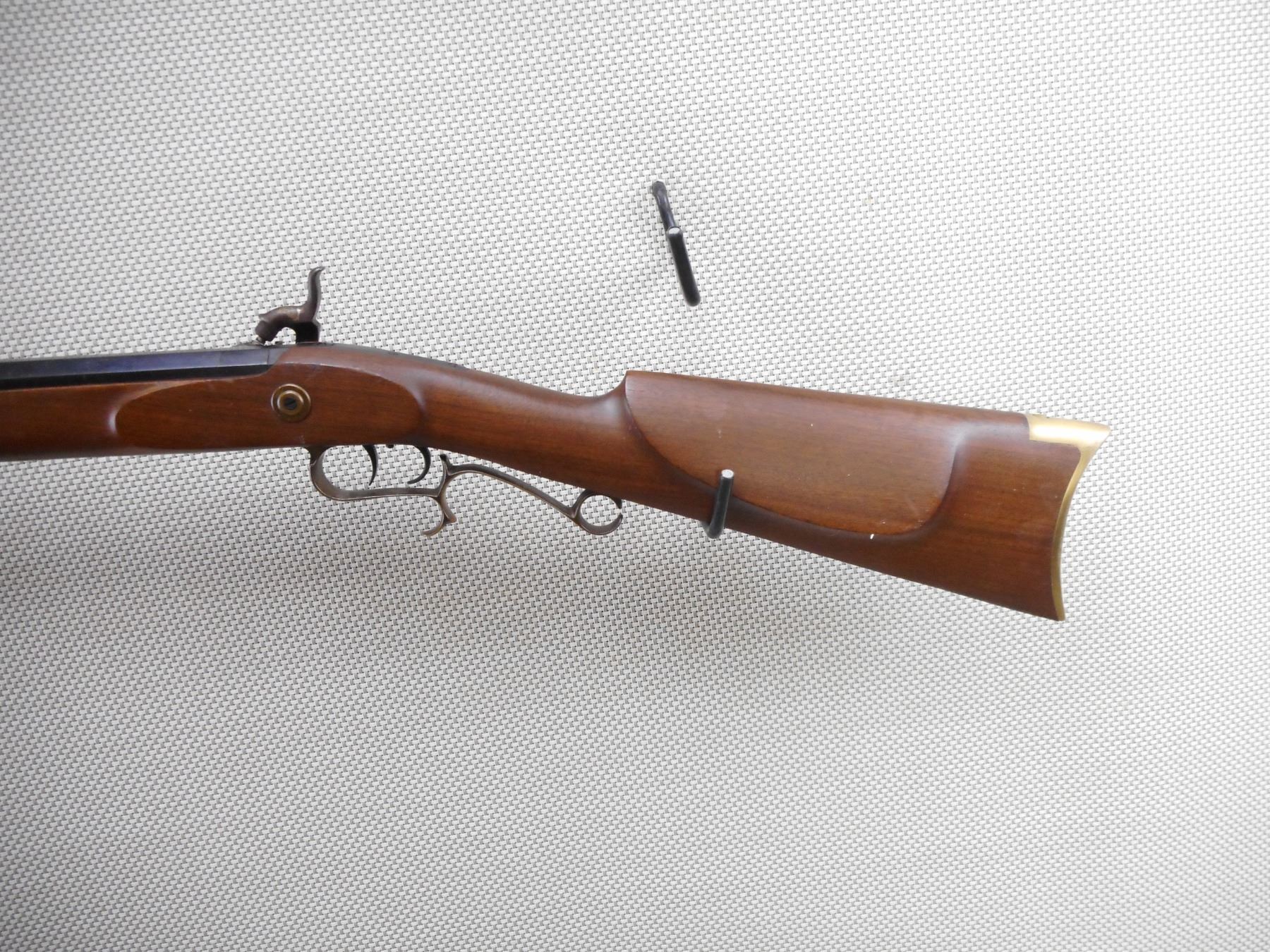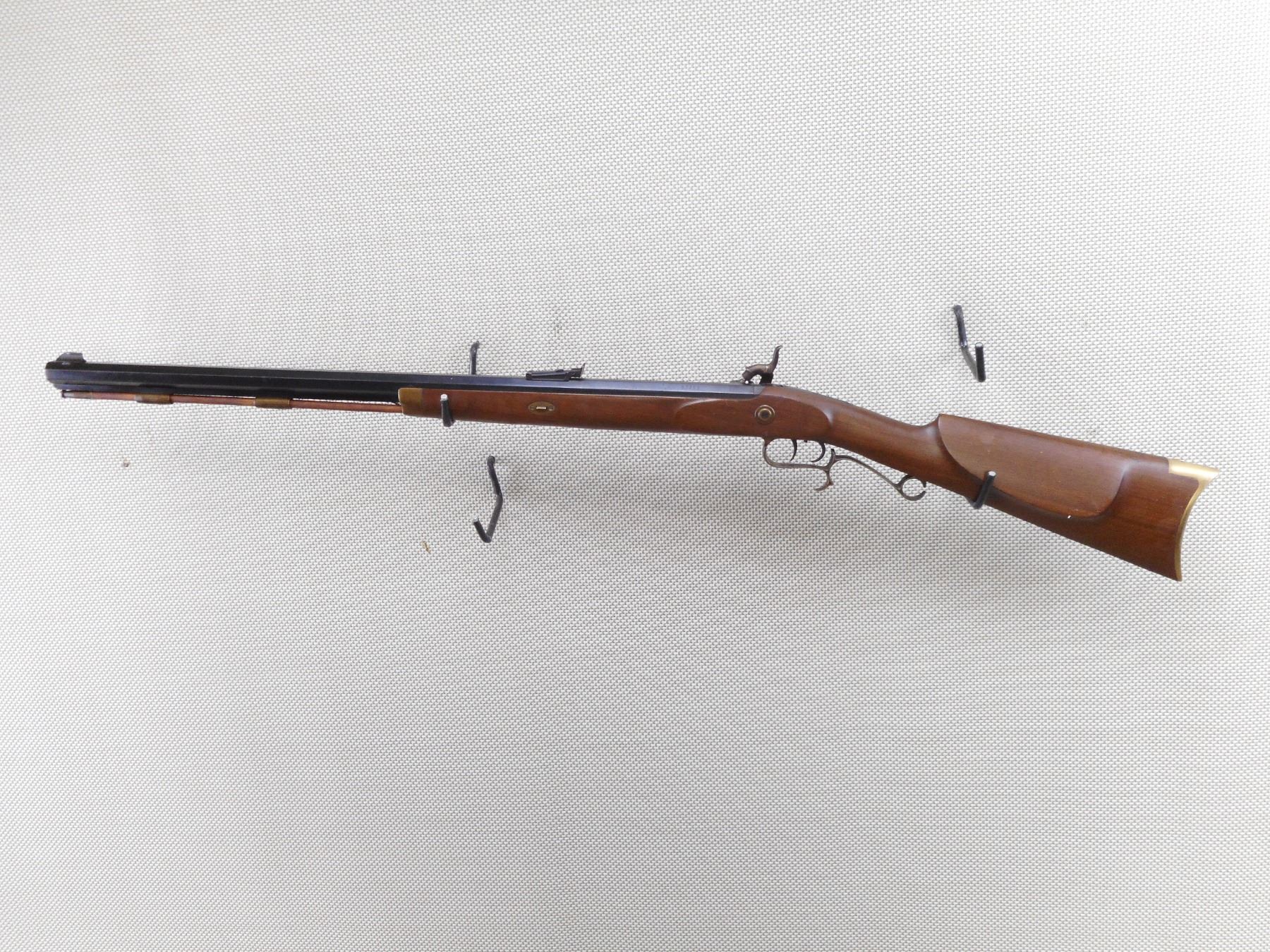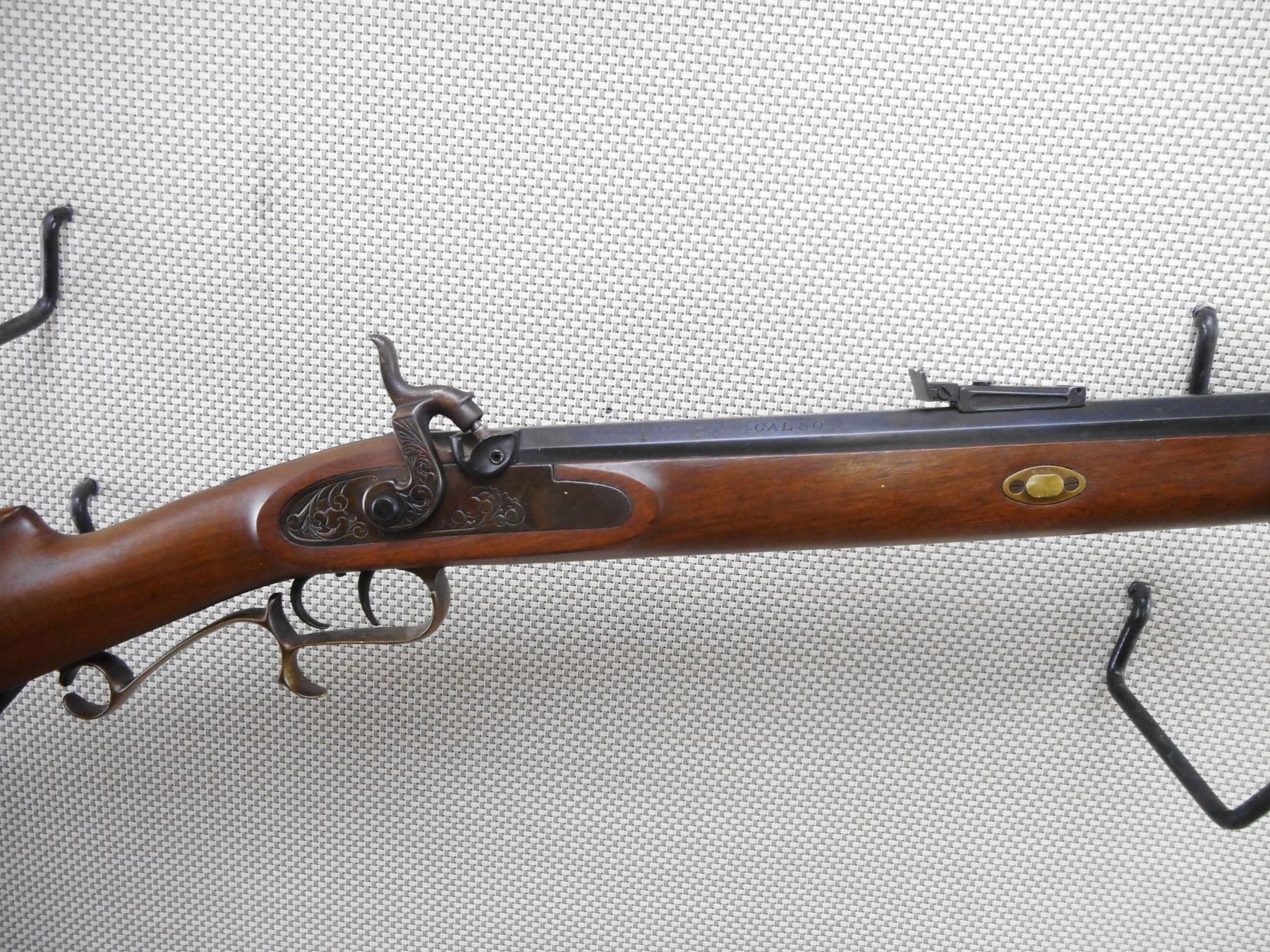 THOMPSON CENTER ARMS , MODEL: HAWKEN STYLE , CALIBER: 50 CAL PERC , BORE IS VERY GOOD. HAS A WOOD RAM ROD WITH BRASS TIP. BLADE FRONT SIGHT AND ADJUSTABLE REAR SIGHT. BRASS FOREND, TRIGGER GUARD, BUTT PLATE AND PATCH BOX. SHOWS VERY LITTLE HANDLING MARKS. ACTION: MUZZLE LOADER , BARREL LENGTH: 27 1/2" , SERIAL # 57753 , CONDITION: 7/10 , CLASS: CANADIAN NON RESTRICTED CLASS